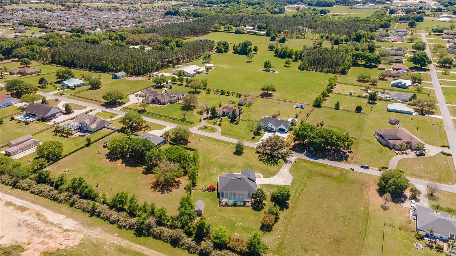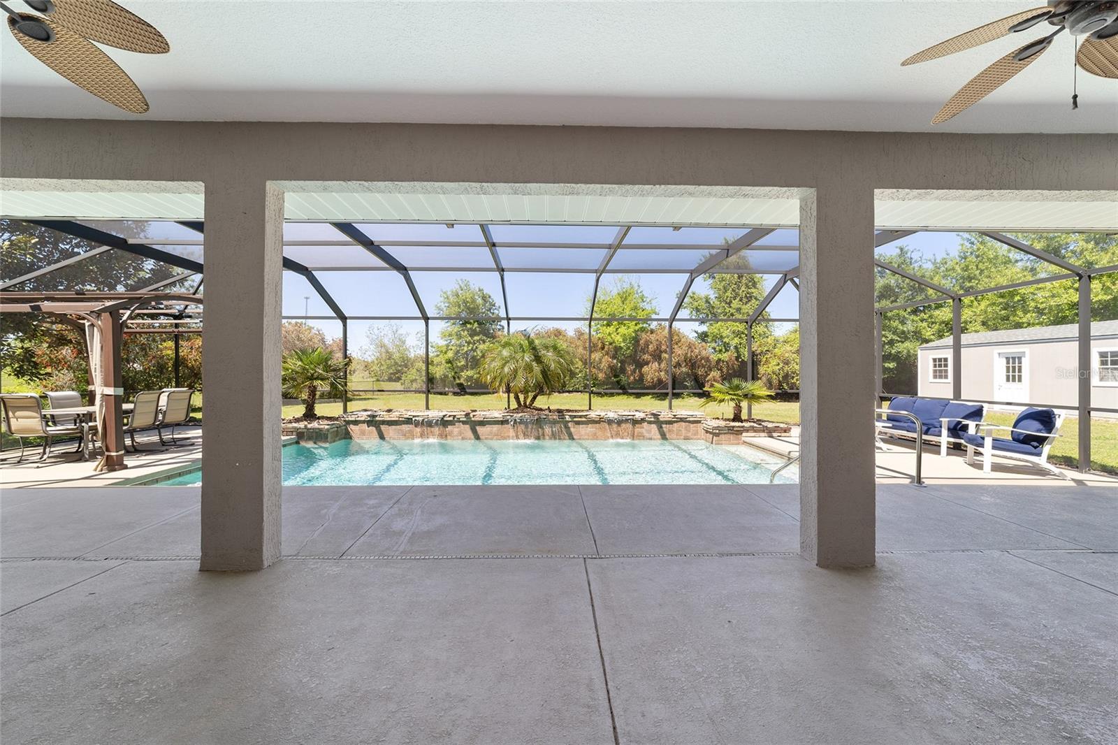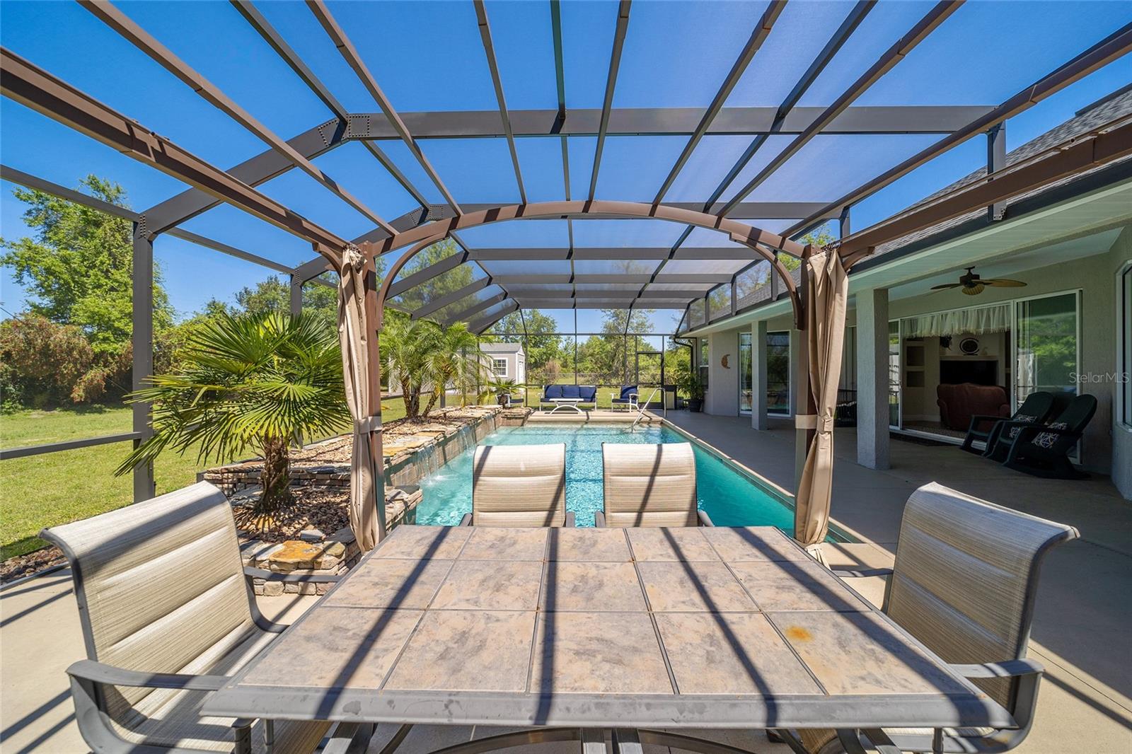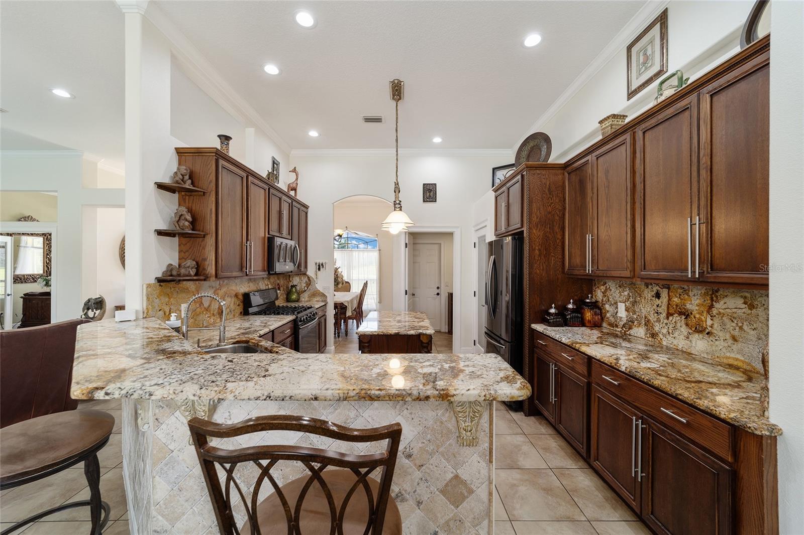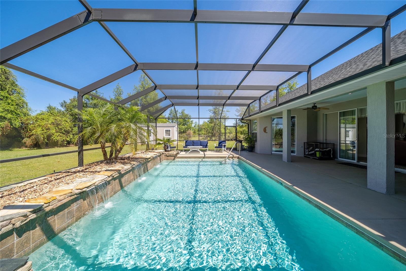 Welcome to your dream home in the coveted Fox Hollow subdivision, a rare gem nestled just minutes away from The Villages, Florida. This expansive property boasts over an acre of land and features a spacious 4-Bedroom / 2-Bathroom plus Den and Formal Dining layout, offering ample space for both relaxation and entertainment. As you step inside, you'll be greeted by stunning Dual Leaded Glass Front Doors, soaring 12' Ceilings adorned with elegant Crown Molding throughout. Coin Corners and 5 1/4" baseboards add a touch of timeless charm to every corner. The heart of the home lies in its well-appointed Kitchen, complete with Solid Wood 42-inch Cabinetry, Imported Granite Countertops, Newer Black SS Samsung Appliances, including Gas Range, and convenient Pantry Closet. Ceramic and accent tile flooring flow seamlessly throughout the main areas, creating a cohesive and stylish ambiance. Escape to the luxurious Primary Bedroom retreat, featuring a spacious Walk-in Closet and sprawling attached En-Suite Bath complete with Jetted Tub and Custom Gorgeous Onyx stone surround. A Private Water Closet with Bidet adds an extra touch of indulgence, while a Slider off the Master Bedroom provides easy access to the tranquil lanai and pool area. Entertain guests with ease in the custom-built entertainment center, complete with plant and lighted accent shelving. Transom Entryway Windows in the office and primary bedroom flood the spaces with natural light. The Split Floor Plan ensures privacy, with three additional bedrooms located away from the primary suite. Upstairs, the Bonus 4th Bedroom space offers versatility and convenience for guests or would make an excellent theater or hobby room! Step outside the quad pocket sliding doors off living room to your own private oasis where a 30 x 14 SALTWATER POOL awaits, complete with Triple Cascade Waterfalls for a touch of luxury. A HUGE Birdcage (New in 2019) and Lanai overlook the completely fenced, north-facing backyard, providing the perfect setting for outdoor gatherings or quiet relaxation. Low-maintenance stone hardscaping and meticulously maintained yard featuring mature plantings, extensive accent and pathway lighting along with in-ground irrigation system create a sense of grandeur and sophistication and complete the luxury exterior. This home is built to last with block and stucco construction. Additional amenities include a whole-house vacuum system, separate Laundry Room with Newer Washer/ and Dryer, Dual HVAC system (main unit New in 2022), Updated Hayward Pool equipment, Tankless Propane-powered RINNAI Hot Water Heater, and a New Storage Shed in 2020, and NEW ROOF in 2021. Don't miss your chance to own this exceptional property offering unparalleled privacy, luxury, and convenience in one of Florida's most desirable locations. Schedule your showing today and make this stunning residence your own!
