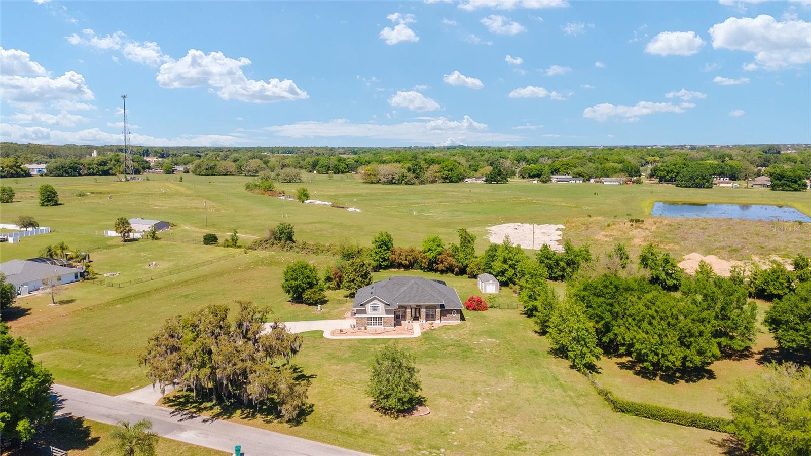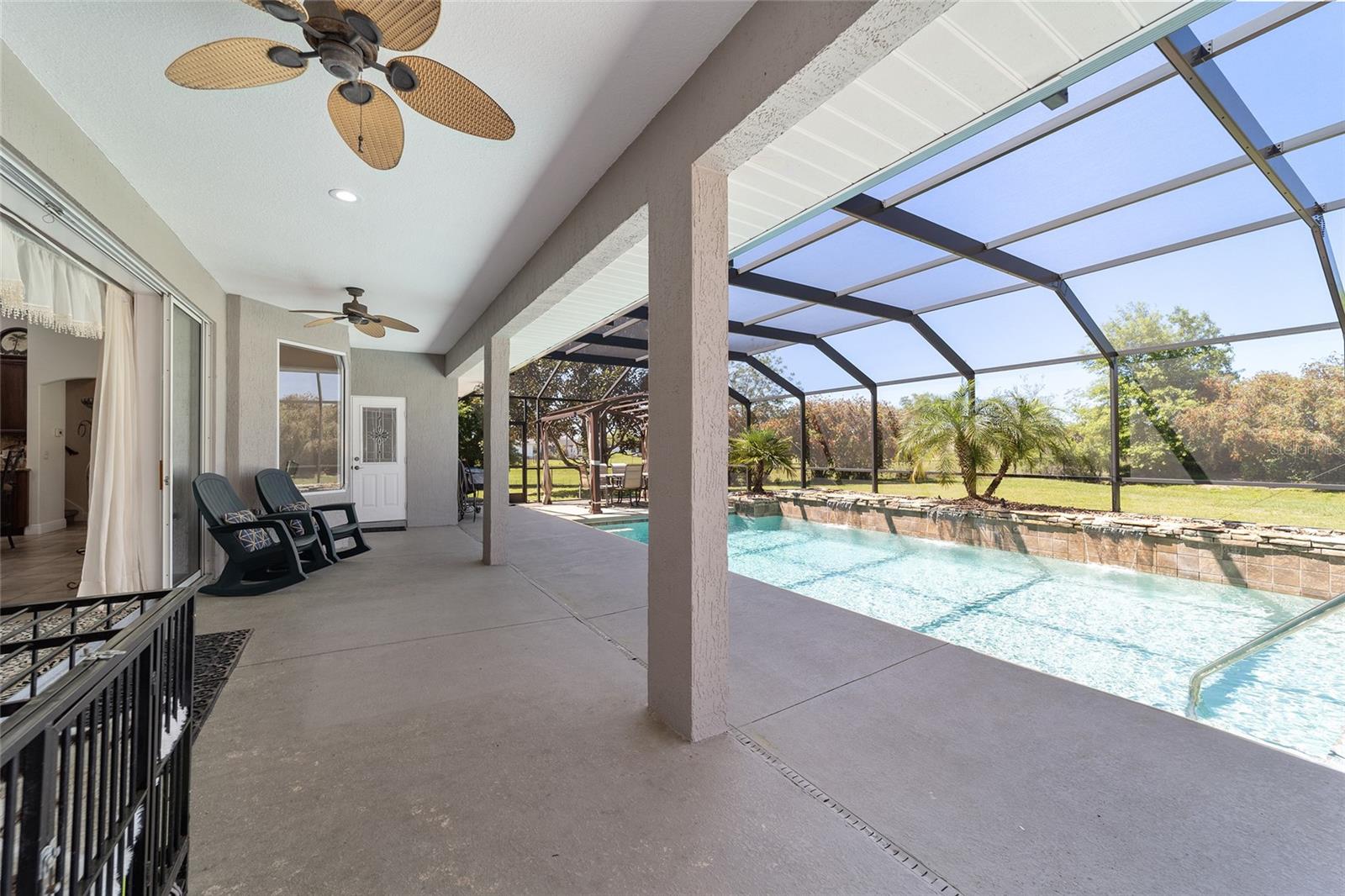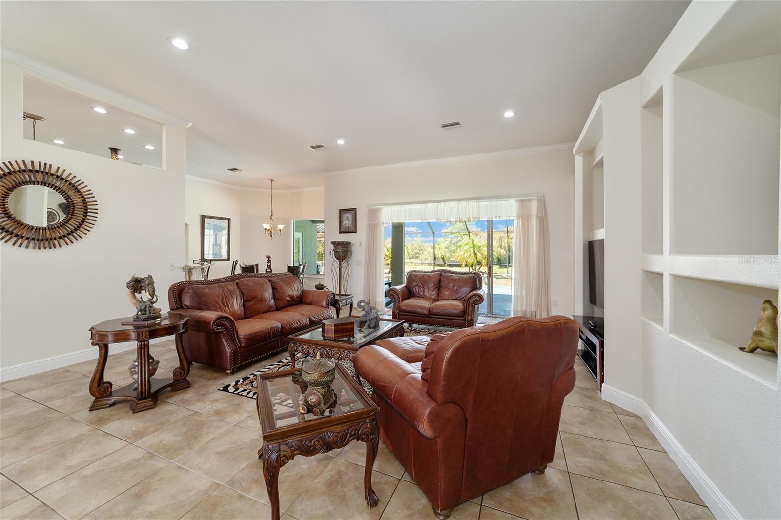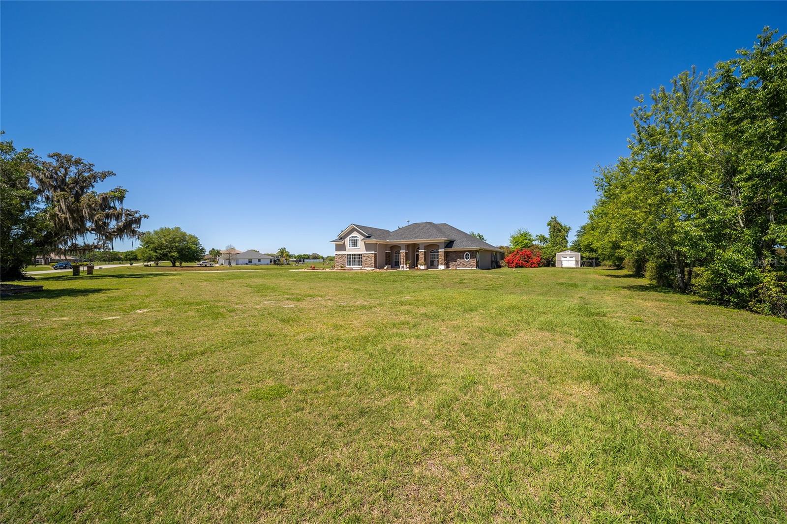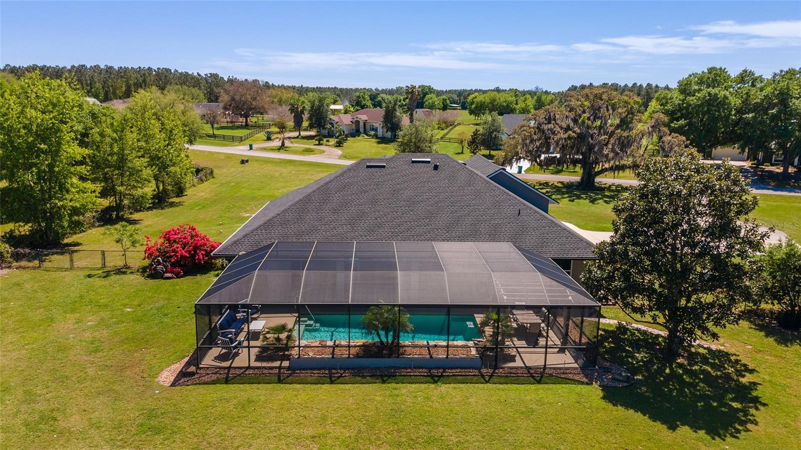 Welcome to your dream home in the coveted Fox Hollow subdivision, a rare gem nestled just minutes away from The Villages, Florida. This expansive property boasts over an acre of land and features a spacious 4-Bedroom / 2-Bathroom plus Den and Formal Dining layout, offering ample space for both relaxation and entertainment. As you step inside, you'll be greeted by stunning Dual Leaded Glass Front Doors, soaring 12' Ceilings adorned with elegant Crown Molding throughout. Coin Corners and 5 1/4" baseboards add a touch of timeless charm to every corner. The heart of the home lies in its well-appointed Kitchen, complete with Solid Wood 42-inch Cabinetry, Imported Granite Countertops, Newer Black SS Samsung Appliances, including Gas Range, and convenient Pantry Closet. Ceramic and accent tile flooring flow seamlessly throughout the main areas, creating a cohesive and stylish ambiance. Escape to the luxurious Primary Bedroom retreat, featuring a spacious Walk-in Closet and sprawling attached En-Suite Bath complete with Jetted Tub and Custom Gorgeous Onyx stone surround. A Private Water Closet with Bidet adds an extra touch of indulgence, while a Slider off the Master Bedroom provides easy access to the tranquil lanai and pool area. Entertain guests with ease in the custom-built entertainment center, complete with plant and lighted accent shelving. Transom Entryway Windows in the office and primary bedroom flood the spaces with natural light. The Split Floor Plan ensures privacy, with three additional bedrooms located away from the primary suite. Upstairs, the Bonus 4th Bedroom space offers versatility and convenience for guests or would make an excellent theater or hobby room! Step outside the quad pocket sliding doors off living room to your own private oasis where a 30 x 14 SALTWATER POOL awaits, complete with Triple Cascade Waterfalls for a touch of luxury. A HUGE Birdcage (New in 2019) and Lanai overlook the completely fenced, north-facing backyard, providing the perfect setting for outdoor gatherings or quiet relaxation. Low-maintenance stone hardscaping and meticulously maintained yard featuring mature plantings, extensive accent and pathway lighting along with in-ground irrigation system create a sense of grandeur and sophistication and complete the luxury exterior. This home is built to last with block and stucco construction. Additional amenities include a whole-house vacuum system, separate Laundry Room with Newer Washer/ and Dryer, Dual HVAC system (main unit New in 2022), Updated Hayward Pool equipment, Tankless Propane-powered RINNAI Hot Water Heater, and a New Storage Shed in 2020, and NEW ROOF in 2021. Don't miss your chance to own this exceptional property offering unparalleled privacy, luxury, and convenience in one of Florida's most desirable locations. Schedule your showing today and make this stunning residence your own!