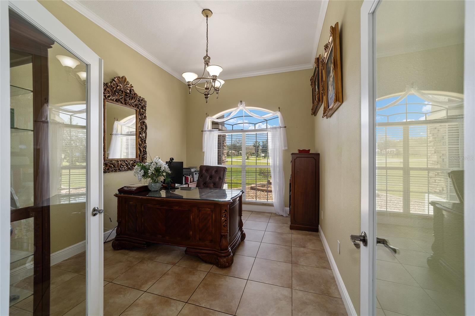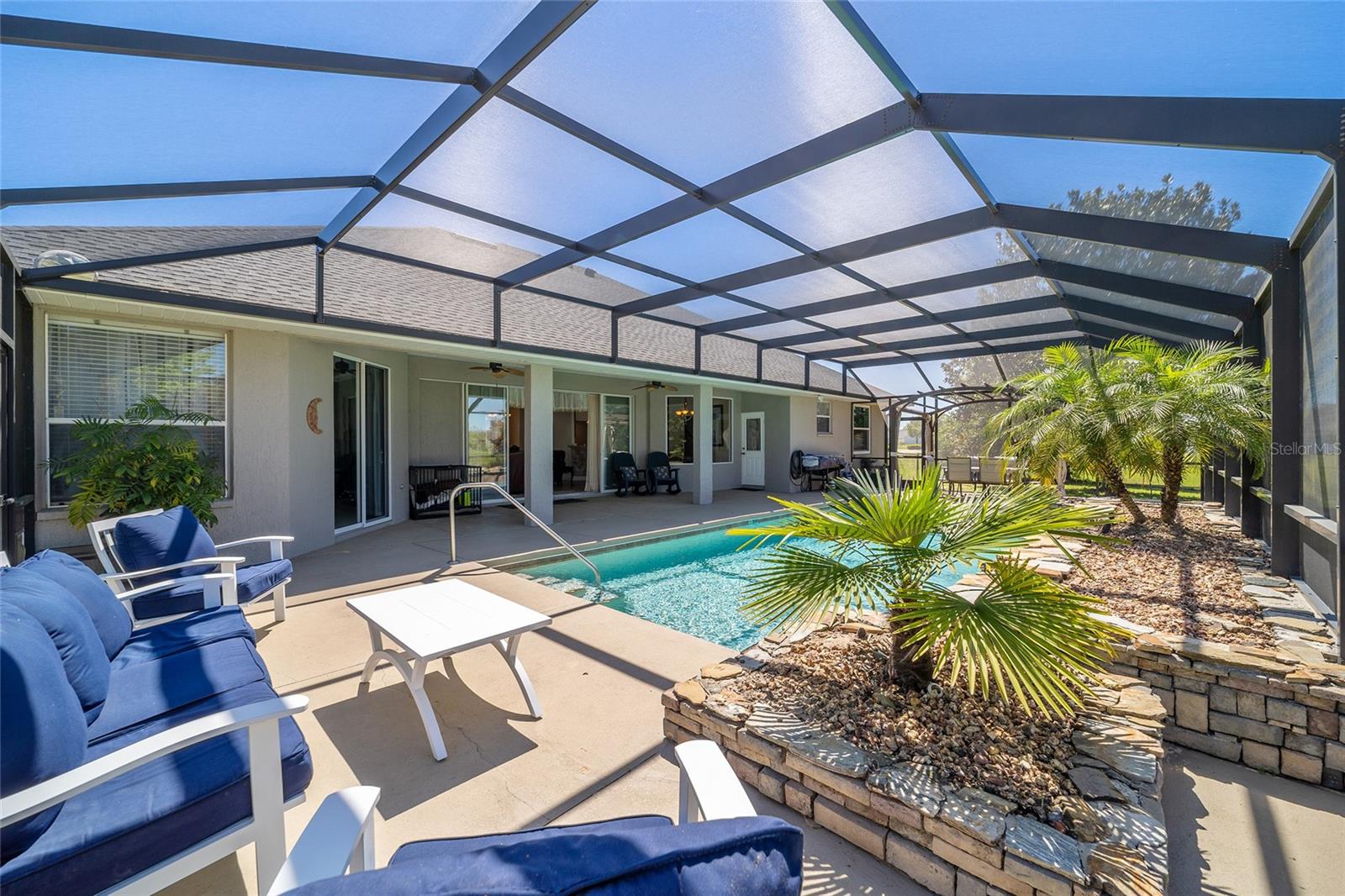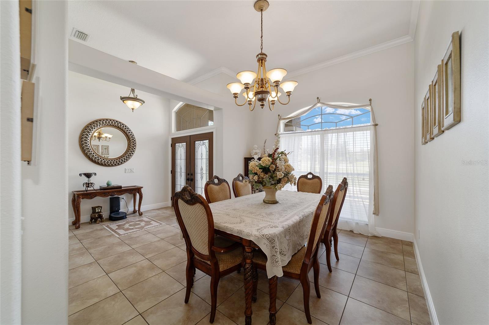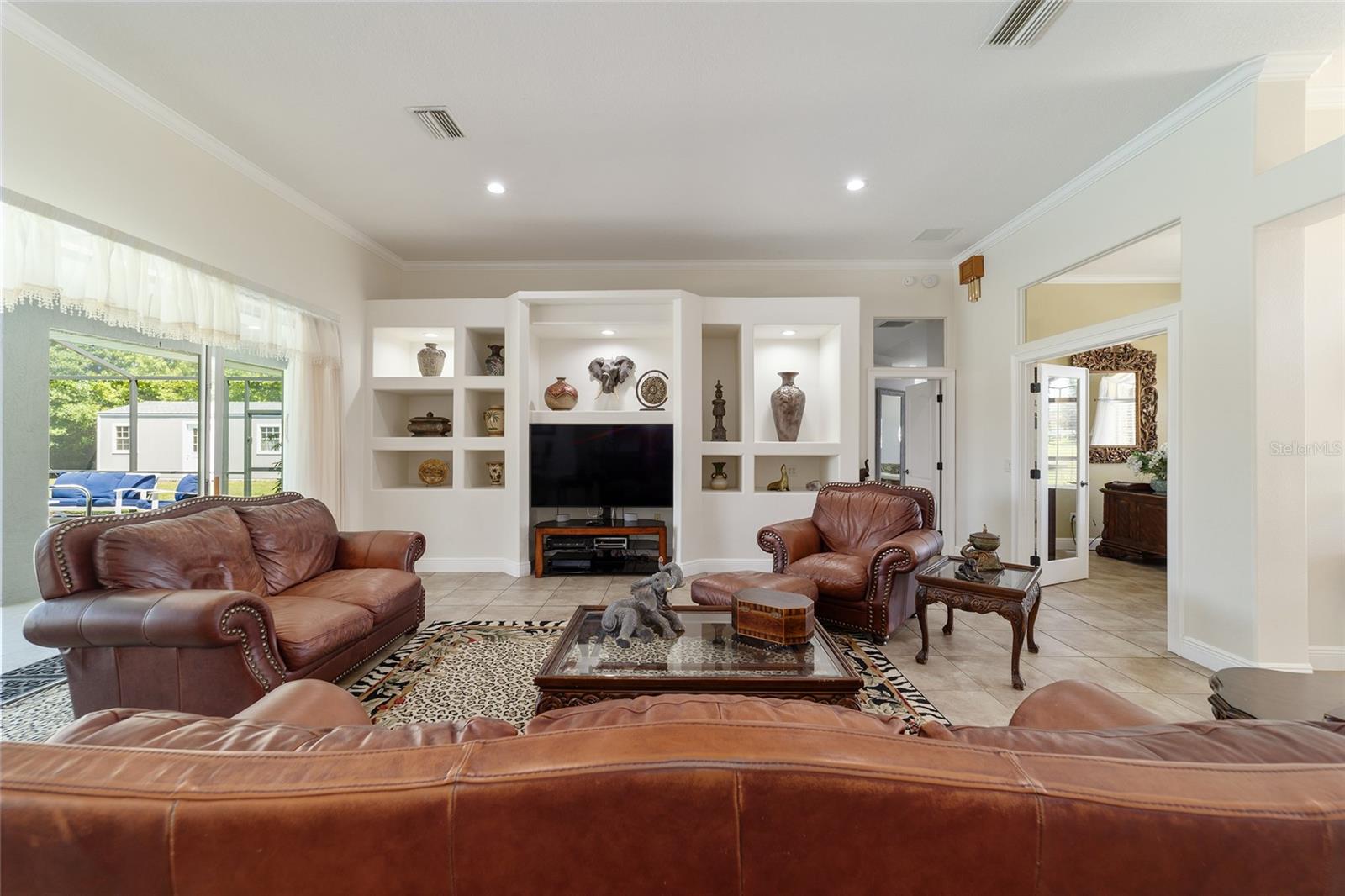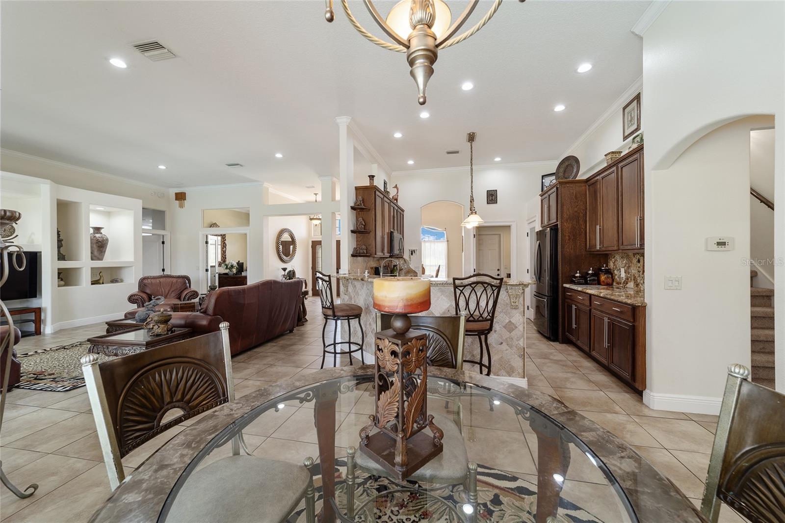 Welcome to your dream home in the coveted Fox Hollow subdivision, a rare gem nestled just minutes away from The Villages, Florida. This expansive property boasts over an acre of land and features a spacious 4-Bedroom / 2-Bathroom plus Den and Formal Dining layout, offering ample space for both relaxation and entertainment. As you step inside, you'll be greeted by stunning Dual Leaded Glass Front Doors, soaring 12' Ceilings adorned with elegant Crown Molding throughout. Coin Corners and 5 1/4" baseboards add a touch of timeless charm to every corner. The heart of the home lies in its well-appointed Kitchen, complete with Solid Wood 42-inch Cabinetry, Imported Granite Countertops, Newer Black SS Samsung Appliances, including Gas Range, and convenient Pantry Closet. Ceramic and accent tile flooring flow seamlessly throughout the main areas, creating a cohesive and stylish ambiance. Escape to the luxurious Primary Bedroom retreat, featuring a spacious Walk-in Closet and sprawling attached En-Suite Bath complete with Jetted Tub and Custom Gorgeous Onyx stone surround. A Private Water Closet with Bidet adds an extra touch of indulgence, while a Slider off the Master Bedroom provides easy access to the tranquil lanai and pool area. Entertain guests with ease in the custom-built entertainment center, complete with plant and lighted accent shelving. Transom Entryway Windows in the office and primary bedroom flood the spaces with natural light. The Split Floor Plan ensures privacy, with three additional bedrooms located away from the primary suite. Upstairs, the Bonus 4th Bedroom space offers versatility and convenience for guests or would make an excellent theater or hobby room! Step outside the quad pocket sliding doors off living room to your own private oasis where a 30 x 14 SALTWATER POOL awaits, complete with Triple Cascade Waterfalls for a touch of luxury. A HUGE Birdcage (New in 2019) and Lanai overlook the completely fenced, north-facing backyard, providing the perfect setting for outdoor gatherings or quiet relaxation. Low-maintenance stone hardscaping and meticulously maintained yard featuring mature plantings, extensive accent and pathway lighting along with in-ground irrigation system create a sense of grandeur and sophistication and complete the luxury exterior. This home is built to last with block and stucco construction. Additional amenities include a whole-house vacuum system, separate Laundry Room with Newer Washer/ and Dryer, Dual HVAC system (main unit New in 2022), Updated Hayward Pool equipment, Tankless Propane-powered RINNAI Hot Water Heater, and a New Storage Shed in 2020, and NEW ROOF in 2021. Don't miss your chance to own this exceptional property offering unparalleled privacy, luxury, and convenience in one of Florida's most desirable locations. Schedule your showing today and make this stunning residence your own!