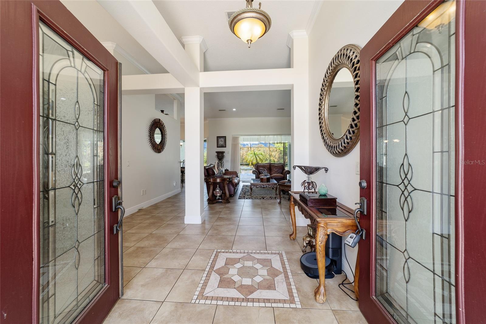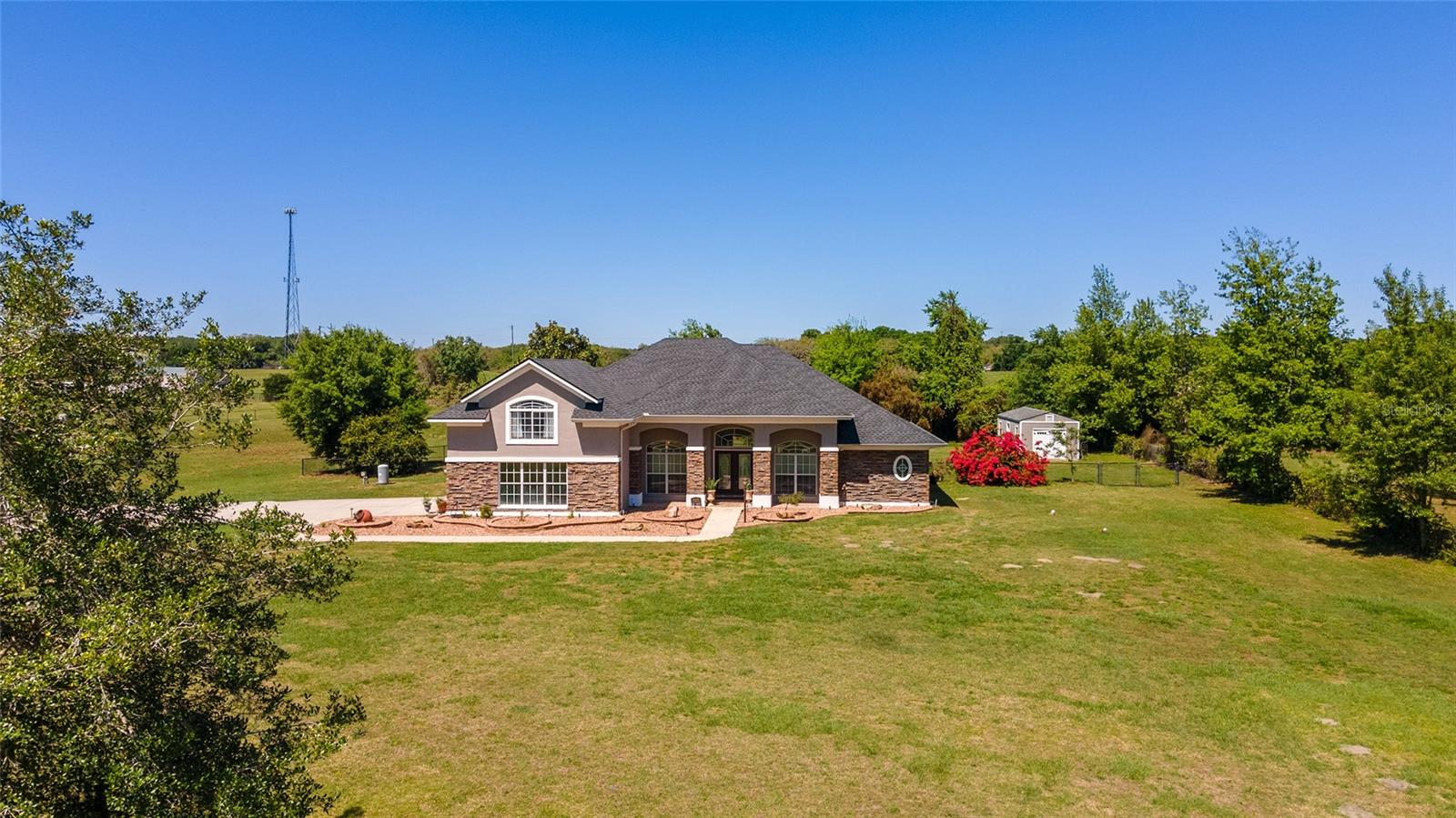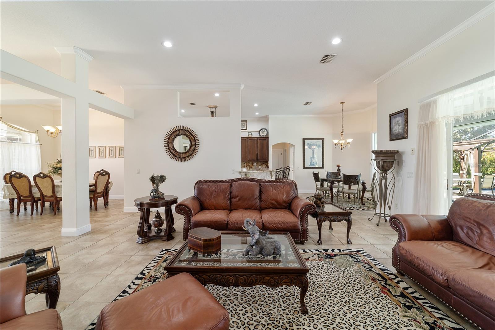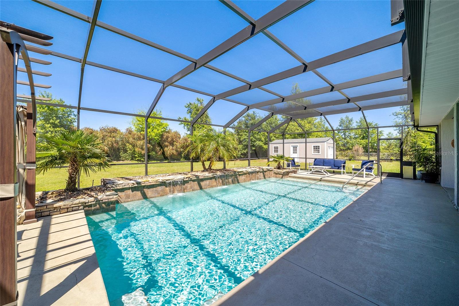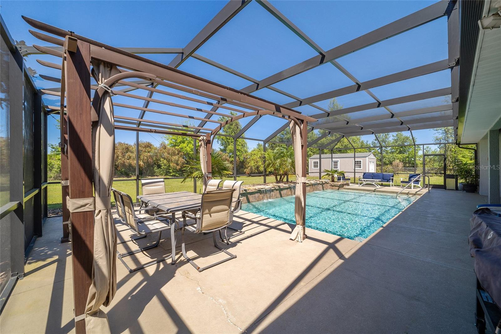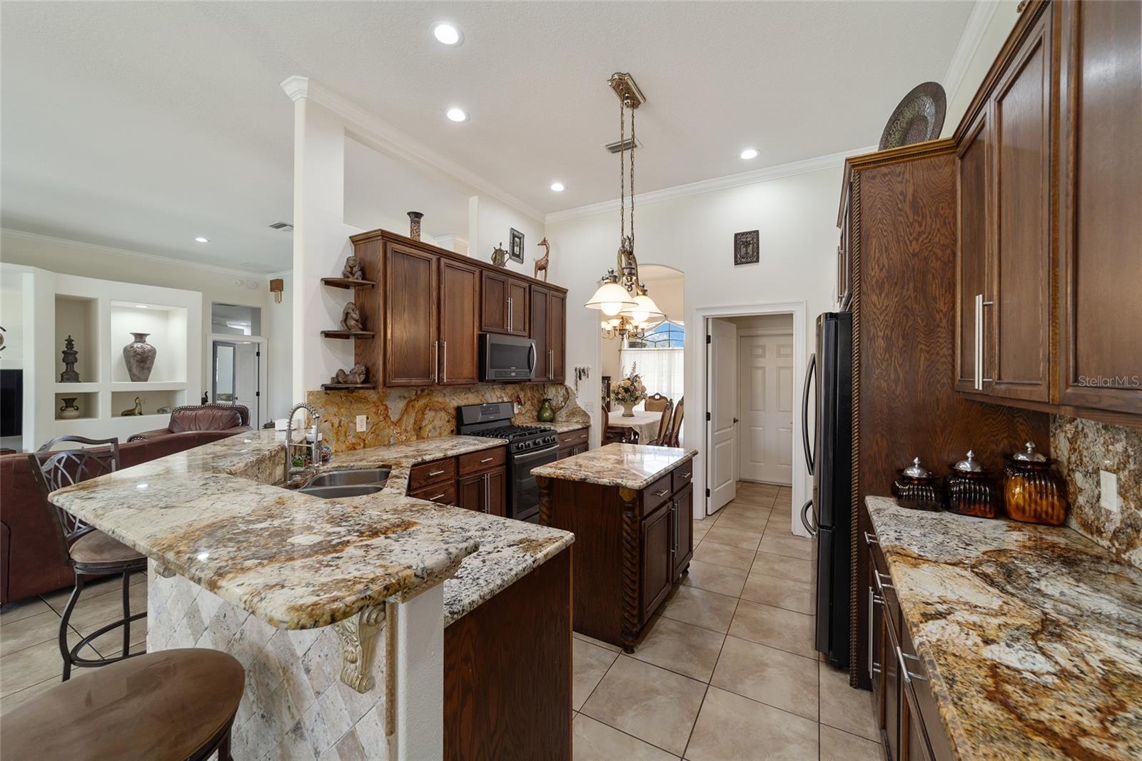 Welcome to your dream home in the coveted Fox Hollow subdivision, a rare gem nestled just minutes away from The Villages, Florida. This expansive property boasts over an acre of land and features a spacious 4-Bedroom / 2-Bathroom plus Den and Formal Dining layout, offering ample space for both relaxation and entertainment. As you step inside, you'll be greeted by stunning Dual Leaded Glass Front Doors, soaring 12' Ceilings adorned with elegant Crown Molding throughout. Coin Corners and 5 1/4" baseboards add a touch of timeless charm to every corner. The heart of the home lies in its well-appointed Kitchen, complete with Solid Wood 42-inch Cabinetry, Imported Granite Countertops, Newer Black SS Samsung Appliances, including Gas Range, and convenient Pantry Closet. Ceramic and accent tile flooring flow seamlessly throughout the main areas, creating a cohesive and stylish ambiance. Escape to the luxurious Primary Bedroom retreat, featuring a spacious Walk-in Closet and sprawling attached En-Suite Bath complete with Jetted Tub and Custom Gorgeous Onyx stone surround. A Private Water Closet with Bidet adds an extra touch of indulgence, while a Slider off the Master Bedroom provides easy access to the tranquil lanai and pool area. Entertain guests with ease in the custom-built entertainment center, complete with plant and lighted accent shelving. Transom Entryway Windows in the office and primary bedroom flood the spaces with natural light. The Split Floor Plan ensures privacy, with three additional bedrooms located away from the primary suite. Upstairs, the Bonus 4th Bedroom space offers versatility and convenience for guests or would make an excellent theater or hobby room! Step outside the quad pocket sliding doors off living room to your own private oasis where a 30 x 14 SALTWATER POOL awaits, complete with Triple Cascade Waterfalls for a touch of luxury. A HUGE Birdcage (New in 2019) and Lanai overlook the completely fenced, north-facing backyard, providing the perfect setting for outdoor gatherings or quiet relaxation. Low-maintenance stone hardscaping and meticulously maintained yard featuring mature plantings, extensive accent and pathway lighting along with in-ground irrigation system create a sense of grandeur and sophistication and complete the luxury exterior. This home is built to last with block and stucco construction. Additional amenities include a whole-house vacuum system, separate Laundry Room with Newer Washer/ and Dryer, Dual HVAC system (main unit New in 2022), Updated Hayward Pool equipment, Tankless Propane-powered RINNAI Hot Water Heater, and a New Storage Shed in 2020, and NEW ROOF in 2021. Don't miss your chance to own this exceptional property offering unparalleled privacy, luxury, and convenience in one of Florida's most desirable locations. Schedule your showing today and make this stunning residence your own!