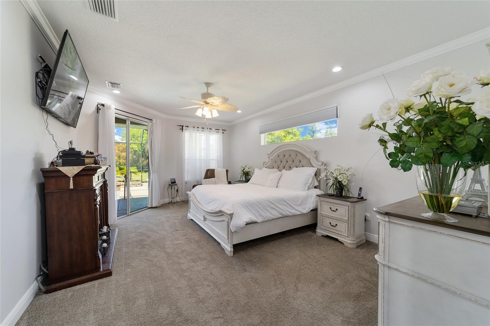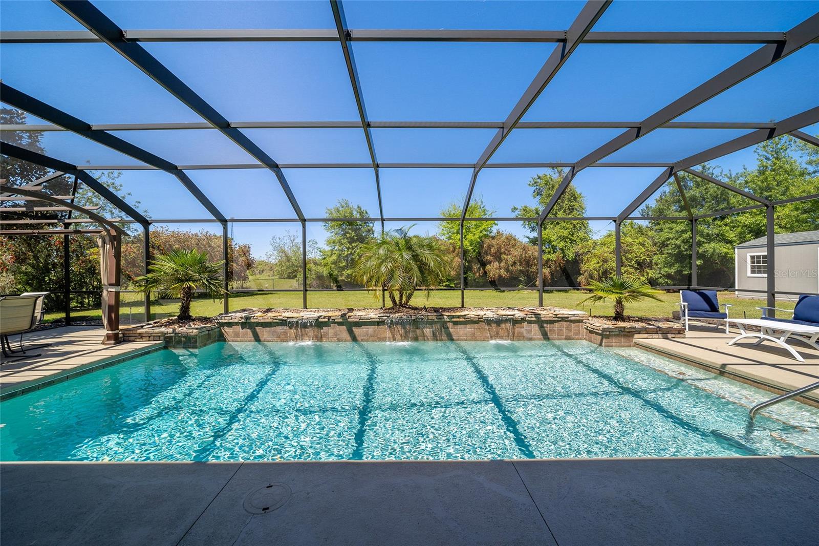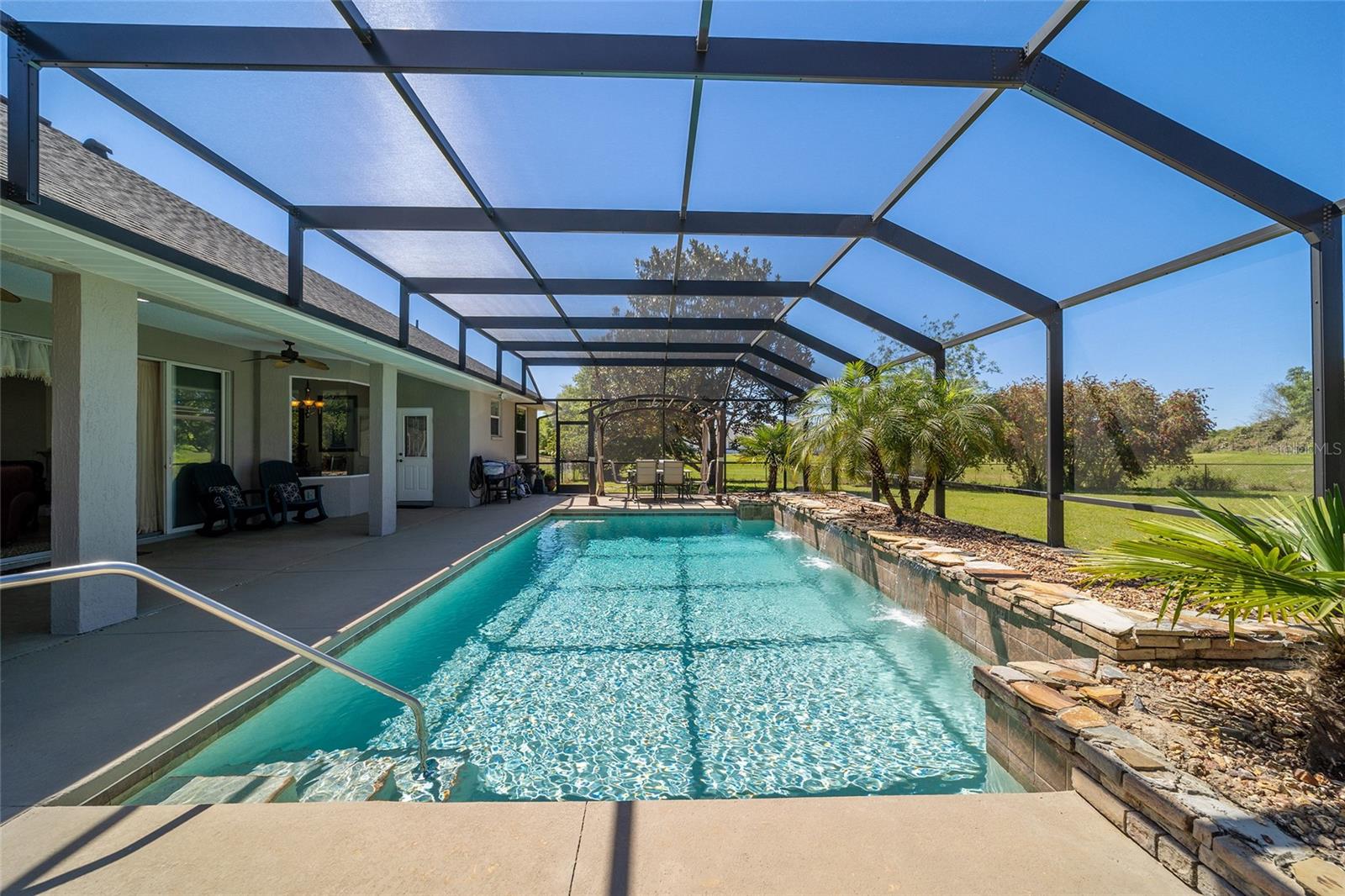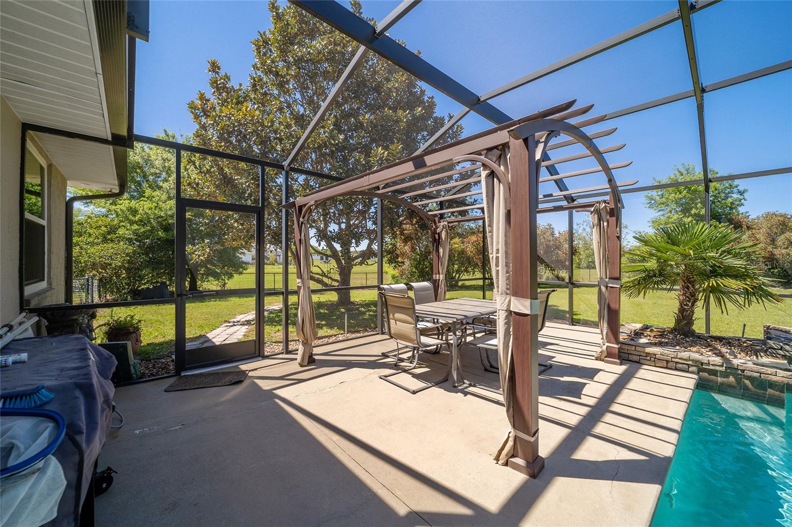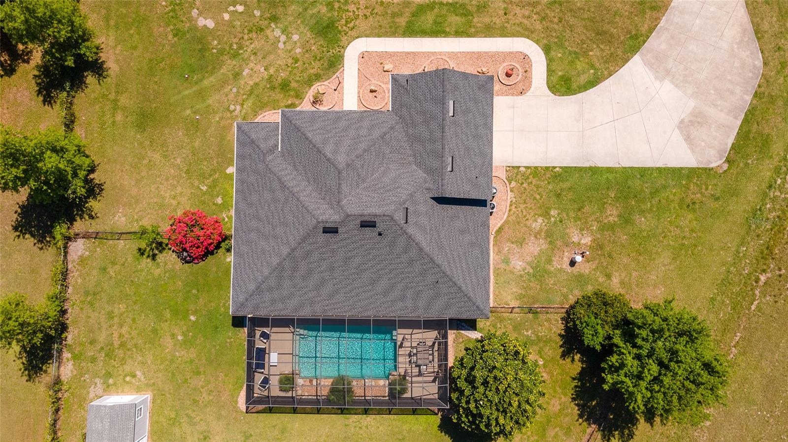 Welcome to your dream home in the coveted Fox Hollow subdivision, a rare gem nestled just minutes away from The Villages, Florida. This expansive property boasts over an acre of land and features a spacious 4-Bedroom / 2-Bathroom plus Den and Formal Dining layout, offering ample space for both relaxation and entertainment. As you step inside, you'll be greeted by stunning Dual Leaded Glass Front Doors, soaring 12' Ceilings adorned with elegant Crown Molding throughout. Coin Corners and 5 1/4" baseboards add a touch of timeless charm to every corner. The heart of the home lies in its well-appointed Kitchen, complete with Solid Wood 42-inch Cabinetry, Imported Granite Countertops, Newer Black SS Samsung Appliances, including Gas Range, and convenient Pantry Closet. Ceramic and accent tile flooring flow seamlessly throughout the main areas, creating a cohesive and stylish ambiance. Escape to the luxurious Primary Bedroom retreat, featuring a spacious Walk-in Closet and sprawling attached En-Suite Bath complete with Jetted Tub and Custom Gorgeous Onyx stone surround. A Private Water Closet with Bidet adds an extra touch of indulgence, while a Slider off the Master Bedroom provides easy access to the tranquil lanai and pool area. Entertain guests with ease in the custom-built entertainment center, complete with plant and lighted accent shelving. Transom Entryway Windows in the office and primary bedroom flood the spaces with natural light. The Split Floor Plan ensures privacy, with three additional bedrooms located away from the primary suite. Upstairs, the Bonus 4th Bedroom space offers versatility and convenience for guests or would make an excellent theater or hobby room! Step outside the quad pocket sliding doors off living room to your own private oasis where a 30 x 14 SALTWATER POOL awaits, complete with Triple Cascade Waterfalls for a touch of luxury. A HUGE Birdcage (New in 2019) and Lanai overlook the completely fenced, north-facing backyard, providing the perfect setting for outdoor gatherings or quiet relaxation. Low-maintenance stone hardscaping and meticulously maintained yard featuring mature plantings, extensive accent and pathway lighting along with in-ground irrigation system create a sense of grandeur and sophistication and complete the luxury exterior. This home is built to last with block and stucco construction. Additional amenities include a whole-house vacuum system, separate Laundry Room with Newer Washer/ and Dryer, Dual HVAC system (main unit New in 2022), Updated Hayward Pool equipment, Tankless Propane-powered RINNAI Hot Water Heater, and a New Storage Shed in 2020, and NEW ROOF in 2021. Don't miss your chance to own this exceptional property offering unparalleled privacy, luxury, and convenience in one of Florida's most desirable locations. Schedule your showing today and make this stunning residence your own!
