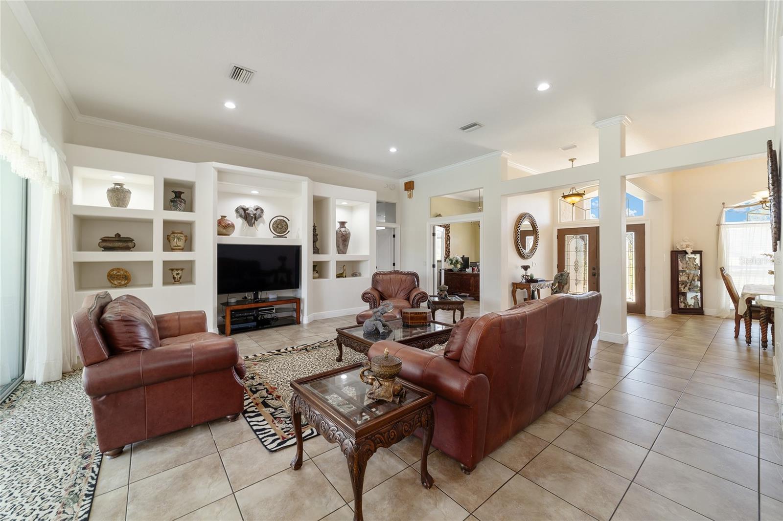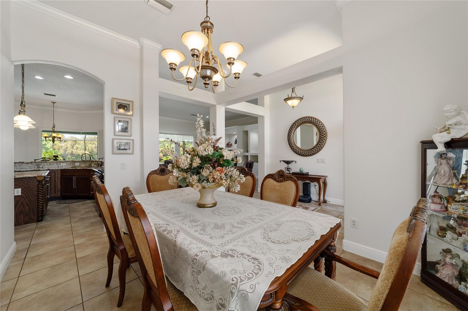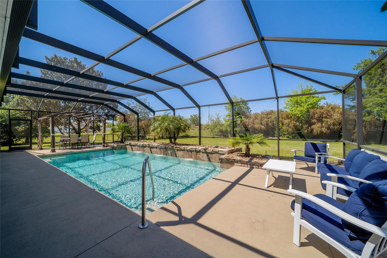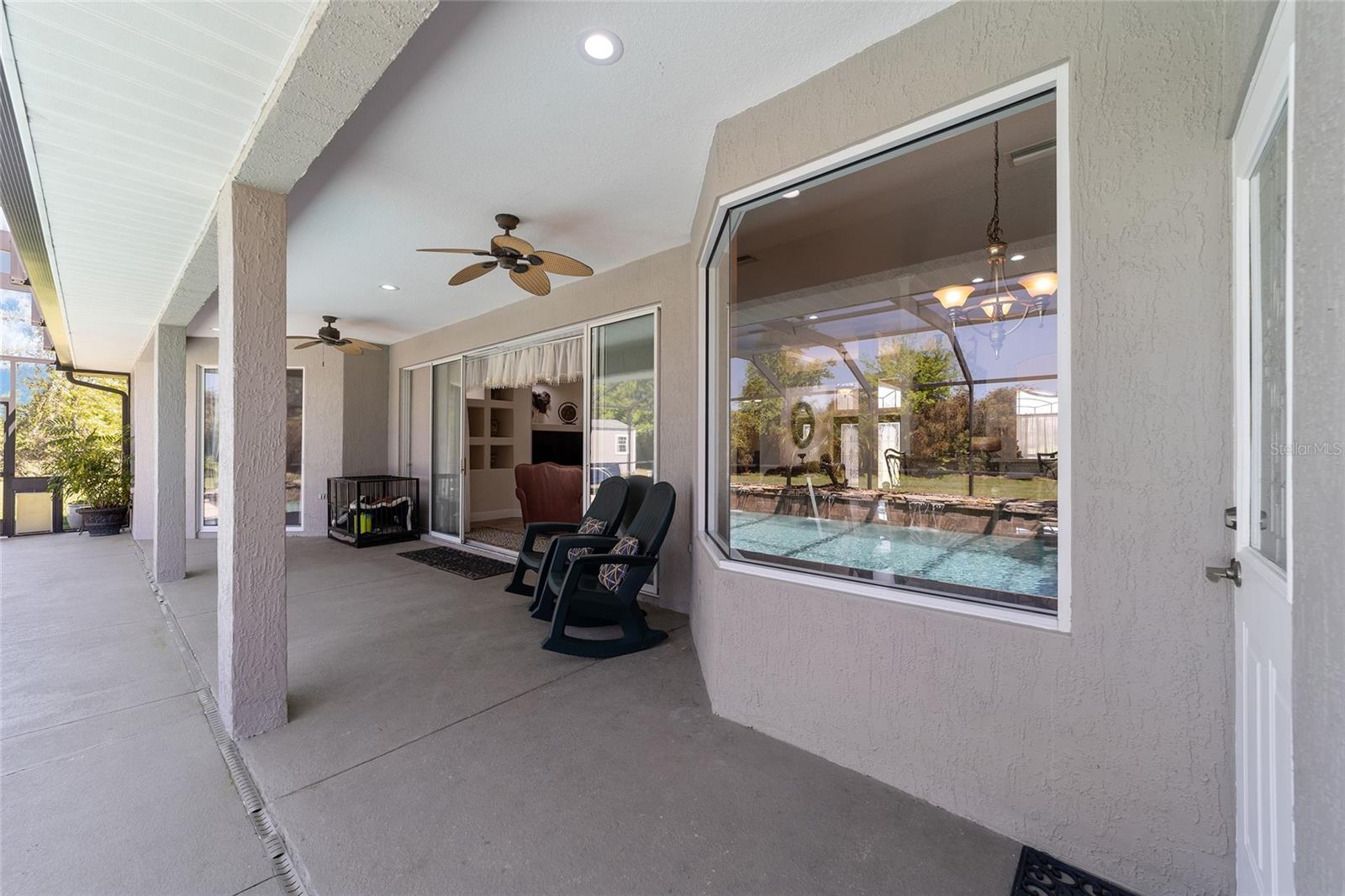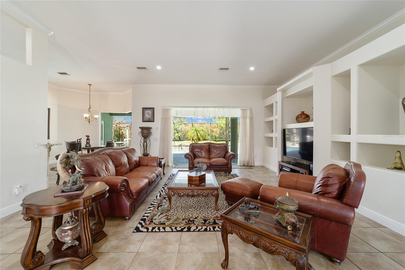 Welcome to your dream home in the coveted Fox Hollow subdivision, a rare gem nestled just minutes away from The Villages, Florida. This expansive property boasts over an acre of land and features a spacious 4-Bedroom / 2-Bathroom plus Den and Formal Dining layout, offering ample space for both relaxation and entertainment. As you step inside, you'll be greeted by stunning Dual Leaded Glass Front Doors, soaring 12' Ceilings adorned with elegant Crown Molding throughout. Coin Corners and 5 1/4" baseboards add a touch of timeless charm to every corner. The heart of the home lies in its well-appointed Kitchen, complete with Solid Wood 42-inch Cabinetry, Imported Granite Countertops, Newer Black SS Samsung Appliances, including Gas Range, and convenient Pantry Closet. Ceramic and accent tile flooring flow seamlessly throughout the main areas, creating a cohesive and stylish ambiance. Escape to the luxurious Primary Bedroom retreat, featuring a spacious Walk-in Closet and sprawling attached En-Suite Bath complete with Jetted Tub and Custom Gorgeous Onyx stone surround. A Private Water Closet with Bidet adds an extra touch of indulgence, while a Slider off the Master Bedroom provides easy access to the tranquil lanai and pool area. Entertain guests with ease in the custom-built entertainment center, complete with plant and lighted accent shelving. Transom Entryway Windows in the office and primary bedroom flood the spaces with natural light. The Split Floor Plan ensures privacy, with three additional bedrooms located away from the primary suite. Upstairs, the Bonus 4th Bedroom space offers versatility and convenience for guests or would make an excellent theater or hobby room! Step outside the quad pocket sliding doors off living room to your own private oasis where a 30 x 14 SALTWATER POOL awaits, complete with Triple Cascade Waterfalls for a touch of luxury. A HUGE Birdcage (New in 2019) and Lanai overlook the completely fenced, north-facing backyard, providing the perfect setting for outdoor gatherings or quiet relaxation. Low-maintenance stone hardscaping and meticulously maintained yard featuring mature plantings, extensive accent and pathway lighting along with in-ground irrigation system create a sense of grandeur and sophistication and complete the luxury exterior. This home is built to last with block and stucco construction. Additional amenities include a whole-house vacuum system, separate Laundry Room with Newer Washer/ and Dryer, Dual HVAC system (main unit New in 2022), Updated Hayward Pool equipment, Tankless Propane-powered RINNAI Hot Water Heater, and a New Storage Shed in 2020, and NEW ROOF in 2021. Don't miss your chance to own this exceptional property offering unparalleled privacy, luxury, and convenience in one of Florida's most desirable locations. Schedule your showing today and make this stunning residence your own!