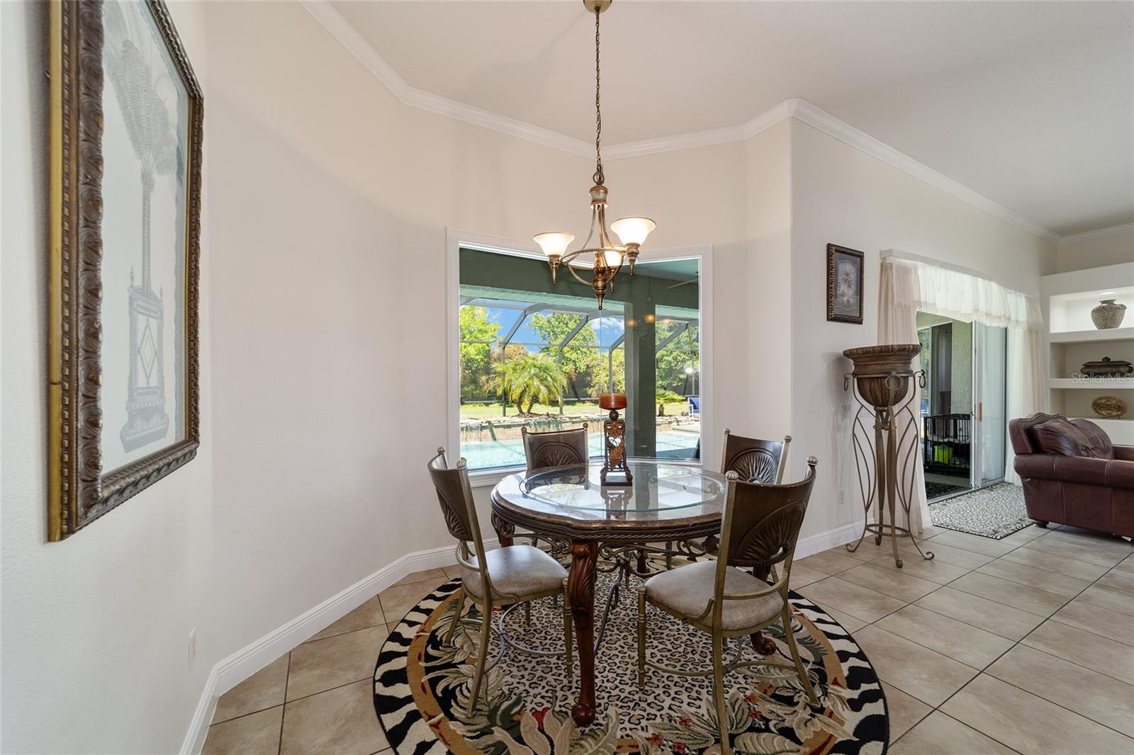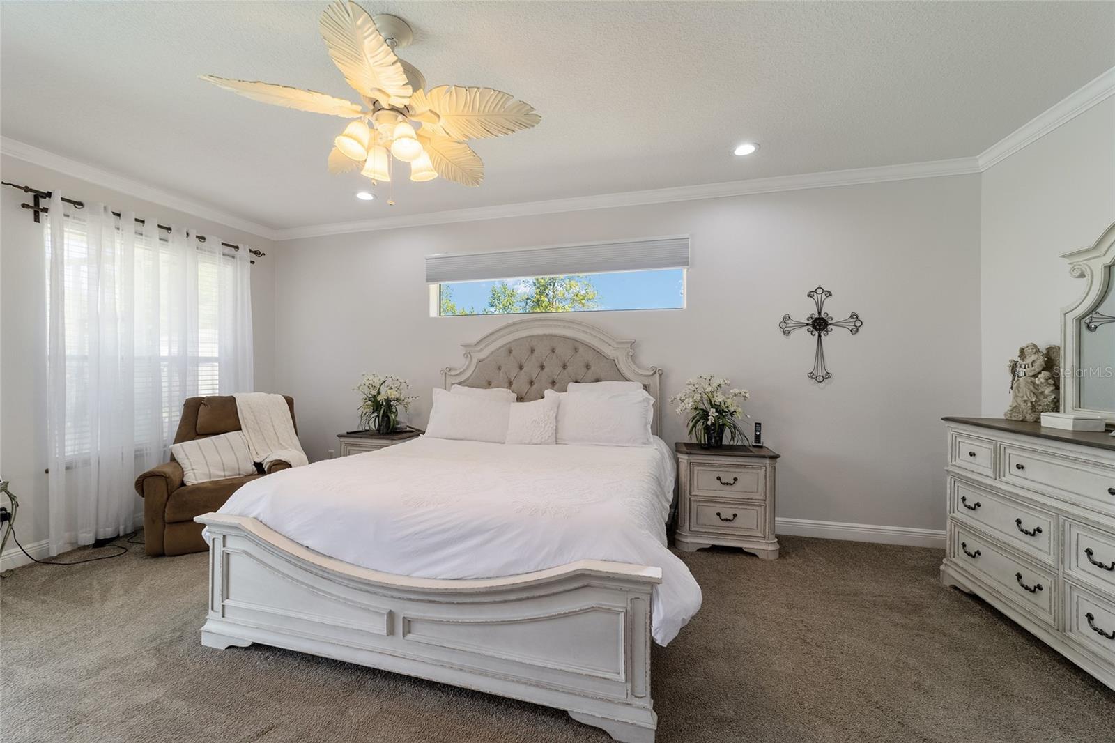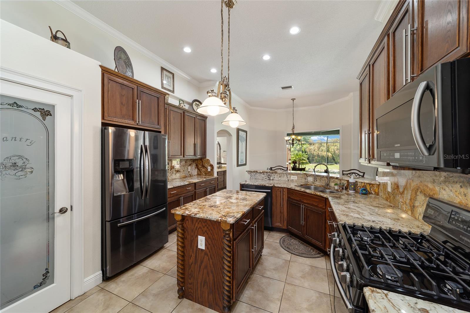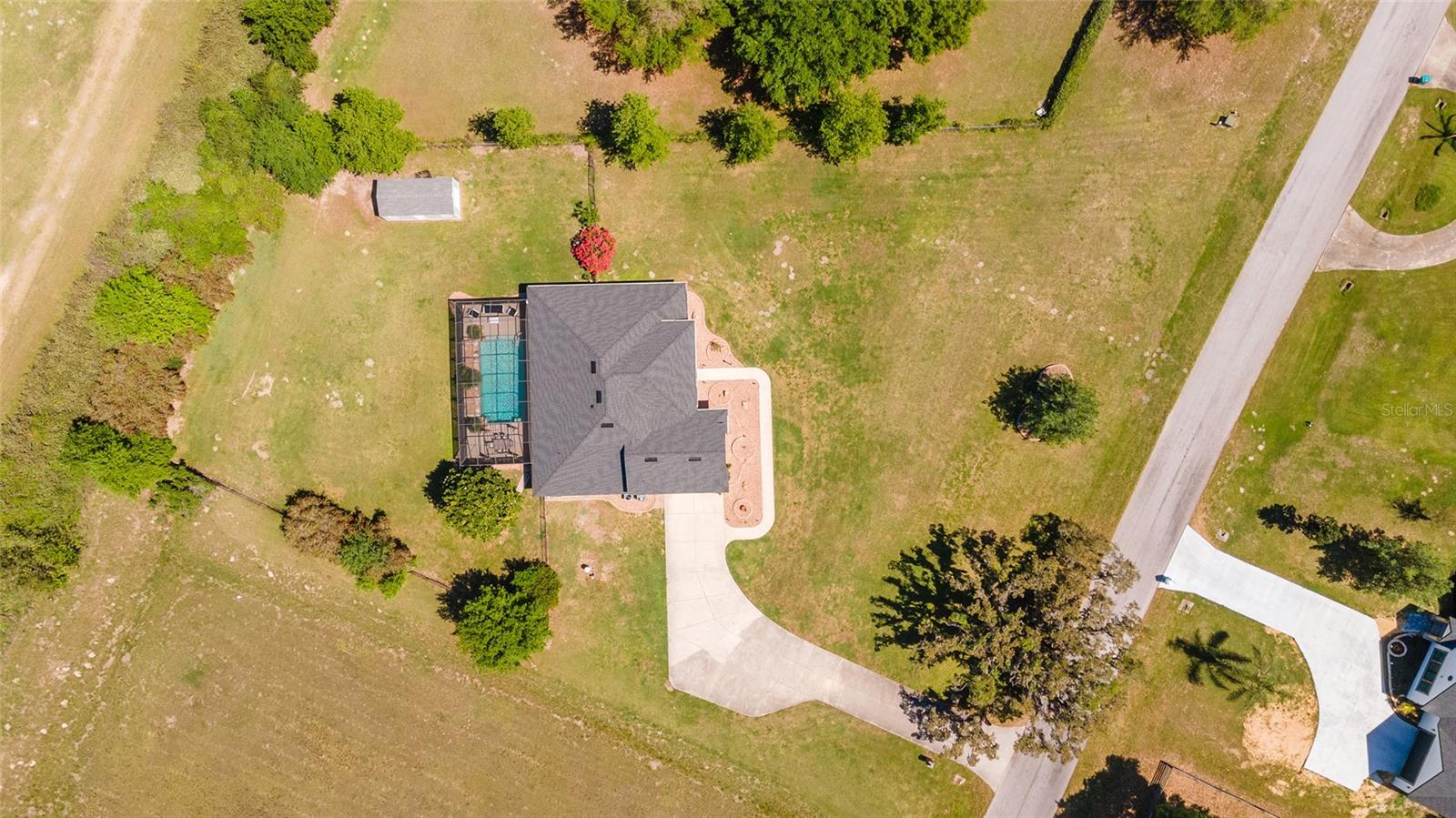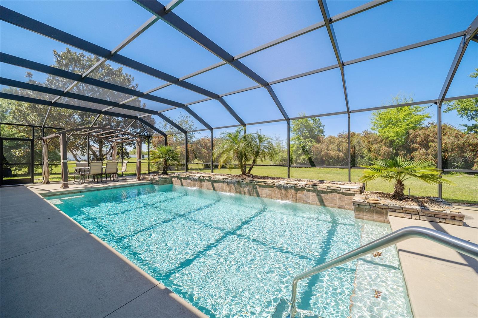 Welcome to your dream home in the coveted Fox Hollow subdivision, a rare gem nestled just minutes away from The Villages, Florida. This expansive property boasts over an acre of land and features a spacious 4-Bedroom / 2-Bathroom plus Den and Formal Dining layout, offering ample space for both relaxation and entertainment. As you step inside, you'll be greeted by stunning Dual Leaded Glass Front Doors, soaring 12' Ceilings adorned with elegant Crown Molding throughout. Coin Corners and 5 1/4" baseboards add a touch of timeless charm to every corner. The heart of the home lies in its well-appointed Kitchen, complete with Solid Wood 42-inch Cabinetry, Imported Granite Countertops, Newer Black SS Samsung Appliances, including Gas Range, and convenient Pantry Closet. Ceramic and accent tile flooring flow seamlessly throughout the main areas, creating a cohesive and stylish ambiance. Escape to the luxurious Primary Bedroom retreat, featuring a spacious Walk-in Closet and sprawling attached En-Suite Bath complete with Jetted Tub and Custom Gorgeous Onyx stone surround. A Private Water Closet with Bidet adds an extra touch of indulgence, while a Slider off the Master Bedroom provides easy access to the tranquil lanai and pool area. Entertain guests with ease in the custom-built entertainment center, complete with plant and lighted accent shelving. Transom Entryway Windows in the office and primary bedroom flood the spaces with natural light. The Split Floor Plan ensures privacy, with three additional bedrooms located away from the primary suite. Upstairs, the Bonus 4th Bedroom space offers versatility and convenience for guests or would make an excellent theater or hobby room! Step outside the quad pocket sliding doors off living room to your own private oasis where a 30 x 14 SALTWATER POOL awaits, complete with Triple Cascade Waterfalls for a touch of luxury. A HUGE Birdcage (New in 2019) and Lanai overlook the completely fenced, north-facing backyard, providing the perfect setting for outdoor gatherings or quiet relaxation. Low-maintenance stone hardscaping and meticulously maintained yard featuring mature plantings, extensive accent and pathway lighting along with in-ground irrigation system create a sense of grandeur and sophistication and complete the luxury exterior. This home is built to last with block and stucco construction. Additional amenities include a whole-house vacuum system, separate Laundry Room with Newer Washer/ and Dryer, Dual HVAC system (main unit New in 2022), Updated Hayward Pool equipment, Tankless Propane-powered RINNAI Hot Water Heater, and a New Storage Shed in 2020, and NEW ROOF in 2021. Don't miss your chance to own this exceptional property offering unparalleled privacy, luxury, and convenience in one of Florida's most desirable locations. Schedule your showing today and make this stunning residence your own!