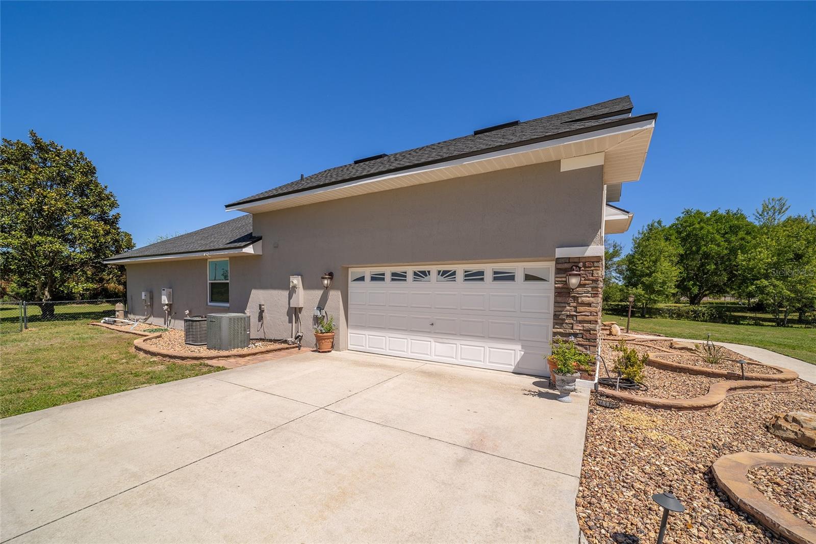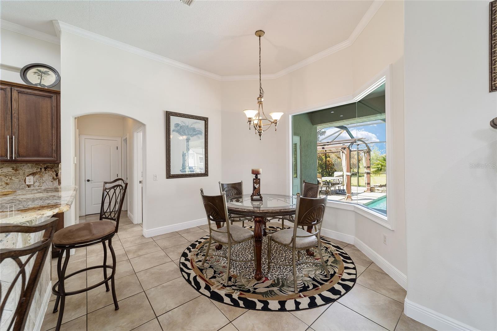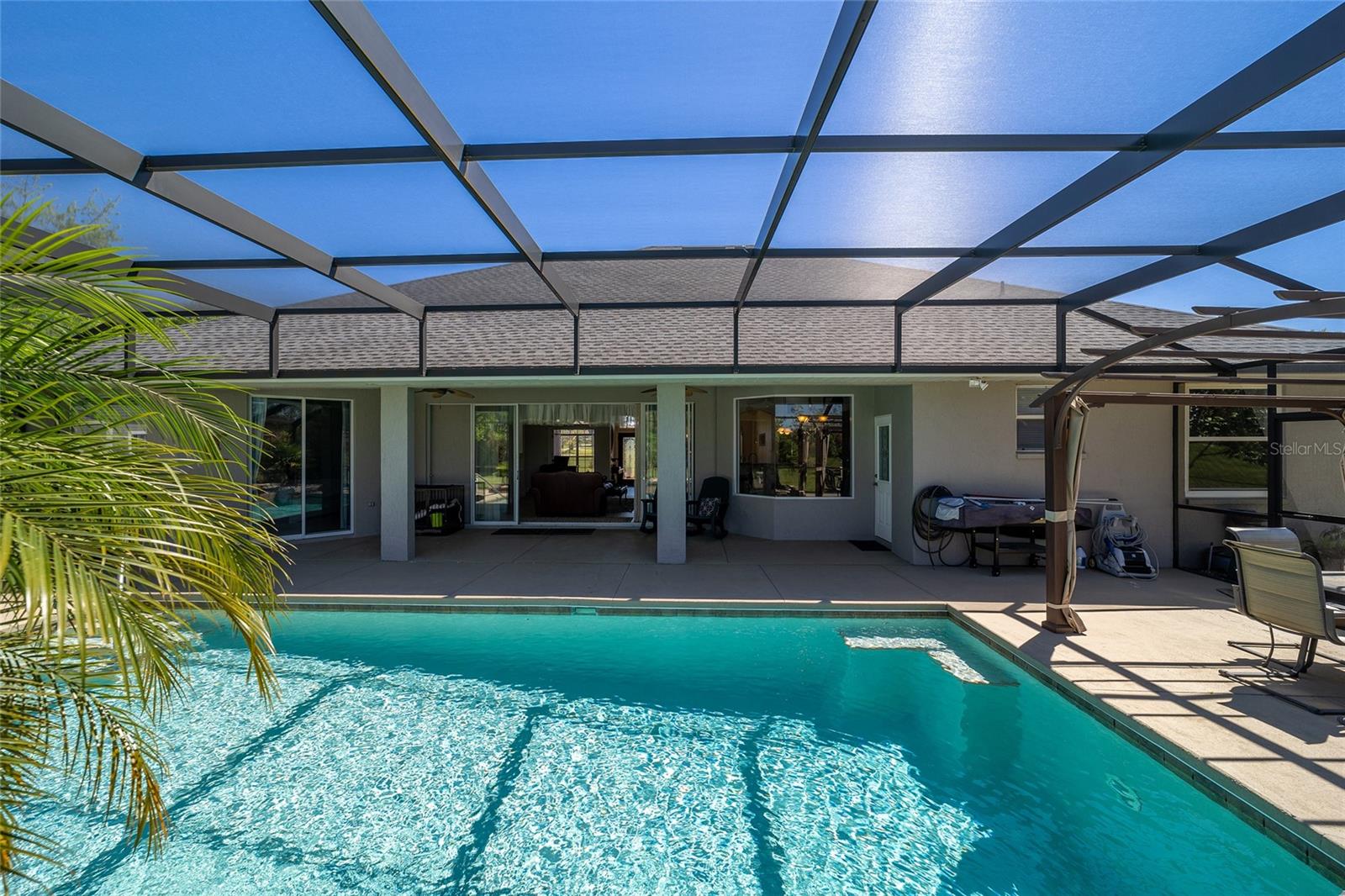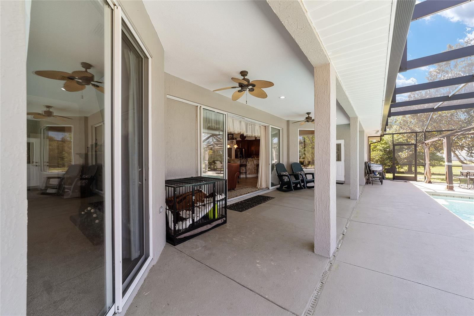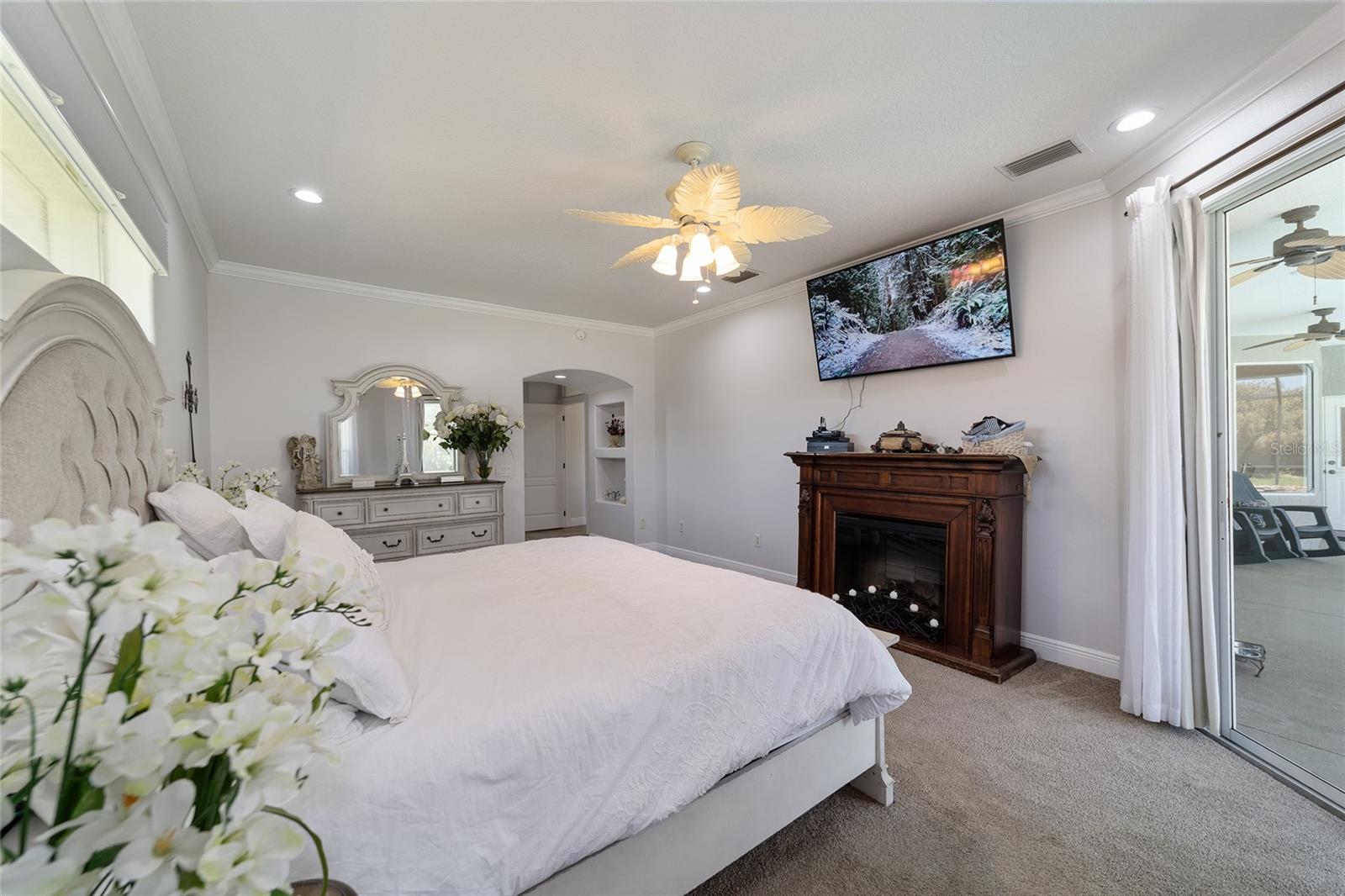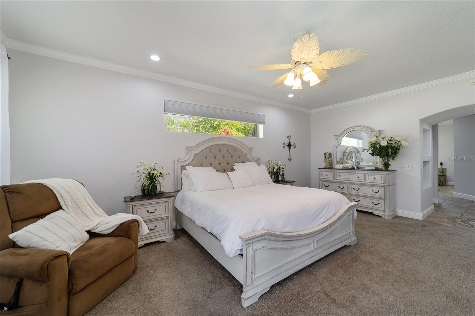 Welcome to your dream home in the coveted Fox Hollow subdivision, a rare gem nestled just minutes away from The Villages, Florida. This expansive property boasts over an acre of land and features a spacious 4-Bedroom / 2-Bathroom plus Den and Formal Dining layout, offering ample space for both relaxation and entertainment. As you step inside, you'll be greeted by stunning Dual Leaded Glass Front Doors, soaring 12' Ceilings adorned with elegant Crown Molding throughout. Coin Corners and 5 1/4" baseboards add a touch of timeless charm to every corner. The heart of the home lies in its well-appointed Kitchen, complete with Solid Wood 42-inch Cabinetry, Imported Granite Countertops, Newer Black SS Samsung Appliances, including Gas Range, and convenient Pantry Closet. Ceramic and accent tile flooring flow seamlessly throughout the main areas, creating a cohesive and stylish ambiance. Escape to the luxurious Primary Bedroom retreat, featuring a spacious Walk-in Closet and sprawling attached En-Suite Bath complete with Jetted Tub and Custom Gorgeous Onyx stone surround. A Private Water Closet with Bidet adds an extra touch of indulgence, while a Slider off the Master Bedroom provides easy access to the tranquil lanai and pool area. Entertain guests with ease in the custom-built entertainment center, complete with plant and lighted accent shelving. Transom Entryway Windows in the office and primary bedroom flood the spaces with natural light. The Split Floor Plan ensures privacy, with three additional bedrooms located away from the primary suite. Upstairs, the Bonus 4th Bedroom space offers versatility and convenience for guests or would make an excellent theater or hobby room! Step outside the quad pocket sliding doors off living room to your own private oasis where a 30 x 14 SALTWATER POOL awaits, complete with Triple Cascade Waterfalls for a touch of luxury. A HUGE Birdcage (New in 2019) and Lanai overlook the completely fenced, north-facing backyard, providing the perfect setting for outdoor gatherings or quiet relaxation. Low-maintenance stone hardscaping and meticulously maintained yard featuring mature plantings, extensive accent and pathway lighting along with in-ground irrigation system create a sense of grandeur and sophistication and complete the luxury exterior. This home is built to last with block and stucco construction. Additional amenities include a whole-house vacuum system, separate Laundry Room with Newer Washer/ and Dryer, Dual HVAC system (main unit New in 2022), Updated Hayward Pool equipment, Tankless Propane-powered RINNAI Hot Water Heater, and a New Storage Shed in 2020, and NEW ROOF in 2021. Don't miss your chance to own this exceptional property offering unparalleled privacy, luxury, and convenience in one of Florida's most desirable locations. Schedule your showing today and make this stunning residence your own!