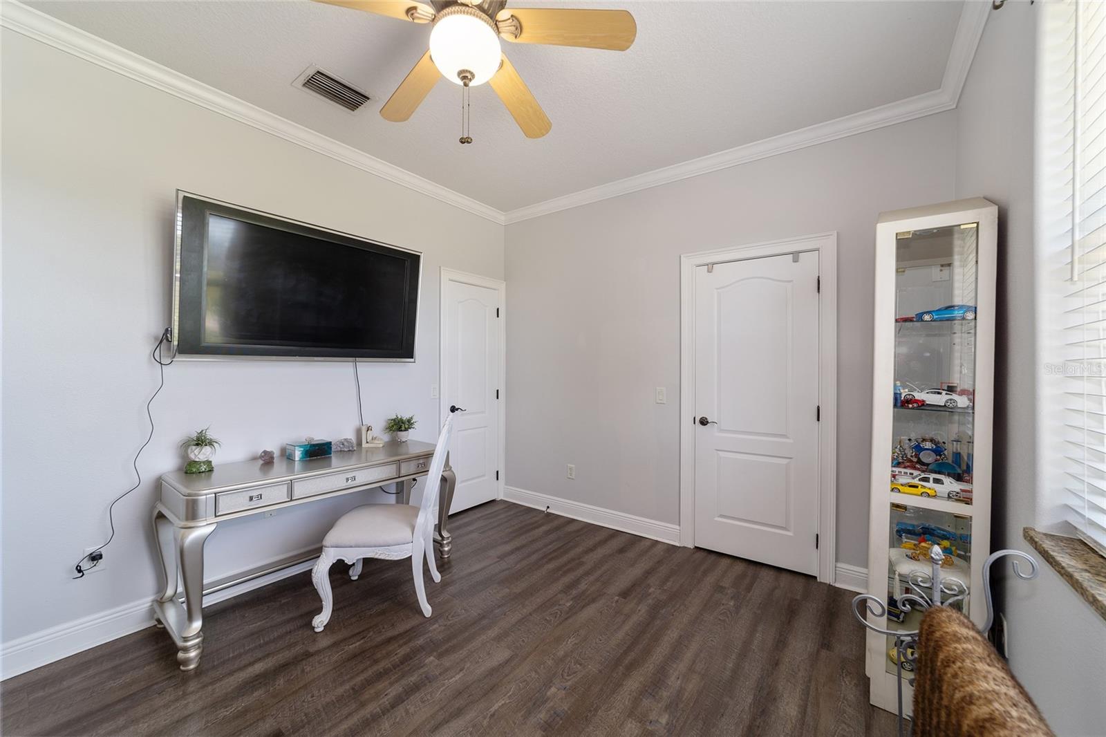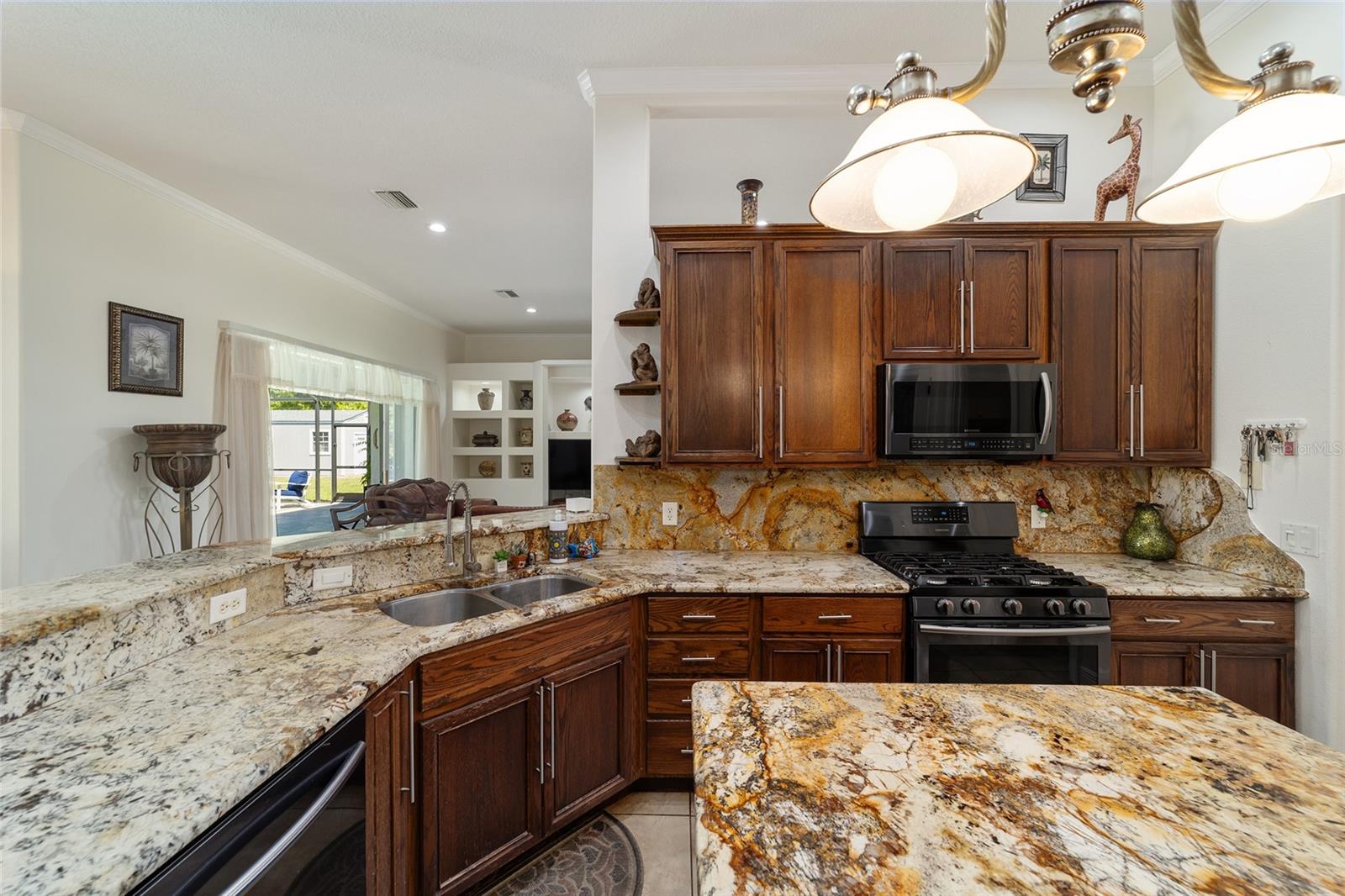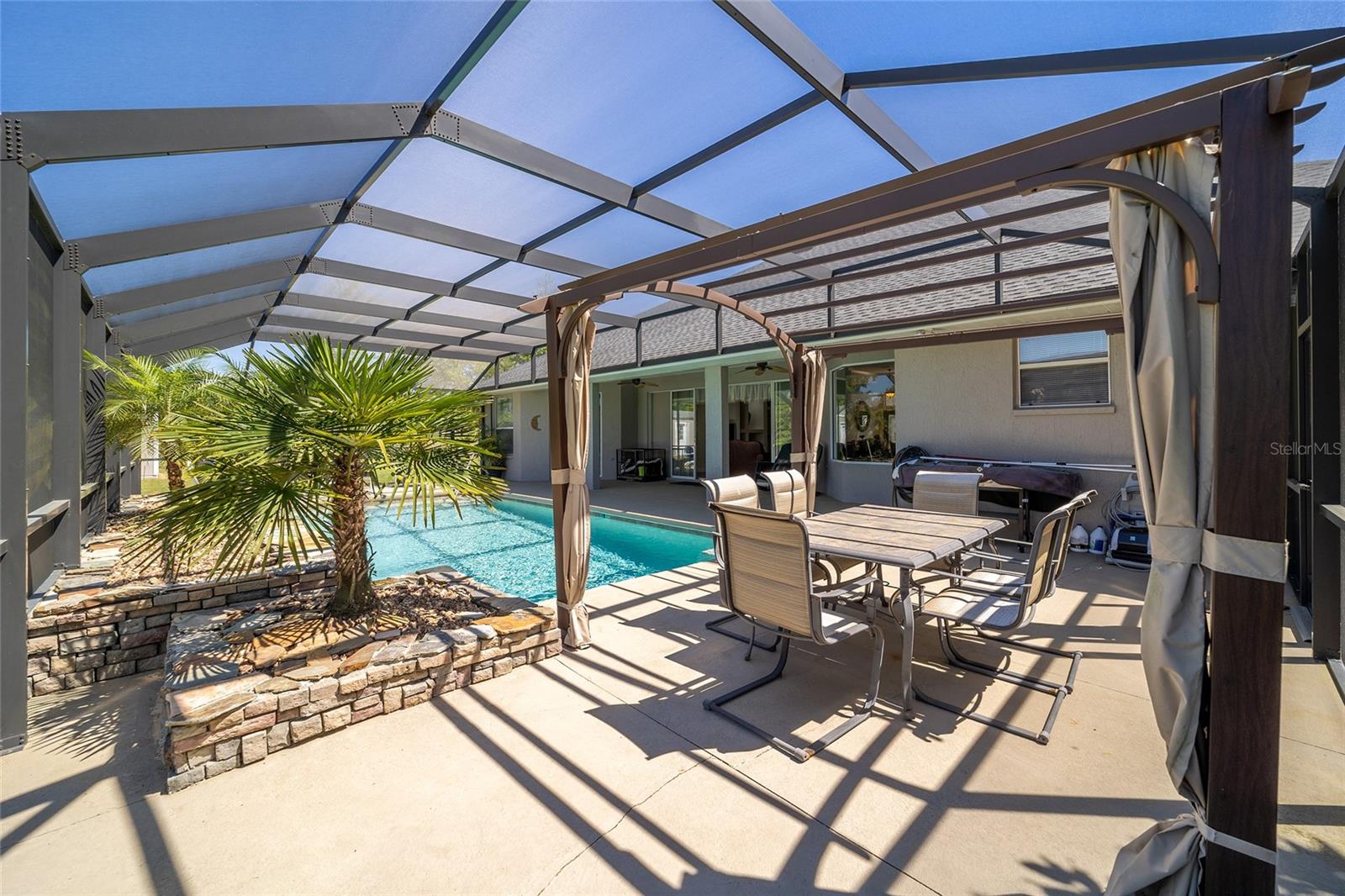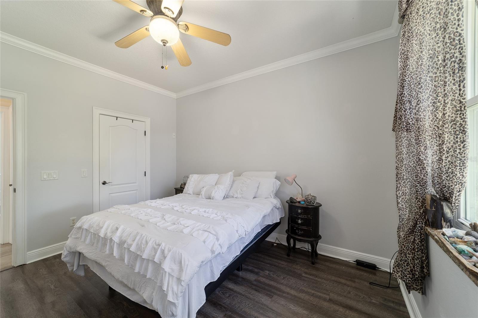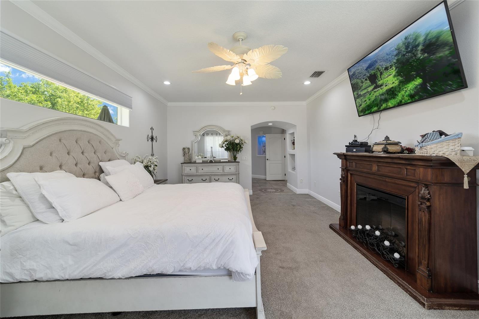 Welcome to your dream home in the coveted Fox Hollow subdivision, a rare gem nestled just minutes away from The Villages, Florida. This expansive property boasts over an acre of land and features a spacious 4-Bedroom / 2-Bathroom plus Den and Formal Dining layout, offering ample space for both relaxation and entertainment. As you step inside, you'll be greeted by stunning Dual Leaded Glass Front Doors, soaring 12' Ceilings adorned with elegant Crown Molding throughout. Coin Corners and 5 1/4" baseboards add a touch of timeless charm to every corner. The heart of the home lies in its well-appointed Kitchen, complete with Solid Wood 42-inch Cabinetry, Imported Granite Countertops, Newer Black SS Samsung Appliances, including Gas Range, and convenient Pantry Closet. Ceramic and accent tile flooring flow seamlessly throughout the main areas, creating a cohesive and stylish ambiance. Escape to the luxurious Primary Bedroom retreat, featuring a spacious Walk-in Closet and sprawling attached En-Suite Bath complete with Jetted Tub and Custom Gorgeous Onyx stone surround. A Private Water Closet with Bidet adds an extra touch of indulgence, while a Slider off the Master Bedroom provides easy access to the tranquil lanai and pool area. Entertain guests with ease in the custom-built entertainment center, complete with plant and lighted accent shelving. Transom Entryway Windows in the office and primary bedroom flood the spaces with natural light. The Split Floor Plan ensures privacy, with three additional bedrooms located away from the primary suite. Upstairs, the Bonus 4th Bedroom space offers versatility and convenience for guests or would make an excellent theater or hobby room! Step outside the quad pocket sliding doors off living room to your own private oasis where a 30 x 14 SALTWATER POOL awaits, complete with Triple Cascade Waterfalls for a touch of luxury. A HUGE Birdcage (New in 2019) and Lanai overlook the completely fenced, north-facing backyard, providing the perfect setting for outdoor gatherings or quiet relaxation. Low-maintenance stone hardscaping and meticulously maintained yard featuring mature plantings, extensive accent and pathway lighting along with in-ground irrigation system create a sense of grandeur and sophistication and complete the luxury exterior. This home is built to last with block and stucco construction. Additional amenities include a whole-house vacuum system, separate Laundry Room with Newer Washer/ and Dryer, Dual HVAC system (main unit New in 2022), Updated Hayward Pool equipment, Tankless Propane-powered RINNAI Hot Water Heater, and a New Storage Shed in 2020, and NEW ROOF in 2021. Don't miss your chance to own this exceptional property offering unparalleled privacy, luxury, and convenience in one of Florida's most desirable locations. Schedule your showing today and make this stunning residence your own!