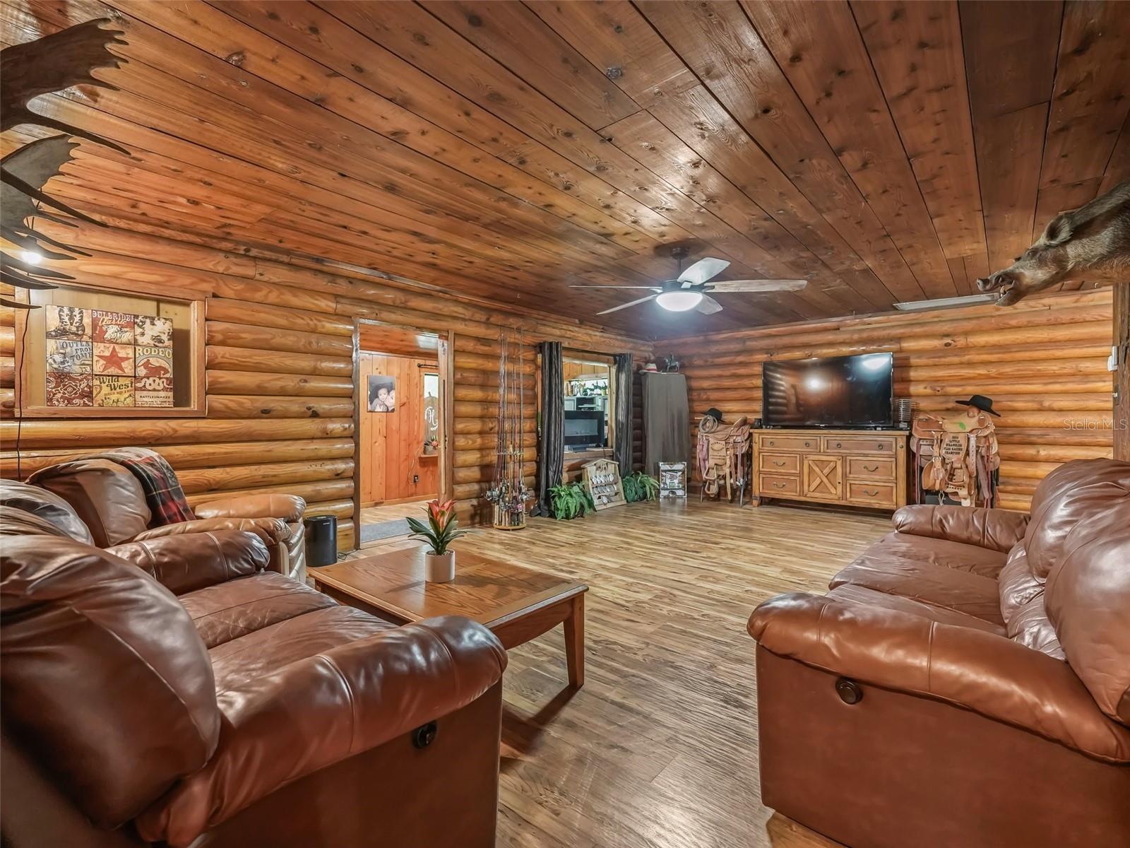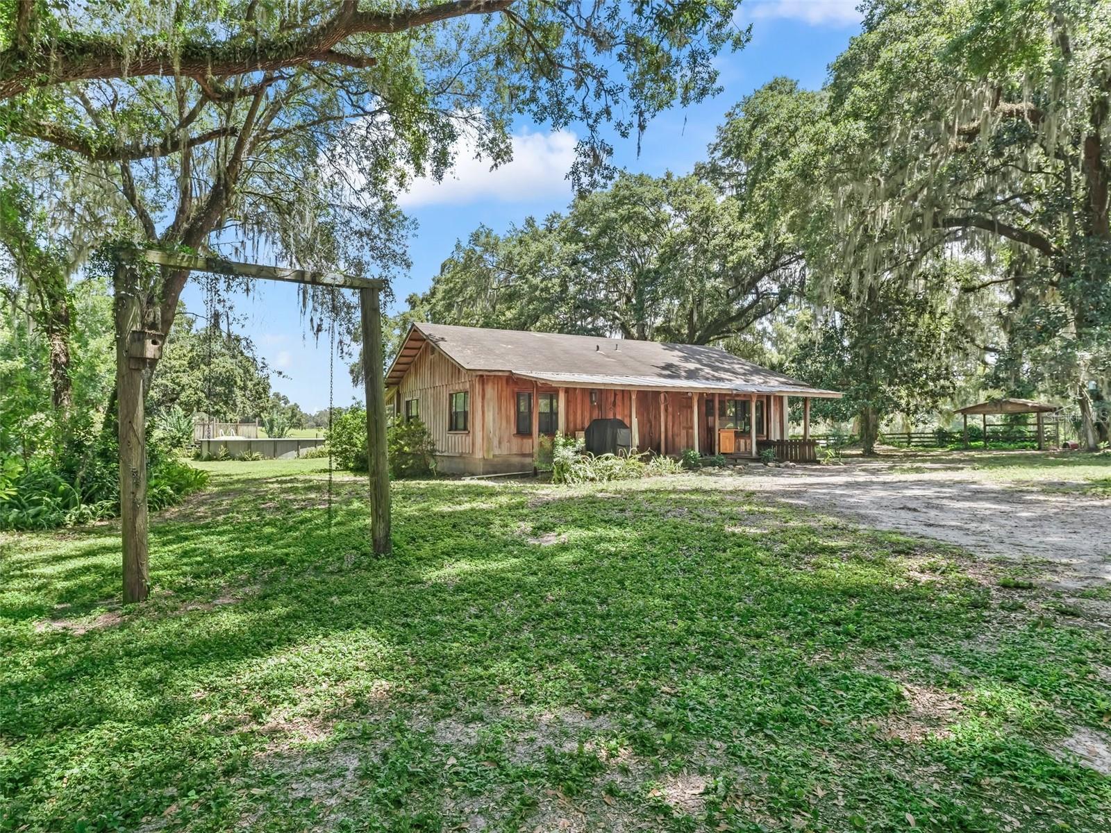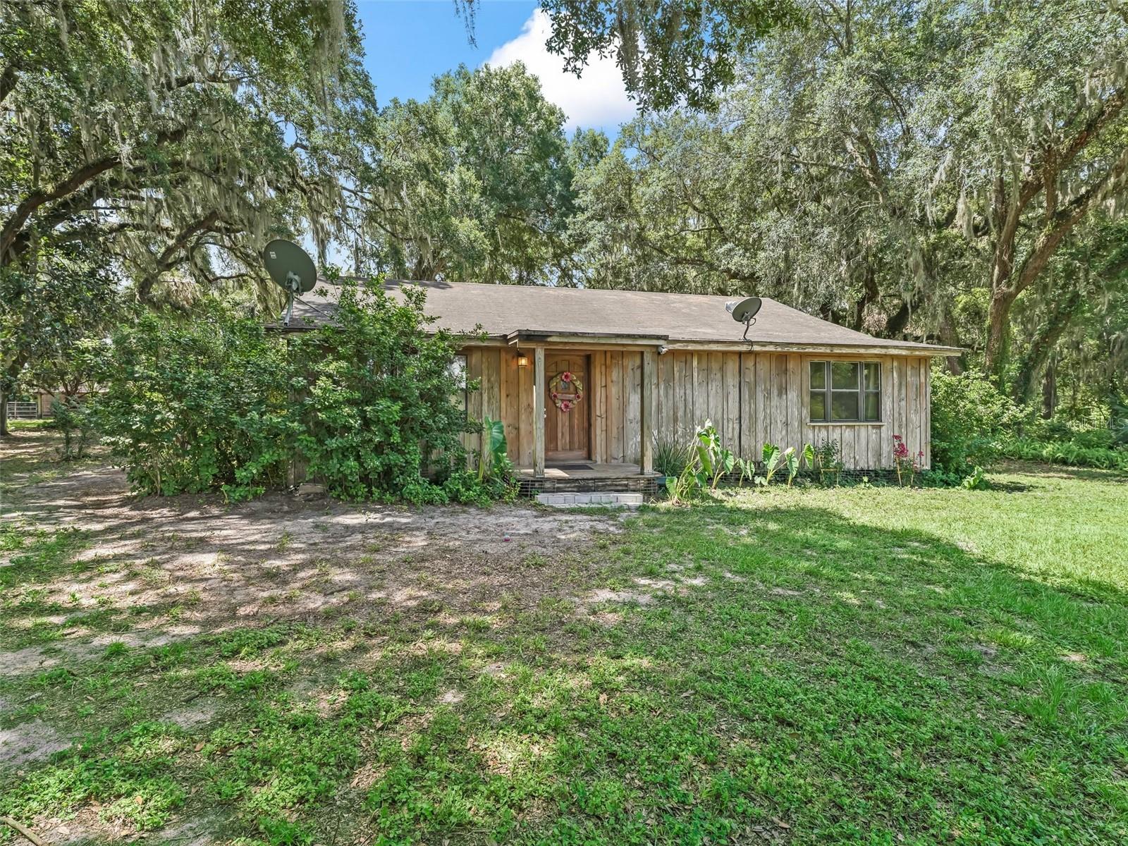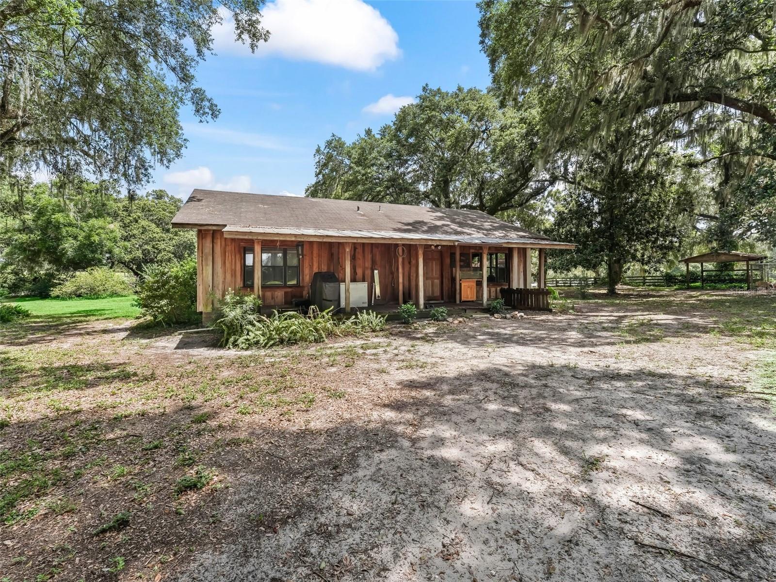 Discover tranquility and adventure! As you enter through the double gates and follow the pathway, anticipation builds, leading you to the charm of this delightful 22 +/- acre retreat. Upon arrival, you will notice the beautiful grandfather oaks thoughtfully placed throughout the property. Relax on your back porch while watching the wildlife. There is plenty of space for animals, as the property is fenced and cross-fenced—so feel free to bring your farm animals! The property features a six-stall barn ready for goats, pigs, or even miniature horses, along with several outbuildings for storage. Additionally, there are two pole barns for extra storage or to house your farm equipment and toys. Now, step into your very own log cabin! Upon entering, you will admire the pecky cypress wood beautifully integrated throughout the home, complementing the wood grain vinyl flooring. You'll instantly feel the charm of Southern living! The house offers two bedrooms and a bonus room that can serve as an office or family room. With spacious living areas, this home provides a warm and inviting atmosphere for you and your loved ones, creating an ideal space for entertaining or simply relaxing. Imagine waking up to the peaceful sounds of nature. Secluded yet conveniently located near The Villages, Tampa, Orlando, and Ocala, you will have access to all the amenities you desire. If you have a need for multiple home sites, the Sumter County Planning and Zoning Department indicates that the property has the potential to be split. Don’t miss the chance to make this your own piece of paradise!