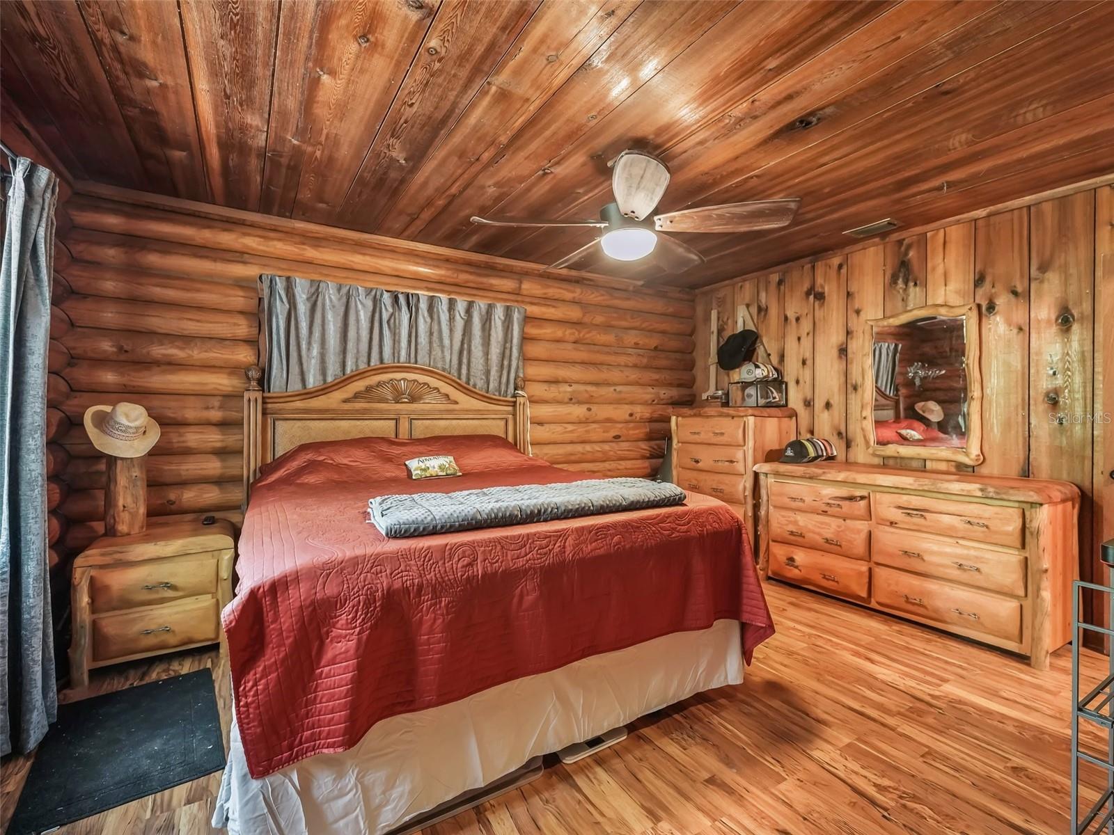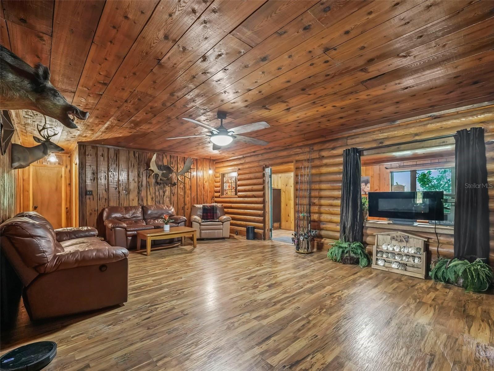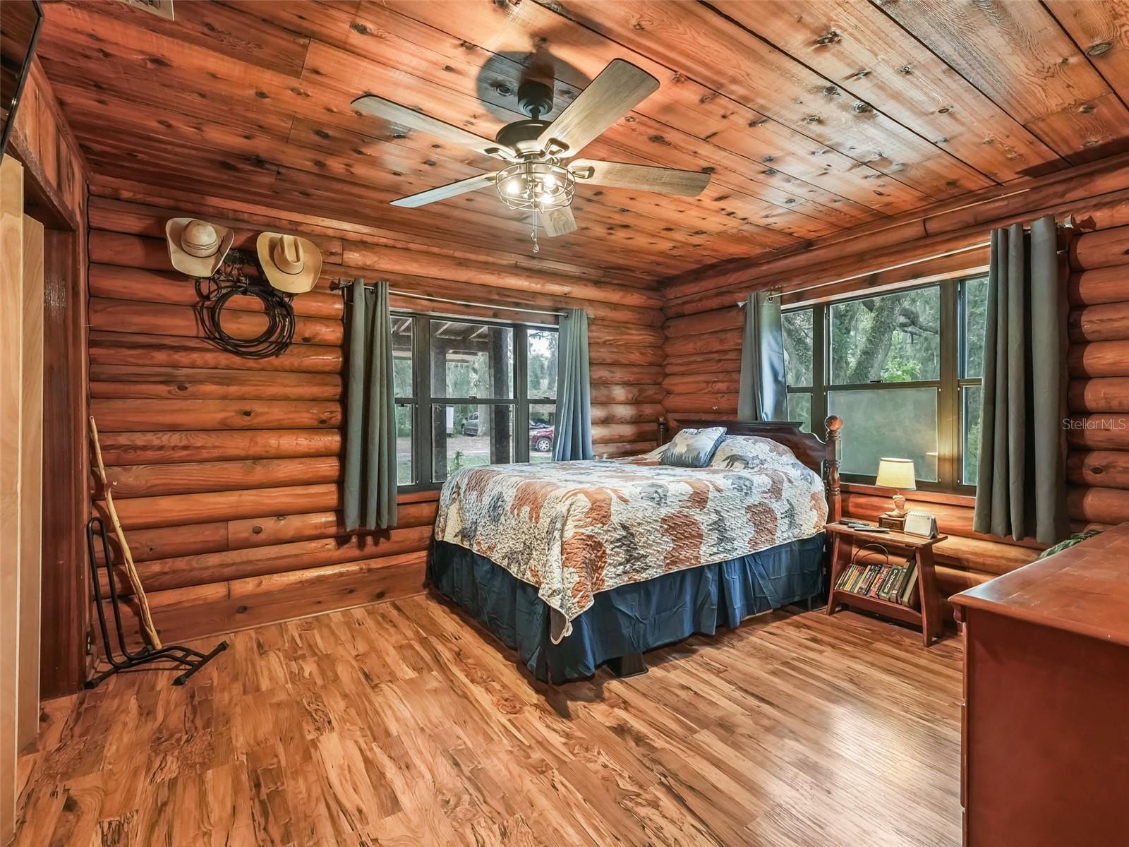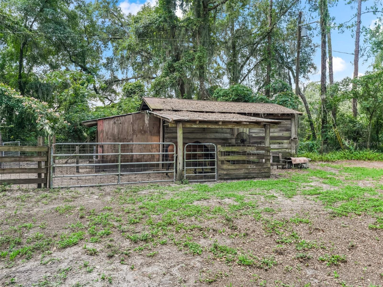 Discover tranquility and adventure! As you enter through the double gates and follow the pathway, anticipation builds, leading you to the charm of this delightful 22 +/- acre retreat. Upon arrival, you will notice the beautiful grandfather oaks thoughtfully placed throughout the property. Relax on your back porch while watching the wildlife. There is plenty of space for animals, as the property is fenced and cross-fenced—so feel free to bring your farm animals! The property features a six-stall barn ready for goats, pigs, or even miniature horses, along with several outbuildings for storage. Additionally, there are two pole barns for extra storage or to house your farm equipment and toys. Now, step into your very own log cabin! Upon entering, you will admire the pecky cypress wood beautifully integrated throughout the home, complementing the wood grain vinyl flooring. You'll instantly feel the charm of Southern living! The house offers two bedrooms and a bonus room that can serve as an office or family room. With spacious living areas, this home provides a warm and inviting atmosphere for you and your loved ones, creating an ideal space for entertaining or simply relaxing. Imagine waking up to the peaceful sounds of nature. Secluded yet conveniently located near The Villages, Tampa, Orlando, and Ocala, you will have access to all the amenities you desire. If you have a need for multiple home sites, the Sumter County Planning and Zoning Department indicates that the property has the potential to be split. Don’t miss the chance to make this your own piece of paradise!
