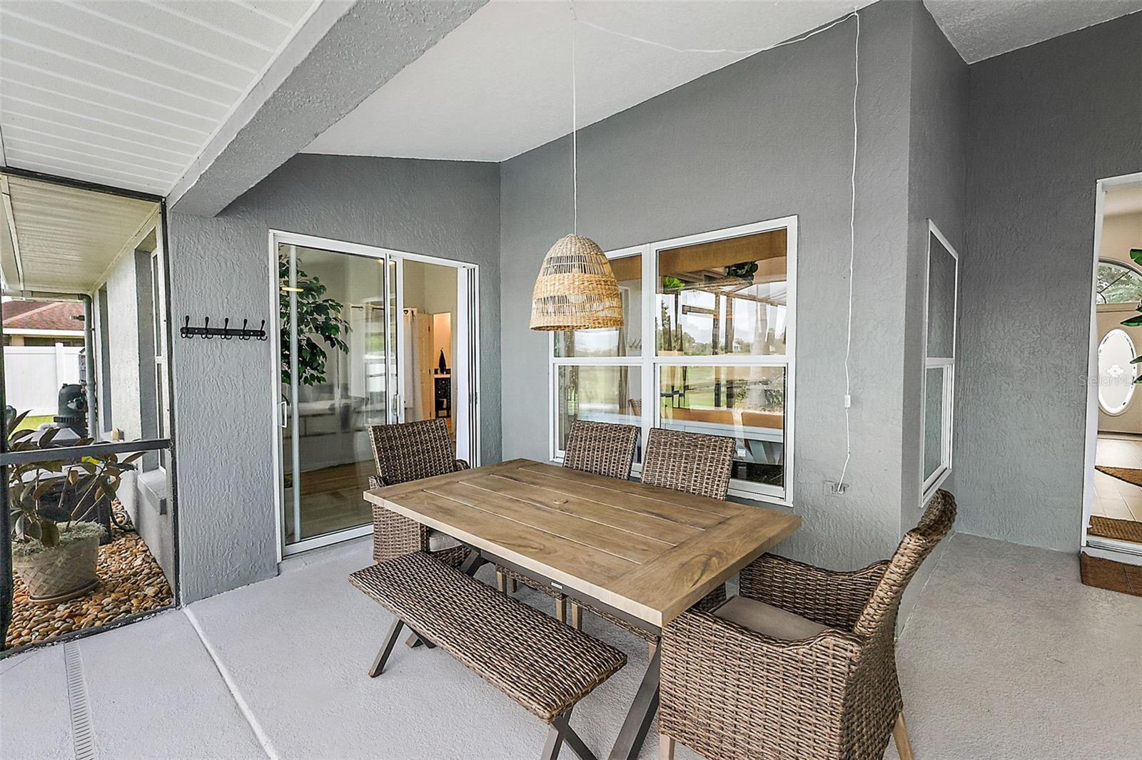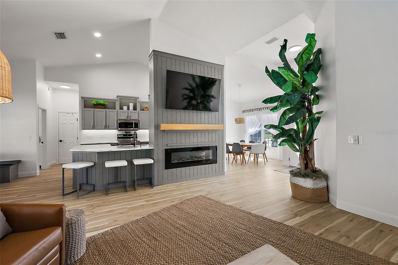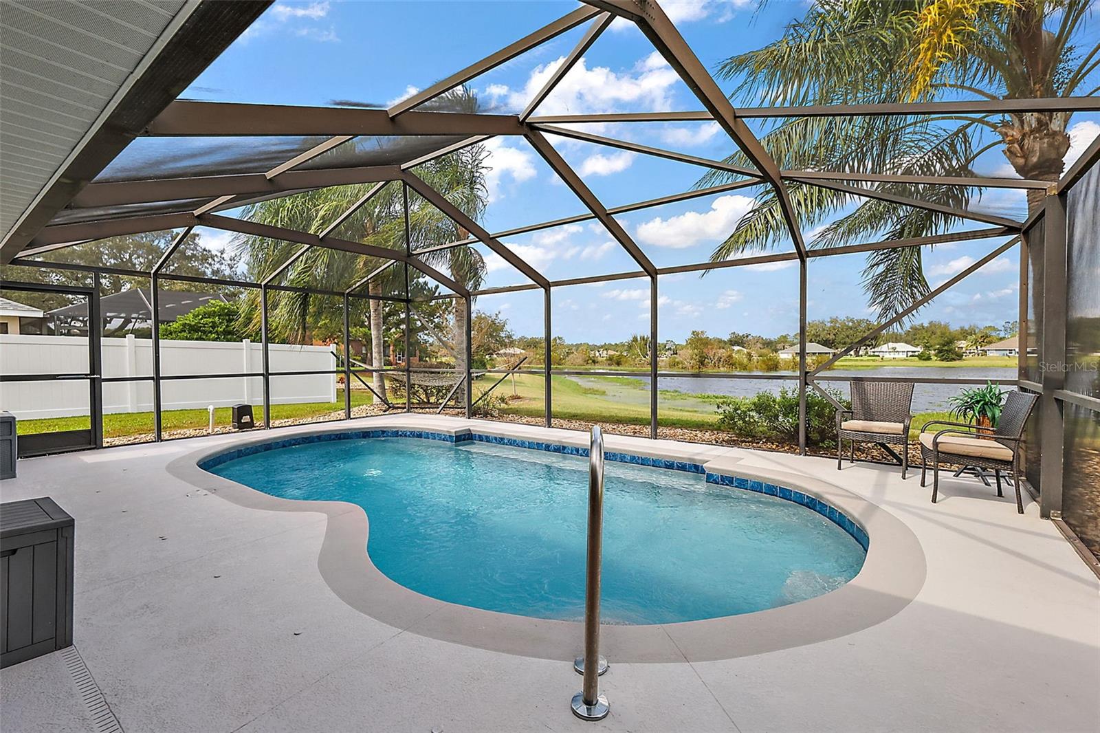OVERLOOK SERENE WATERFRONT VIEWS and ENJOY WILDLIFE GALORE in this ABSOLUTELY STUNNING, BEAUTIFULLY RENOVATED 3/2 + DEN/OFFICE, BLOCK and STUCCO POOL HOME situated on an OVERSIZED one/third-acre PRIVATE lot in the Fairways of Rolling Hills subdivision JUST MINUTES from the VIBRANT entertainment, dining, and shopping of THE VILLAGES! Elegantly etched DOUBLE ENTRY DOORS welcome you into the foyer of this magnificent home! Upon entering, you will immediately be AWE-STRUCK by the CAPTIVATING WATERFRONT VIEWS and gorgeous SOLAR HEATED POOL! This wonderful outdoor oasis offers ABUNDANT PRIVACY with FENCING along each side property line. There’s also an above ground HOT TUB, perfect for unwinding after a long day. The covered lanai features a lovely dining area and a generous sitting space with sliding panels. Dive into the refreshing POOL, soak up the sun on the spacious deck, lounge in the hammock with your favorite book, or simply sit and enjoy the surrounding wildlife of the peaceful bird sanctuary! The interior of this STUNNING home features a spacious OPEN LAYOUT with SOARING 15’ vaulted ceilings in the main living area. The modern hickory Pergo flooring flows seamlessly throughout, with 5” baseboards enhancing the home’s beauty and style. The spacious living room features three panels of 8 ft tall POCKET SLIDING GLASS DOORS that open to the amazing pool area! The heart of this space is the custom built SHIPLAP entertainment wall enhanced with a cozy electric FIREPLACE and beautiful hickory mantel. A modern dining room with double windows, and striking chandelier provide a lovely space for entertaining. The EXCEPTIONAL kitchen boasts gray wood cabinetry customized with staggered decorative up-lit display boxes above; GORGEOUS, MODERN VEINED QUARTZ countertops with subway TILE backsplashes; STAINLESS appliances; a SHIPLAP accent wall with CUSTOM WOOD SHELVES; above and under cabinet lighting; a counter-height eat-in breakfast bar; a closet PANTRY; and an additional PANTRY closet just off of the kitchen. The adjacent dinette nook area features a custom built-in U-shaped bench with additional storage and three windows overlooking the amazing pool and water. The primary bedroom features beautiful VAULTED ceilings, a generous WALK-IN closet, and sliding doors leading to the pool/lanai area. Its en-suite bathroom boasts TWO striking deep blue vanities with gorgeous oval mirrors and modern lighting, a large soaking tub with SHIPLAP and TILE accents, a TILED, WALK-IN, ROMAN STYLE shower, a separate water closet room, and a linen closet. On the other side of the main living area, the SPLIT FLOOR PLAN offers two additional bedrooms and an updated second bathroom. There’s also an ADDITIONAL room customized as a DEN/HOME OFFICE featuring an 8’ double desk area, built-in drawers, filing cabinets, book shelves, and floating shelves. The interior laundry room offers a washer, dryer, utility sink, and white shaker cabinets for additional storage. The SIDE-LOAD, two-car garage features white storage cabinets with a built-in workbench/tool area, attic access, and painted floor. ROOF and HVAC (2022); HWH (2019); Too many upgrades to mention!!! DON’T MISS YOUR OPPORTUNITY TO OWN THIS MAGNIFICENT WATERFRONT POOL HOME! PLEASE WATCH OUR VIDEO of this INCREDIBLE HOME and CALL TODAY to schedule your Private Showing or Virtual Tour!