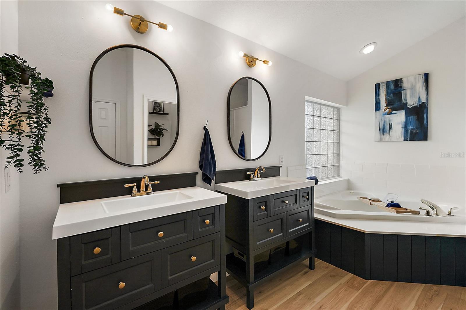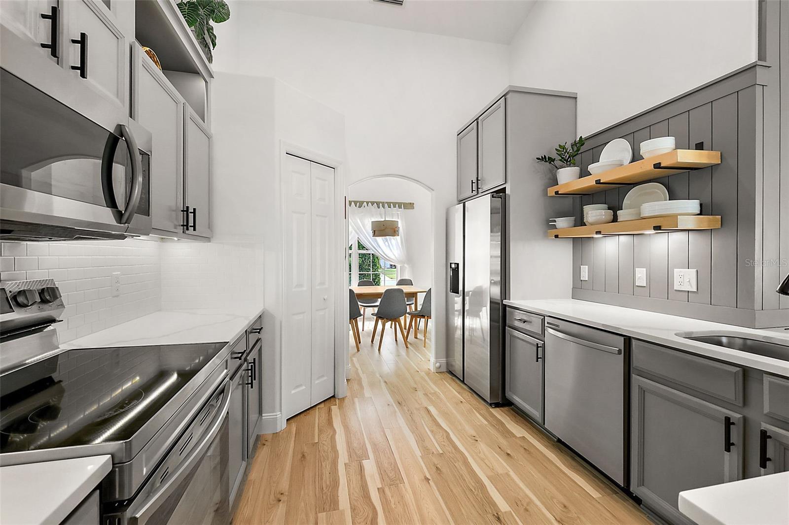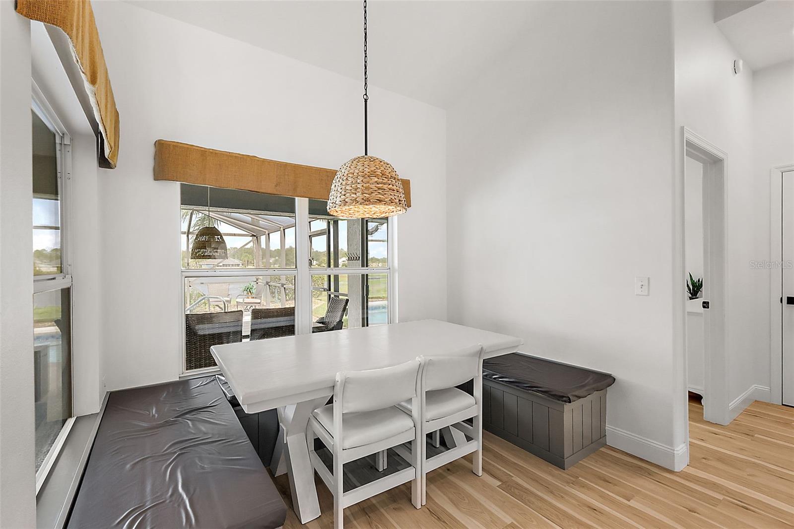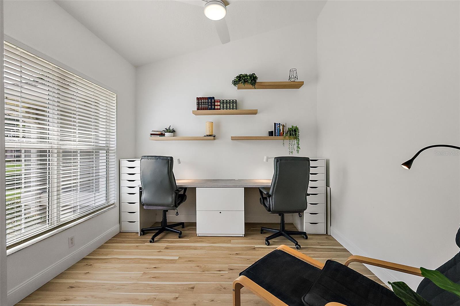 OVERLOOK SERENE WATERFRONT VIEWS and ENJOY WILDLIFE GALORE in this ABSOLUTELY STUNNING, BEAUTIFULLY RENOVATED 3/2 + DEN/OFFICE, BLOCK and STUCCO POOL HOME situated on an OVERSIZED one/third-acre PRIVATE lot in the Fairways of Rolling Hills subdivision JUST MINUTES from the VIBRANT entertainment, dining, and shopping of THE VILLAGES! Elegantly etched DOUBLE ENTRY DOORS welcome you into the foyer of this magnificent home! Upon entering, you will immediately be AWE-STRUCK by the CAPTIVATING WATERFRONT VIEWS and gorgeous SOLAR HEATED POOL! This wonderful outdoor oasis offers ABUNDANT PRIVACY with FENCING along each side property line. There’s also an above ground HOT TUB, perfect for unwinding after a long day. The covered lanai features a lovely dining area and a generous sitting space with sliding panels. Dive into the refreshing POOL, soak up the sun on the spacious deck, lounge in the hammock with your favorite book, or simply sit and enjoy the surrounding wildlife of the peaceful bird sanctuary! The interior of this STUNNING home features a spacious OPEN LAYOUT with SOARING 15’ vaulted ceilings in the main living area. The modern hickory Pergo flooring flows seamlessly throughout, with 5” baseboards enhancing the home’s beauty and style. The spacious living room features three panels of 8 ft tall POCKET SLIDING GLASS DOORS that open to the amazing pool area! The heart of this space is the custom built SHIPLAP entertainment wall enhanced with a cozy electric FIREPLACE and beautiful hickory mantel. A modern dining room with double windows, and striking chandelier provide a lovely space for entertaining. The EXCEPTIONAL kitchen boasts gray wood cabinetry customized with staggered decorative up-lit display boxes above; GORGEOUS, MODERN VEINED QUARTZ countertops with subway TILE backsplashes; STAINLESS appliances; a SHIPLAP accent wall with CUSTOM WOOD SHELVES; above and under cabinet lighting; a counter-height eat-in breakfast bar; a closet PANTRY; and an additional PANTRY closet just off of the kitchen. The adjacent dinette nook area features a custom built-in U-shaped bench with additional storage and three windows overlooking the amazing pool and water. The primary bedroom features beautiful VAULTED ceilings, a generous WALK-IN closet, and sliding doors leading to the pool/lanai area. Its en-suite bathroom boasts TWO striking deep blue vanities with gorgeous oval mirrors and modern lighting, a large soaking tub with SHIPLAP and TILE accents, a TILED, WALK-IN, ROMAN STYLE shower, a separate water closet room, and a linen closet. On the other side of the main living area, the SPLIT FLOOR PLAN offers two additional bedrooms and an updated second bathroom. There’s also an ADDITIONAL room customized as a DEN/HOME OFFICE featuring an 8’ double desk area, built-in drawers, filing cabinets, book shelves, and floating shelves. The interior laundry room offers a washer, dryer, utility sink, and white shaker cabinets for additional storage. The SIDE-LOAD, two-car garage features white storage cabinets with a built-in workbench/tool area, attic access, and painted floor. ROOF and HVAC (2022); HWH (2019); Too many upgrades to mention!!! DON’T MISS YOUR OPPORTUNITY TO OWN THIS MAGNIFICENT WATERFRONT POOL HOME! PLEASE WATCH OUR VIDEO of this INCREDIBLE HOME and CALL TODAY to schedule your Private Showing or Virtual Tour!