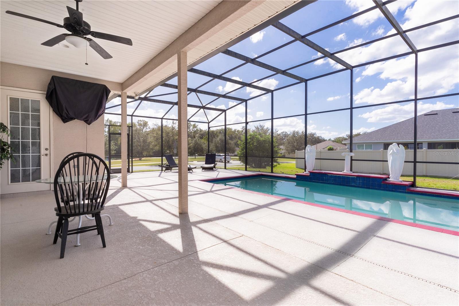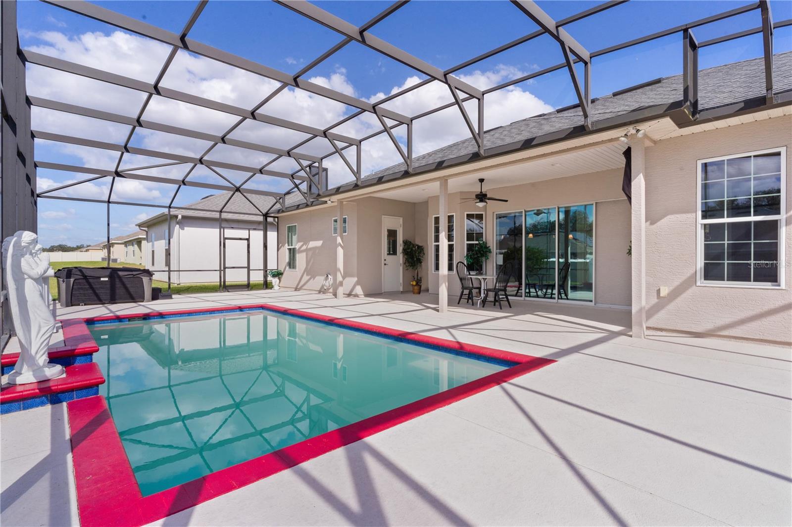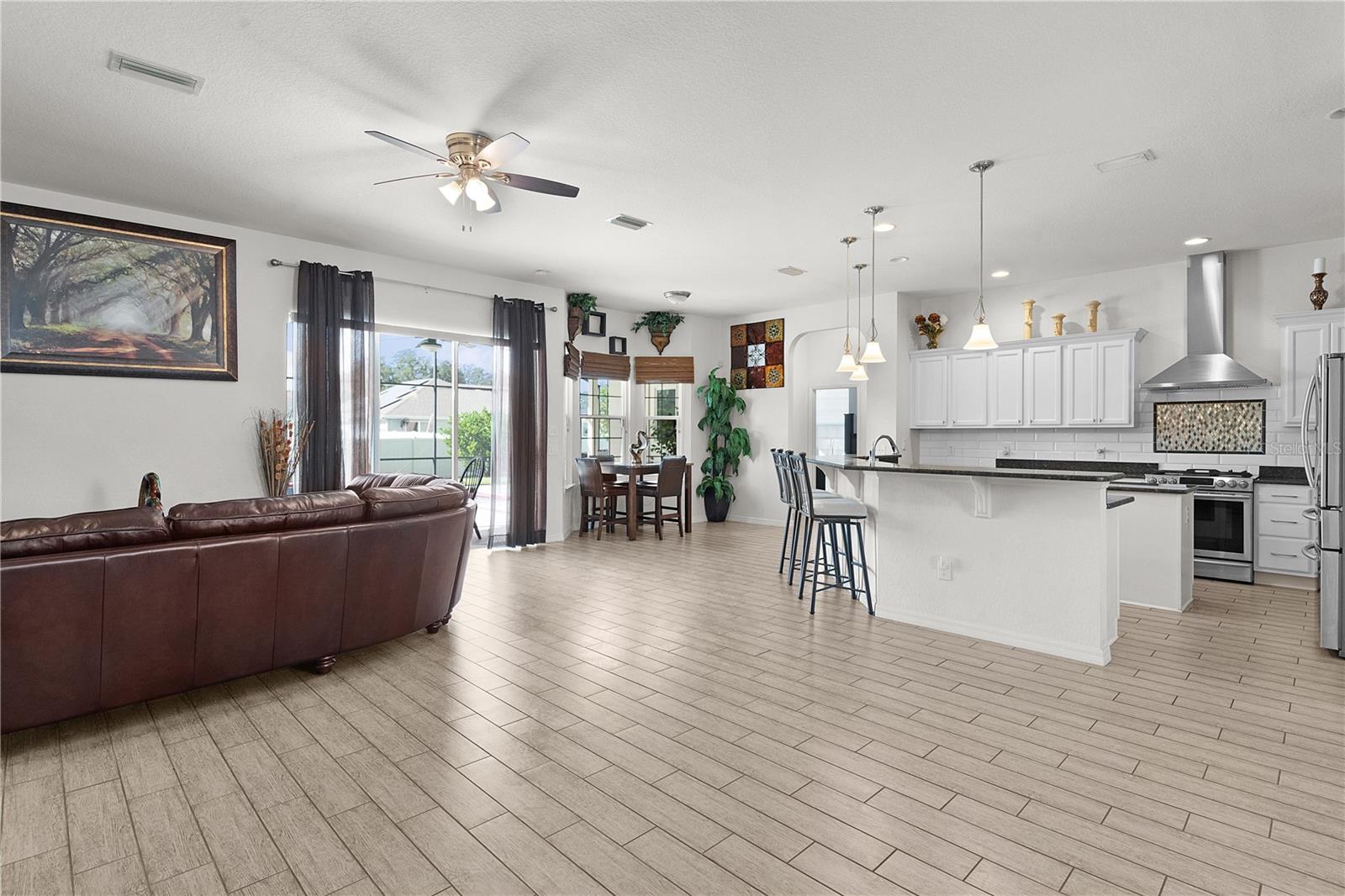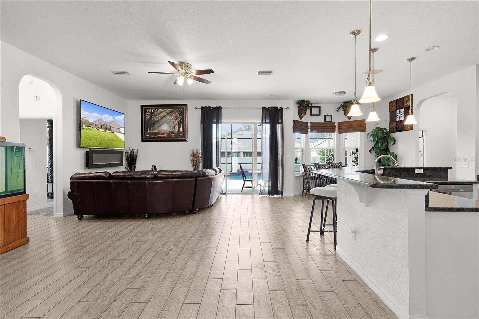 Stunning Move-In Ready Saltwater Pool Home in Pepper Tree Village, just minutes from Brownwood Paddock Squares, schools, and much more! Discover your dream home in this beautifully maintained 4-bedroom, 3-bathroom residence in the desirable Wildwood community. Situated on a generous .26-acre corner lot, this property overlooks a lovely community park with exercise equipment and is just minutes away from The Villages, schools, dining, shopping, and entertainment. This home boasts an open floor plan with soaring ceilings and abundant natural light. The spacious kitchen features Samsung stainless steel appliances, a natural Gas stove, granite countertops, stylish shaker cabinetry with soft-close hinges, a kitchen island, and a pantry—perfect for culinary enthusiasts. The common areas have wood-like tile flooring, and the living area seamlessly connects to the expansive screened-in birdcage and sparkling saltwater pool, making it an ideal space for entertaining family and friends. Retreat to the luxurious master suite with private patio access and an ensuite featuring a walking closet, double sinks, a beautifully remodeled bathtub, and a walk-in shower. The additional bedrooms are spacious and inviting, with well-appointed bathrooms, one of which serves as a convenient pool bath. With an oversized 2-car garage, this home combines style and practicality. Don’t miss out on this exceptional property—call today to schedule your showing! Check out our video tour!!