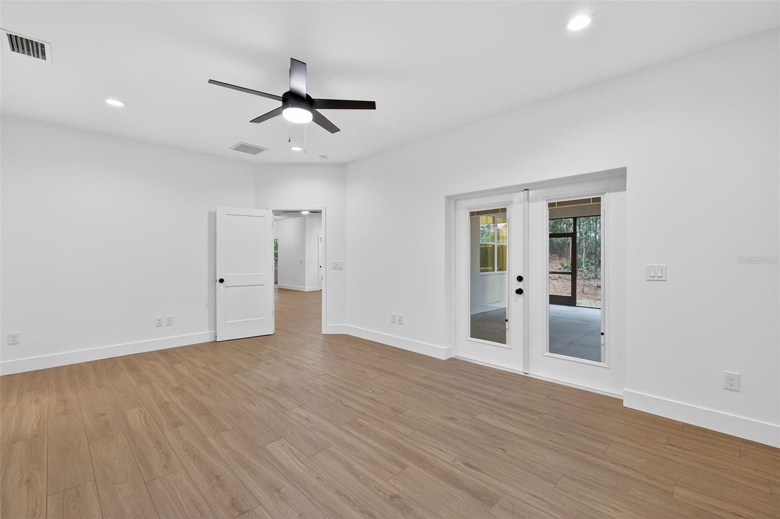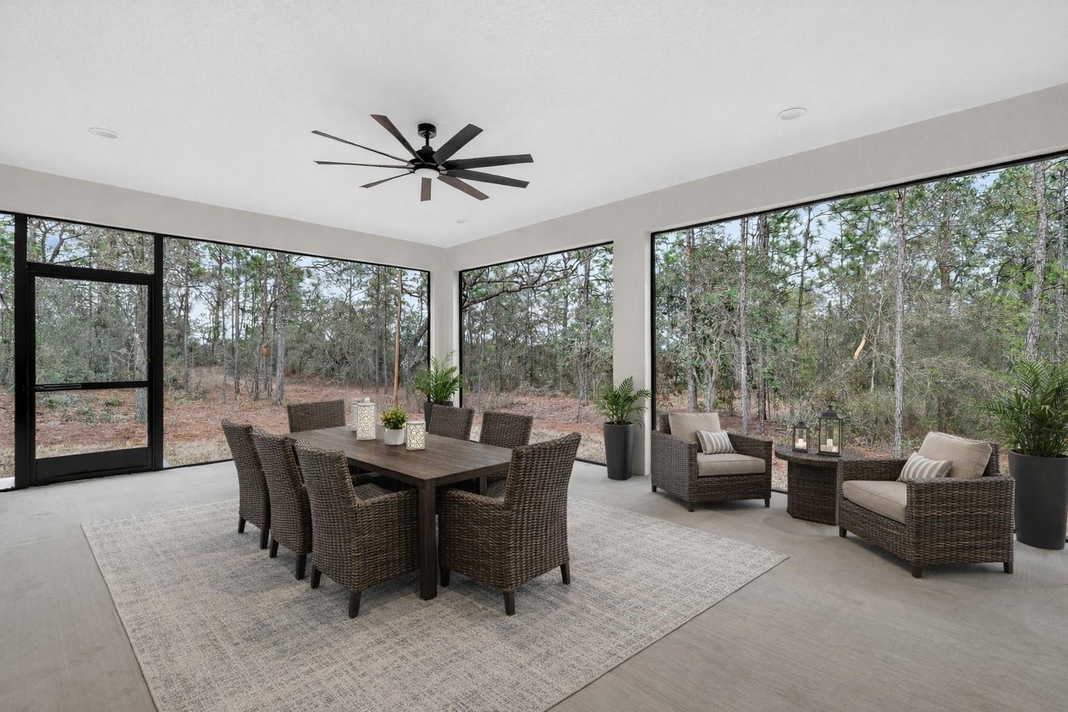 One or more photo(s) has been virtually staged. Brand new and move-in ready on over an acre in Oak Hill, an exclusive acreage community on the outskirts of Wildwood. This custom block residence sits on a 1.1-acre wooded estate lot with mature tree buffers and a true sense of seclusion. Offering 1,955 square feet of living space and 2,977 total under roof with 4 bedrooms, 2 baths, and high ceilings. The primary suite features a generous walk-in closet, dual vanities, and a walk-in shower. Quartz countertops, stainless steel appliances, luxury vinyl plank flooring, and designer tile baths. French doors open from the great room and primary suite onto a screened lanai perfect for entertaining or enjoying Florida evenings. Spacious two-car garage with 16-foot overhead door. Built strong with block construction, private well and septic, and irrigation in place. Room for an accessory structure up to 900 SF for your boat or toys. Ideally located just minutes from The Villages, I-75, shopping, dining, and recreation, this is acreage living with convenience close at hand.