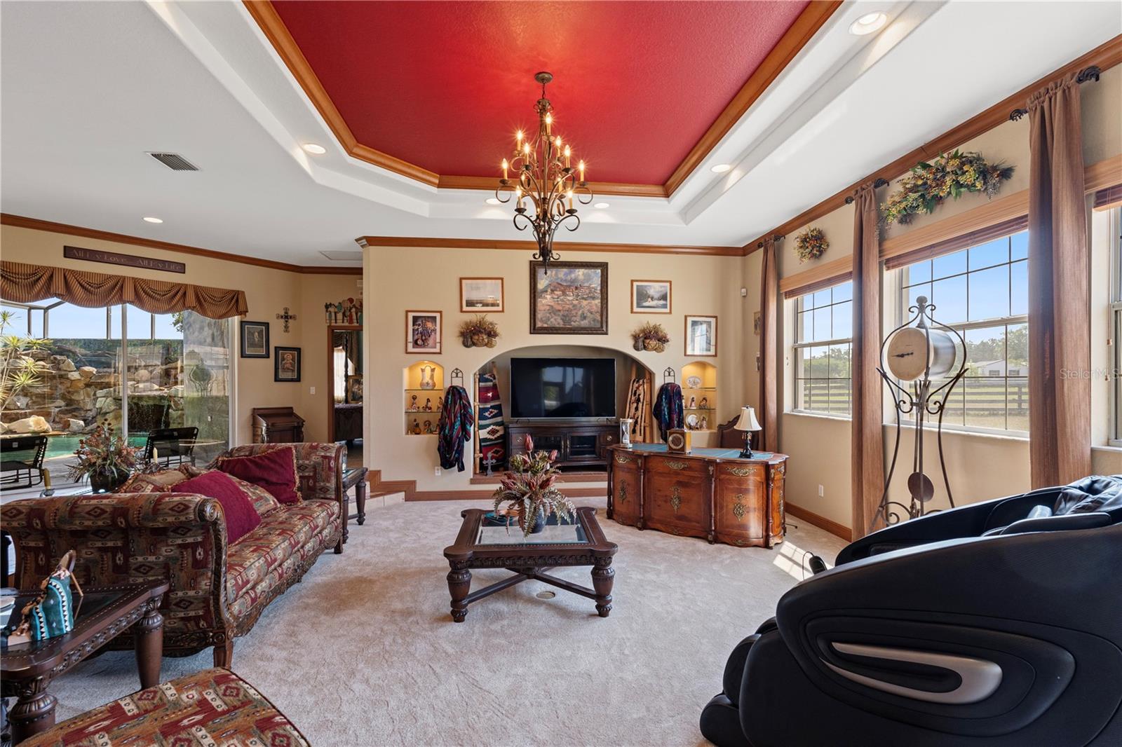 Looking for the Extraordinary? This Custom Built home makes a dramatic impression. As soon as you enter, the impeccable design of this home will have you in awe. Step in to your tropical oasis! The pool, rock waterfalls, cave/spa and tropical mural will immediately have you relaxed. The elegant Chef's kitchen is made of the highest quality finishes including solid wood cabinets, solid surface countertops and elegant lighting. The living room offers a cozy place to unwind and includes tray ceilings and brand new carpet. Beautiful ceramic tile throughout the remainder of the home. The primary bedroom is a luxurious retreat, featuring tray ceilings, an amazingly spacious walk-in closet with built-in shelves and drawers, providing ultimate storage and organization. The ensuite bath feels like a personal spa, complete with a stunning jacuzzi tub with 21 jets, along with a double walk-in shower. Surround sound through-out the home, including the courtyard! The inside the home offers a gorgeous view of the pool and outdoor resort area through a wall of sliding glass pocket doors. The third bedroom/full bath has it's own private entrance from the courtyard. Perfect for a guest or in-law suite. New Roof, hot water heater and exterior paint in 2024! Extensive list of features and updates available. One acre corner lot with 14x14 detached block workshop/garage. Located in the highly desired neighborhood of Fox Hollow, minutes from The Villages! Welcome to living in comfort and style - this home is a 'must see'! Call today for your personal tour.