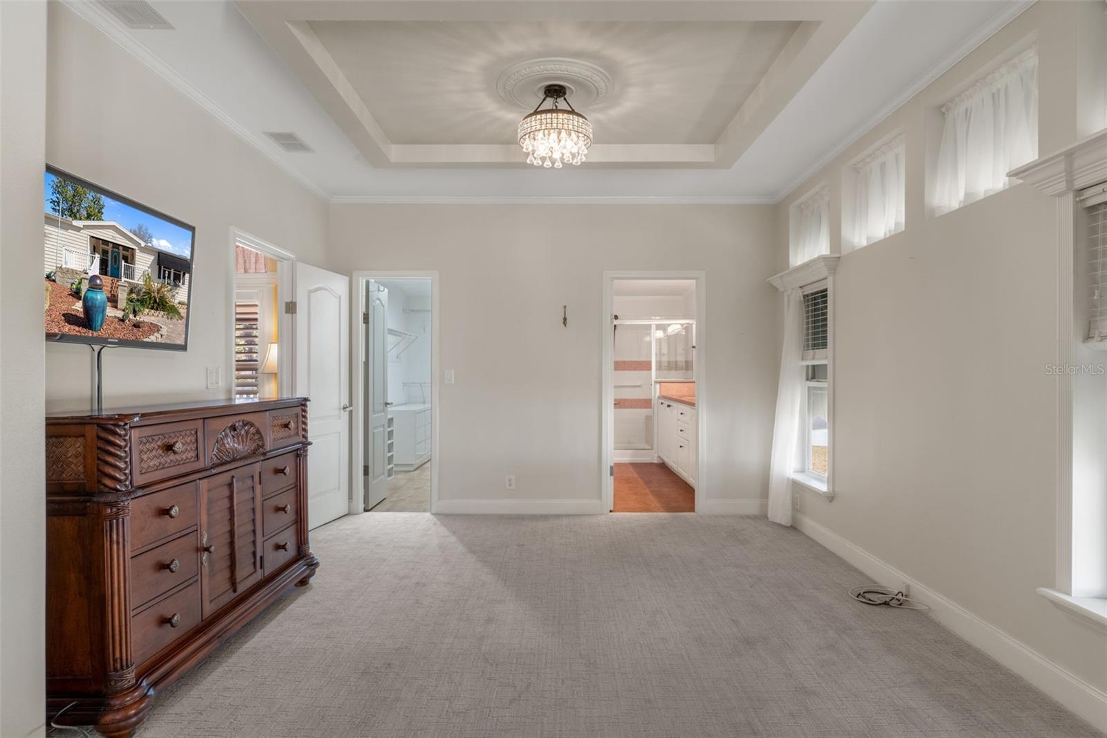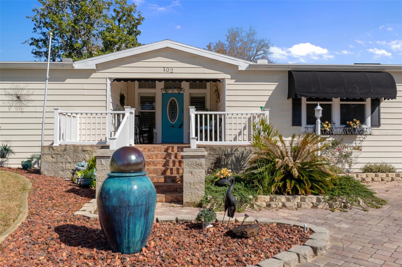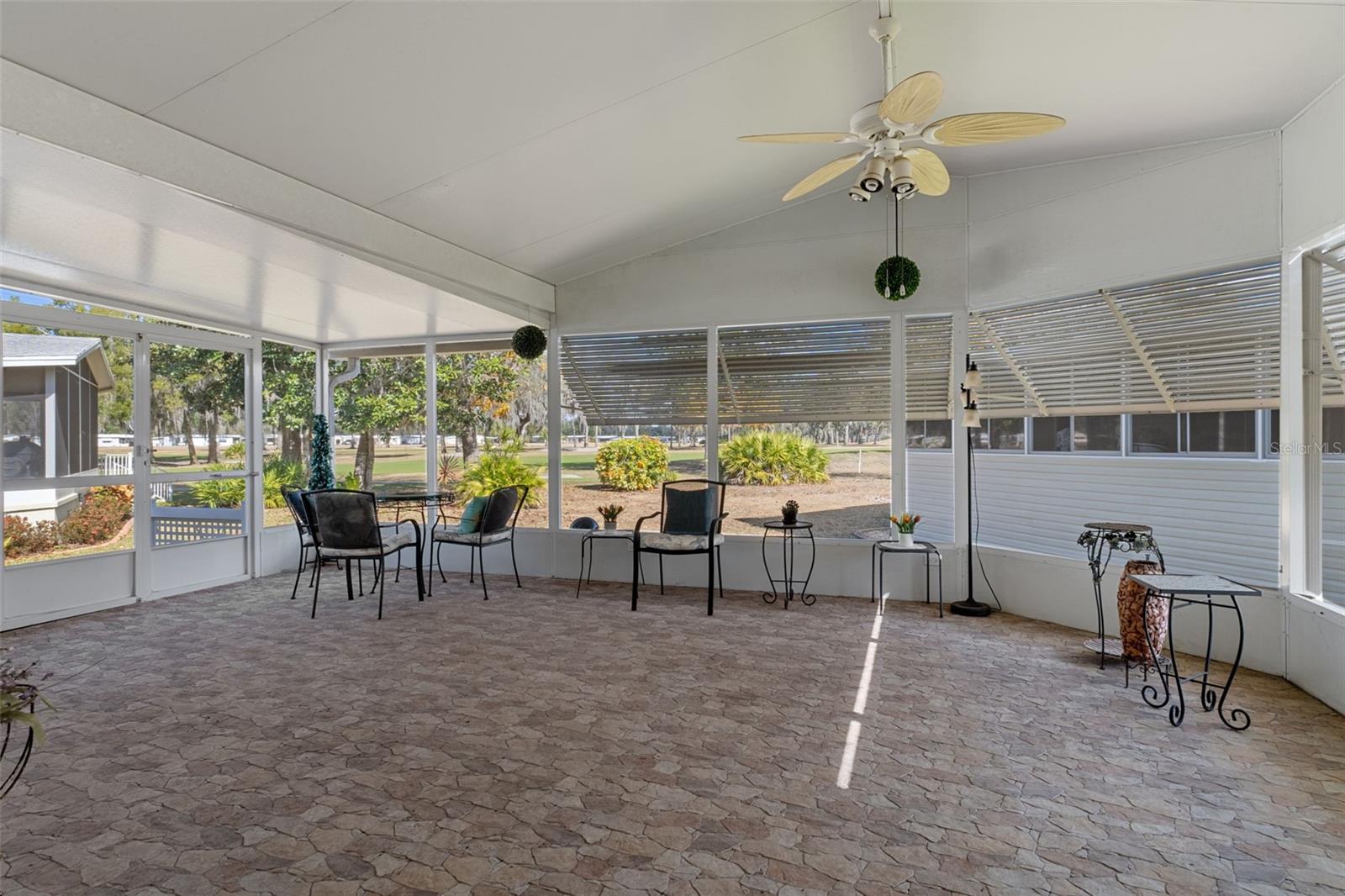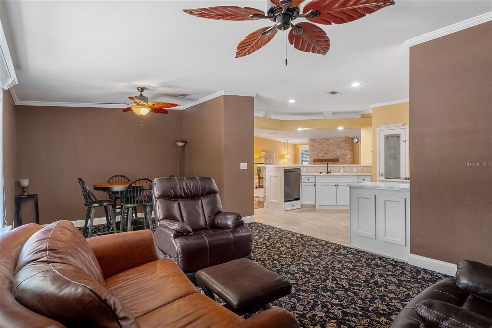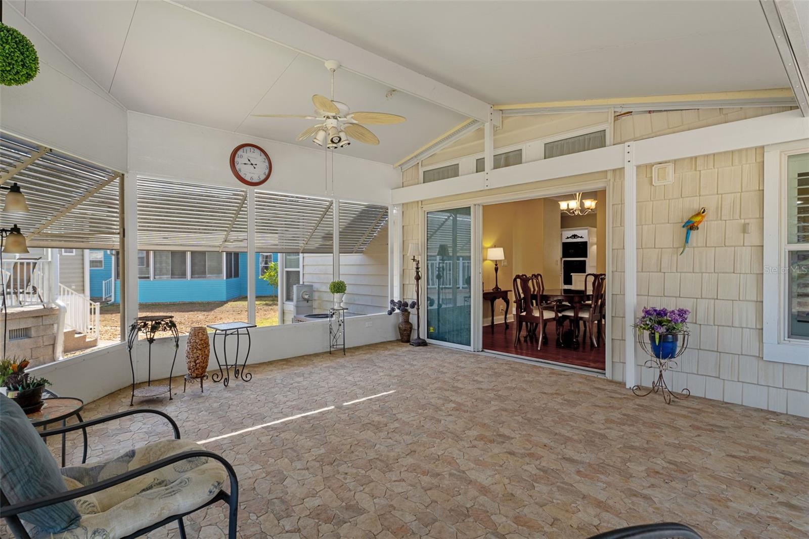 This is Florida 55+ living at its finest in the gated Continental Country Club, just minutes from The Villages. Located on a quiet cul-de-sac with golf course views, this newer triple-wide manufactured home offers exceptional curb appeal with manicured landscaping, a paver driveway, and a welcoming front porch. Step inside to a bright, open interior featuring high ceilings and generously sized rooms. The spacious living room includes a fireplace with both electric and gas options (currently uses electric, but gas hookup already in place). The kitchen is a standout with Corian countertops, a center island cooktop, a pantry, a large storage closet, and abundant cabinet and counter space, plus a newer refrigerator. The oversized primary suite features a large walk-in closet and a luxurious en-suite bathroom. A cozy front family room leads to the second bedroom, while the rear of the home offers a dining area, hall bathroom, and a versatile bonus room ideal for an office, hobby room, or guest space. Additional features include a large indoor utility room with laundry hookups and sink, leading to an oversized one-car garage with a lofted storage area for added convenience. Enjoy Florida outdoor living on the expansive 33' x 15' screened lanai with triple sliders from the dining area—perfect for morning coffee or evening relaxation with backyard and golf course views. The lanai opens to a concrete patio with plumbing and electrical already in place for a hot tub or spa. Continental Country Club offers resort-style amenities including golf, a community pool, fitness center, tennis, shuffleboard, pickleball, an on-site restaurant, and a full activities calendar. Conveniently located near shopping, dining, entertainment, and medical facilities, with easy access to Orlando (about 1 hour) and Tampa (about 1.5 hours).