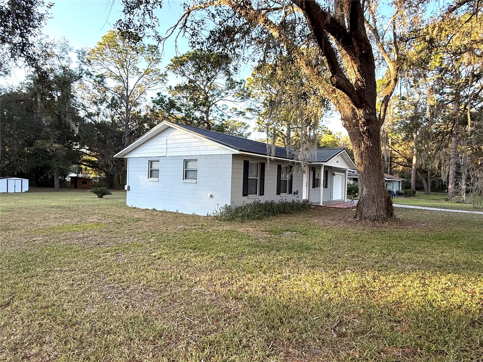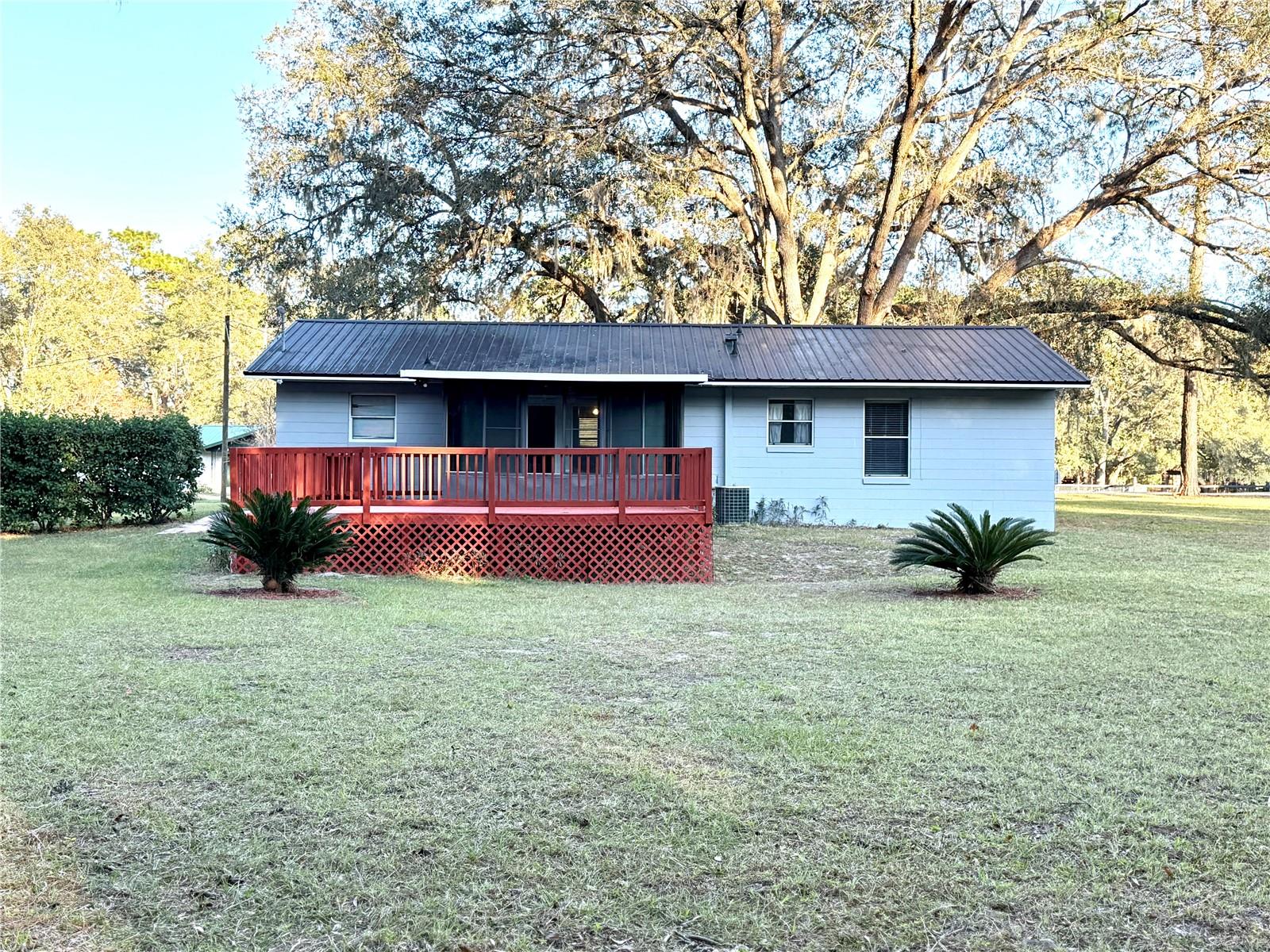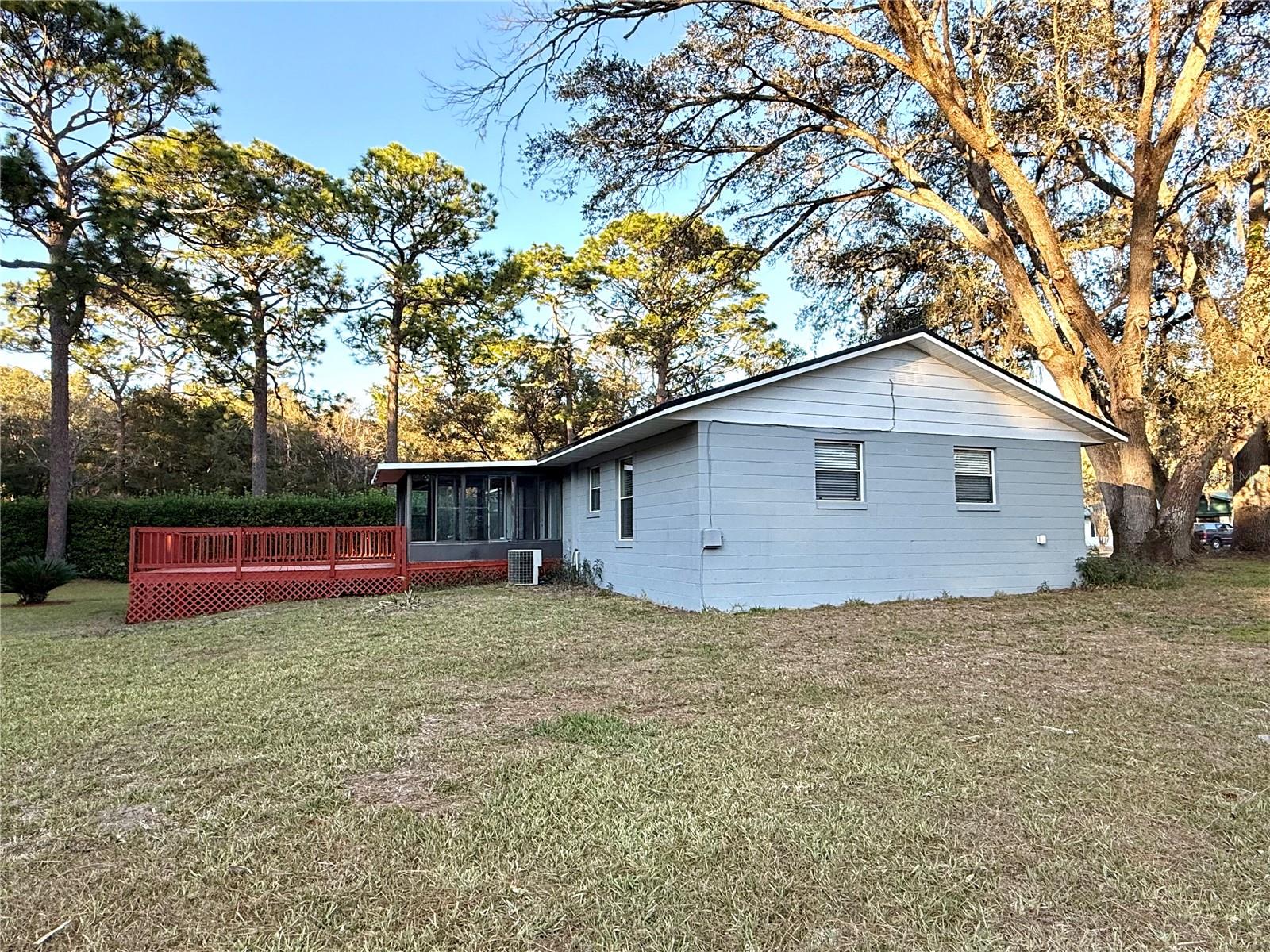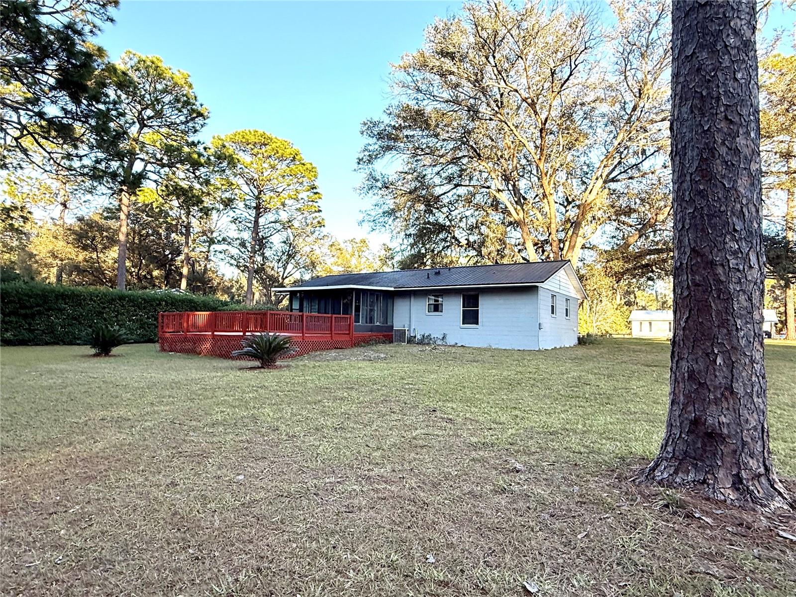 This charming 3-bedroom, 1.5-bath home sits on a spacious and gorgeous 1-acre lot and offers a perfect blend of comfort and practicality. This well-maintained home offers modern touches with luxury vinyl plank flooring and tile throughout, combining durability with style, finished garage w/ automatic garage door, newer roof and HWH, large laundry/utility room and amazing oak trees and privacy hedge. Step inside to find a very efficient use of space in the cozy living area with well sized bedrooms and spacious closets. The eat-in kitchen offers side counter space and storage and good space for meal prep. The dining area has an open view to the living room... perfect for entertaining and family time. Step through the french doors into the screened room for a serene view of the expansive back yard. Walk on outside to relax or entertian on the spacious deck. Ideal for gardening, outdoor activities, adding a pool or simply enjoying the peacful surroundings. Located in a friendly and tranquil neighborhood, this home combines rural charm with convenient access to local amenities and services. Conveniently located for quick access to Gainesville, Ocala, Crystal River, Dunnellon or Chiefland, as well as the entire Gulf Coast. Perfect for the first-time home buyer! Don't miss the chance to make this wonderful home yours!