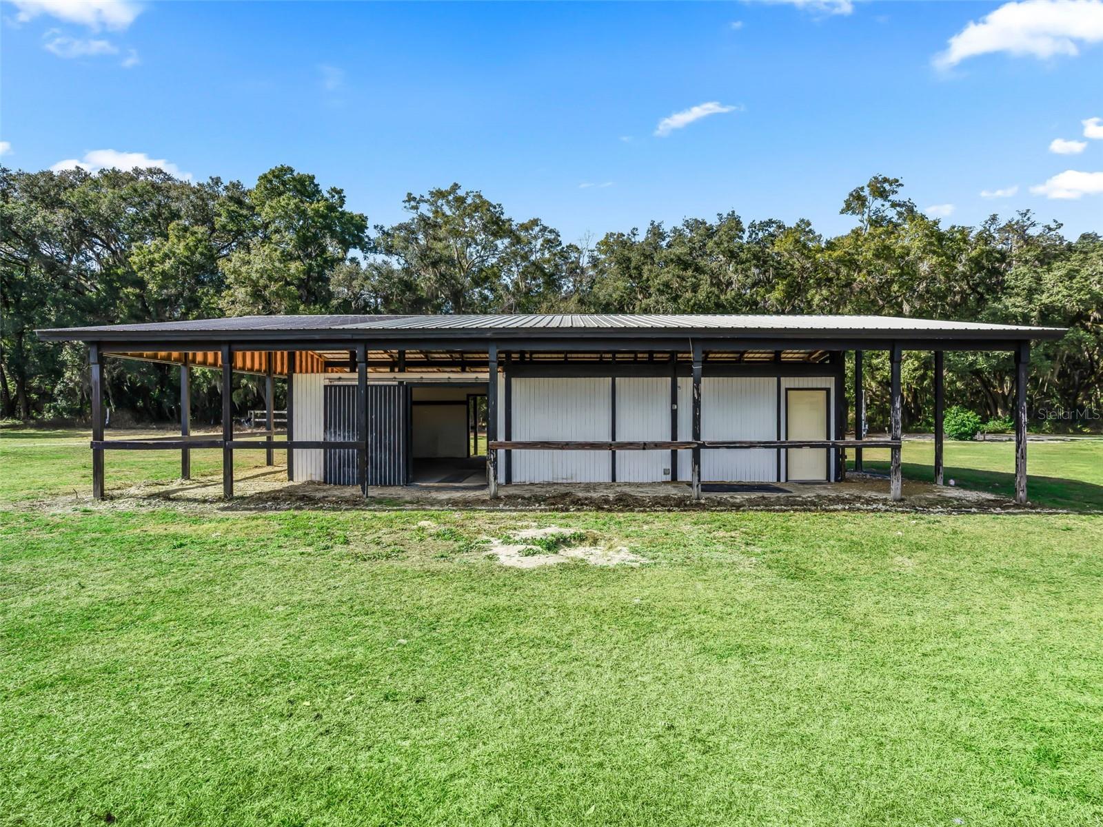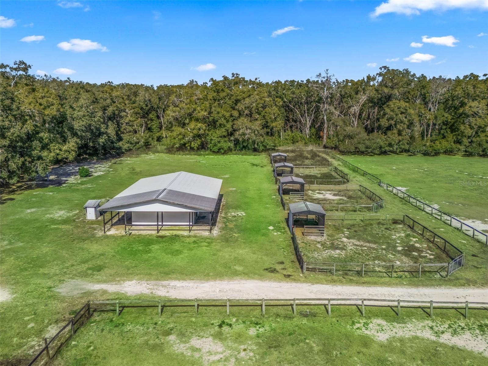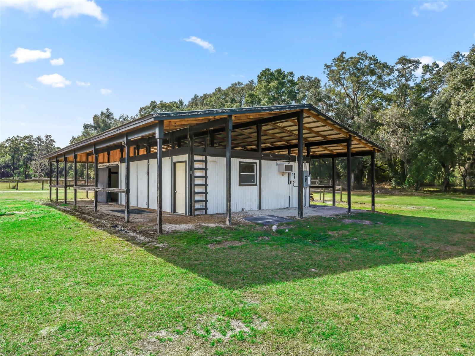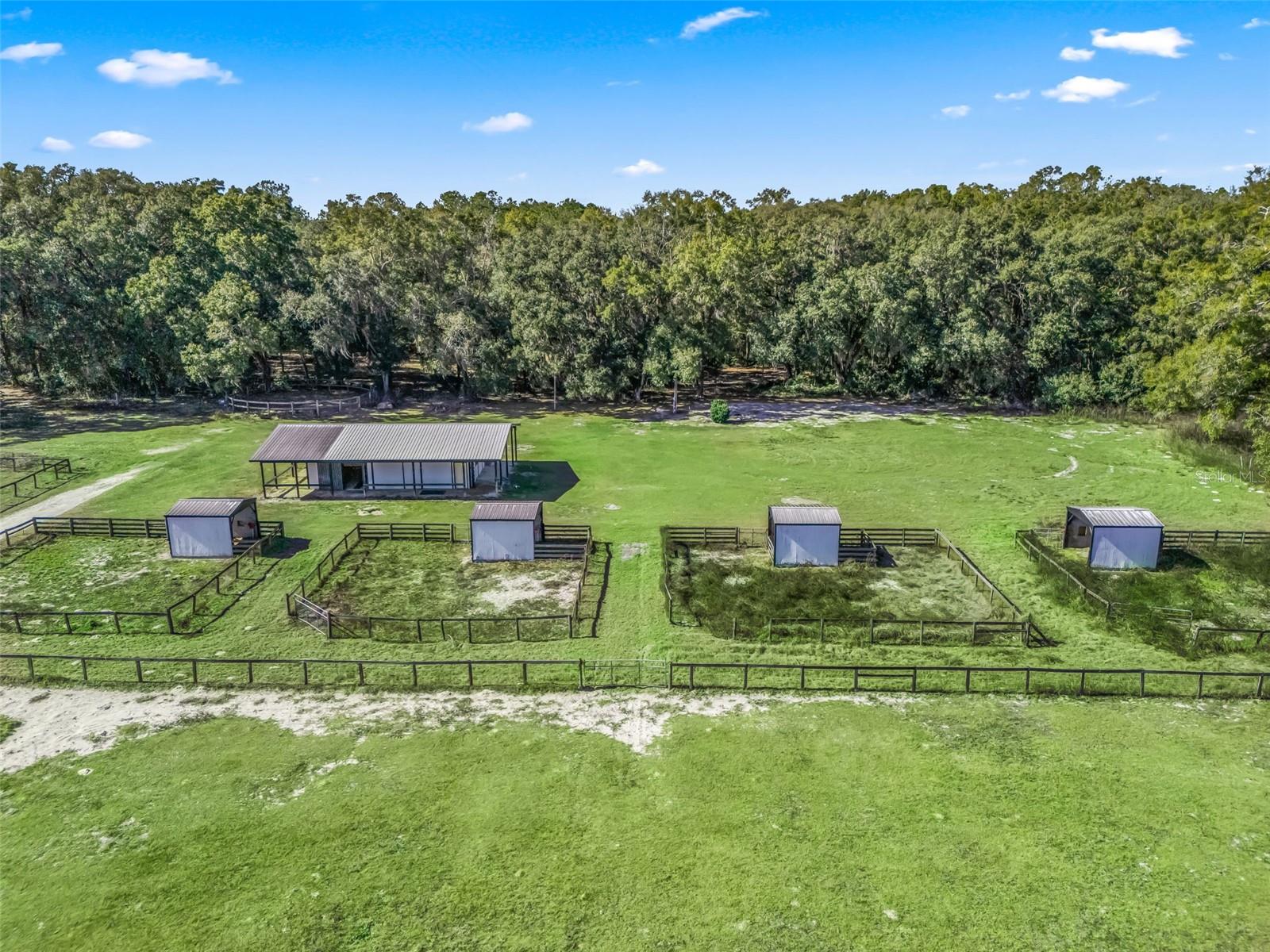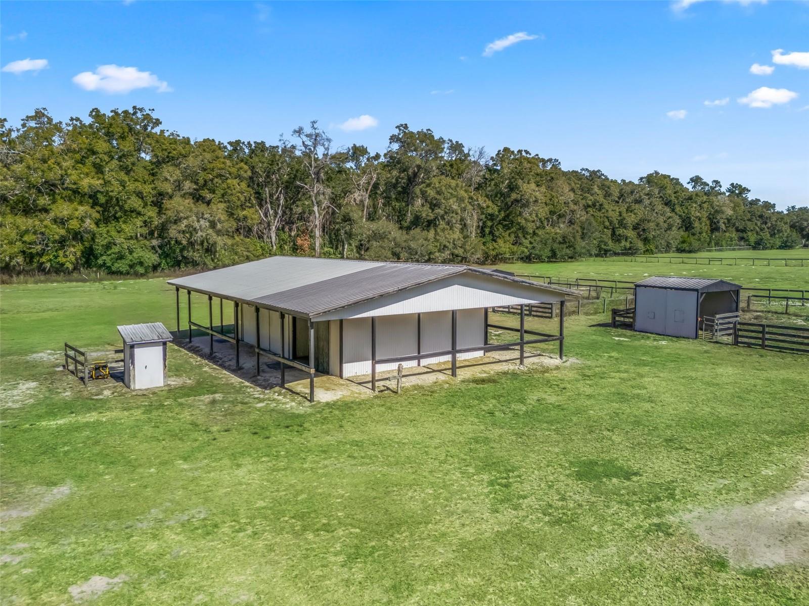 Nearly 38 acres of flat, high and dry improved equestrian property in Williston, just past Northwest Ocala - less than 15 minutes to HITS and approximately 25 minutes to the World Equestrian Center. Comprised of three parcels, the largest 20+ acre parcel is mostly cleared and features perimeter fencing, 5 sizable cross-fenced pastures, and a natural buffer of mature trees for added privacy. A gated entry leads past the pastures to the barn, thoughtfully set back from the road. The 57' x40' barn offers a spacious covered and enclosed area with room for two stalls, a tack room, and grooming stall, along with an adjacent living space complete with a full bathroom - ideal for office use, climate controlled storage, or creating a full apartment. In addition to the 5 pastures, just beyond the barn are four small paddocks, each with its own 11' x 12' run-in stall. Additional improvements include underground electric with multiple hookups, a newer well, and a round pen. The additional two parcels (9.35 & 8.363 acres) are wooded and offer opportunities to clear and expand or maintain privacy. An excellent opportunity to create your dream equestrian estate on a private, well-improved, and ideally located property in the heart of Florida horse country.