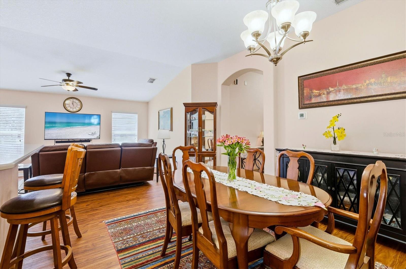 Welcome to this beautifully maintained corner-lot home offering space, style, and convenience in the heart of Florida’s Suncoast! This light and airy single-story residence features 4 bedrooms, 2 baths, and a spacious 3-car tandem garage with room for vehicles, storage, or a workshop. The thoughtfully designed split floor plan offers an open living and dining area perfect for both everyday living and entertaining. New LVP flooring flows throughout the living areas and all bedrooms, creating a warm and cohesive feel. The 2025 upgraded kitchen is the heart of the home, featuring solid stone countertops, backsplash, 42" cabinetry, stainless steel appliances, refrigerator and dishwasher (2025), large single bowl sink, garbage disposal, faucet, Culligan reverse osmosis filter. There is also a large breakfast bar peninsula with plenty of seating, The primary bedroom is located at the rear of the home, offering a peaceful retreat. The en-suite has been tastefully updated with a soaking tub and walk-in shower. Additional features include ceiling fans throughout, screened front entry, new French doors to extended lanai for enjoying Florida breezes, fenced backyard and solar panels, which are owned and paid in full, The HOA includes lawn care for easy, low-maintenance living and trash. Amenities include access to fantastic amenities including a clubhouse, fitness center, recreation room, resort-style pool, spa, and playground. Conveniently located near Tampa, St. Petersburg, Bradenton, Sarasota, shopping, dining, and some of Florida’s most beautiful beaches. Roof 2025, HVAC 2025.