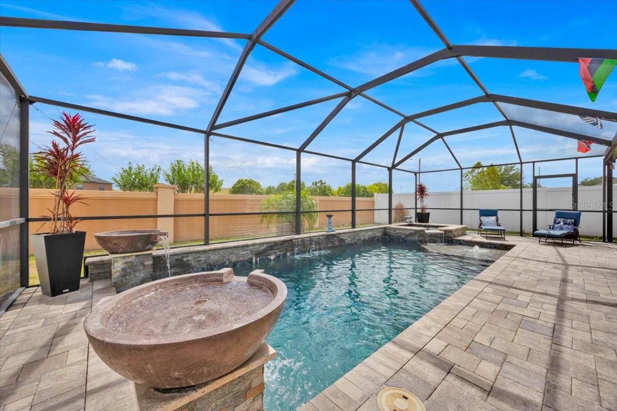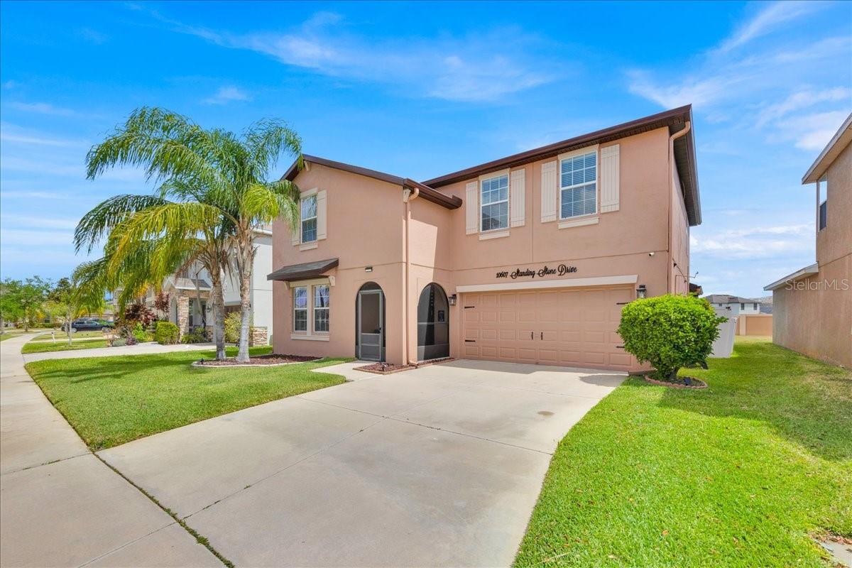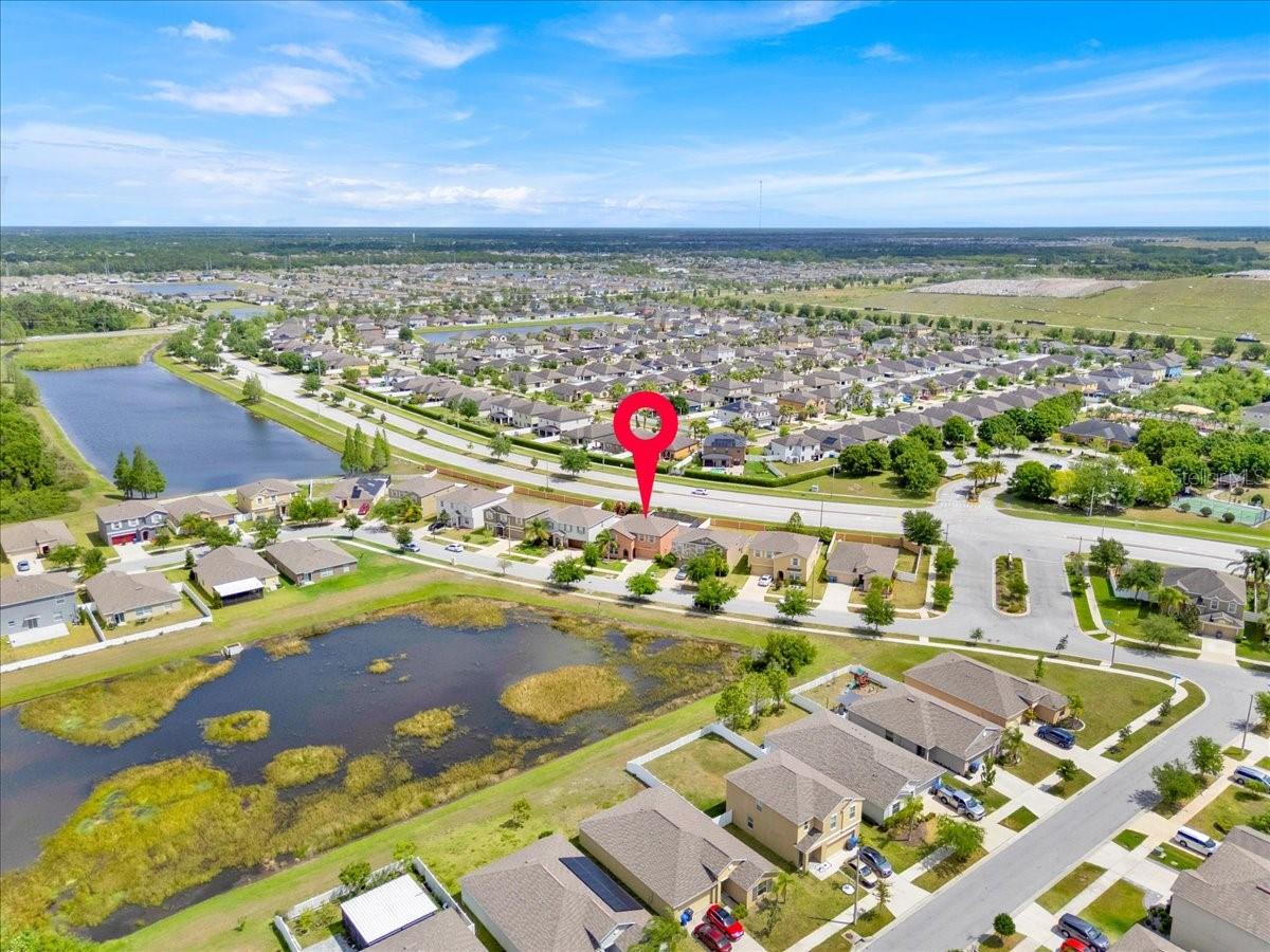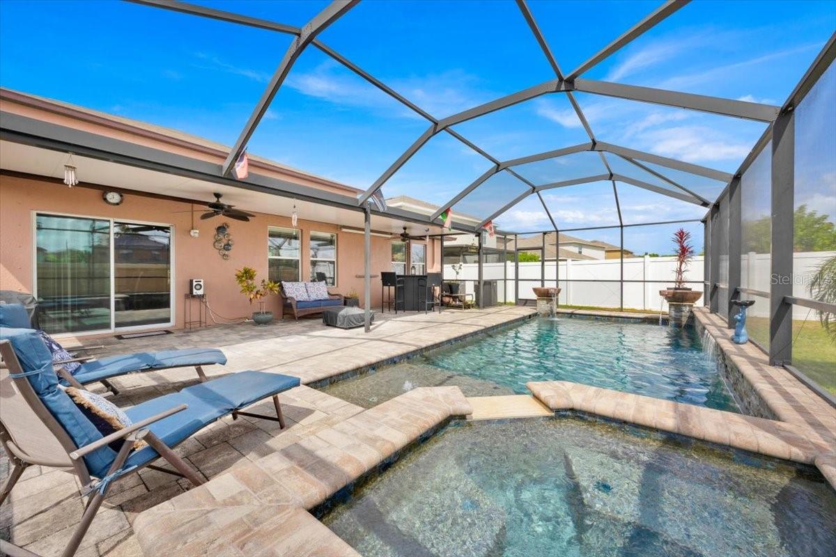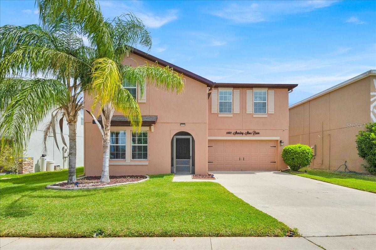 Welcome to this grand two-story pool home just steps away form the clubhouse featuring 6 bedrooms, 3 full bathrooms, a 2-car garage, and a resort-style Pebble Tec saltwater heated pool with a sun shelf—all fully screened and fenced for complete privacy. Freshly painted in 2024, this spacious home boasts a bright open floor plan with 9’ ceilings, a large kitchen with center island, GE appliances, 42” upper cabinets, and a combined dining and living room ideal for entertaining family and friends. The first floor includes the owner’s suite with a double vanity bathroom, a second bedroom, and a versatile flex room perfect for a home office or guest space. Upstairs, a generous loft leads to four additional bedrooms and two full bathrooms, providing ample room for everyone. Additional features include dual-zone A/C, a propane tank, and metal storm shutters for added peace of mind. Conveniently located near restaurants, entertainment, and major highways, this home truly has it all. Schedule your private showing today!
