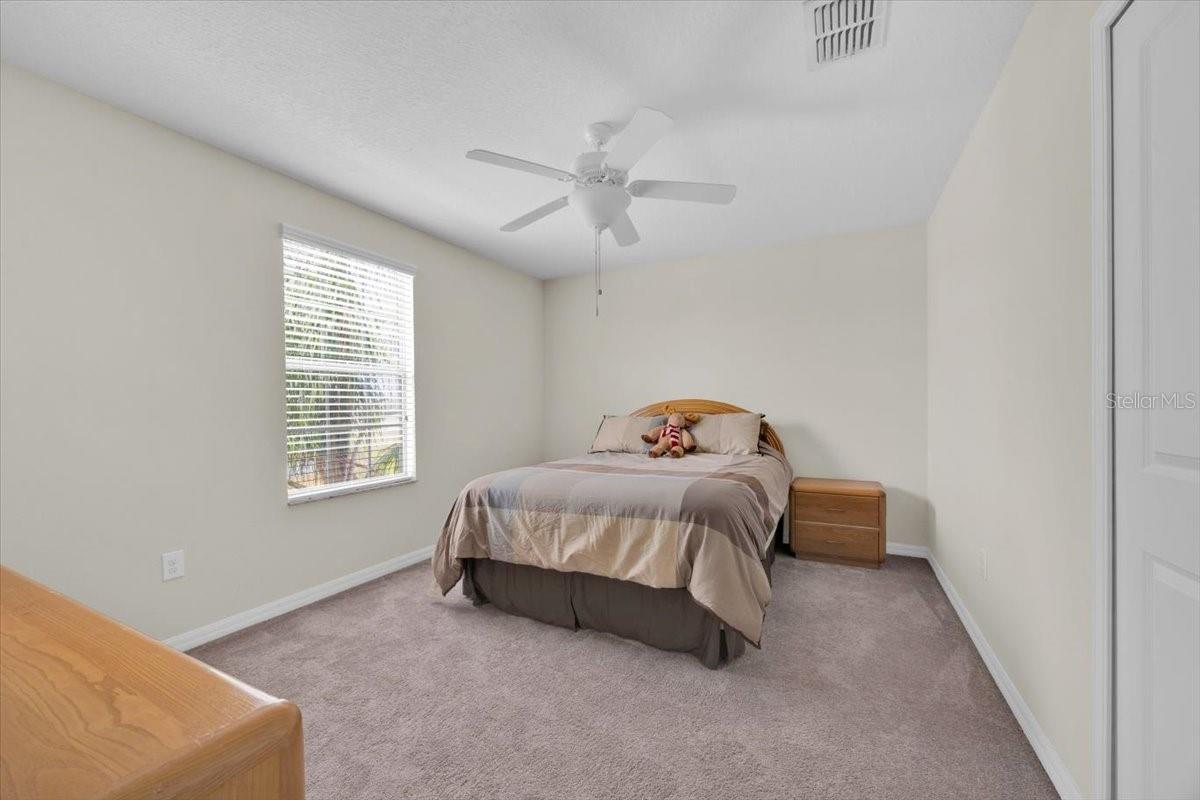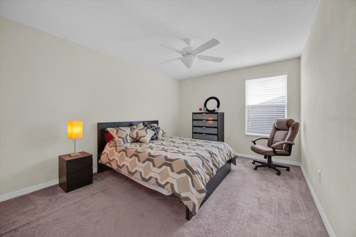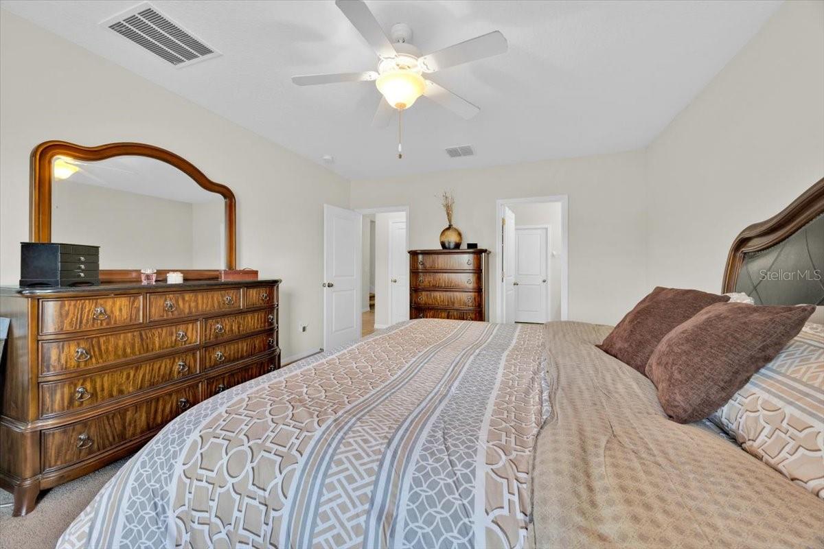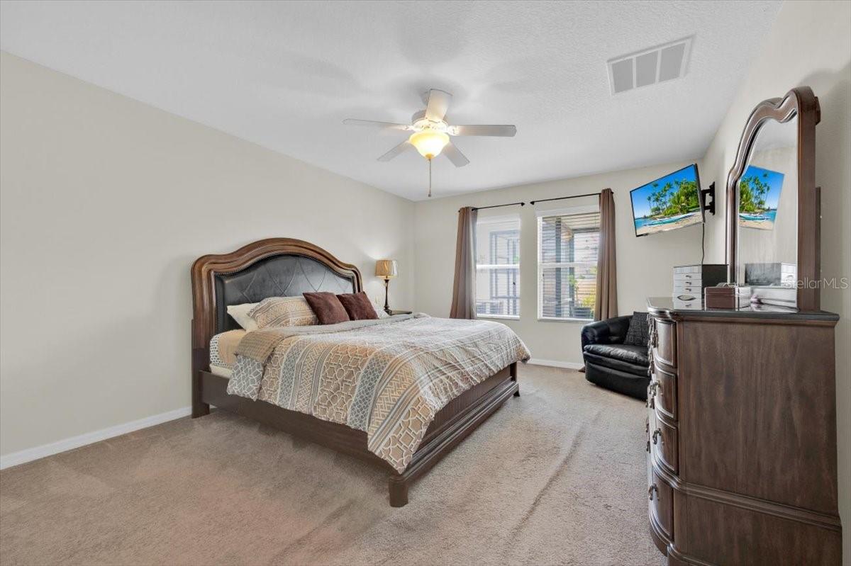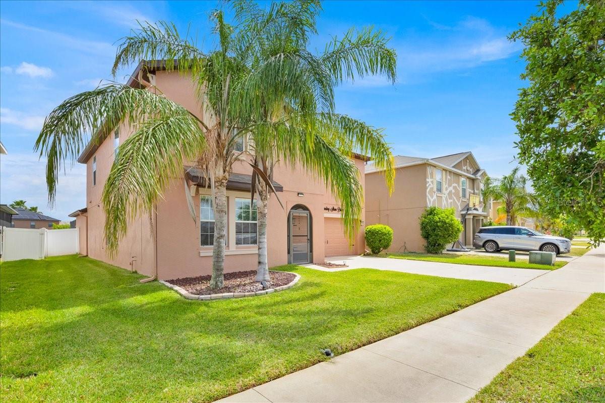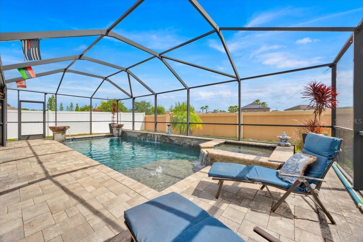 Welcome to this grand two-story pool home just steps away form the clubhouse featuring 6 bedrooms, 3 full bathrooms, a 2-car garage, and a resort-style Pebble Tec saltwater heated pool with a sun shelf—all fully screened and fenced for complete privacy. Freshly painted in 2024, this spacious home boasts a bright open floor plan with 9’ ceilings, a large kitchen with center island, GE appliances, 42” upper cabinets, and a combined dining and living room ideal for entertaining family and friends. The first floor includes the owner’s suite with a double vanity bathroom, a second bedroom, and a versatile flex room perfect for a home office or guest space. Upstairs, a generous loft leads to four additional bedrooms and two full bathrooms, providing ample room for everyone. Additional features include dual-zone A/C, a propane tank, and metal storm shutters for added peace of mind. Conveniently located near restaurants, entertainment, and major highways, this home truly has it all. Schedule your private showing today!