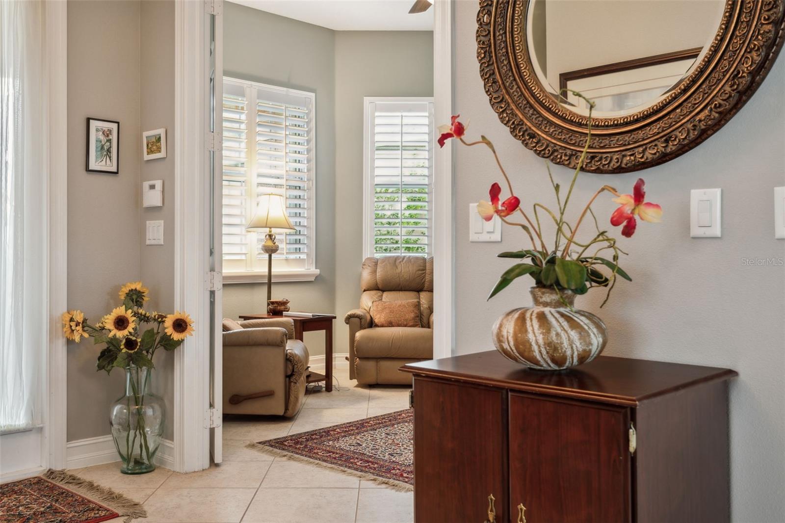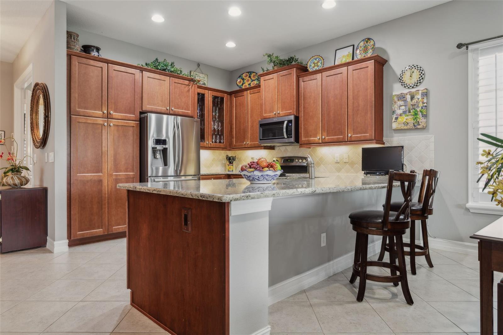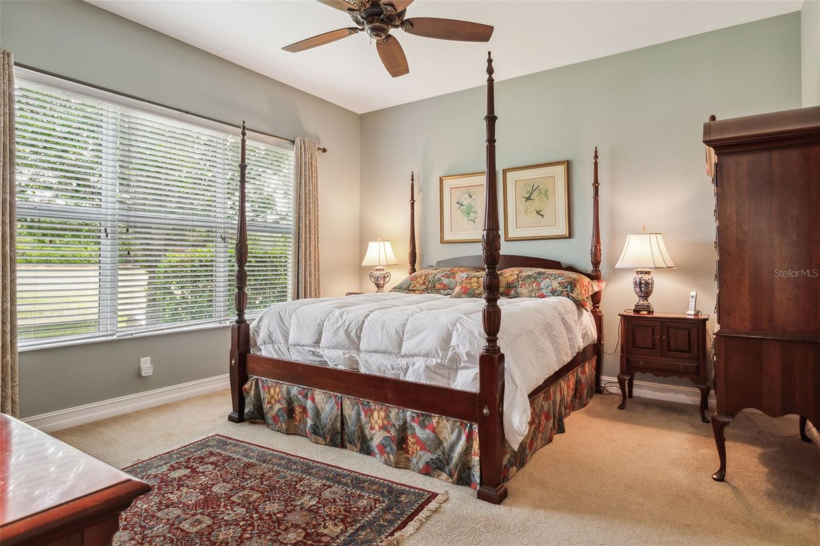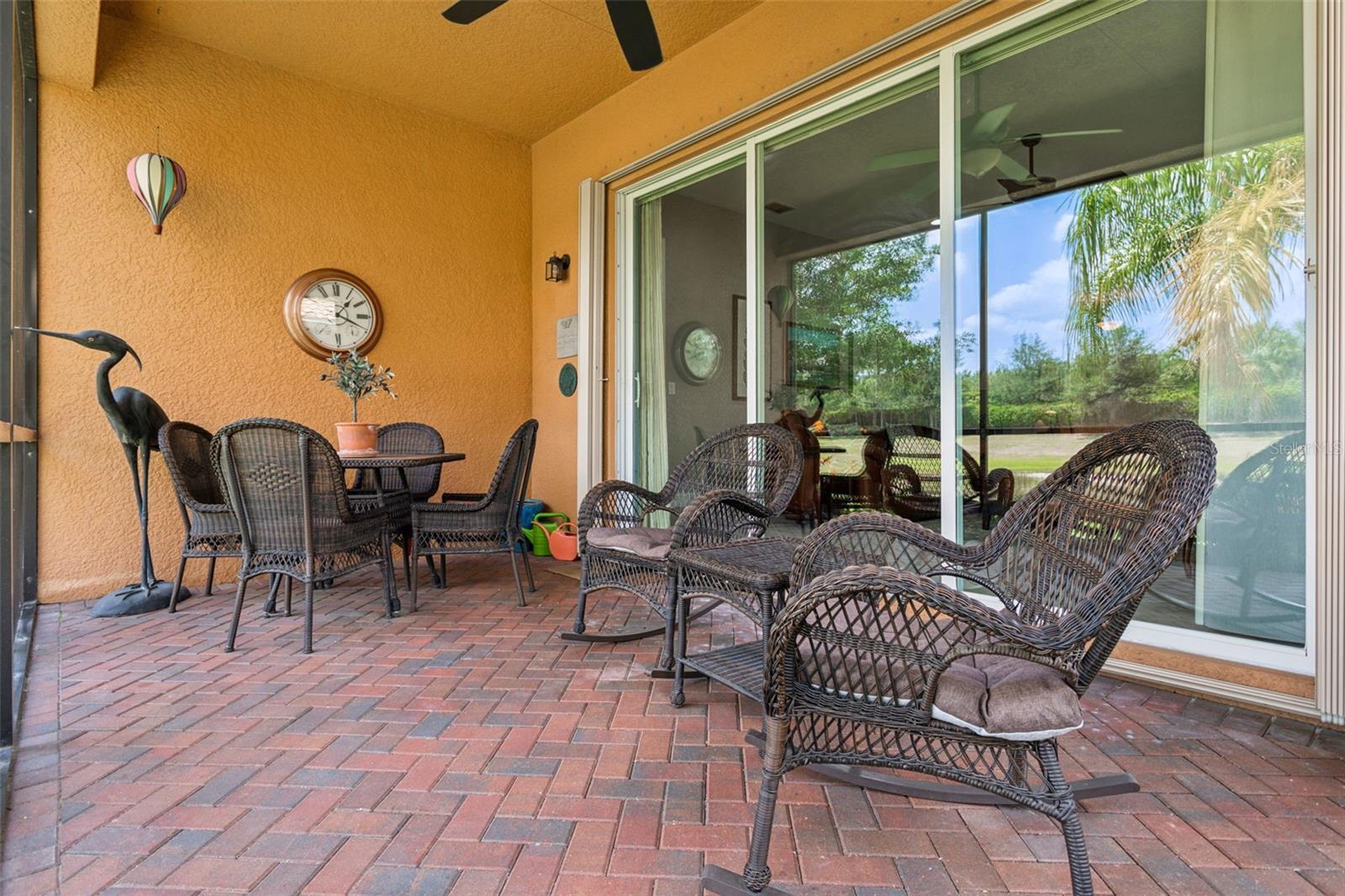 Sip on your morning coffee while enjoying the picturesque Florida sunrise from your own screened in covered lanai with "private water view" with no backyard neighbors in sight. This popular Salerno model offers 3 bedrooms, 2 baths, and 2 car garage. This home does not require lender flood insurance and is designated as a flood zone X due to the higher elevation. This pristine home is located in Valencia Lakes, The Greater Tampa Bay's premier 55+ resort style community. As you approach this lovely home, notice the 8' entry door, bay window and covered front porch for the ultimate curb appeal. Most will appreciate how the great room and kitchen open to each other with a spacious separate formal dining room for special occasions. The large triple 8' sliders off the main living area provide direct access to the screened covered rear lanai with tranquil water view...the perfect place to relax or entertain. This home showcases large floor tile laid on a diagonal throughout all main living areas and den/3rd bedroom. The luxurious gourmet kitchen features 42" maple cabinets, upper and lower lighting, cabinet crown molding and valance, glass doors with downlighting, granite countertops, large extended granite serving bar peninsula for casual dining, tumble stone marble back splash, upgraded stainless appliances including stainless French door refrigerator, Bosch dishwasher, microwave, built-in cabinet pantry and roll-out shelves. The primary suite is spacious a includes 2 walk-in closets and a serene water view. The spa-like primary bathroom showcases a separate walk-in shower with seat and decorative tile, separate vanities, granite countertops and 36" maple cabinets. The den/3rd bedroom has double 6 panel French doors and custom built-in. Bedroom #2 is located in it's own wing for maximum privacy for guests. Bath #2 features maple cabinets, granite counter with extended " banjo top" and tub/shower combo. The laundry room includes upper cabinets for storage and a utility sink with cabinet, plus a washer and dryer. This spectacular home is loaded with many custom features such as: Water Softener System, Carrier HVAC replaced in(2017), accordion storm shutters, custom plantation shutters, rain gutters, designer fans and light fixtures and more. Don't forget to ask about the available furniture! Take advantage of all that Valencia Lakes has to offer. Fabulous social hall, bistro, pools, card rooms, state of the art fitness center, art/crafts center, clubs, educational seminars, tennis courts, bocce ball, pickle ball and more. Let the fun begin! This is rated as one of the best over 55+ communities in the country and offers a ton of "green space" throughout the entire community, and provides excellent activities and entertainment for the residents. This friendly community provides walking, biking, swimming, and golf cart access to restaurants and shopping. The monthly HOA fee includes membership for the clubhouse, security system monitoring, cable/internet and lawn maintenance/irrigation without extra charges. Start living the dream and schedule your private showing today!