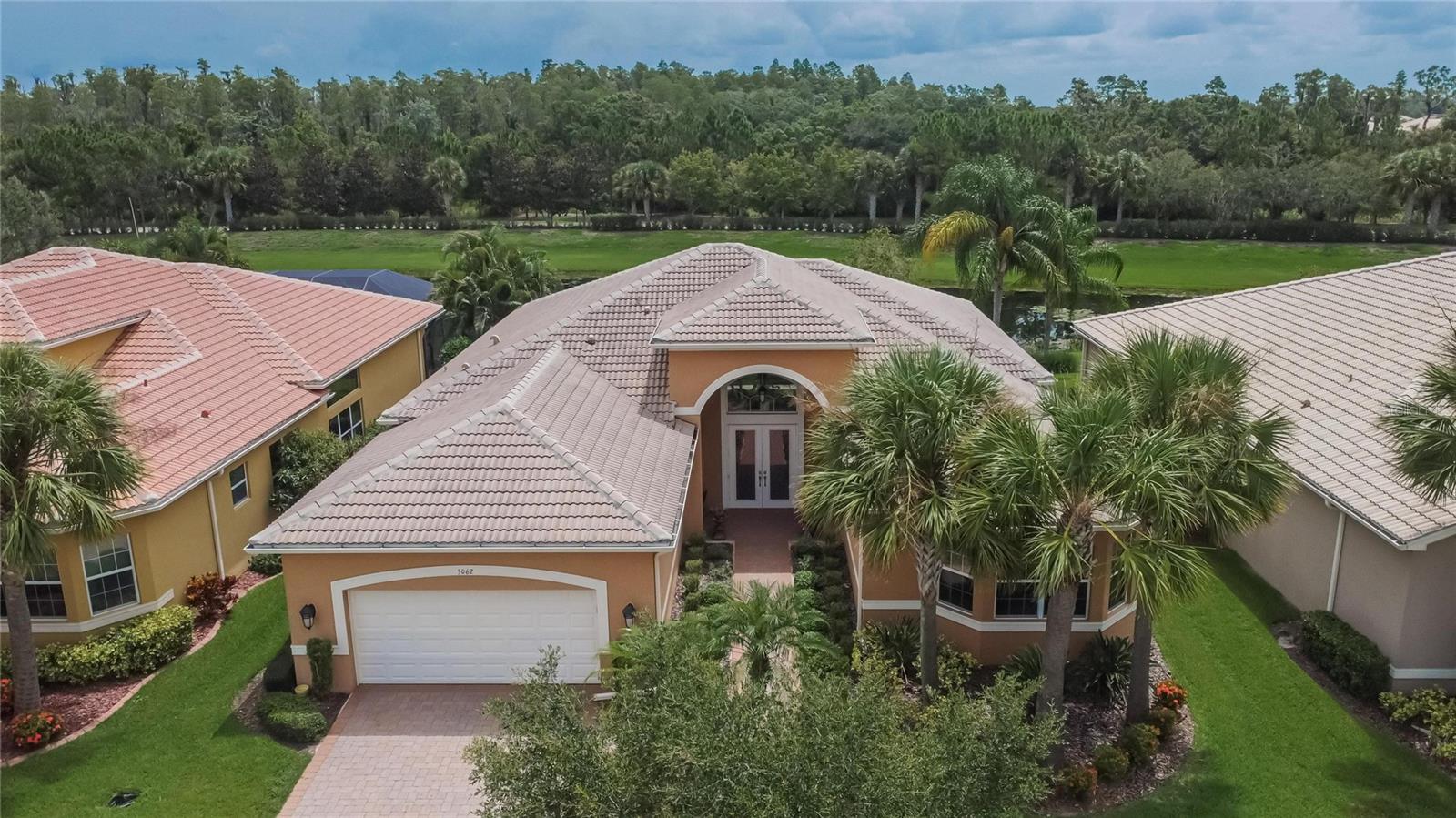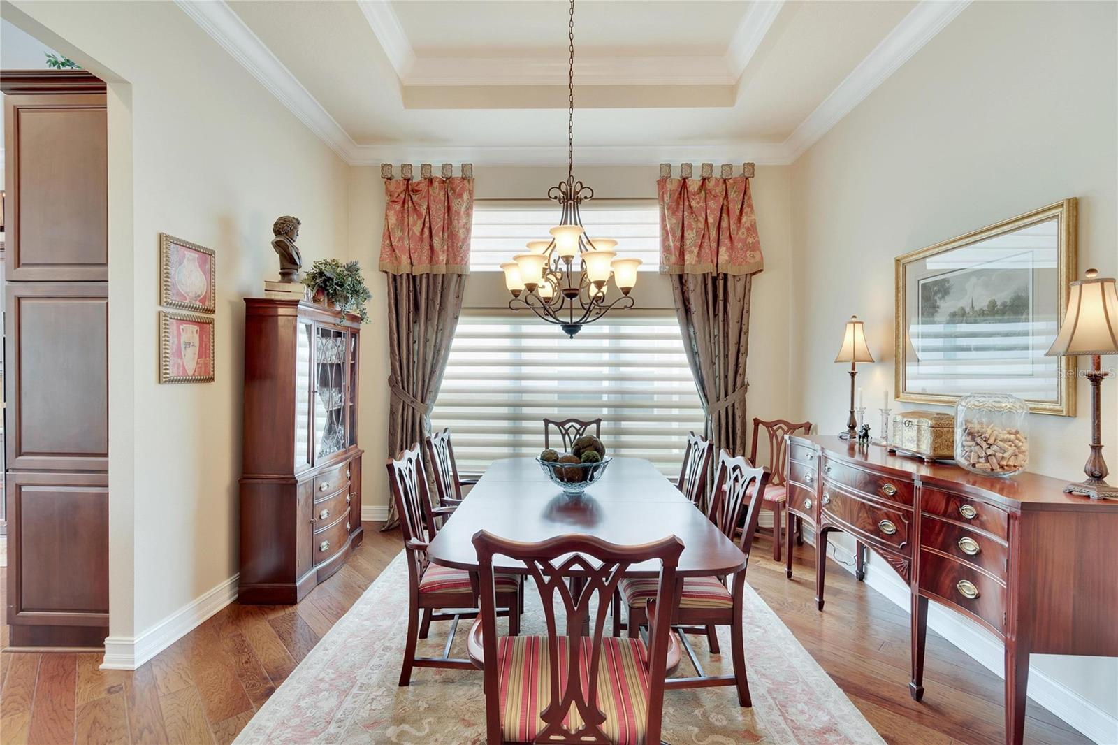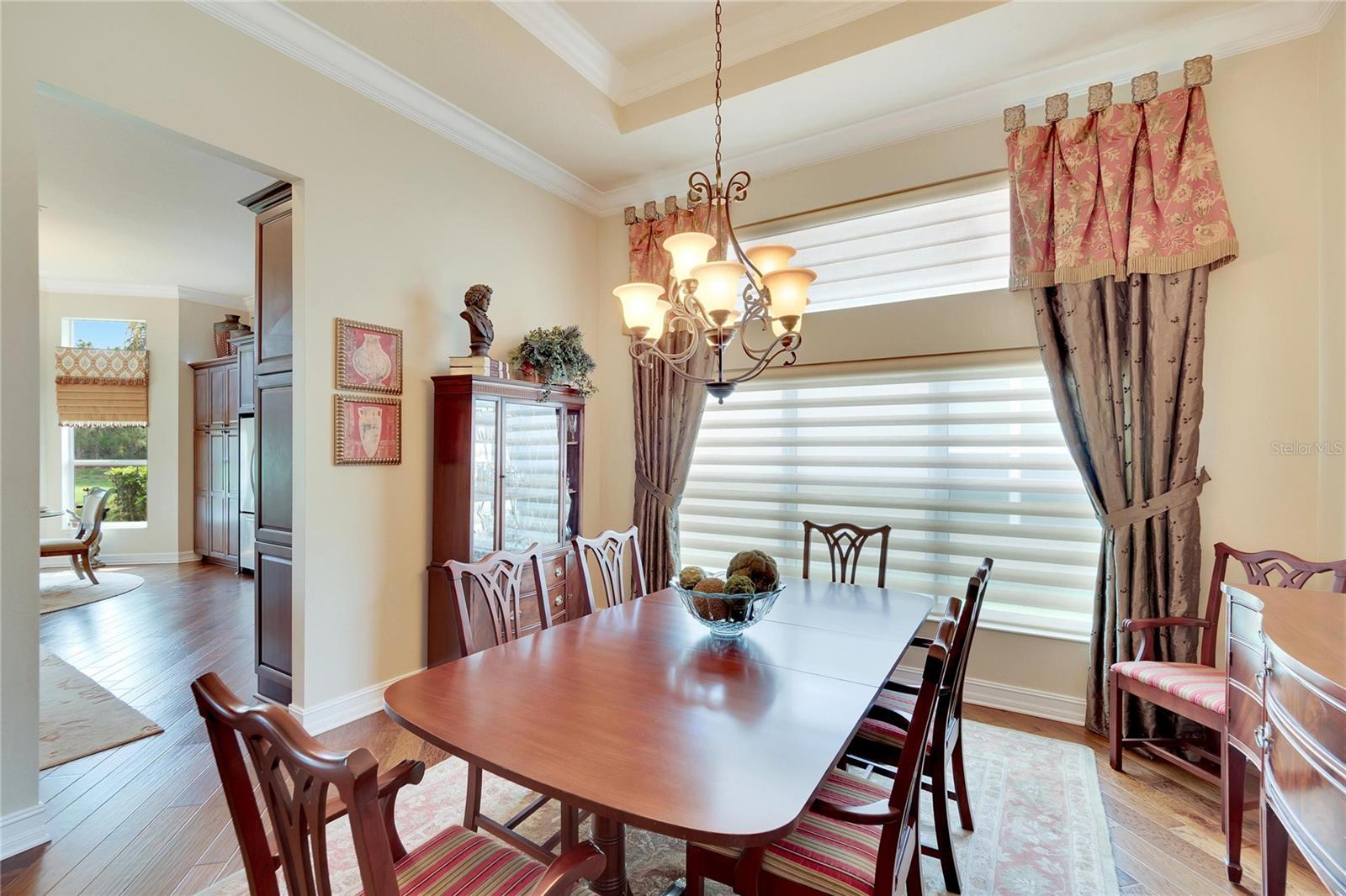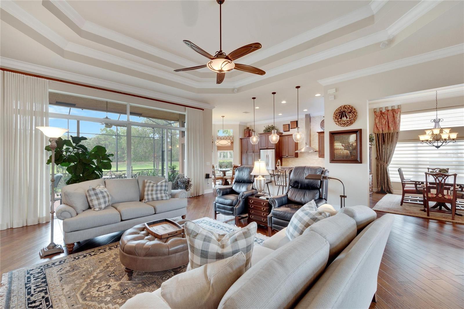 Welcome to luxury living at its finest in Valencia Lakes, Florida’s premier 55+ community. Step into the elegance of the Tivoli Model, where double wrought iron glass doors open into a grand great room offering stunning views of tranquil waters and the extended outdoor lanai. This custom-designed home boasts a wealth of features designed for comfort and style. The expansive great room is highlighted by a tiered ceiling adorned with crown molding, complemented by hand-scraped hickory hardwood floors that flow seamlessly through the great room, kitchen, dining area, powder bath, and laundry room. An entertainment center complete with a wet bar and wine cooler sets the stage for relaxed gatherings and evenings of entertainment. In the heart of the home, the gourmet kitchen is a chef’s delight with custom-designed maple cabinets, abundant pull-outs, and upgraded stainless steel appliances including a oven/microwave combo. The stainless steel range hood is a focal point, accented by subway tile extending to the ceiling. A generously sized bar offers additional workspace and casual dining options. Retreat to the master suite featuring a majestic 12-ft trey ceiling with crown molding, dual master closets with custom cabinetry, and a luxurious spa-like master bath. This sanctuary includes beveled framed mirrors, plantation shutters, dual sinks, a soaking tub, a spacious shower, and a linen closet for added convenience and storage. The second bedroom functions as another master suite, complete with a walk-in closet, plantation shutters, and an upgraded bath boasting custom cabinets and stone countertops. A well-appointed den with wood flooring provides flexible space for a home office or additional living area. Additional upgrades throughout the home include comfort height commodes, large baseboards, designer ceiling fans, upgraded lighting fixtures, custom window coverings, and rear speakers in the great room. A water softener enhances daily living comforts. For added convenience, the large laundry room offers ample cabinet and counter space along with a washer and dryer. This meticulously maintained property is move-in ready, offering not just a home but a lifestyle tailored for relaxation and enjoyment. Don’t miss your chance to own this exquisite home in Valencia Lakes, where luxury meets convenience in a vibrant 55+ community setting. Schedule your private tour today and discover the unparalleled charm and sophistication of this remarkable property.