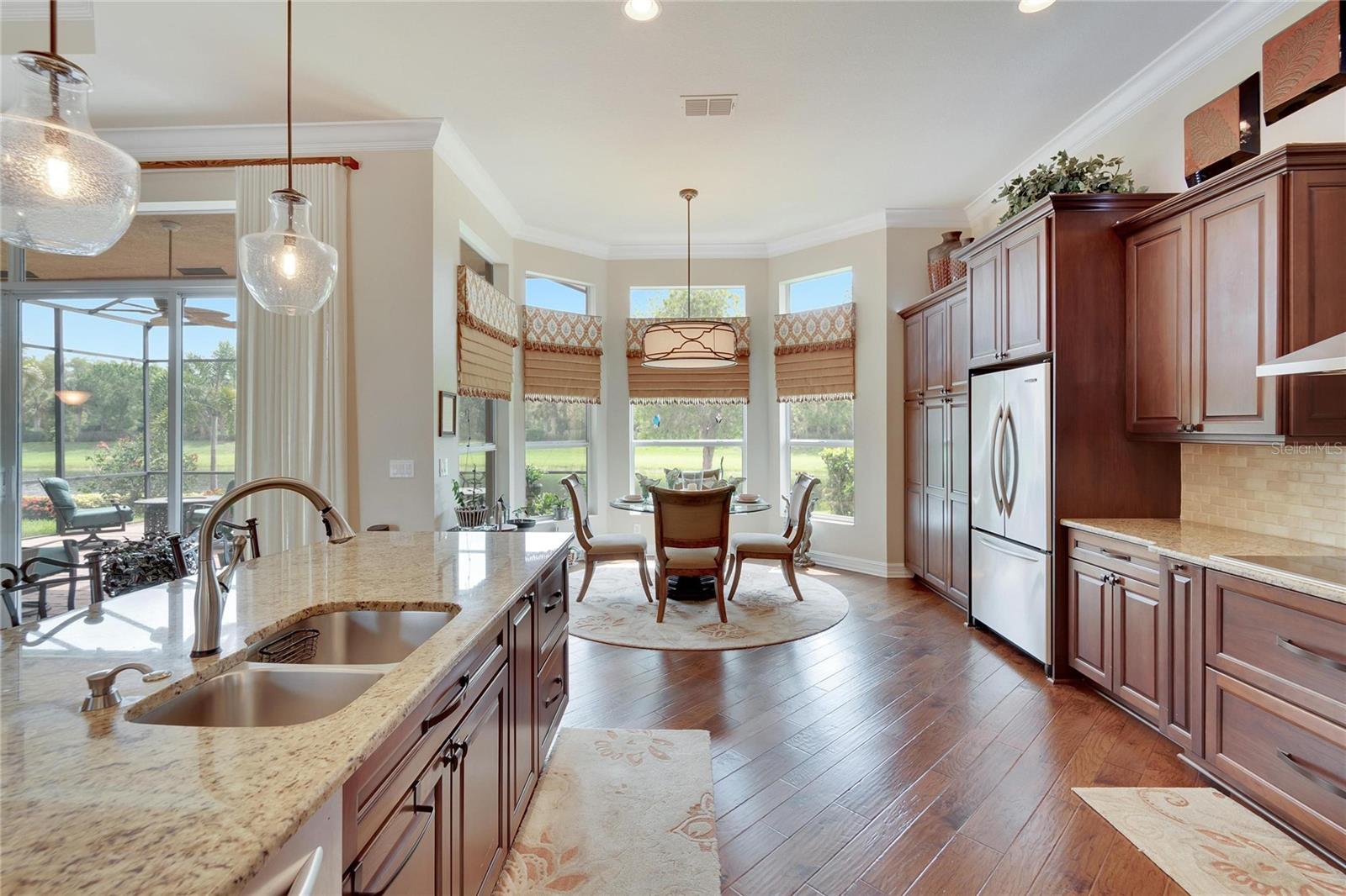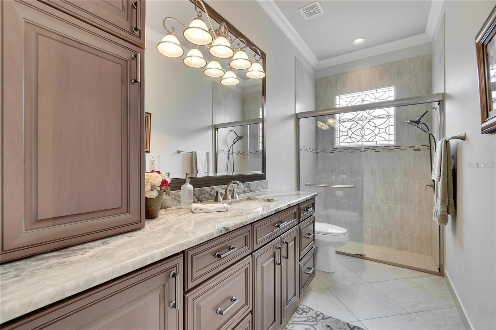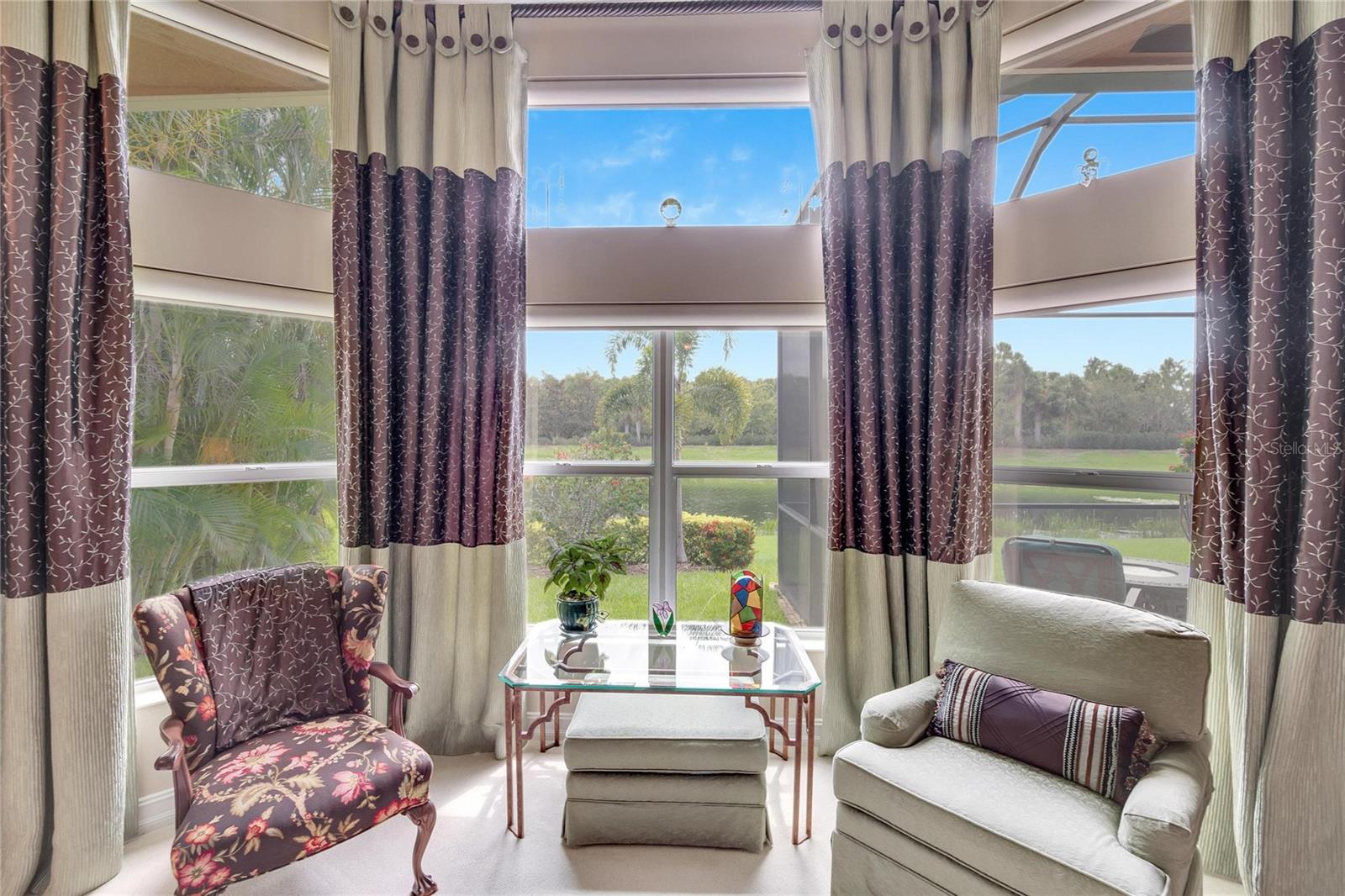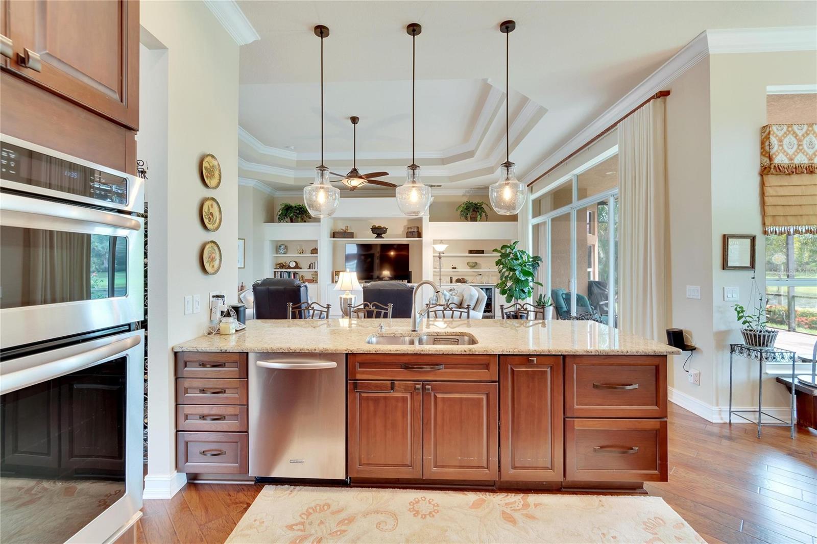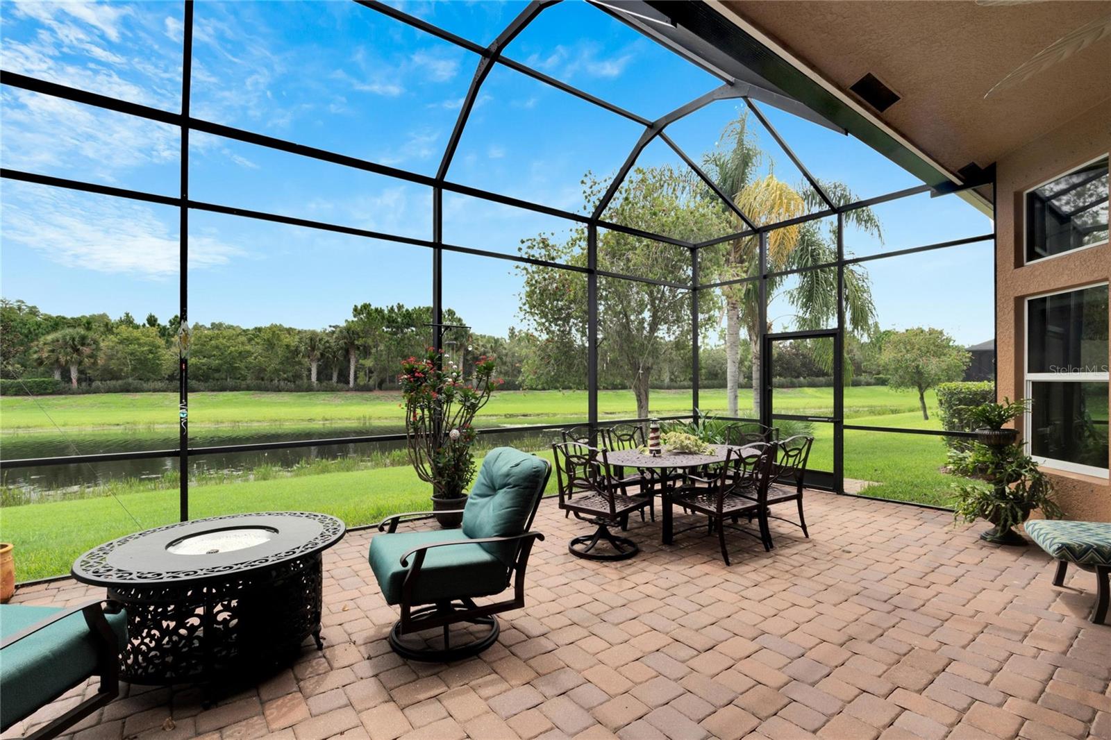 Welcome to luxury living at its finest in Valencia Lakes, Florida’s premier 55+ community. Step into the elegance of the Tivoli Model, where double wrought iron glass doors open into a grand great room offering stunning views of tranquil waters and the extended outdoor lanai. This custom-designed home boasts a wealth of features designed for comfort and style. The expansive great room is highlighted by a tiered ceiling adorned with crown molding, complemented by hand-scraped hickory hardwood floors that flow seamlessly through the great room, kitchen, dining area, powder bath, and laundry room. An entertainment center complete with a wet bar and wine cooler sets the stage for relaxed gatherings and evenings of entertainment. In the heart of the home, the gourmet kitchen is a chef’s delight with custom-designed maple cabinets, abundant pull-outs, and upgraded stainless steel appliances including a oven/microwave combo. The stainless steel range hood is a focal point, accented by subway tile extending to the ceiling. A generously sized bar offers additional workspace and casual dining options. Retreat to the master suite featuring a majestic 12-ft trey ceiling with crown molding, dual master closets with custom cabinetry, and a luxurious spa-like master bath. This sanctuary includes beveled framed mirrors, plantation shutters, dual sinks, a soaking tub, a spacious shower, and a linen closet for added convenience and storage. The second bedroom functions as another master suite, complete with a walk-in closet, plantation shutters, and an upgraded bath boasting custom cabinets and stone countertops. A well-appointed den with wood flooring provides flexible space for a home office or additional living area. Additional upgrades throughout the home include comfort height commodes, large baseboards, designer ceiling fans, upgraded lighting fixtures, custom window coverings, and rear speakers in the great room. A water softener enhances daily living comforts. For added convenience, the large laundry room offers ample cabinet and counter space along with a washer and dryer. This meticulously maintained property is move-in ready, offering not just a home but a lifestyle tailored for relaxation and enjoyment. Don’t miss your chance to own this exquisite home in Valencia Lakes, where luxury meets convenience in a vibrant 55+ community setting. Schedule your private tour today and discover the unparalleled charm and sophistication of this remarkable property.
