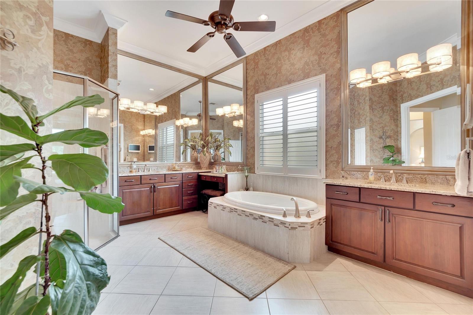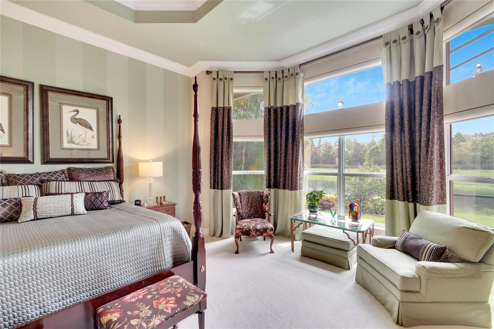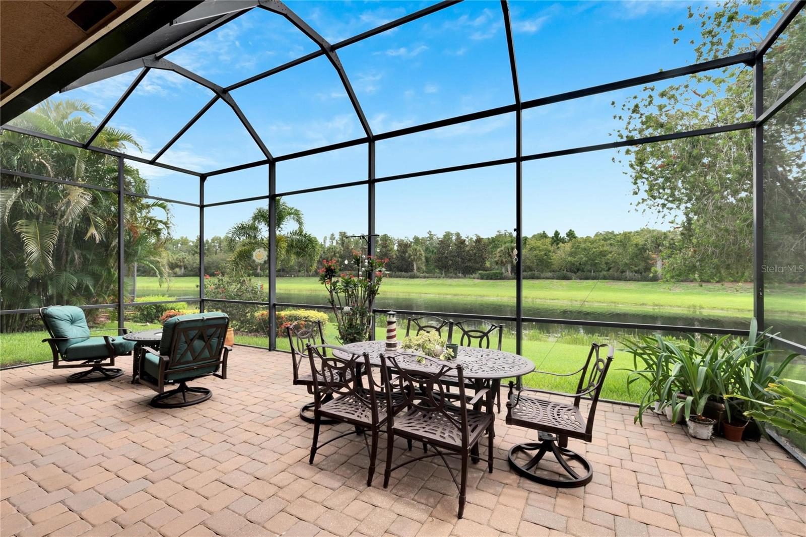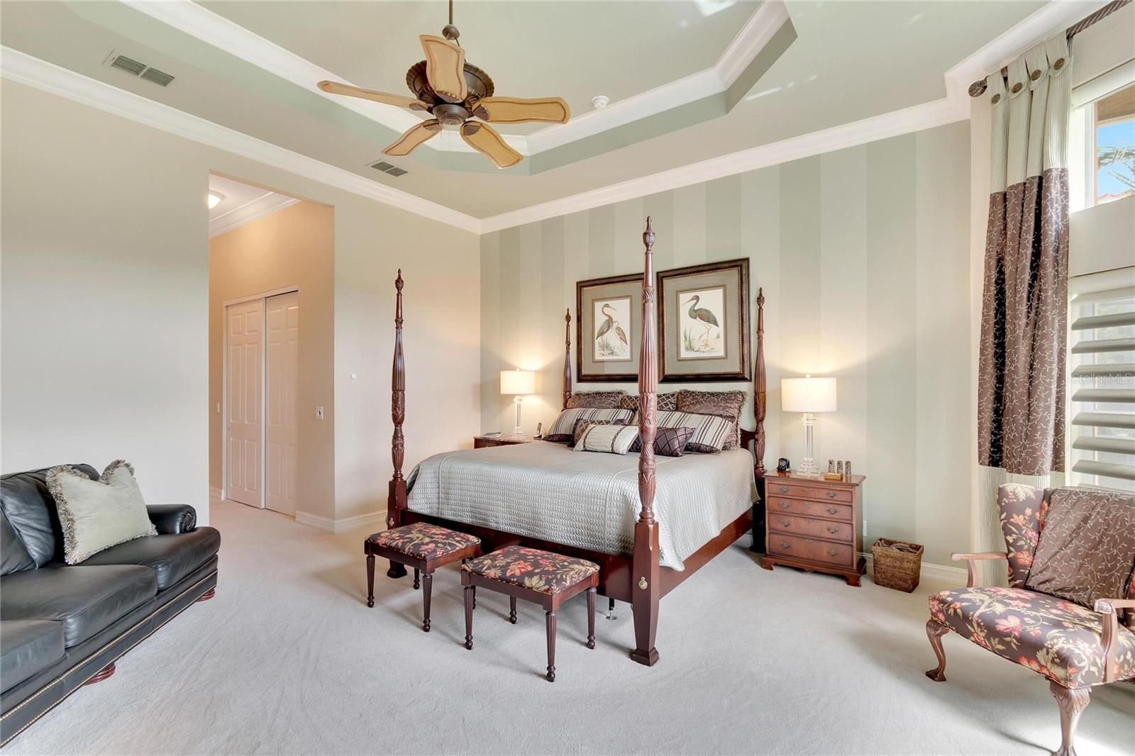 Welcome to luxury living at its finest in Valencia Lakes, Florida’s premier 55+ community. Step into the elegance of the Tivoli Model, where double wrought iron glass doors open into a grand great room offering stunning views of tranquil waters and the extended outdoor lanai. This custom-designed home boasts a wealth of features designed for comfort and style. The expansive great room is highlighted by a tiered ceiling adorned with crown molding, complemented by hand-scraped hickory hardwood floors that flow seamlessly through the great room, kitchen, dining area, powder bath, and laundry room. An entertainment center complete with a wet bar and wine cooler sets the stage for relaxed gatherings and evenings of entertainment. In the heart of the home, the gourmet kitchen is a chef’s delight with custom-designed maple cabinets, abundant pull-outs, and upgraded stainless steel appliances including a oven/microwave combo. The stainless steel range hood is a focal point, accented by subway tile extending to the ceiling. A generously sized bar offers additional workspace and casual dining options. Retreat to the master suite featuring a majestic 12-ft trey ceiling with crown molding, dual master closets with custom cabinetry, and a luxurious spa-like master bath. This sanctuary includes beveled framed mirrors, plantation shutters, dual sinks, a soaking tub, a spacious shower, and a linen closet for added convenience and storage. The second bedroom functions as another master suite, complete with a walk-in closet, plantation shutters, and an upgraded bath boasting custom cabinets and stone countertops. A well-appointed den with wood flooring provides flexible space for a home office or additional living area. Additional upgrades throughout the home include comfort height commodes, large baseboards, designer ceiling fans, upgraded lighting fixtures, custom window coverings, and rear speakers in the great room. A water softener enhances daily living comforts. For added convenience, the large laundry room offers ample cabinet and counter space along with a washer and dryer. This meticulously maintained property is move-in ready, offering not just a home but a lifestyle tailored for relaxation and enjoyment. Don’t miss your chance to own this exquisite home in Valencia Lakes, where luxury meets convenience in a vibrant 55+ community setting. Schedule your private tour today and discover the unparalleled charm and sophistication of this remarkable property.