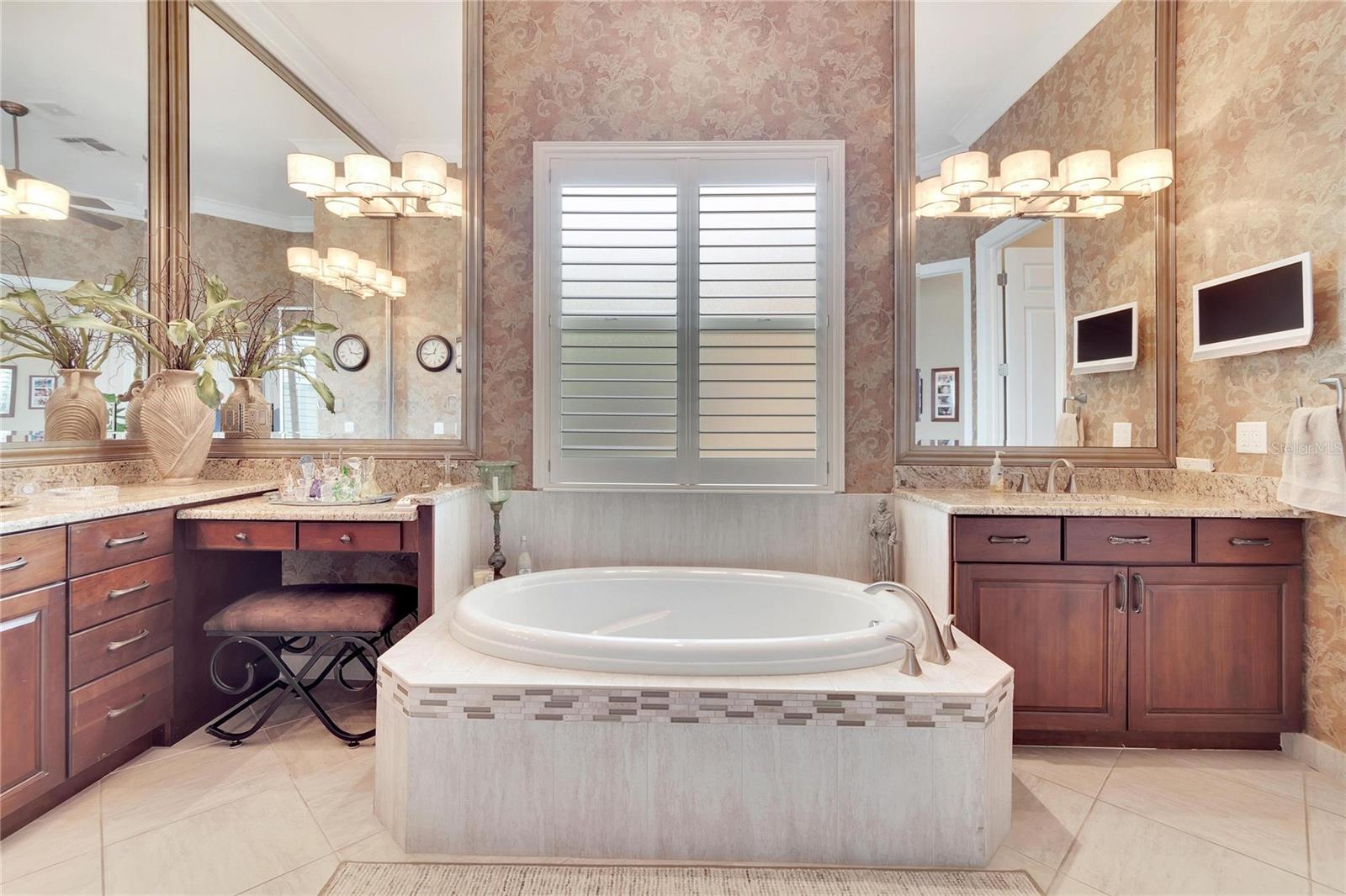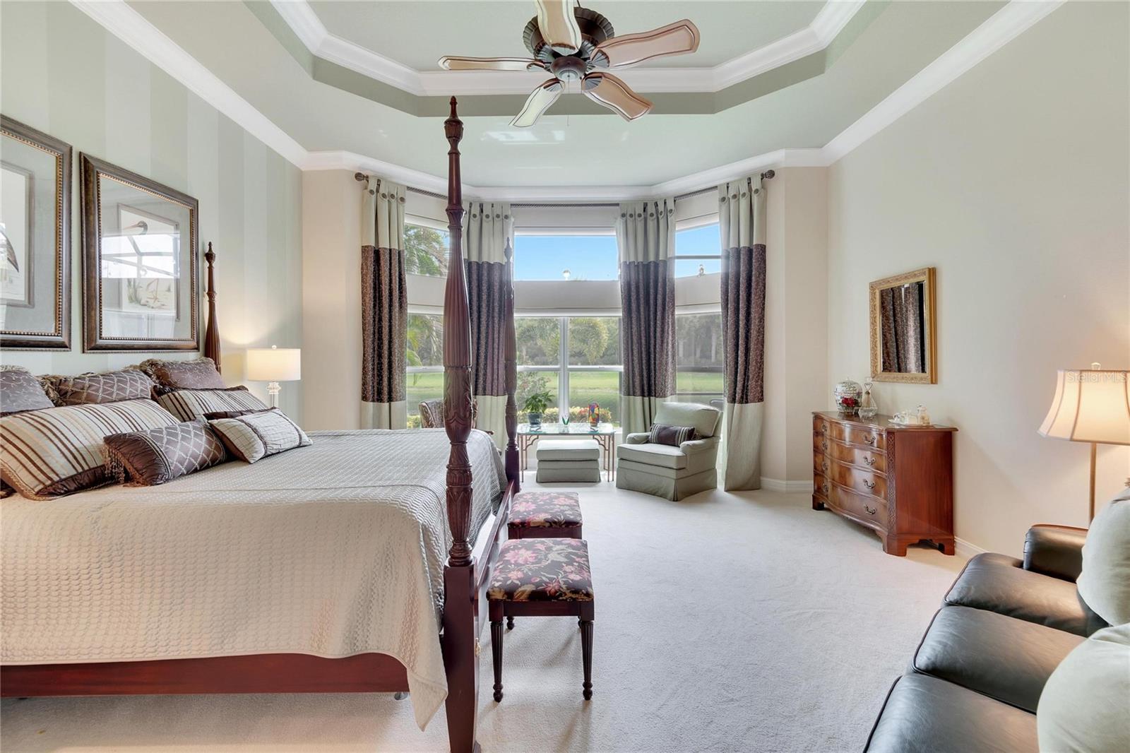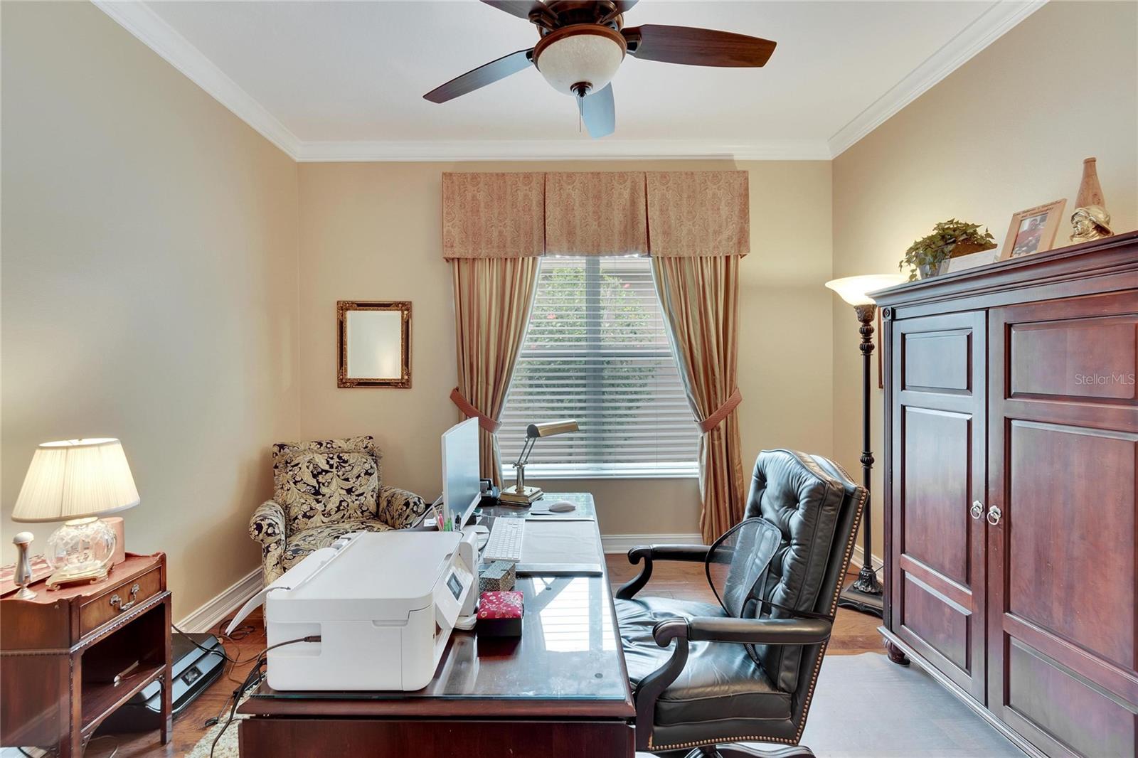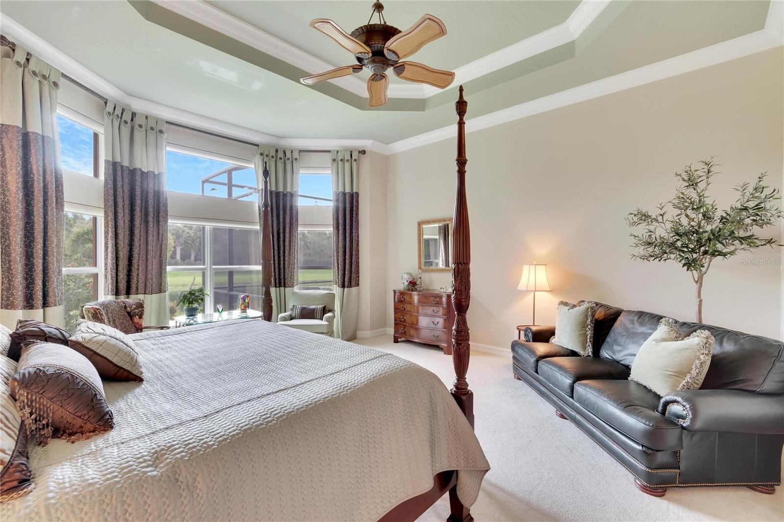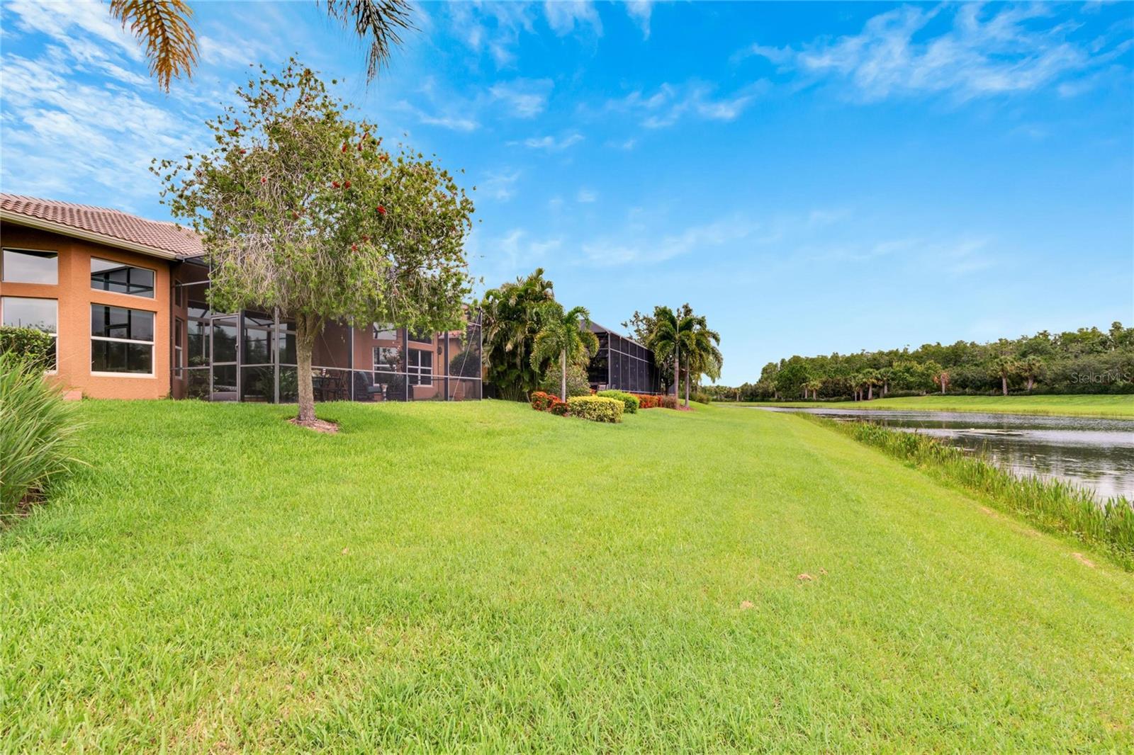 Welcome to luxury living at its finest in Valencia Lakes, Florida’s premier 55+ community. Step into the elegance of the Tivoli Model, where double wrought iron glass doors open into a grand great room offering stunning views of tranquil waters and the extended outdoor lanai. This custom-designed home boasts a wealth of features designed for comfort and style. The expansive great room is highlighted by a tiered ceiling adorned with crown molding, complemented by hand-scraped hickory hardwood floors that flow seamlessly through the great room, kitchen, dining area, powder bath, and laundry room. An entertainment center complete with a wet bar and wine cooler sets the stage for relaxed gatherings and evenings of entertainment. In the heart of the home, the gourmet kitchen is a chef’s delight with custom-designed maple cabinets, abundant pull-outs, and upgraded stainless steel appliances including a oven/microwave combo. The stainless steel range hood is a focal point, accented by subway tile extending to the ceiling. A generously sized bar offers additional workspace and casual dining options. Retreat to the master suite featuring a majestic 12-ft trey ceiling with crown molding, dual master closets with custom cabinetry, and a luxurious spa-like master bath. This sanctuary includes beveled framed mirrors, plantation shutters, dual sinks, a soaking tub, a spacious shower, and a linen closet for added convenience and storage. The second bedroom functions as another master suite, complete with a walk-in closet, plantation shutters, and an upgraded bath boasting custom cabinets and stone countertops. A well-appointed den with wood flooring provides flexible space for a home office or additional living area. Additional upgrades throughout the home include comfort height commodes, large baseboards, designer ceiling fans, upgraded lighting fixtures, custom window coverings, and rear speakers in the great room. A water softener enhances daily living comforts. For added convenience, the large laundry room offers ample cabinet and counter space along with a washer and dryer. This meticulously maintained property is move-in ready, offering not just a home but a lifestyle tailored for relaxation and enjoyment. Don’t miss your chance to own this exquisite home in Valencia Lakes, where luxury meets convenience in a vibrant 55+ community setting. Schedule your private tour today and discover the unparalleled charm and sophistication of this remarkable property.