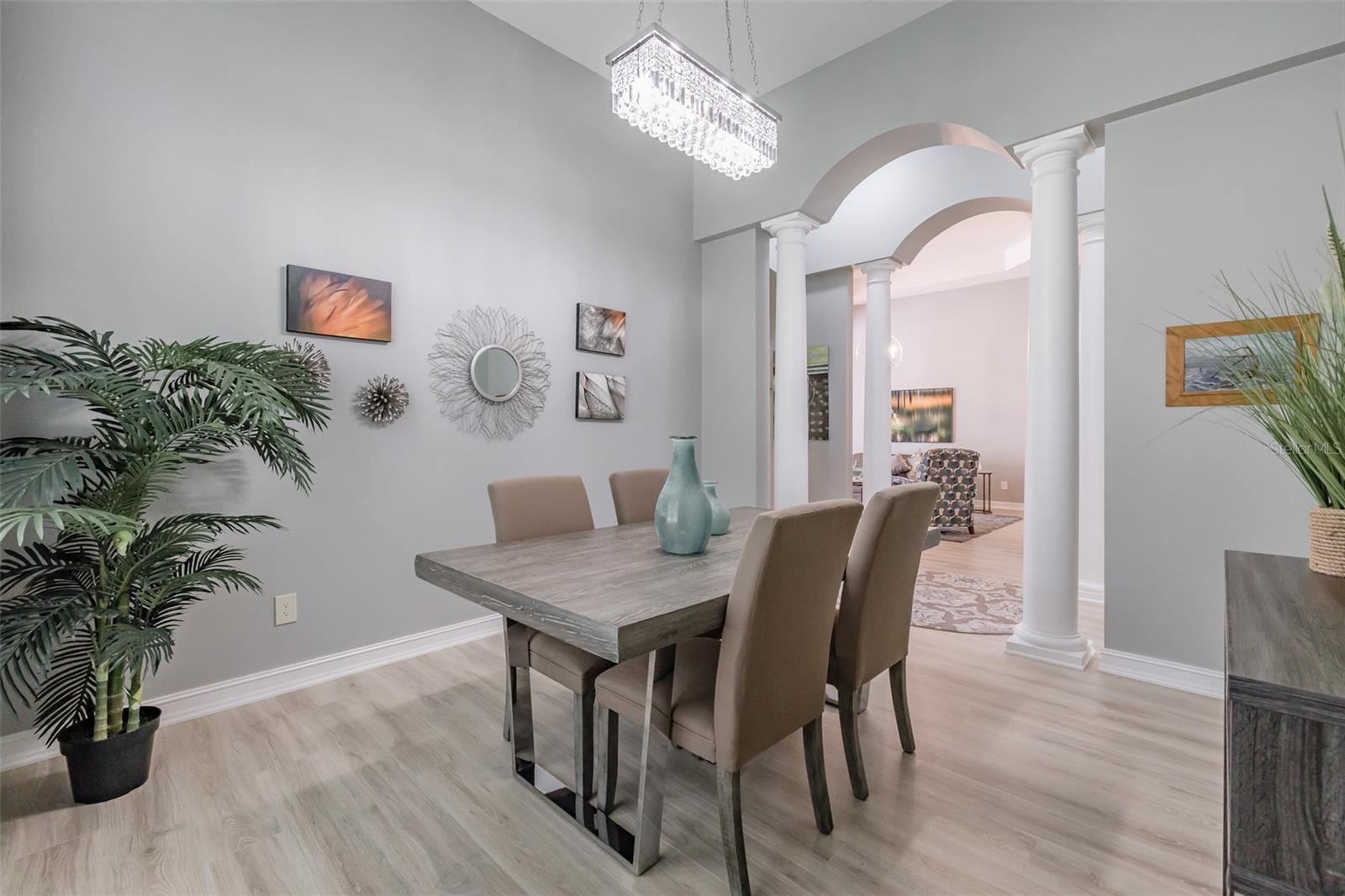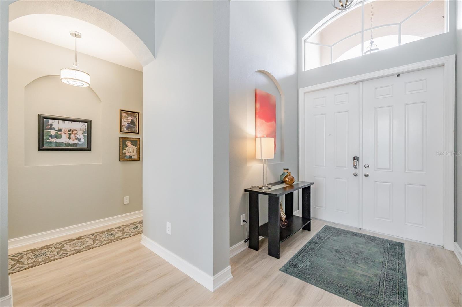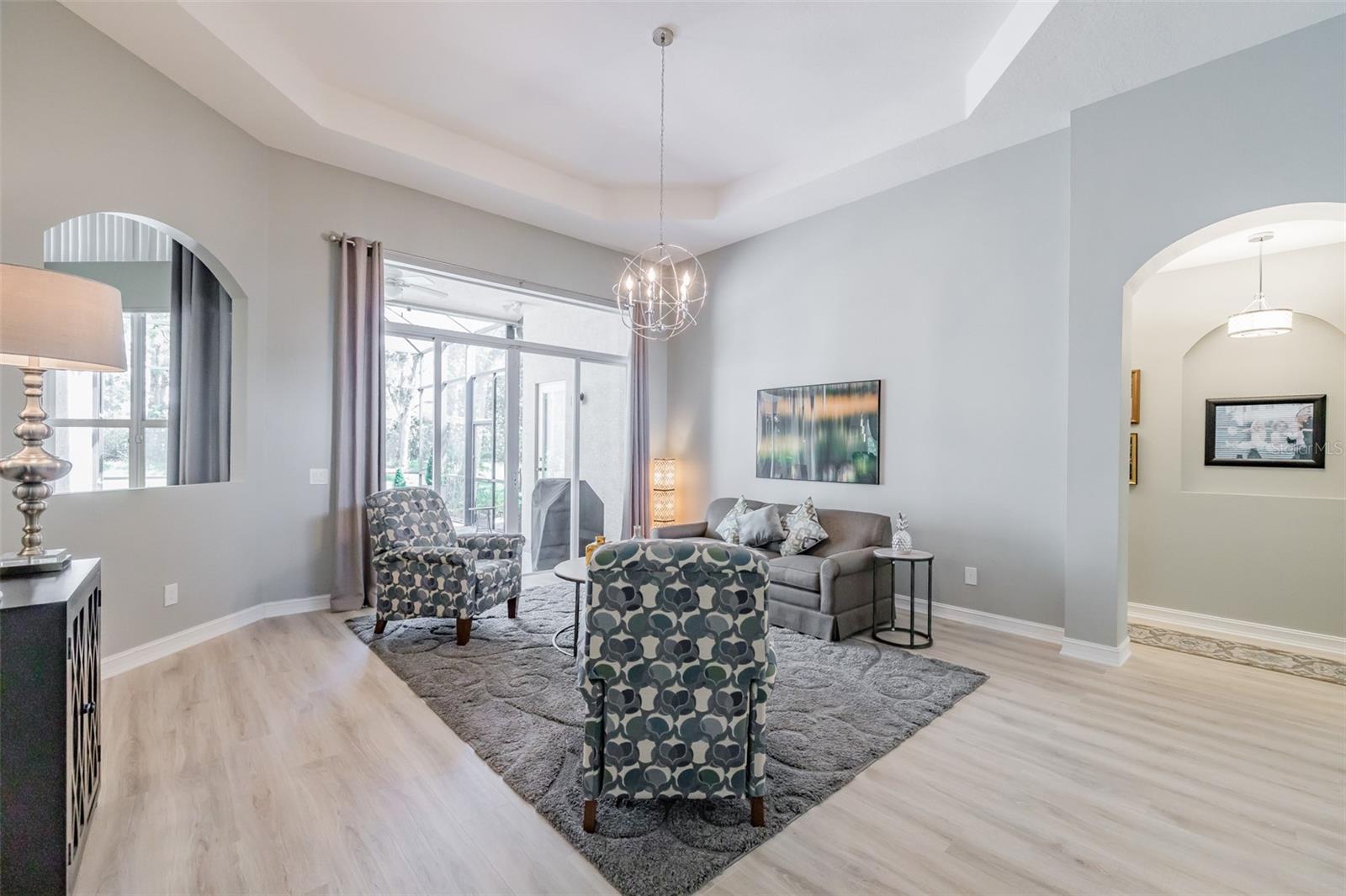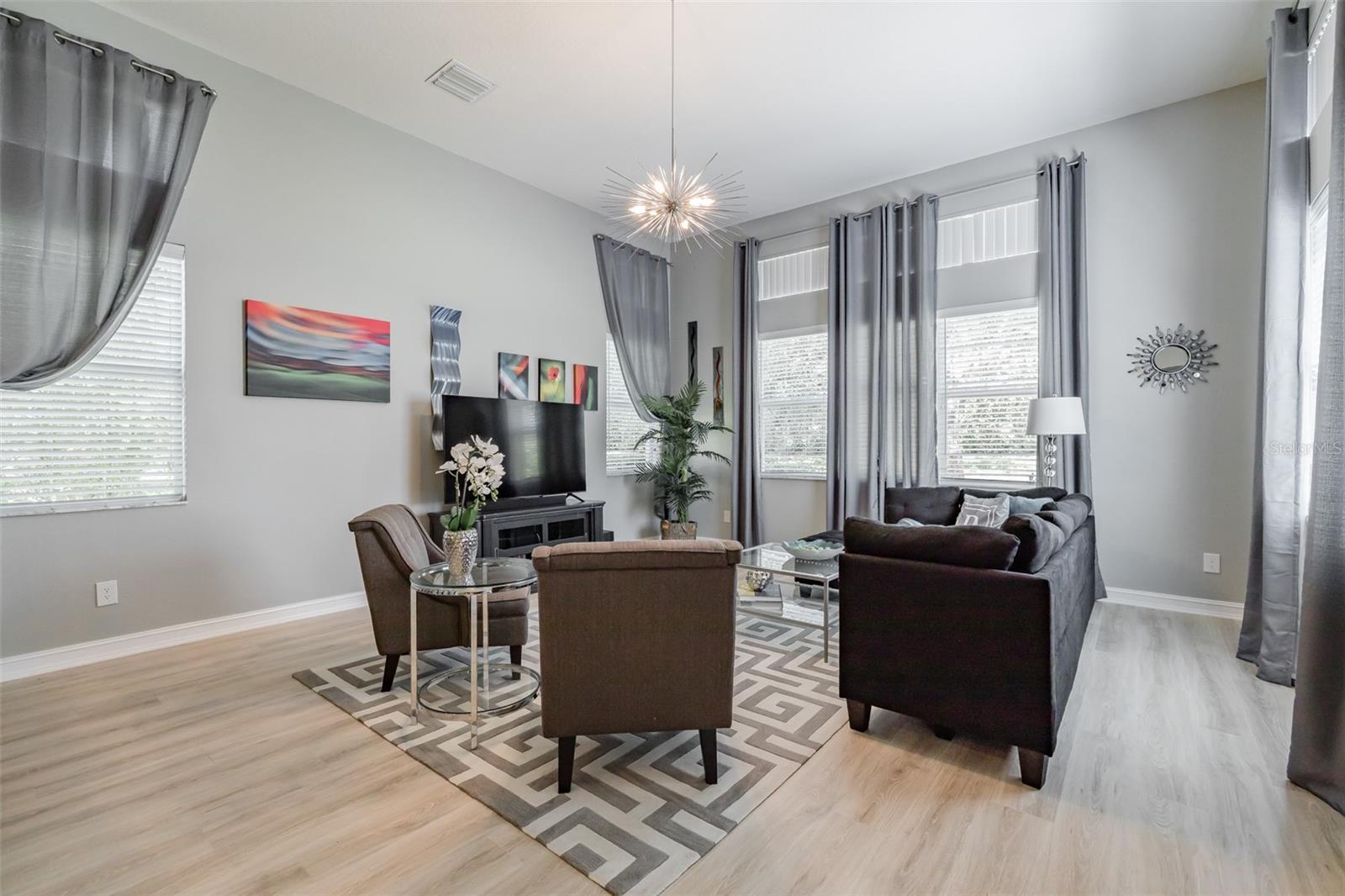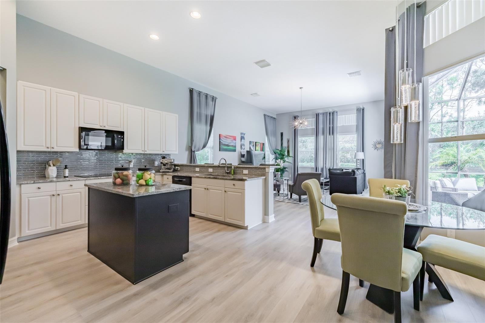 C'mon, make me an Offer that I can't refuse, we are highly motivated. This VERONA is one of few in Valencia Lakes, Tampa Bay's premier Active Adult Community. With 2,866SF under A/C, it will comfortably accommodate the most discerning and demanding amongst us. The Foyer features a 14' ceiling with a niche wall, and it welcomes guests into a Living room with a towering 12'-13' Tray ceiling, two Tuscan columns, and a 10' wide 4-panel Sliding Glass door leading to a private and expansive Lanai. The Dining Room features a 12' ceiling and 2 more Tuscan columns. Caesar would be proud. Recently renovated, the Kitchen is 18'x15' and features a center island, quartz counters, solid maple cabinetry, a 10' long Bar-Height counter that will seat 5 persons, a customized walk-in pantry, double-ovens, counter cooktop, quartz counters topped by optical glass backsplash, double sinks, and a generous Casual Dining Area. The Kitchen overlooks a 20'x17' Family Room with a 12' ceiling, 6 windows with a Transom window above, and a Sliding Glass door to the Lanai. The Master Bedroom has a 9'-10' Tray ceiling, 5 windows, a French door to the Lanai, two custom-finished Walk-In Closets and a very large renovated Ensuite Bathroom. You will love the two separated vanities, Garden Tub, large Walk-In Shower, and the W/C for the Commode. Bedrooms 2 and three are on the opposite side of the house and to the front which will afford you and your guests sublime privacy. The Office/Den is a great space to use as you choose. Throughout the main areas, there is gorgeous laminate flooring, and the bedrooms are carpeted. This house has undergone a magnificent transformative renovation that will not leave you wanting for anything more. Creature comforts are provided by two HVAC units, the main unit was replaced in Spring 2025. The garage features a 'Bump-out' that does afford space for a garage storage system. The Lanai is 29'x18' and it will be a glorious private oasis to live life outdoors. The size, height, and abundance of natural light makes this house feel colossal, yet comfortably large at the same time. You will be proud to call this house, "Home”. Enjoy resort style living at Valencia Lakes. This sought-after community has an amazing 40,000SF Clubhouse offering entertainment shows, dances, over one hundred Clubs, a 5,000SF 24/7 State-of-the Heart Fitness Center, Resort-style pool, 5 Lane-Lap pool, Resistance pool, Spa, Steam & Dry Saunas, 2 Multi-Purpose Fitness Rooms that host Classes, Games Rooms, 7 Pickleball courts, 6 USTA Har-Tru Clay Tennis courts, Bocce, Shuffleboard, Basketball Half-Court, Softball Field, RV & Boat Storage Facility, Gardens plots, Dog Parka a venerated Memorial Honor Circle. Conveniently located to excellent hospitals, Downtown Tampa, Tampa airport, Eclectic St. Petersburg, and a short drive to Disney, Cruise Ports, Sarasota, and some of the best beaches in the country! Come enjoy elegant comfort and begin living your idyllic life. Carpe diem. This home comes with a 13 month Home Warranty for buyer's Peace of Mind and to help make transitioning easier!