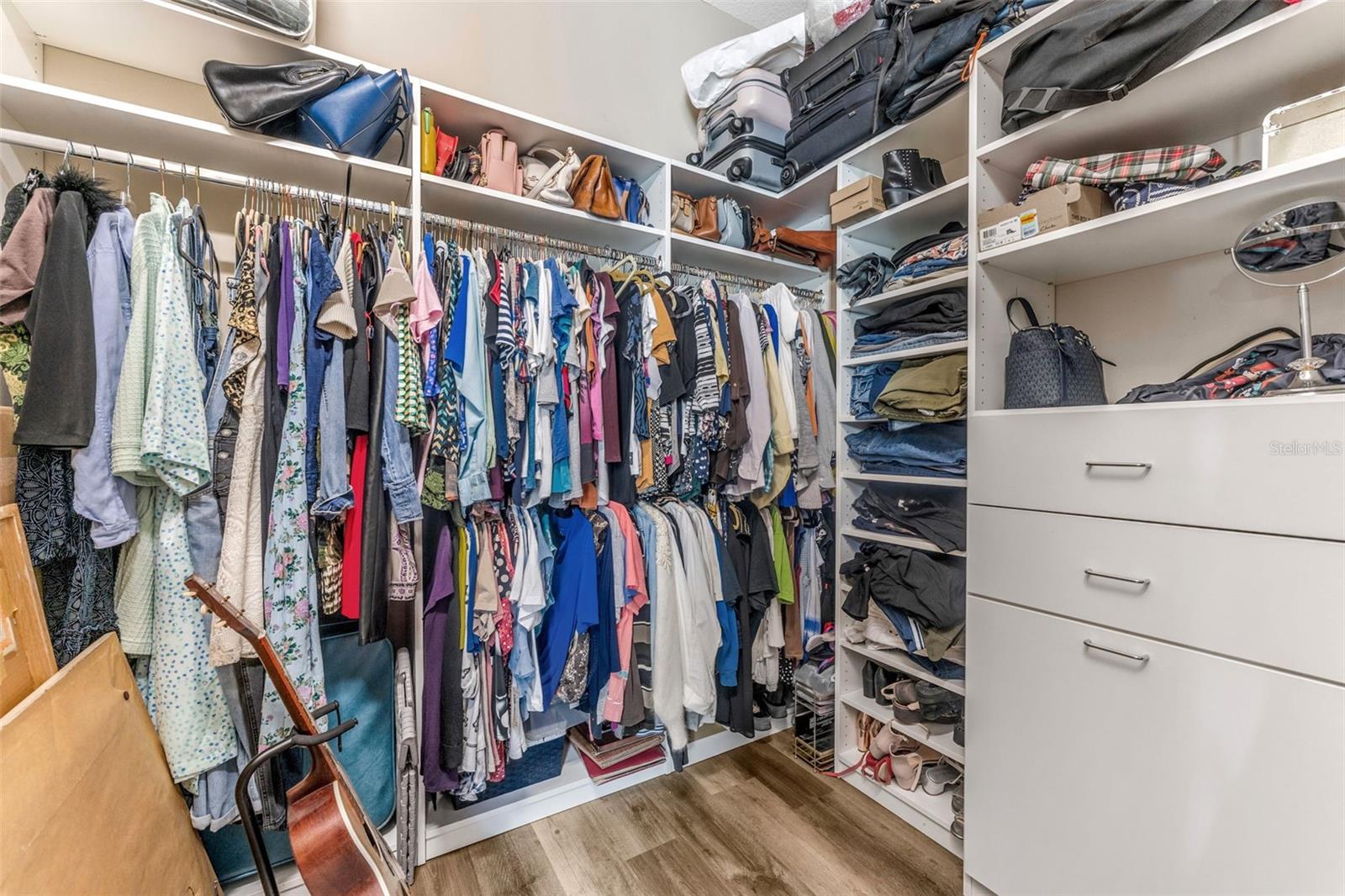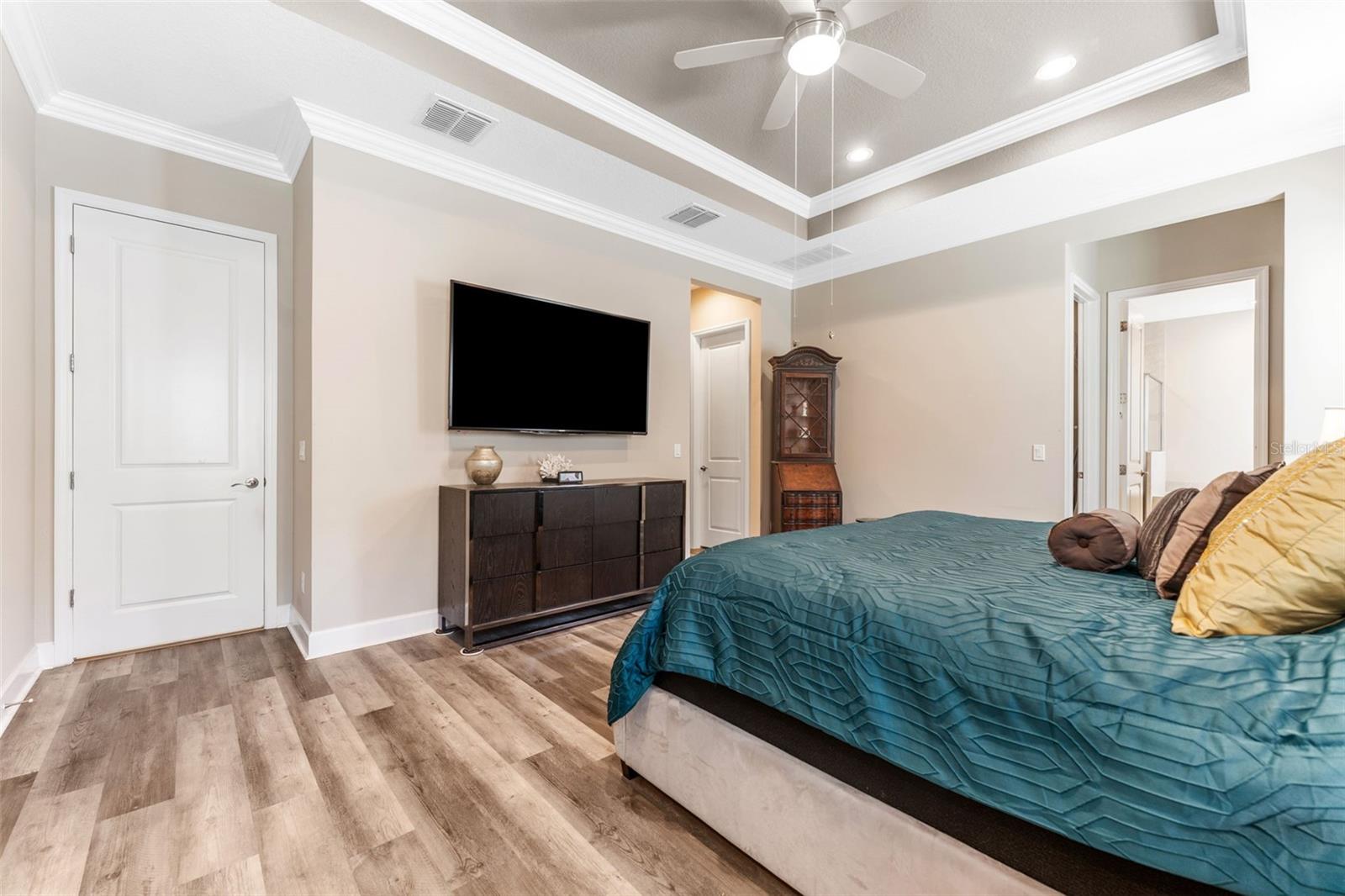 Stunning Valencia del Sol (55+) home with a living room you have got to see! *ASSUMABLE VA 5.25%* ALSO AVAILABLE FURNISHED, FOR RENT! It all starts in the grand foyer with its (15-foot) double tray ceiling and detailed crown molding. Diagonal tile floors lead you towards the Great Room where an abundance of light radiates from the oversized windows & “zero corner” glass sliding doors that virtually cover the entire 32' wall. The 5-panel sliders’ engineering is accordion-style, and for the cooler months of the year you will love having these all the way open, expanding your living room into an even larger lounging area. The screened-in 25ft lanai faces a serene pond to the NE and whether for the afternoon nap or star-gazing at night, you’ll fall in love with having a space like this one. The kitchen features 42” soft-close shaker cabinets of a softened walnut color, gas stove, light quartz countertops & a WiFi-enabled GE double oven. The dining room and living room – with 12ft tray ceiling + crown molding of its own – position themselves almost perfectly around the island counter. The first door on the right off the living room is the unique Master Suite – two ensuite bathrooms and two walk-in closets! High 12ft tray ceiling in this room as well. As you go back into the hallway, the functional flex room (bedroom or office) is on your left. A separate guest bathroom & guest bedroom - featuring bay window and walk-in closet – tie it all together. Full laundry room with newer W/D & ample cabinetry is just off the 2-car garage. **Community Highlights** PRIVATELY GATED COMMUNITY. Resort-style pool with an impressive collection of amenities including the 25,000sf clubhouse, “Bistro del Sol” restaurant & bar (good food!), pickleball, tennis, fitness center (with new equipment) and even a dog park! Events & activities such as karaoke, card games, arts & crafts, water aerobics, dance/yoga, and plenty more. This upscale neighborhood is truly a slice of paradise & with one of the best interior styles in the community, you’d be wise to check it out!