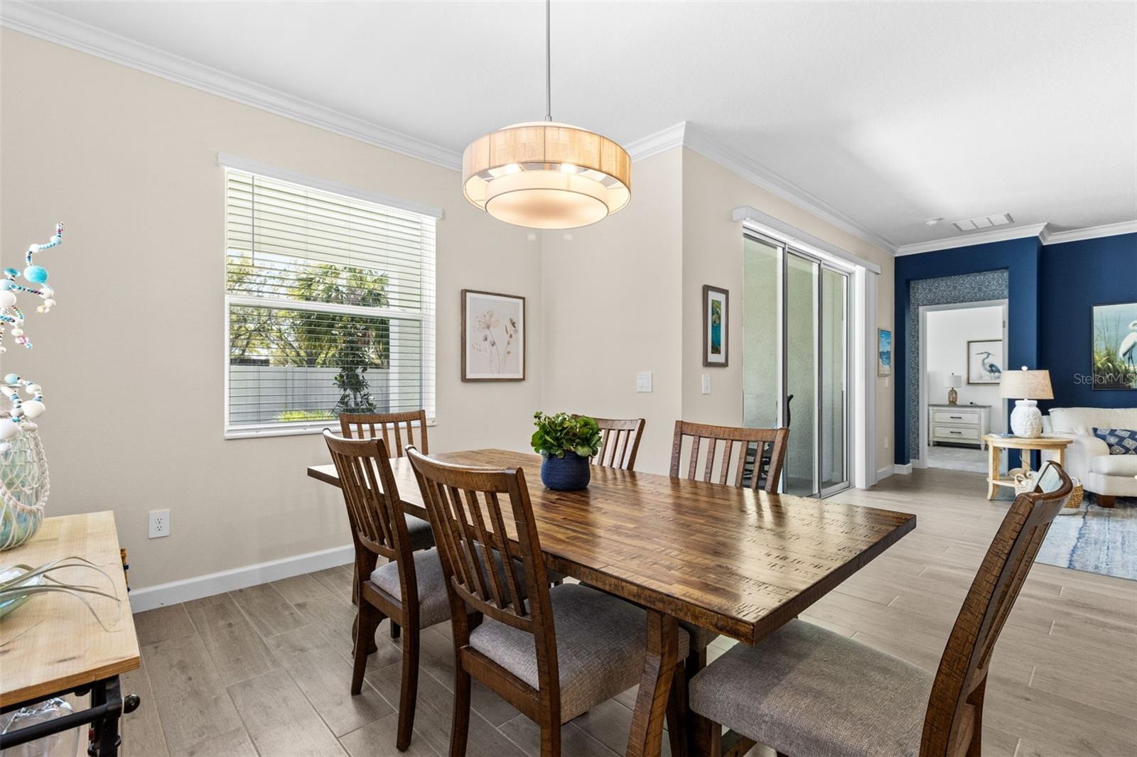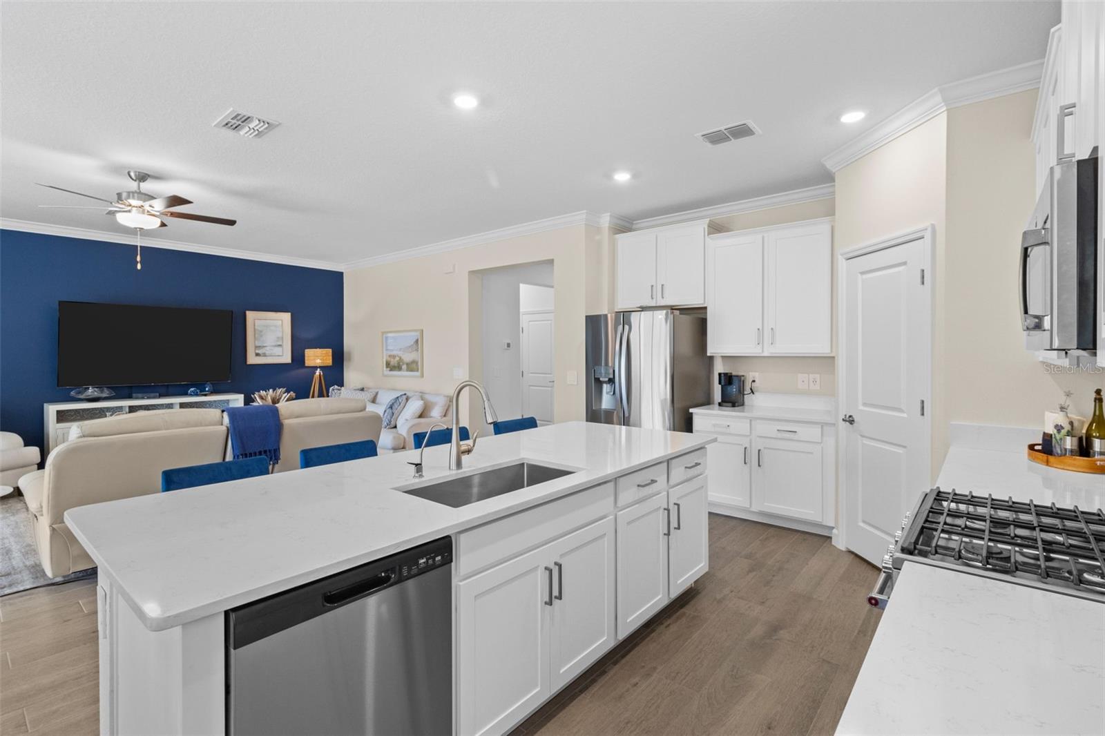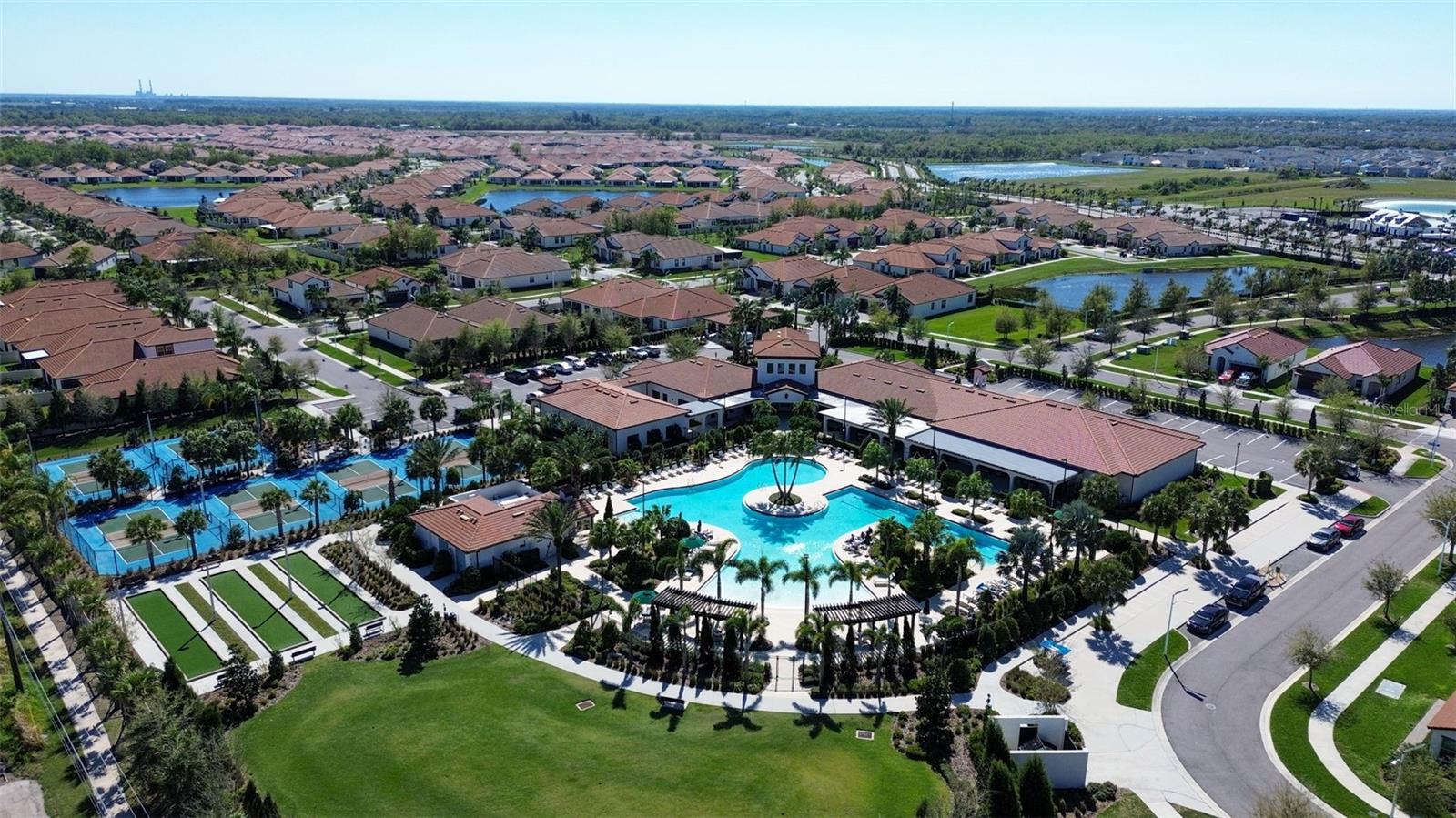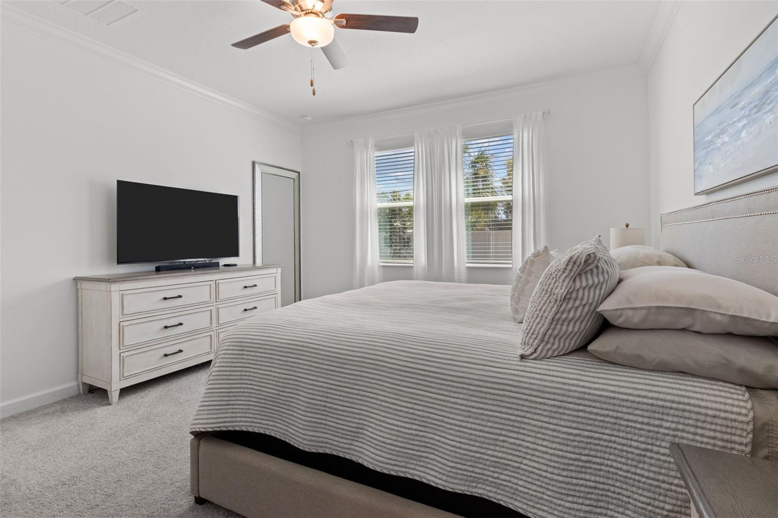 Elegant and professionally decorated 2-bedroom, 2-bathroom home with a flex room (easily converts to a spacious 3rd bedroom) in Medley at South Shore Bay, a premier 55+ gated community. Built in 2024, this move-in-ready home features an open-concept layout with soaring ceilings, abundant natural light, and custom moldings throughout. The chef’s kitchen includes upgraded appliances such as an LG French door refrigerator with craft ice, a 5-burner KitchenAid gas stove, a large breakfast bar, and a spacious dining area that opens to the main living space—ideal for entertaining. The owner’s suite is located at the rear of the home and includes a spa-style bath and walk-in closet. The second bedroom is positioned at the front, along with a flex room that can serve as a third bedroom, office, or hobby space. A screened lanai opens to a private backyard featuring a brand-new 6' vinyl privacy fence. Additional highlights include a paver driveway, two-car garage with golf cart space, oversized laundry room, enhanced security system, designer lighting, and professionally landscaped exterior. Enjoy resort-style amenities including a clubhouse, pool, fitness center, sports courts, walking trails, and a 5.5-acre crystal lagoon for kayaking, paddleboarding, and relaxing. Located in Wimauma near Sun City Center, shopping, dining, healthcare, and outdoor recreation. Experience luxury low-maintenance living in one of Tampa Bay’s most vibrant 55+ communities.