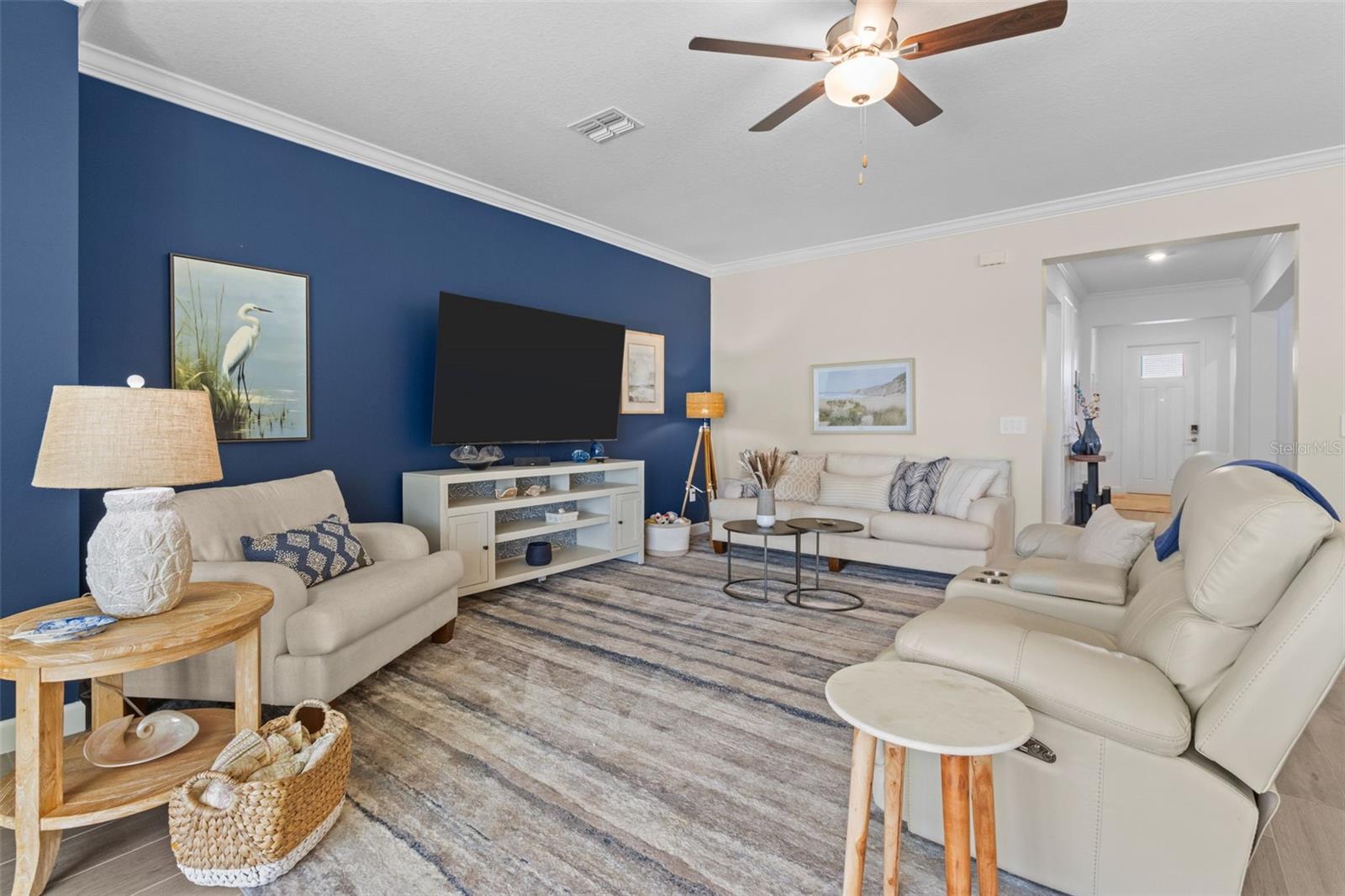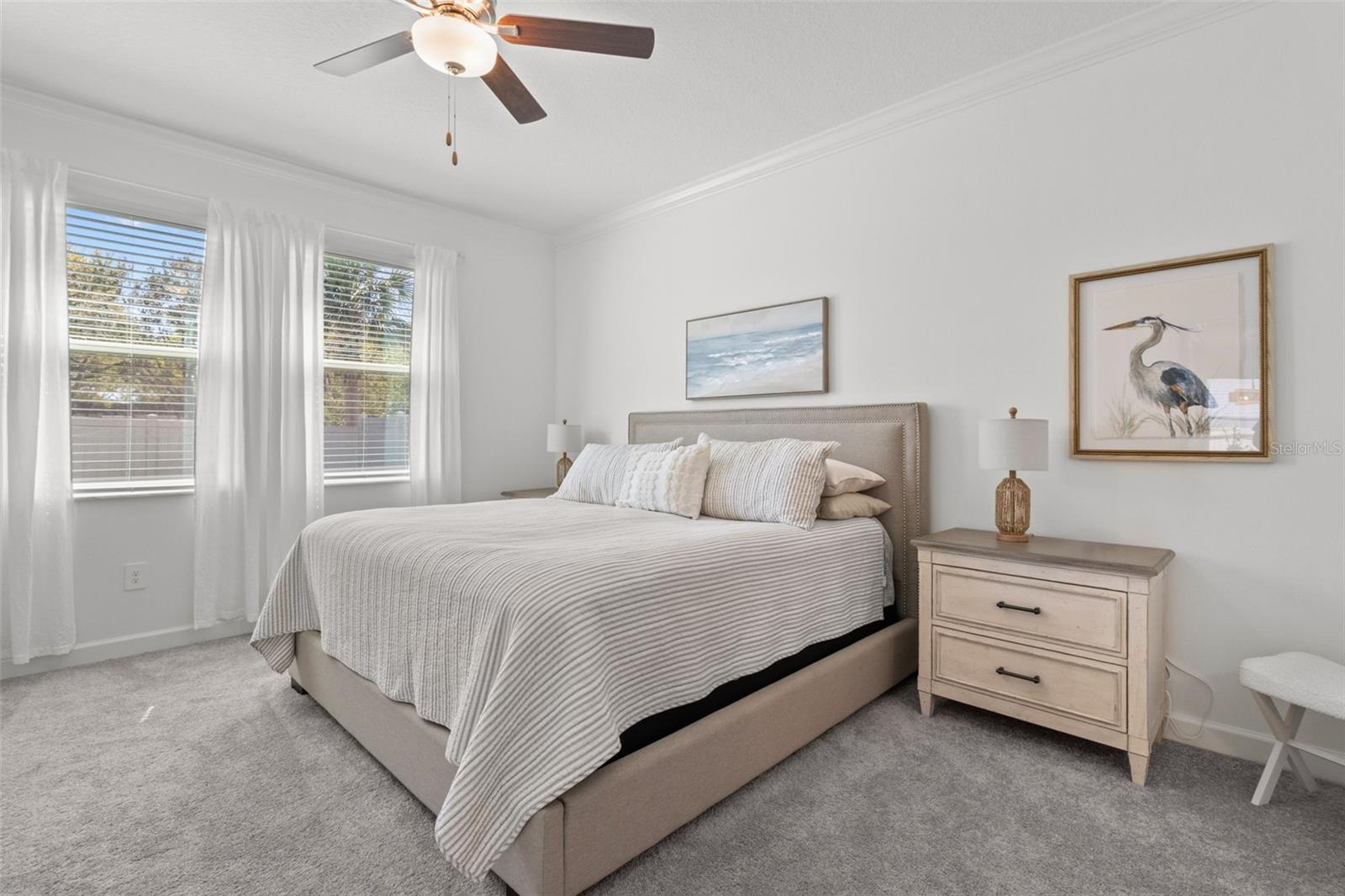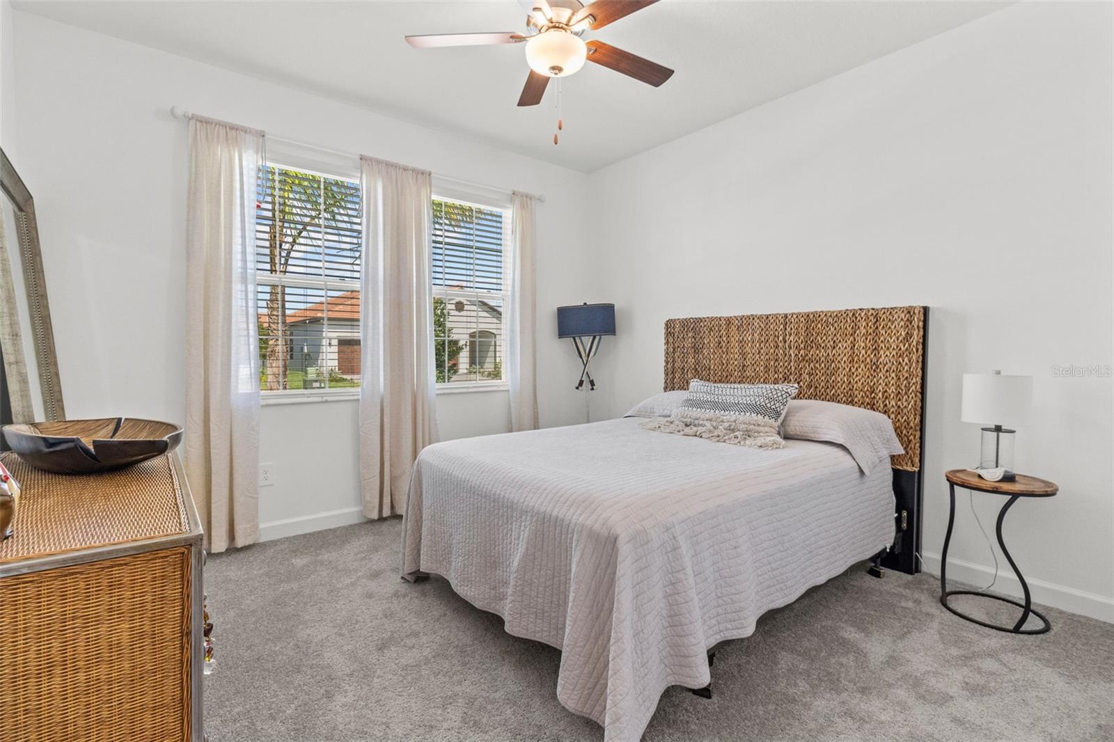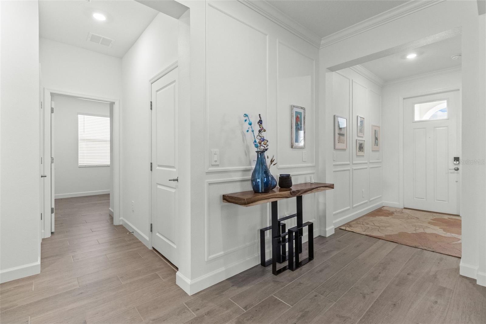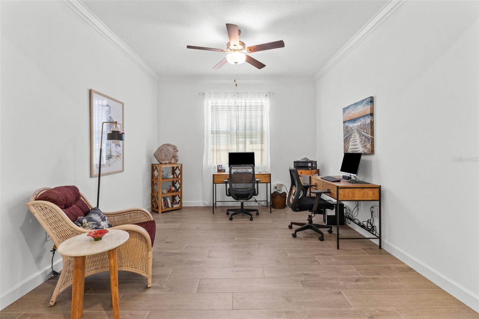 Elegant and professionally decorated 2-bedroom, 2-bathroom home with a flex room (easily converts to a spacious 3rd bedroom) in Medley at South Shore Bay, a premier 55+ gated community. Built in 2024, this move-in-ready home features an open-concept layout with soaring ceilings, abundant natural light, and custom moldings throughout. The chef’s kitchen includes upgraded appliances such as an LG French door refrigerator with craft ice, a 5-burner KitchenAid gas stove, a large breakfast bar, and a spacious dining area that opens to the main living space—ideal for entertaining. The owner’s suite is located at the rear of the home and includes a spa-style bath and walk-in closet. The second bedroom is positioned at the front, along with a flex room that can serve as a third bedroom, office, or hobby space. A screened lanai opens to a private backyard featuring a brand-new 6' vinyl privacy fence. Additional highlights include a paver driveway, two-car garage with golf cart space, oversized laundry room, enhanced security system, designer lighting, and professionally landscaped exterior. Enjoy resort-style amenities including a clubhouse, pool, fitness center, sports courts, walking trails, and a 5.5-acre crystal lagoon for kayaking, paddleboarding, and relaxing. Located in Wimauma near Sun City Center, shopping, dining, healthcare, and outdoor recreation. Experience luxury low-maintenance living in one of Tampa Bay’s most vibrant 55+ communities.