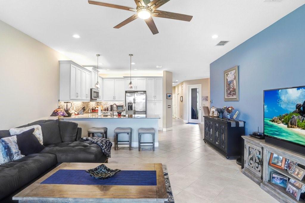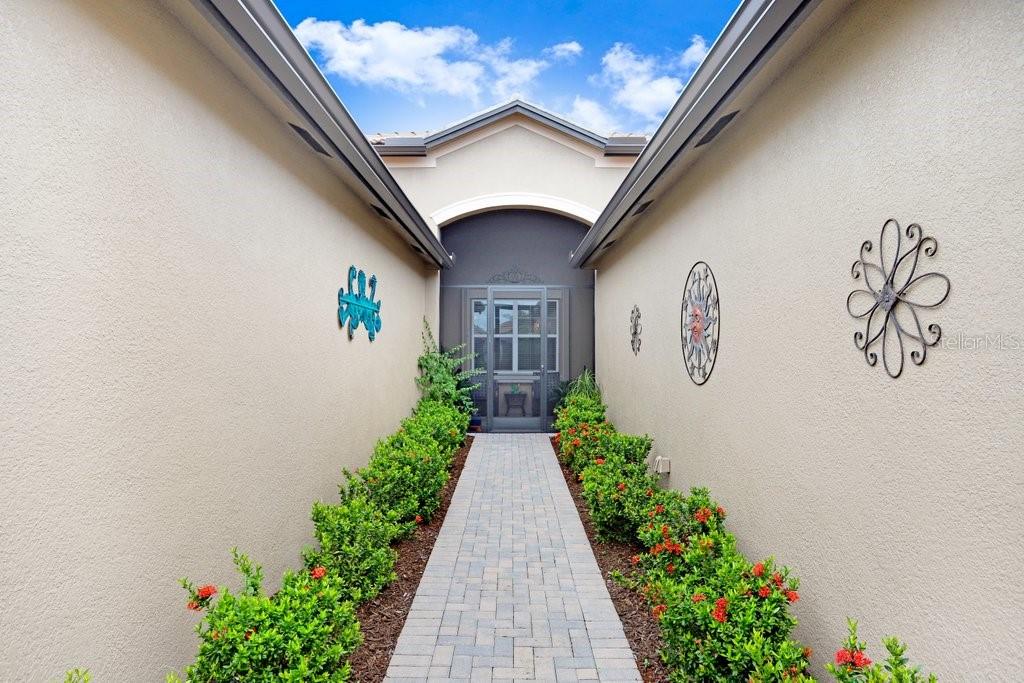 Welcome to this elegant and spacious 2-bedroom, 2-bathroom villa featuring a versatile flex room, offering a total of 1,648 square feet of thoughtfully designed living space. This meticulously maintained home is nestled within a highly sought-after 55+ community, providing a secure and tranquil environment with 24/7 gate attendant service. The villa showcases an open floor plan that seamlessly connects the bright and inviting living areas, creating an ideal setting for both relaxation and entertainment. A flexible den space adds to the home’s functionality, serving perfectly as an office or guest room. Architectural details include 9-foot ceilings and 42-inch kitchen cabinets, enhancing the sense of openness and sophistication. The expansive primary suite is a true retreat, featuring two walk-in closets and a beautifully appointed en suite bathroom with a large shower, double vanities, and a convenient linen closet. Sliding glass doors from the living room lead to a screened lanai, where you can enjoy serene views of the pond and surrounding greenery. Residents of this vibrant community benefit from an array of amenities designed to support an active and low-maintenance lifestyle. The clubhouse offers a bistro, fitness center, beach-entry pool, pickleball and tennis courts, bocce ball, game rooms, and organized social activities. For pet lovers, two dog parks are conveniently located near the clubhouse. Peace of mind is ensured with new accordion shutters installed on all windows and rear sliders, along with a fully operational alarm system. Situated just minutes from the sunny Gulf Coast beaches, premier shopping destinations, and Tampa International Airport, this home is truly move-in ready and awaits your personal touch.