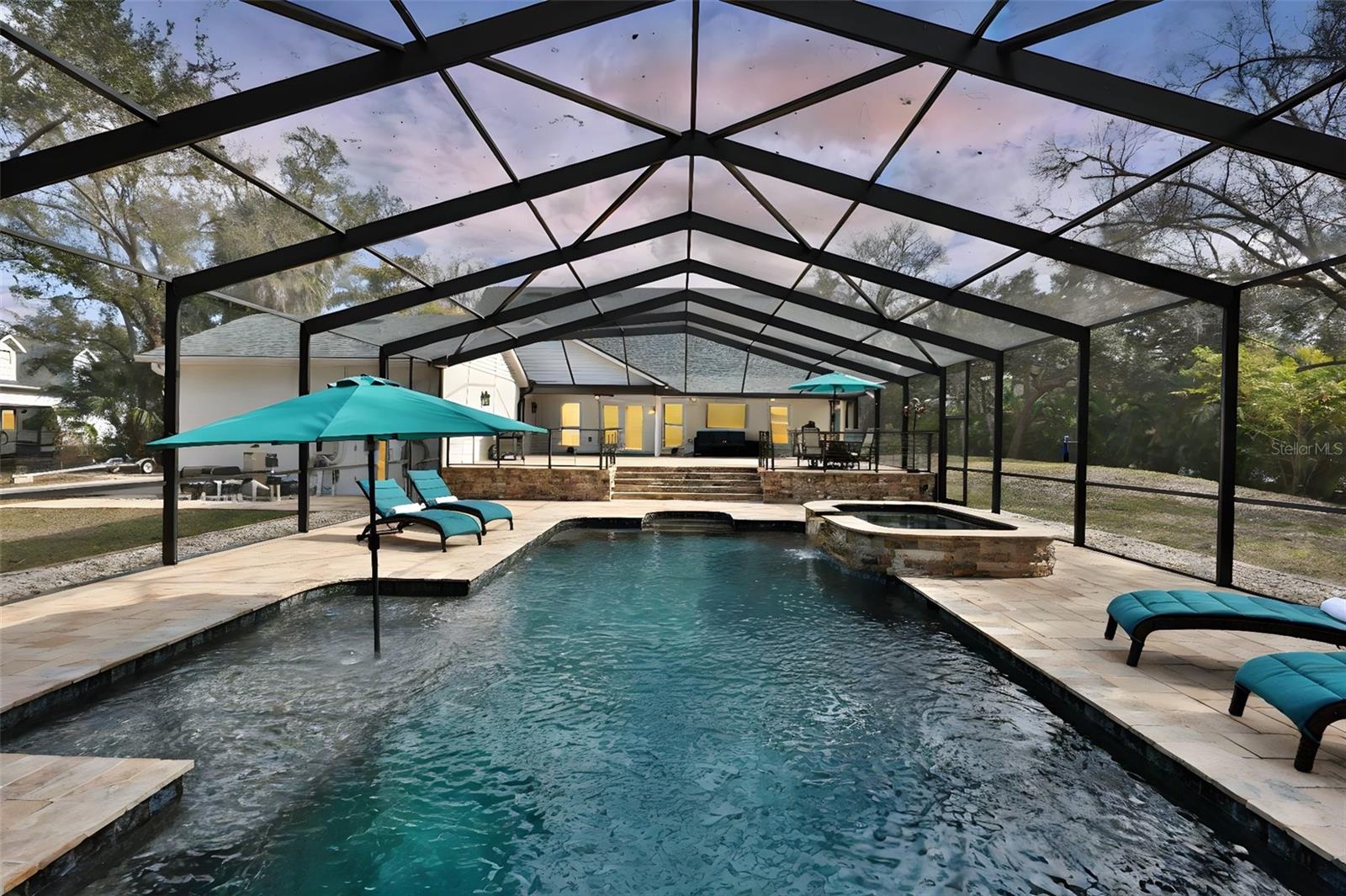 Nestled on 2.25 fully fenced acres in the highly desirable Sundance community, this beautifully maintained traditional Key West–style home offers privacy, functionality, and thoughtful upgrades throughout. A gated entry with lighted pillars leads to a circular drive and a park-like, wooded setting with walking trails, native landscaping, fruit trees, and multiple firepit areas—creating a peaceful retreat just minutes from modern conveniences. Inside, the home features a well-designed layout that balances openness with separation. The living room showcases vaulted ceilings and scenic views of the outdoor living space while remaining distinct from the kitchen and dining areas. The main-floor primary suite is privately positioned near the living area and features an en-suite bath with custom marble floors and counters, a large walk-in shower, and an oversized walk-in closet with additional storage beneath the stairs. The kitchen includes custom granite countertops, window sills, tile flooring, a coffee bar, breakfast nook, and dining bar. Upstairs are two generously sized bedrooms with oversized closets and a large loft overlooking the living room—ideal for a home office, media room, or flex space—along with abundant storage including walk-in attic access, utility closets, and storage above the garage. French doors open to an approximately 1,800 sq ft screened lanai featuring a custom heated saltwater pool measuring approximately 30’ x 15’ with a 7’ depth, sun shelf, bench seating, and a spacious hot tub. The lanai includes two propane hookups for grills or a future outdoor kitchen and offers peaceful sunset views that silhouette the surrounding trees. Notable upgrades include PGT WinGuard hurricane-impact windows, two Trane HVAC systems, a Rheem water heater with hot water comfort system, well pump and drop pipe replacement (2019), new roof (2024), Hayward TurboCell salt chlorinator, new carpet (2024), updated window treatments, a freshly painted exterior, and a spacious two-car garage. The expansive rear yard provides ample space for a future barn or shed. Sundance is a unique riverfront and equestrian community offering a private marina and boat launch on the Little Manatee River, two community docks with water and electric, equestrian facilities with a barn and paddocks, direct access to nearby riding trails and Little Manatee State Park, a community park, and seasonal neighborhood events—all with a low annual HOA fee of approximately $241. This exceptional property delivers acreage, privacy, lifestyle amenities, and peace of mind in a truly distinctive setting.