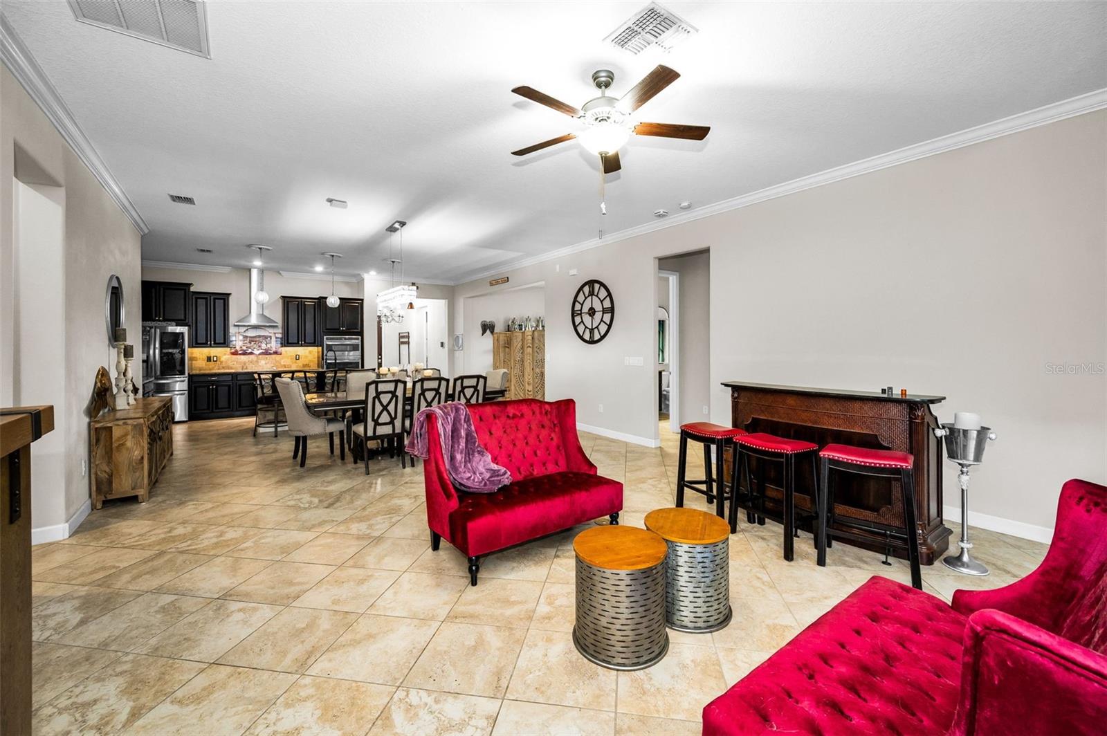 Welcome to your dream home! This stunning 3-bedroom, 3-bath residence offers over 2,600 sq. ft. of thoughtfully designed living space, blending modern construction with timeless details and a peaceful water view. From the moment you step inside, you’ll be greeted by soaring 10-foot ceilings, elegant crown molding, and an abundance of natural light that creates a warm and inviting atmosphere. The open-concept floor plan is ideal for both everyday living and entertaining. At the heart of the home, the gourmet kitchen features a spacious island, upgraded stone tile backsplash, a convenient butler’s pantry, and sleek stainless-steel appliances. Overlooking the dinette and living room, this layout makes hosting family and friends effortless. The living areas flow seamlessly onto the extended, screened-in lanai—an ideal spot to unwind or entertain while enjoying tranquil water views all year long. The master suite is a true retreat, complete with a tray ceiling, luxury vinyl flooring, and a spa-inspired bathroom featuring a walk-in shower, soaking tub, and a generous walk-in closet. Each additional bedroom also includes a walk-in closet, with the front bedroom offering its own private ensuite—perfect for guests. A versatile flex room provides endless possibilities, whether you envision a home office, bar area, or hobby space tailored to your lifestyle. Rounding out this exceptional home is a spacious 3-car garage, providing ample storage and convenience. The Medley Community Amenity Center offers fun for all with a resort style pool with lap pool, fitness center, card room, billiard room, pickle ball and bocce ball courts, as well as its own restaurant which is open for lunch and dinner. Since Medley is within Southshore Bay, you may also enjoy other amenities such as the Metro Lagoon by Crystal Lagoons, cabanas, sand volleyball, and much more. You must see this one to believe all it has to offer! This move-in-ready home is designed for comfort, functionality, and modern living. Don't miss the opportunity to make it yours!