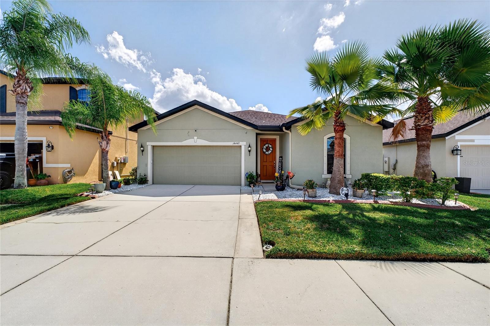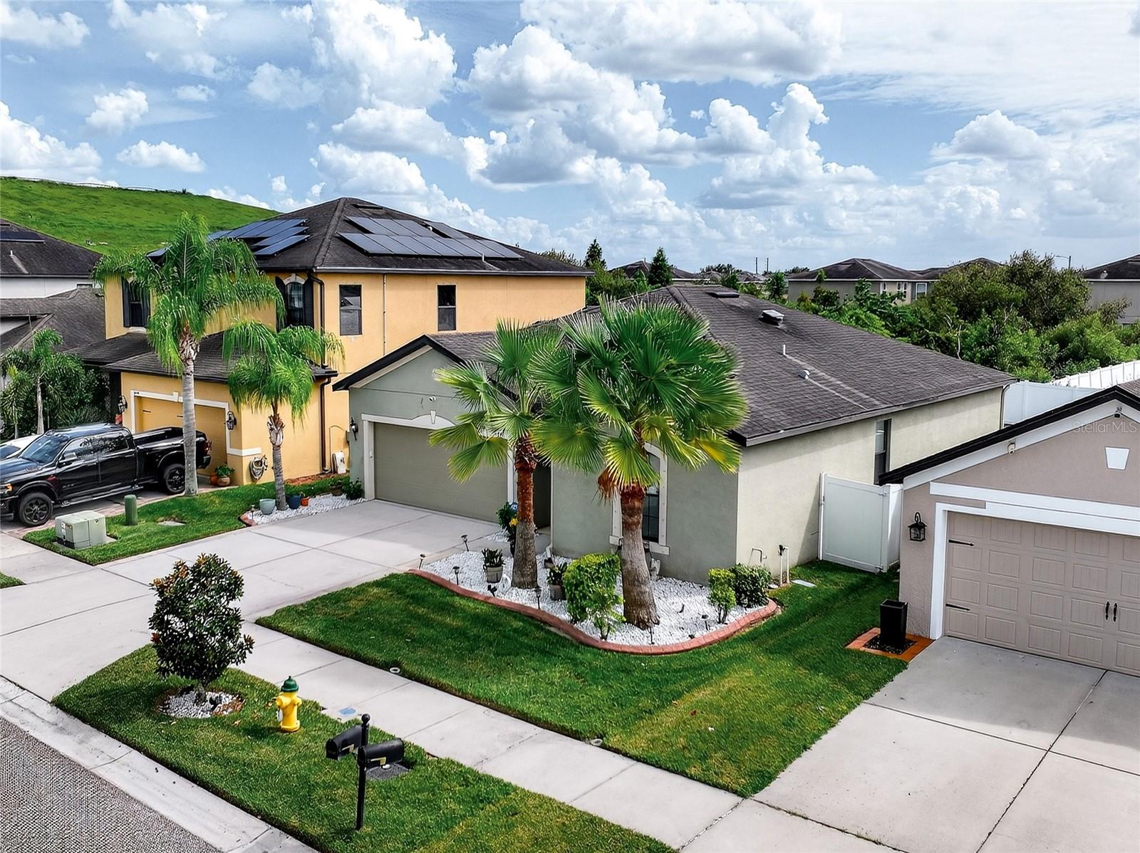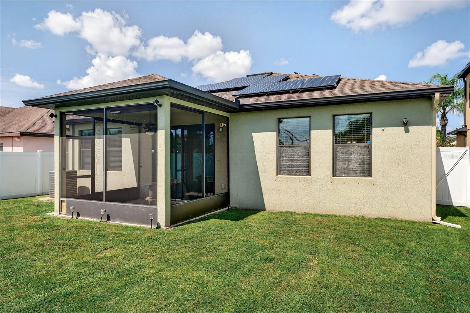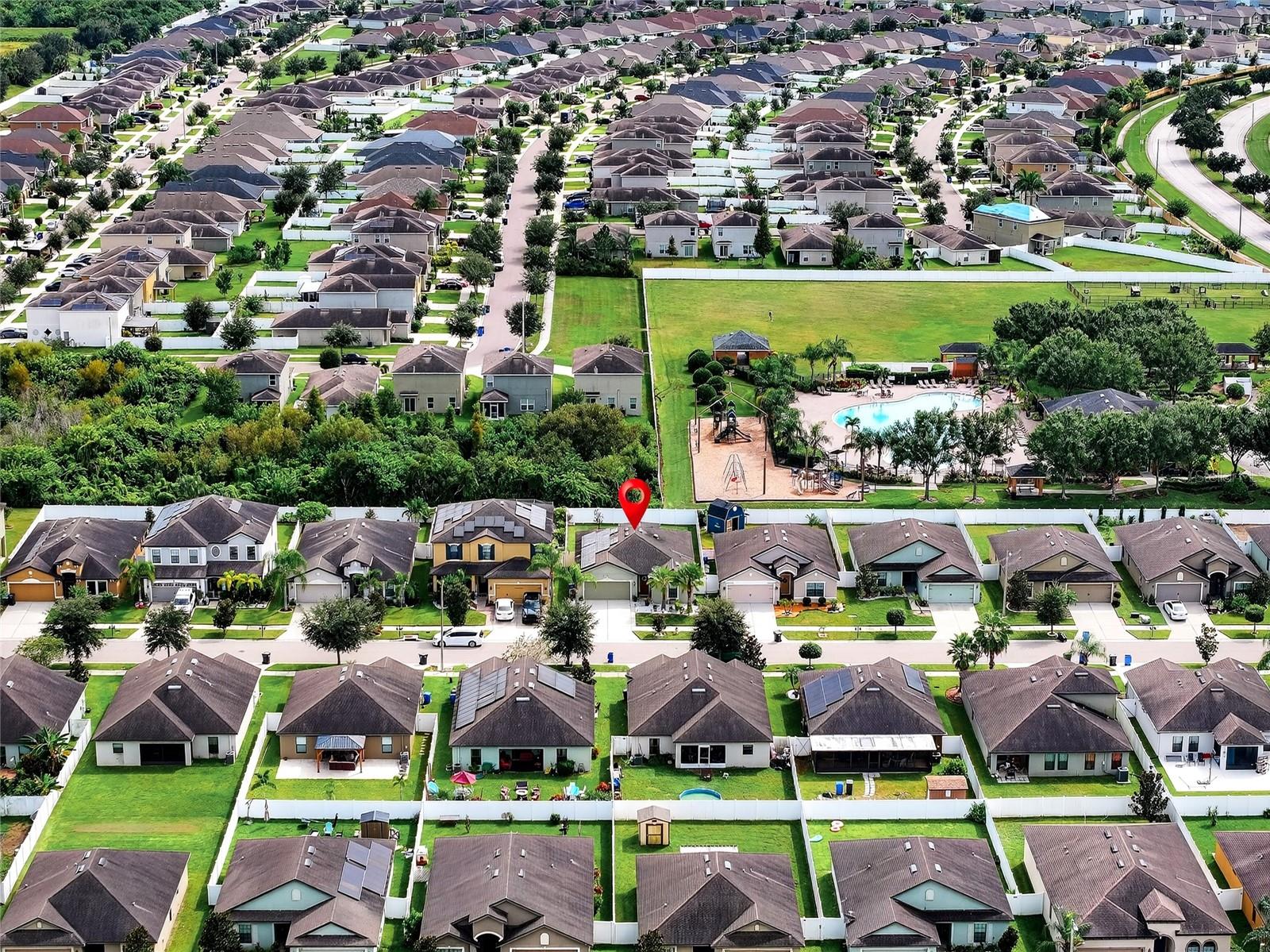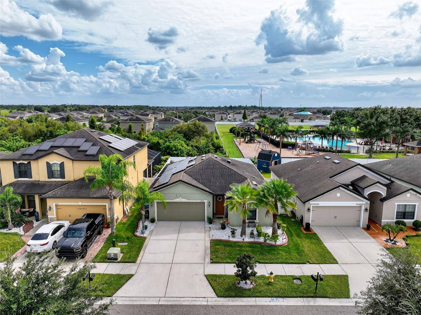 A priced right must see in an amazing community that offers excellent amenities including a sparkling resort style pool with a clubhouse, playground, fitness center, and walking trails. This stunning and immaculate 2017 built home offers a split floor plan for privacy with 3 bedrooms and 2 full baths. The mature and well-maintained landscape boasts beautiful palm trees and lawn. The open floor plan features a spacious living room and dining room/kitchen combo with vaulted ceilings and porcelain tile throughout. The kitchen has beautiful white cabinets, stainless steel appliances, walk-in pantry and a kitchen island with dual sinks for cooking and entertaining. From the dining room you enter the backyard through sliding doors into a screened and covered lanai to enjoy the peaceful fully fenced yard. The generous size master bedroom located in the back of the home for additional privacy has two walk-in closets with an en-suite master bath featuring dual sinks, private lav and walk-in tile shower. The laundry room is conveniently located right down the hall near the two additional spacious bedrooms along with the additional full bathroom with a bathtub. The home also features fully paid for solar panels that convey so you can enjoy minimal electricity cost. Don't miss the opportunity to make this beautiful home your own. Preferred lender offering $2,000 credit to be used toward one year rate buydown.