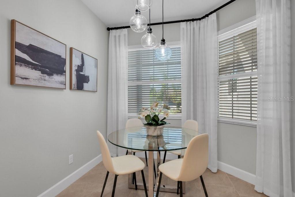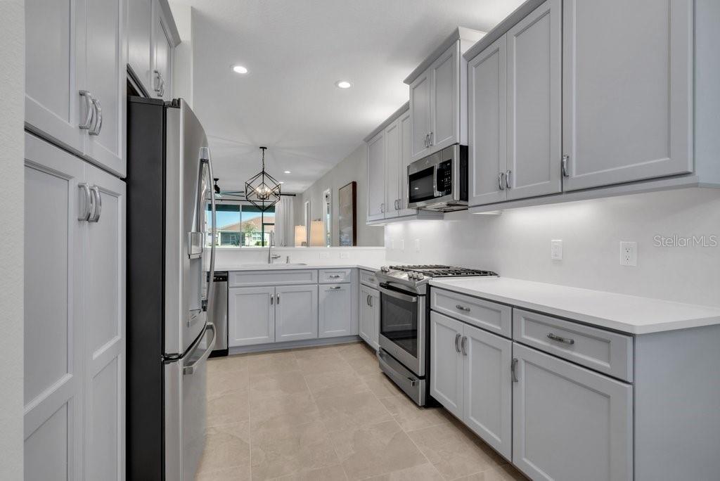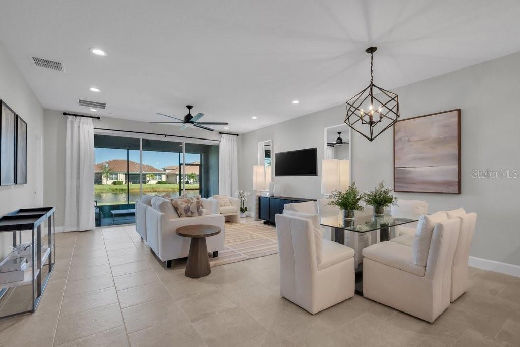 Located in Valencia del Sol, the most exciting 55+ resort-style community on Florida’s Gulf Coast, this beautifully partially furnished and decorated Columbia model offers a perfect blend of luxury, comfort, and carefree living. Designed with an open great-room layout, this home features 2 bedrooms, a den/3rd bedroom, 2 baths, and a 2-car garage, making it ideal for both relaxation and entertaining. The gourmet kitchen opens seamlessly to the dining area and spacious great room, flowing directly to the covered and screened lanai through triple 8-foot glass sliders that frame a stunning water view. Inside, you’ll find elegant 18x18 tile flooring laid in a waterfall offset pattern throughout the main living areas and den. The kitchen is a showstopper, boasting 42” Dove Maple cabinetry with crown molding and valance, soft-close dovetail drawers, under and over cabinet lighting, Silestone quartz countertops, a designer mosaic backsplash, and a counter-height extended bar top. Premium GE stainless steel appliances include a gas range, French door refrigerator, microwave, and built-in pantry. The spacious master suite features a coffered ceiling and two large walk-in closets, while the luxurious master bath includes a walk-in shower with decorative tile to the ceiling, quartz countertops, and comfort-height Dove cabinetry. The second bedroom also offers a walk-in closet, and the den/3rd bedroom features elegant double French doors. The laundry room is complete with upper cabinets and GE washer and gas dryer. Loaded with upgrades and set in a vibrant, active community that offers resort-style amenities, endless activities, and a friendly neighborhood atmosphere, this exceptional home redefines 55+ luxury living in Tampa Bay.