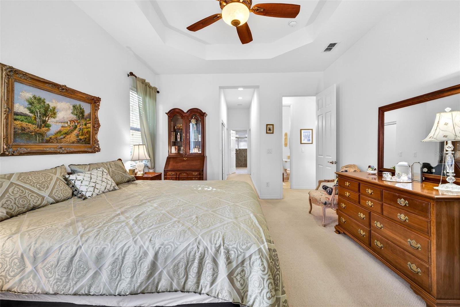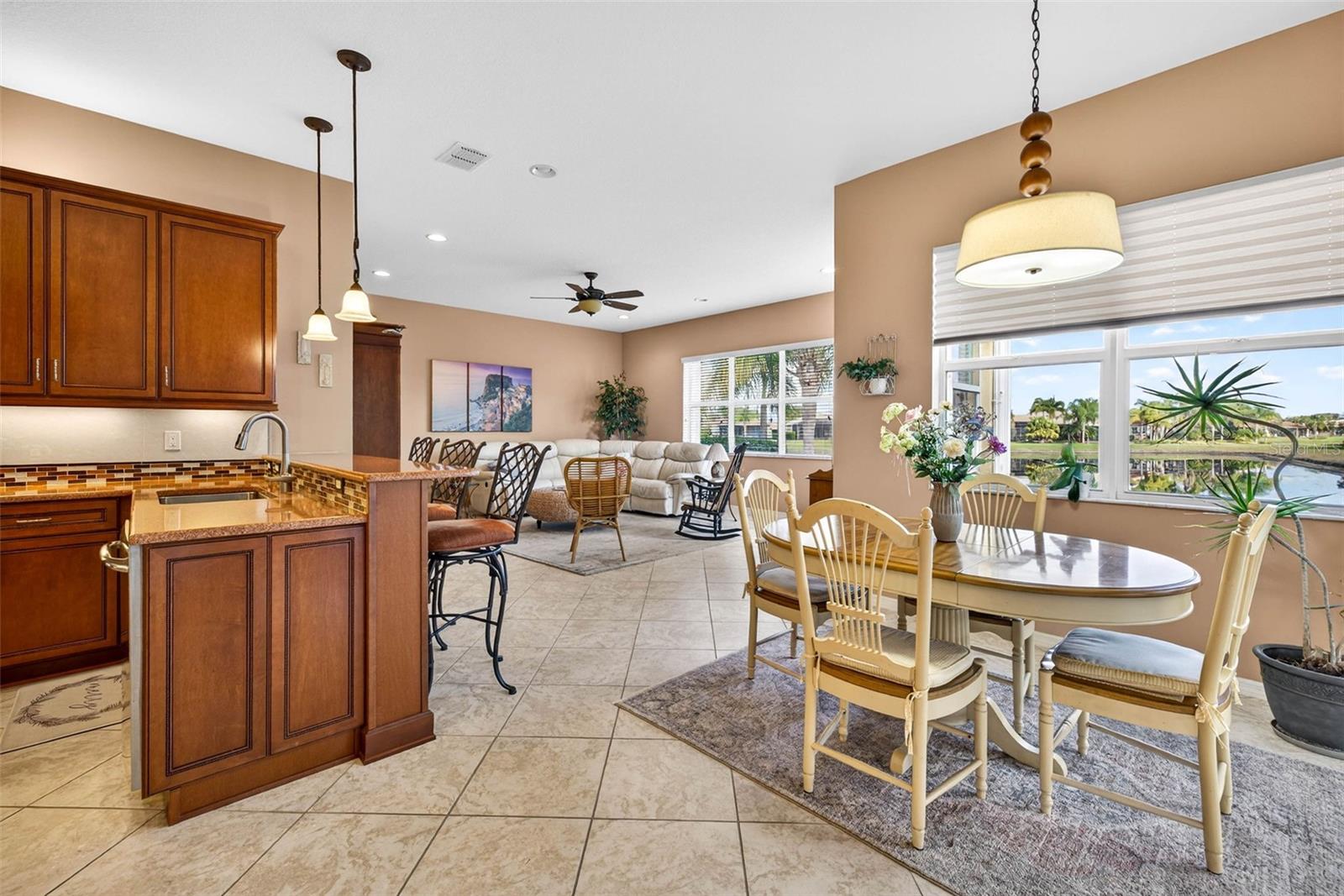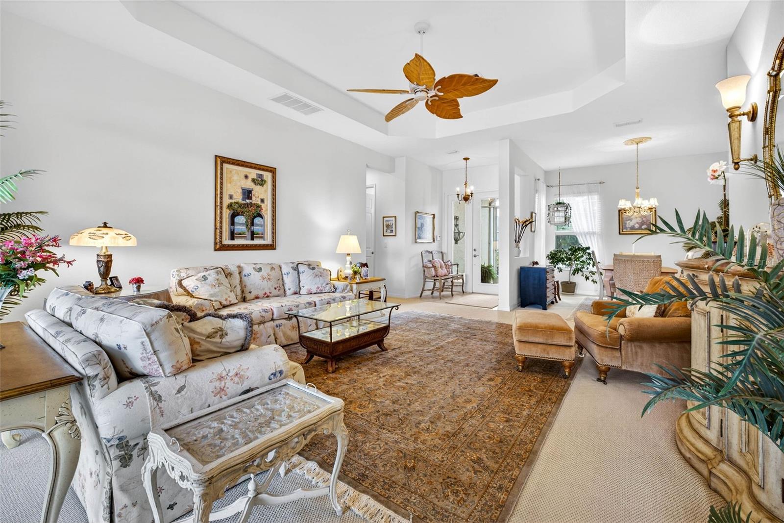 Bright, open, and inviting with 10 foot ceilings—this home captures the essence of relaxed Florida living. Priced to sell, with consideration for new flooring in the carpeted areas. This home features double-pane windows and easy-close hurricane shutters for comfort and peace of mind. The true split floor plan offers three bedrooms, ensuring privacy for both owners and guests. The expansive primary suite showcases a coffered ceiling, large windows overlooking the pond and conservation area, two walk-in closets, and a generous en-suite bath with dual vanities and a large walk-in shower. The upgraded kitchen features custom-designed cabinetry, stone countertops, designer tile backsplash, and above- and below-cabinet lighting, including illuminated glass display cabinets. The popular Rialto floor plan offers an abundance of windows, perfectly positioned to capture tranquil views of the natural setting behind the home. The spacious 18' x 20' family room is filled with natural light and flows seamlessly into a large breakfast nook with oversized windows and a sliding glass door leading to the covered, screened lanai. An additional open patio provides the perfect spot to enjoy peaceful pond and wooded conservation views. Located in Valencia Lakes, HOA fees include yard maintenance, mowing, irrigation, cable TV, high-speed internet, and a monitored security system, allowing for truly carefree living. Just a short distance from the renovated 40,000-square-foot clubhouse and lifestyle center, residents enjoy three pools including a resort-style pool, resistance pool, and lap pool, an outdoor hot tub, sauna and steam rooms, ballroom, state-of-the-art fitness center, tennis courts, pickleball, bocce, softball, shuffleboard, basketball, recreation paths, RV and boat storage on premises, and a full calendar of clubs, crafts, and social activities. The community also features the Veterans Memorial Park, known as the Circle of Honor. Conveniently located minutes from shopping, dining, hospitals, and everyday conveniences, this home offers the best of resort-style, maintenance-free living—all that’s left to do is move in and enjoy.