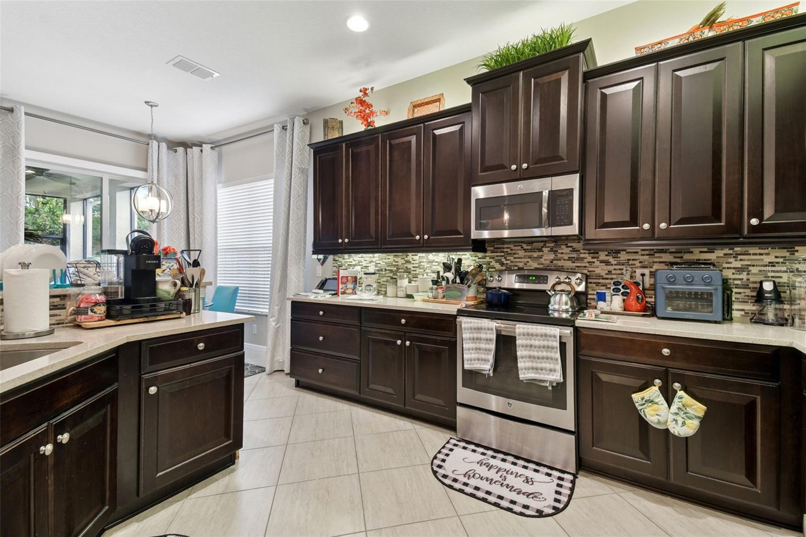 Experience elegance and comfort in this meticulously cared-for San Remo model, built by GL Homes in 2016 and nestled in the highly sought-after 55+ resort-style community of Valencia Lakes. This immaculate 2-bedroom residence with a versatile office—easily convertible into a third bedroom, den, or media room—offers a refined blend of luxury and functionality, featuring an open-concept layout where formal and casual living spaces transition effortlessly. The gourmet chef’s kitchen, complete with a generous pantry, flows seamlessly into the great room, creating an ideal setting for everyday living and entertaining, while an expansive screened-in lanai extends the living space outdoors and provides a peaceful retreat perfect for enjoying morning coffee or evening sunsets in total comfort. The primary suite serves as a private sanctuary with elegant tray ceilings and a spa-inspired en-suite bath featuring dual vanities and a spacious glass-enclosed shower, complemented by recent updates including a new hot water heater (2025) and hurricane shutters (2023). Residents enjoy an unparalleled lifestyle with access to a massive clubhouse, state-of-the-art fitness center, and sparkling resort-style pools within a beautifully maintained resort setting.
