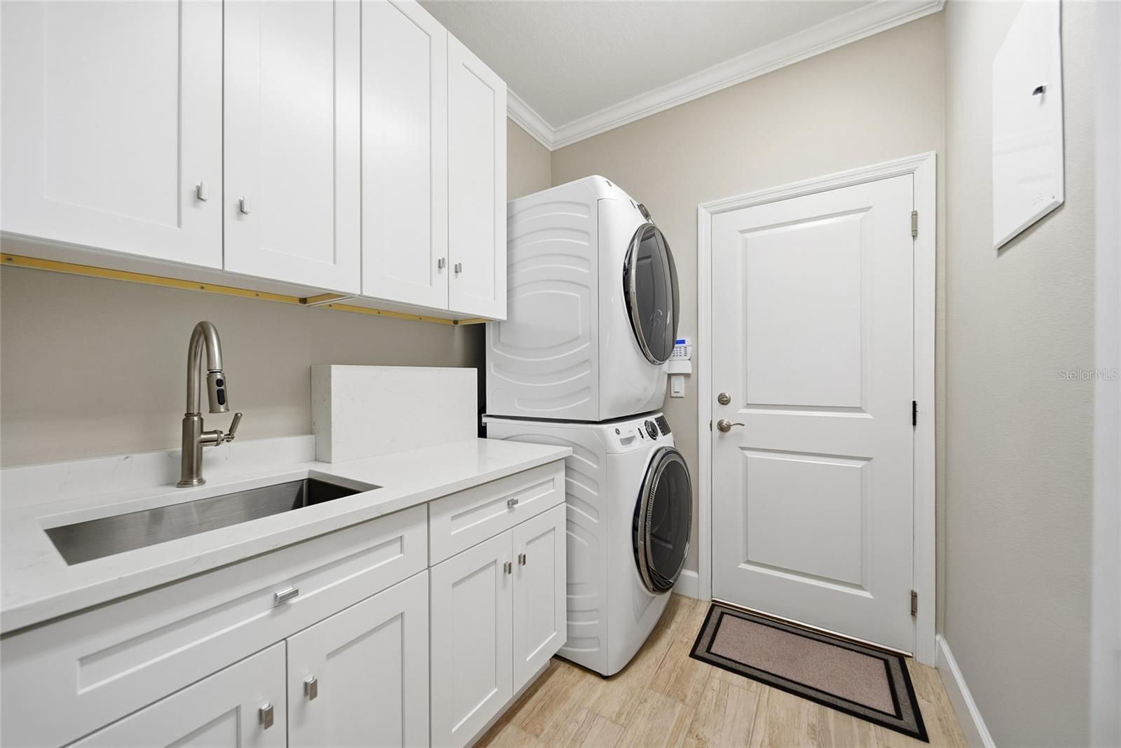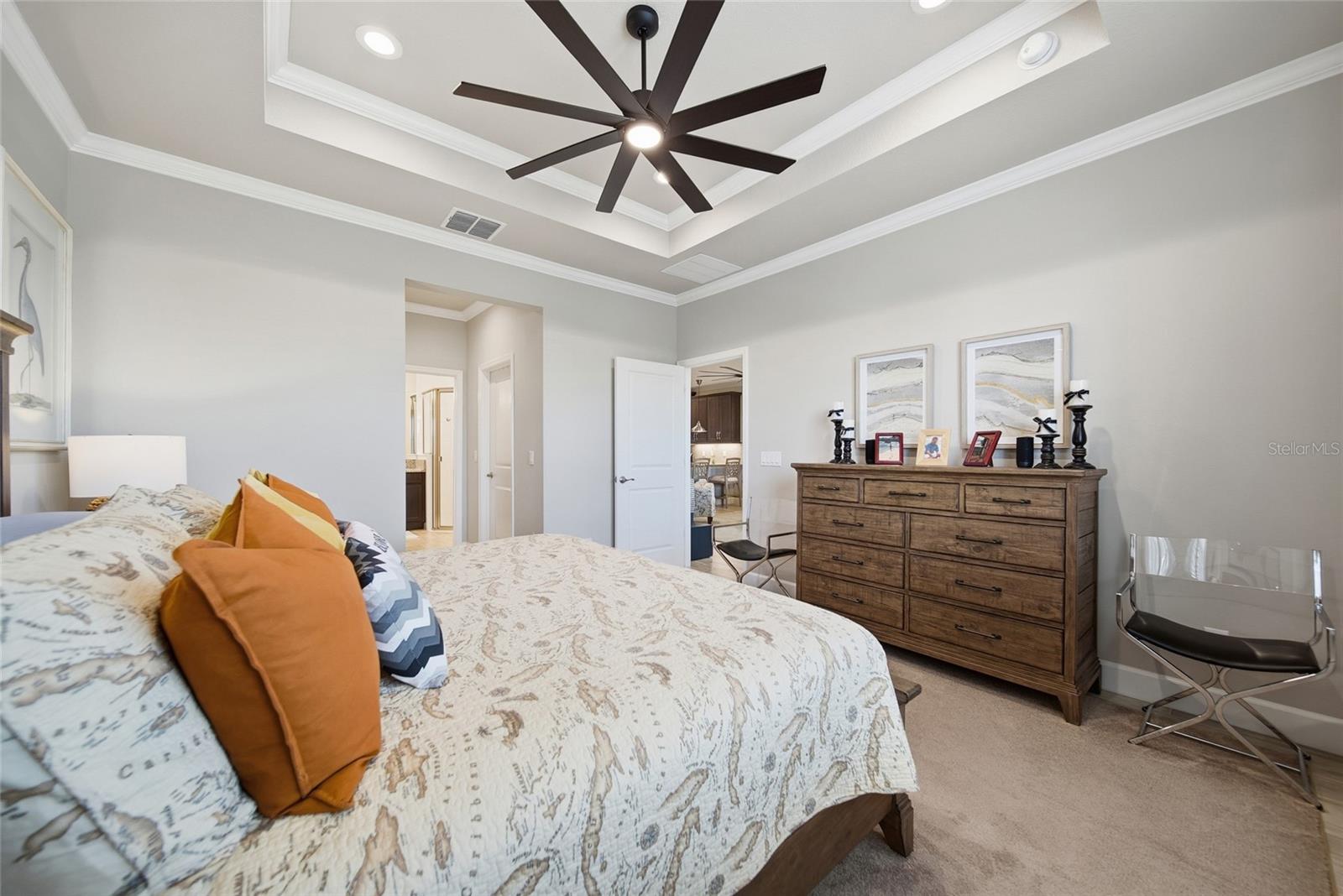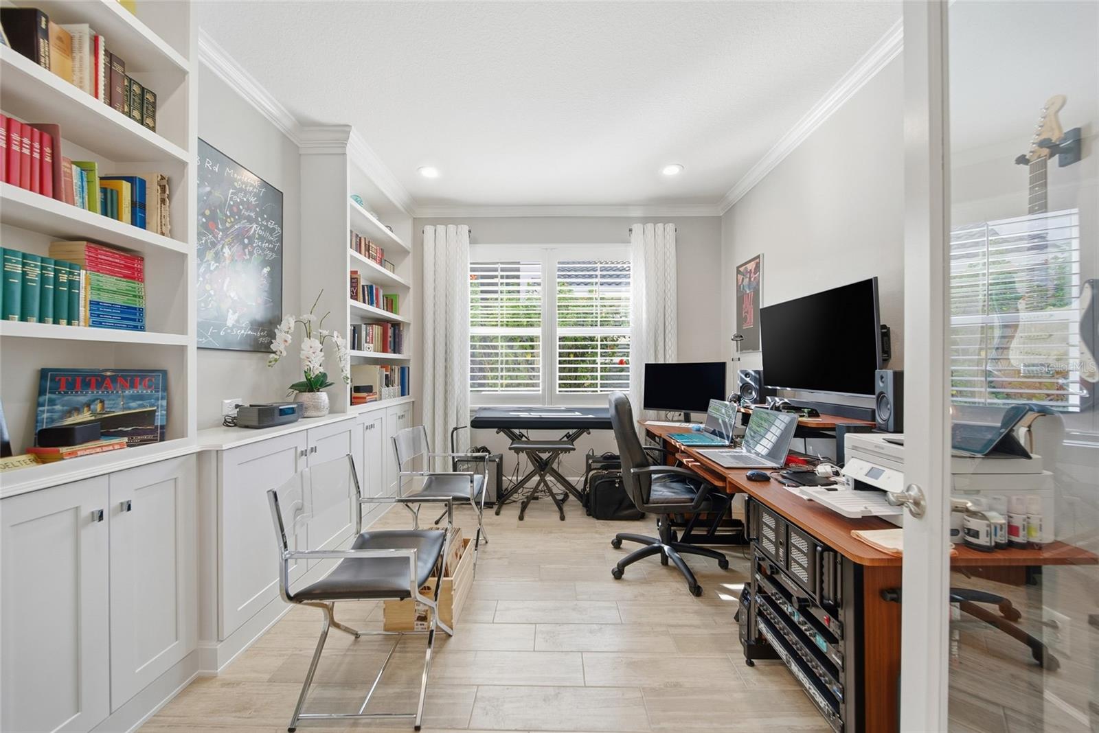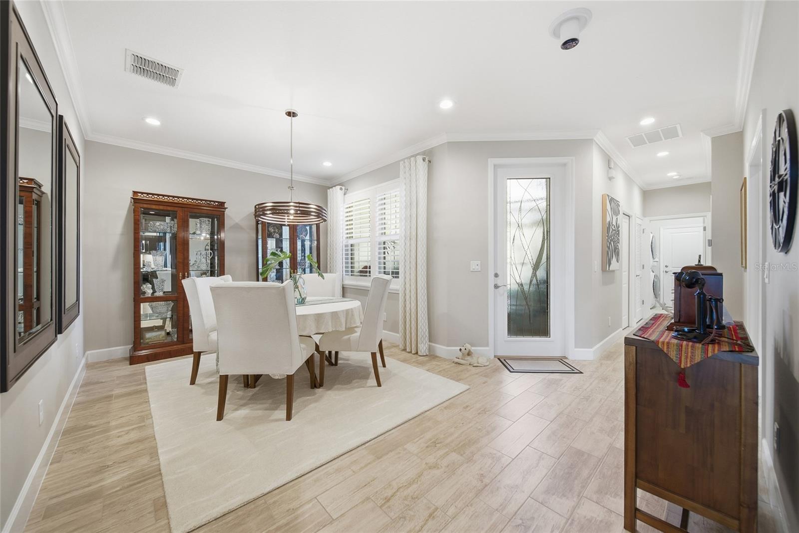 Enjoy effortless Florida living in this beautifully upgraded 2-bedroom, 2-bath villa with a den, ideally positioned on a tranquil water-view lot. Thoughtfully elevated with designer-inspired and upgradea, this move-in-ready home offers a perfect blend of comfort, functionality, and peace of mind in a low-maintenance setting. The open-concept layout is enhanced by upgraded tile flooring throughout, elegant crown molding, and a 7.2 surround sound system, creating an inviting atmosphere for everyday living and entertaining. The kitchen and laundry areas feature custom cabinetry, cabinet organizers, and a stackable washer and dryer, maximizing storage and efficiency. The spacious primary suite provides a serene retreat, while the split-bedroom design ensures privacy for guests. A versatile den offers flexible space ideal for a home office, library, or additional sitting area. Additional interior features include plantation shutters, upgraded ceiling fans, a Culligan water softener, whole-house gutters, and a fully operational security system. Outdoor living is equally impressive with a screened front porch, an expanded paver patio, professional landscaping, a screened garage, and a screened lanai overlooking peaceful water views—perfect for morning coffee or unwinding at sunset. For added security and storm protection, new impact glass has been installed on all windows and rear sliding doors, providing comfort and confidence year-round. Residents of this vibrant community enjoy an exceptional array of amenities designed to support an active, low-maintenance lifestyle. The clubhouse features a bistro, fitness center, beach-entry pool, pickleball and tennis courts, bocce ball, game rooms, and organized social activities. Pet lovers will appreciate two conveniently located dog parks near the clubhouse. Ideally located just minutes from Gulf Coast beaches, premier shopping and dining, and Tampa International Airport, this home offers the perfect balance of relaxation, recreation, and convenience. Truly move-in ready and thoughtfully upgraded—this villa is ready to welcome you home.