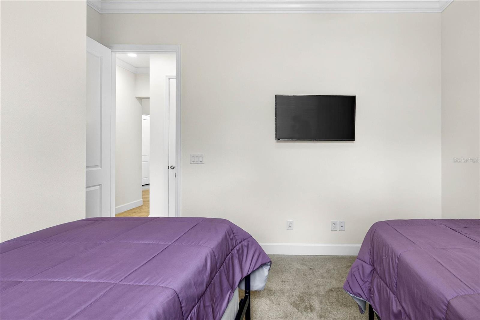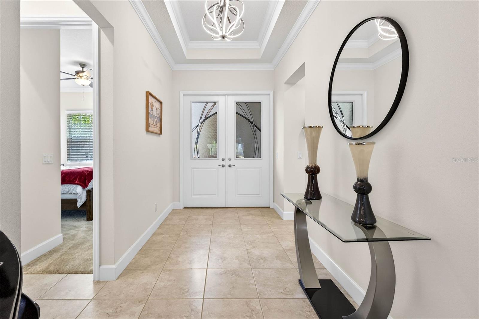 This barely lived-in Palazzo model is offered partially furnished, including custom window treatments, and truly shows like a model home. Built in 2022 by GL Homes beyond current building codes, this quality block-constructed residence features a durable tile roof and offers 4 bedrooms, 3 baths, a 3-car garage, and 2,191 sq. ft. of living space with tranquil water and conservation views. Curb appeal is enhanced by decorative landscape borders, an upgraded paver driveway and walkway, and a screened entry that allows for refreshing cross breezes. Grand double doors with decorative leaded glass open to an elegant interior showcasing coffered ceilings, crown molding, and 5¼” baseboards throughout the entry, family room, and primary bedroom. The family room is further elevated by a custom-built entertainment wall, while high-quality lighting fixtures and ceiling fans are found throughout the home. The gourmet kitchen features granite countertops, stainless steel appliances, a gas range, wood cabinetry with crown molding, glass tile backsplash, under- and over-cabinet lighting, and stylish pendant lighting. The spacious primary suite overlooks the pond and includes walk-in closets, dual vanities, a separate shower with upgraded accent tile, and a private water closet. Enjoy outdoor living on the extended screened lanai, partially under roof and equipped with sun shades for TV viewing, plus ample open space to take in the peaceful pond and conservation views. The lanai is stubbed for a grill and sink, perfect for entertaining. Additional highlights include a water treatment system, washer, dryer, and laundry sink. Located in Valencia Del Sol, the premier 55+ active community in the greater Tampa area, residents enjoy resort-style amenities including a heated pool, tennis and pickleball courts, dog park, and an impressive clubhouse with a grand social hall, fitness center, card rooms, café, clubs, shows, and more. Ideally situated near Tampa, St. Petersburg, and Sarasota, this home offers the ultimate in Florida living—move right in and live like you’re on vacation every day. Items remaining if desired -