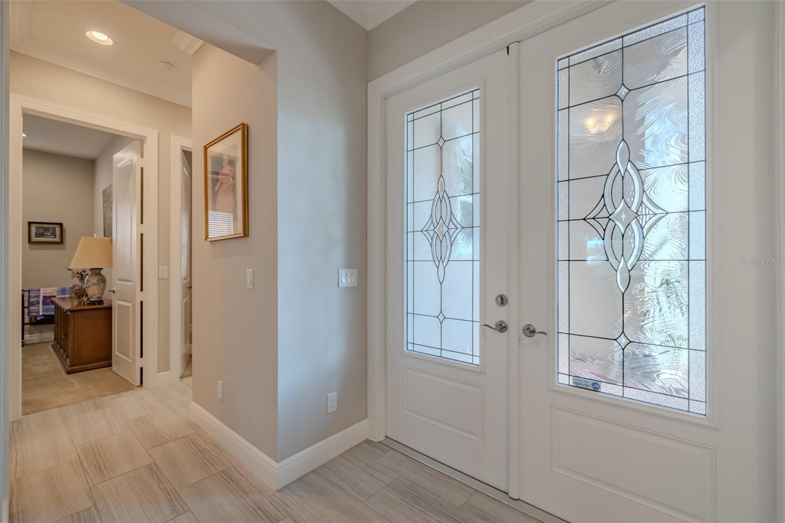 Florida friendly gardens set the tone as you arrive via a large portico welcoming you to this impeccably appointed residence where double etched-glass impact-resistant front doors create a striking first impression. Inside, sophisticated 11”x22” tile in a waterfall pattern flows seamlessly throughout the home enhancing both style and continuity. This 2017 GL Homes built Palazzo features 2275SF under A/C with 3 bedrooms, an office/den, 2.5 bathrooms and a 2.5 car garage, perfect for the golf cart! A versatile office/den is introduced through double doors and bathed in natural light from two expansive windows complemented by custom drapery, recessed lighting, and a designer lighted ceiling fan. Guests are well accommodated with a nearby half bath and a full-height linen cabinet blending convenience with plenty of storage Privately positioned at the east wing are guest bedroom’s one & two which offer comfort and tranquility featuring generous windows, window blinds, recessed lightings, and lighted ceiling fans. An additional guest bath is positioned conveniently by both bedrooms. To the right of the foyer is a spacious laundry room featuring a GE Washer and dryer, a large cabinet utility sink and custom overhead cabinets. Entertain in the sunlit formal dining room adorned with custom drapery, a large picture window, and a Hampton Bay brushed-steel chandelier adding understated sophistication. At the heart of the home the gourmet kitchen impresses with quartz countertops, a striking glass tile backsplash, reverse osmosis water system, 42” custom solid maple cabinets, custom sliding & pull-out cabinetry, and an expansive pantry.The Dinette comfortably seats four persons providing a commanding view of the water and has a considerable 5-door cabinet pantry replete with sliding shelves. Premium GE stainless steel appliances including dishwasher, microwave, refrigerator, & range complete this culinary space. The great room is a true showpiece featuring a dramatic 10-to-11’ tray ceiling with double crown molding, a 72” Emerson Aira brushed lighted ceiling fan, recessed lights, & custom drapery framing expansive 12-ft sliding glass doors that open to the lanai/screen room with an awe-inspiring water view. Designed for effortless indoor-outdoor living, the extended L-shaped lanai provides an ideal setting for entertaining or quiet relaxation while overlooking tranquil pond views. The primary suite is a private sanctuary highlighted by three large bay windows, custom drapery and blinds, tray ceiling, recessed lighting, and a lighted ceiling fan.The room features two generous walk-in closets and a very large spa-inspired en-suite bath featuring two separated vanities with quartz counters capped by wall-to-wall mirrors, a large walk-in shower and a Water-Closet for the commode. Storage is plentiful with abundant cabinetry & a separate linen closet. Environmental comforts include accordion hurricane shutters, full house gutters, AO Smith water heater, water softening system + whole home filter, 3.5 Ton Heat Pump, and ADT monitored home security. The spacious garage features an epoxy-finished floor, custom cabinetry, and dual overhead storage racks. Every detail of this exceptional home reflects timeless style, superior craftsmanship, and elevated living. Seize the day and begin to live your idyllic life in this exceptional home located in Valencia Lakes, Tampa Bay’s premier 55+ Active Adult Community.
