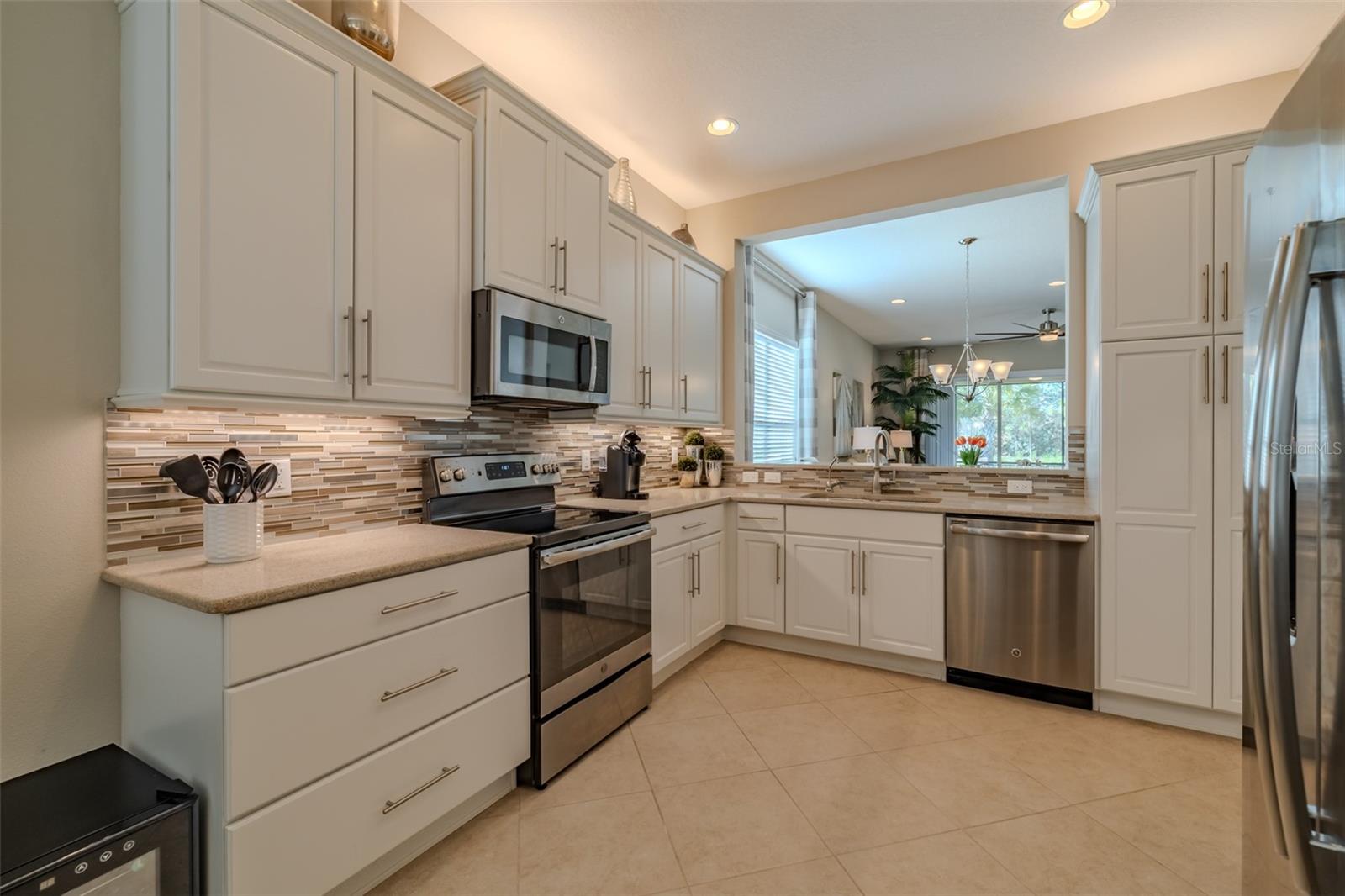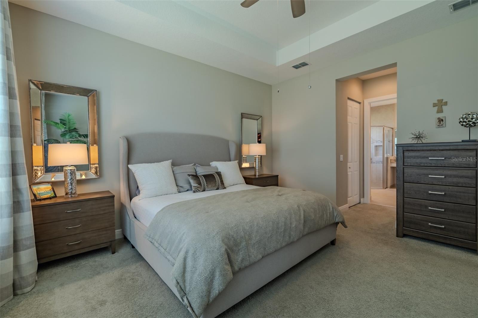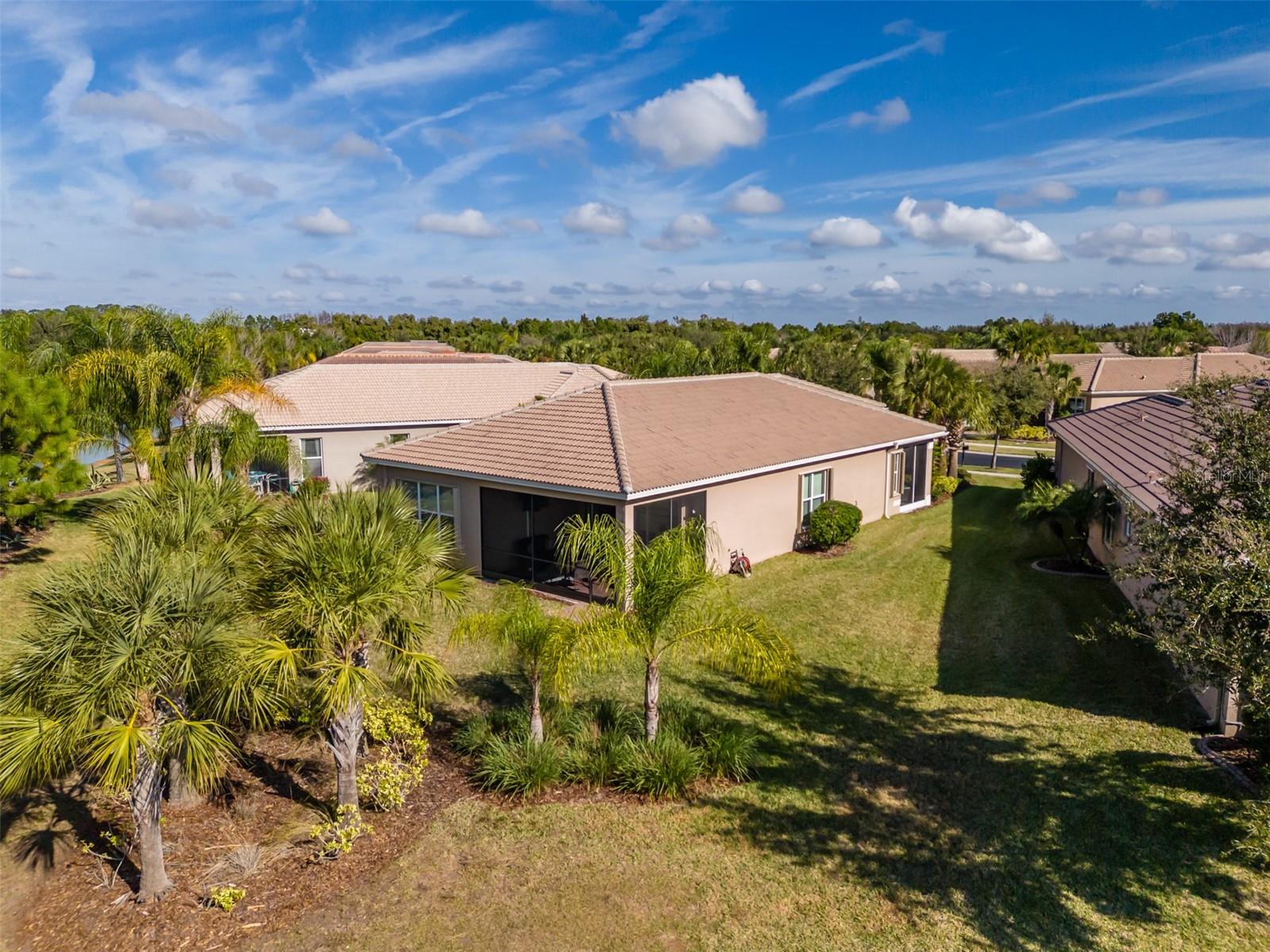 PRICE REDUCED - RESORT LIVING AT A BETTER VALUE! Are you ready for this? Located in Valencia Lakes, Tampa Bay’s premier 55+ Active Adult community, this beautiful CAPRI model with 1870SF, offers three bedrooms, a wonderful open floorplan with an offset water view, and it’s in pristine move-in ready condition. The screened in porch affords a great private space to relax out front and take life in stride. Solid double French doors provide wide access, when desired, to a welcoming Foyer, with its airy 13’ tray ceiling, that provides an impressive view of the open floorplan beyond. 18”x18” ceramic tile on the diagonal capped by 5 ¼” baseboards grace the floors except in two of the three bedrooms which are carpeted. Bedroom 2 is carpeted and lies at the front of the house and provides exceptional comfort and privacy and it features a Design House LEXI 52” LED ceiling fan with satin nickel finish. Bedroom 3 is centrally located in the house and has French double doors, a 6’-wide window, ceramic tile, 4 recessed lights, and a Generation Lighting DISCUS CLASSIC 52” LED ceiling fan. Bedroom 3 also has a closet, but you might decide to use this space as an Office or a Den. Having options is always good, right? The carpeted Primary Bedroom with its 10’-11’ tray ceiling is very generously sized, and its 9’-wide window provides abundant natural light and stunning sunset views. Beyond the two walk-in closets is a beautiful Ensuite Bathroom with two separated quartz vanities, a large walk-in shower with a privacy glass window, and a Water Closet for the commode. The Kitchen is well appointed with a 4’-wide cabinet Pantry with four sliding shelves, GE Profile Stainless Steel appliances, a double sink with a Reverse-Osmosis faucet, solid wood cabinetry including three pot drawers, and substantial oatmeal quartz counters capped by a gorgeous mosaic glass backsplash. And, this Kitchen is big enough for the Sous-Chef too. The adjoining Dinette will be the perfect space for daily or intimate meals. Forward of the Kitchen is a Dining Room that will comfortably accommodate 10 persons. The Great Room anchors the home, and it features a Matrix DÉCOR 72” brushed chrome ceiling fan and 12’ sliders lead to the Lanai. It’s spacious, bright and comfortable. The screened-in Lanai is a great space for outdoor living with its secluded location and beautiful offset water view. The 20’x20’ garage features luxury epoxy floors, two 4’x8’ overhead storage racks, and a Culligan Water Softener system. Accordion shutters are fitted on all windows making storm prep a breeze. Beyond your front door, Valencia Lakes offers a vibrant, resort-style lifestyle centered around a spectacular 40,000 sq.ft. clubhouse featuring live entertainment, dances, 100+ clubs and a newly renovated Cafe. Residents enjoy 7 pickleball courts, 6 lighted Har-Tru tennis courts, softball field, bocce, shuffleboard, basketball half court, miles of walking paths, craft studios, card and billiards rooms, community garden, dog park, resort-style pool, resistance and lap pools, sauna and steam rooms, and a 5,000 sq.ft. state-of-the-art fitness center with varied choice of professional classes if desired. Conveniently located near Tampa, Sarasota, & St.Petersburg, with exceptional shopping, medical facilities, and some of Florida’s most beautiful beaches just a short drive away. This home offers not just a place to live—but a lifestyle to embrace.