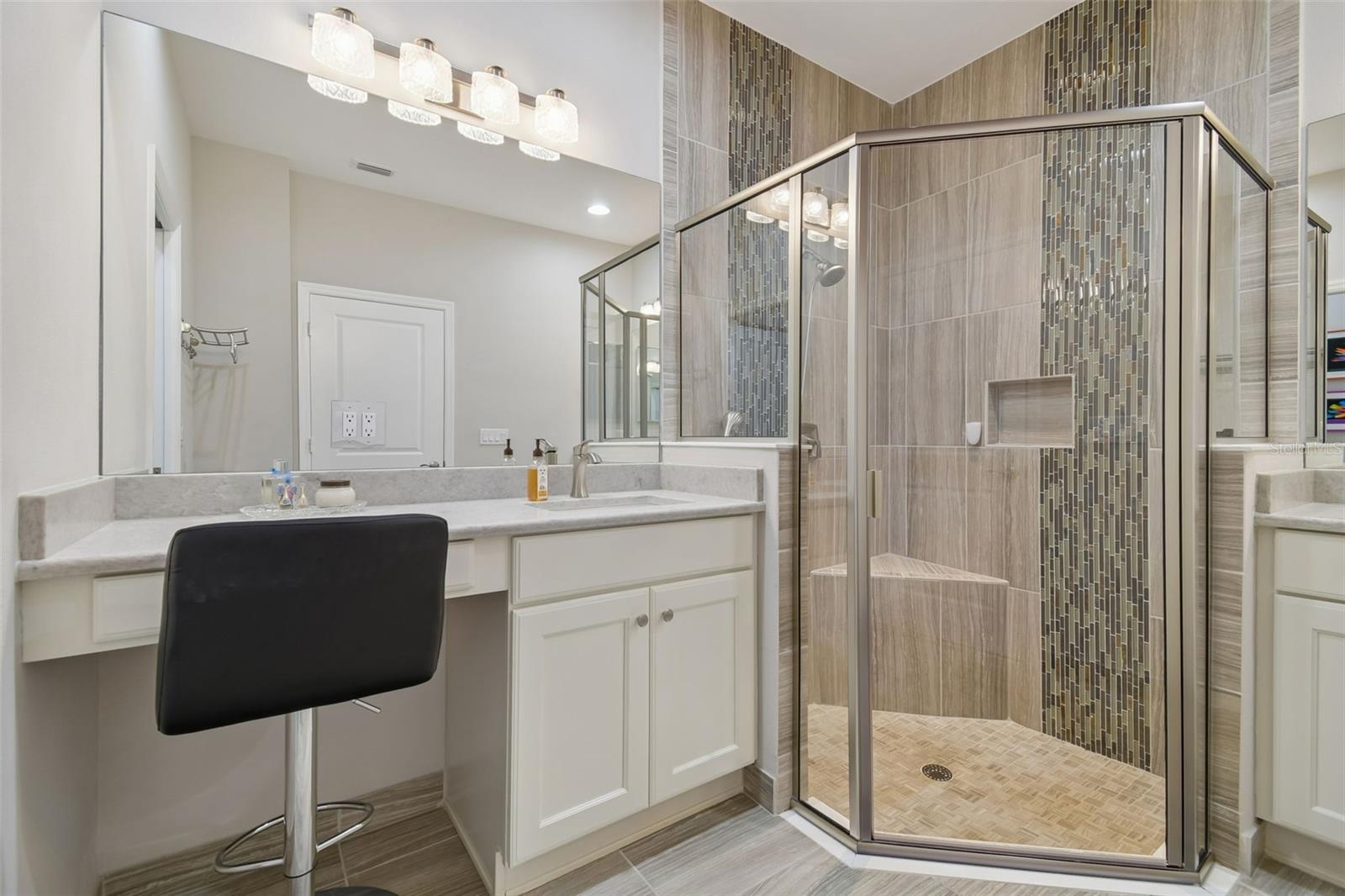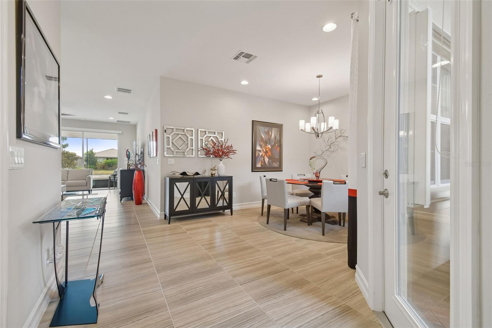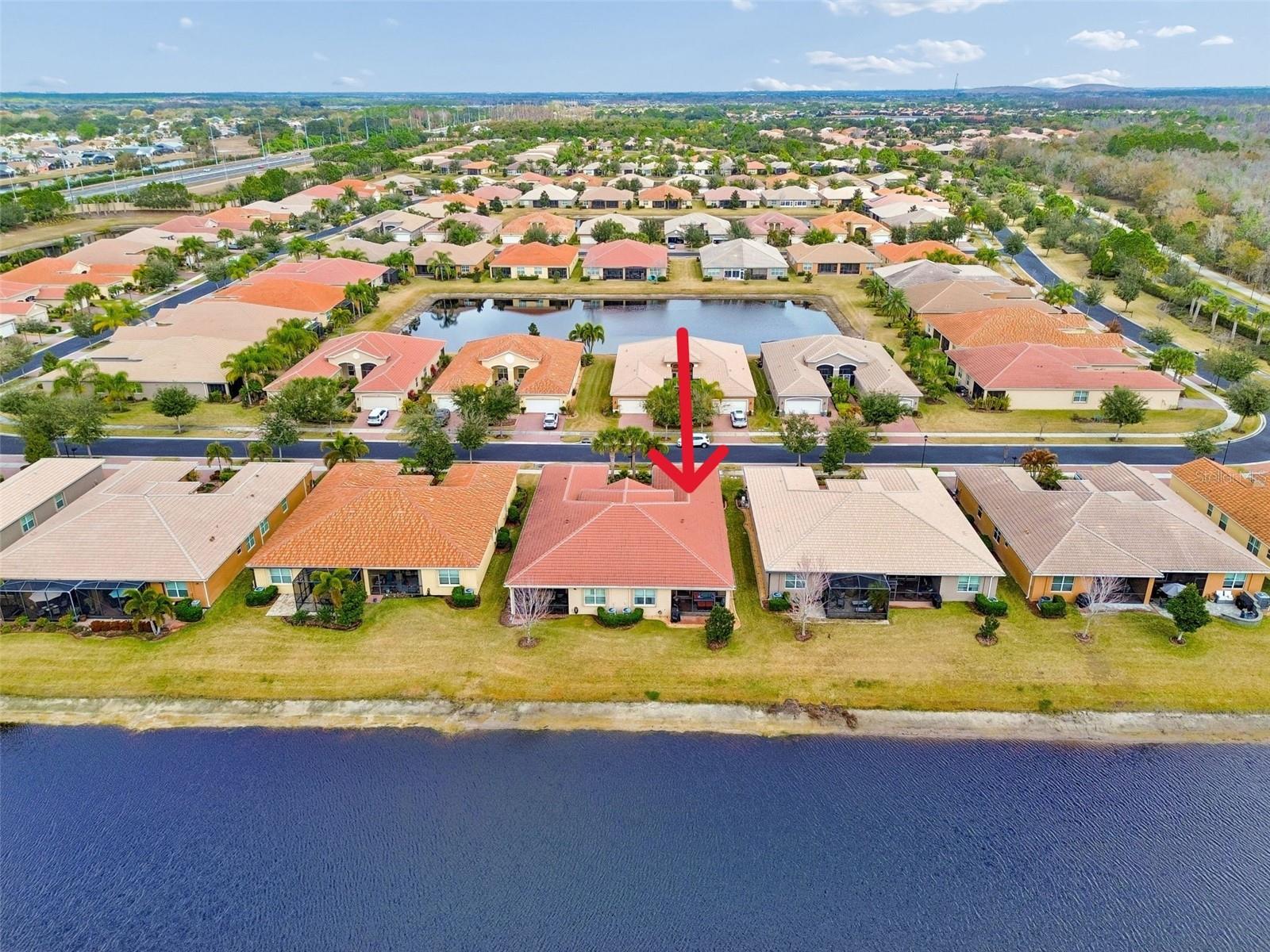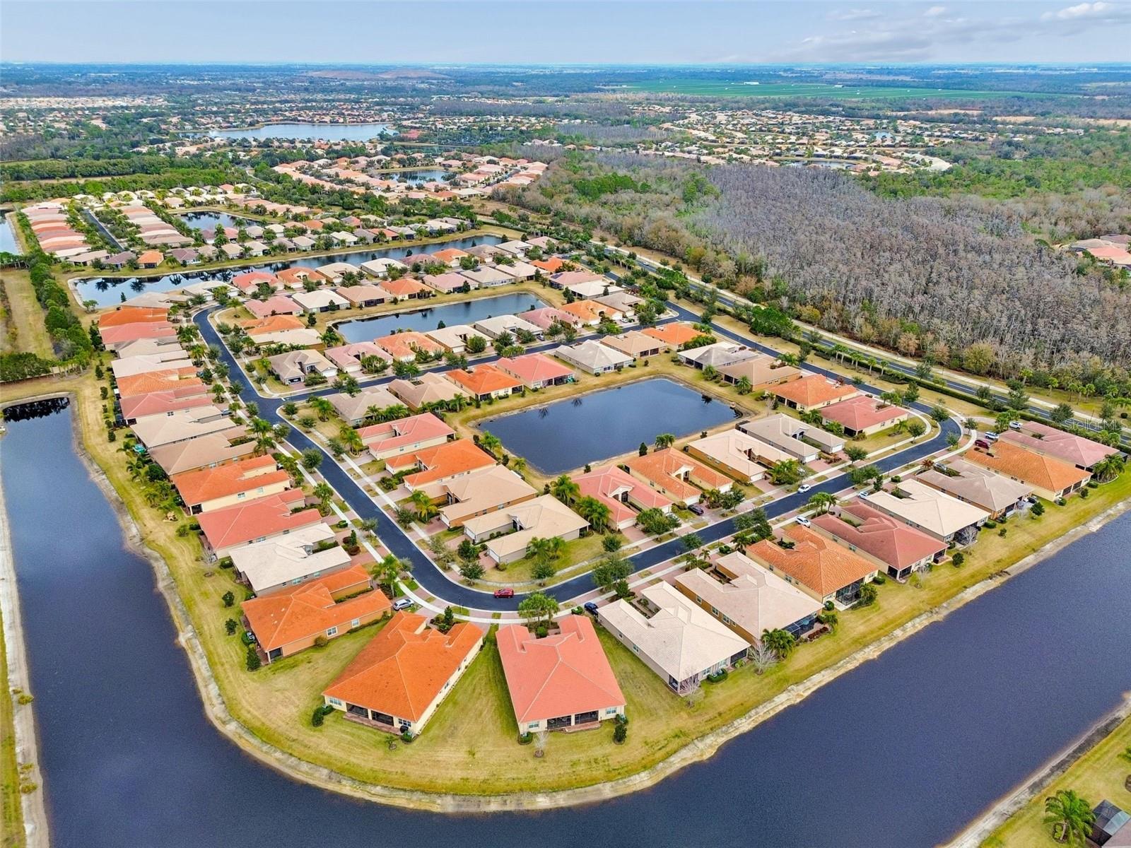 It is extremely rare to find a Nantucket villa model in Valencia Lakes! It is a part of GL HOMES Regal Twin Villas Collection and it is only available in the newest section of this incredible 55+ community. This inviting, functional home – built on a prime lot with water views – will win you over. It features 2 bdrms, 2 full baths, den/3rd bdrm, 2-car garage and a modern, chic and sophisticated look of a model home. Back of the house provides a serene water view, and the front offers a lush curb appeal enhanced by ornamental pavers running on the side of the house. A large front patio is screened providing an additional private outdoor space to relax/entertain on lovely Florida days. Upon entering through the full panel impact glass front glass door, you are greeted with a spacious open floor plan with 9 ft. tall ceilings. 24/12 quarry tile floors are installed throughout all main areas and high quality carpet in primary and 2nd bdrm. Luxurious gourmet kitchen features upgraded white maple wood cabinets with crown moulding, upper and lower lighting, full extension drawer glide system with soft close drawers, pull-outs in lower cabinets and a custom built-in cabinet pantry, quartz countertops with an extended serving bar, modern metal brick mosaic backsplash, and exquisite top-quality stainless steel appliances. The kitchen opens to the great room, and an 8' tall sliding glass door leads to a screened private lanai with 4’ paver extension with a lovely water view where you can enjoy true Florida, observing birds and wildlife from the privacy of your home. Primary bdrm offers two generously sized walk-in closets with custom built-in shelving, coffered ceiling, a double vanity with undermount sinks and quartz countertops in in-suite bath, a separate walk-in shower, and a generous sized linen closet. There is a built-in corner bench in the shower for both comfort and mobility. Wall tiles are extended to the ceiling in both baths and are enhanced with vertical decorative listellos and a built-in niche. Bdrm #2 also has a walk-in closet with custom built-out shelving. All light fixtures have been updated including additional recessed lighting in all rooms. The laundry room features upper cabinets for storage and there is a utility sink conveniently located in the garage. Wrapping-up the charm of this fabulous home are custom windows treatments and haiku remote control fans in 4 rooms and lanai. Other important features are: accordion shutters (2024) and in the garage: A/C and heat split unit, upgraded garage door and opener, overhead shelving, epoxy flooring and added GFCI outlets. To top it off, the home is equipped with front and rear gutters, water softener system, upgraded R-38 insulation in living areas and whole house surge protector.Valencia Lakes is a 55 and better active adult golf cart community, 40-acre waterfront outdoor recreation area with resort-style heated pool, lap and resistance pool, 40,000 sq. ft. clubhouse, deluxe Bistro coming soon, arts and crafts studio, har-tru tennis courts, gym, half-court basketball, pickleball, bocce courts, dog park, baseball park, community garden, hundreds of clubs and activities, RV/boat parking. Over 100 acres set aside as nature preserves; enjoy the quiet and solitude of peaceful views, birds & wildlife by the water. Great sense of community with great friendly neighbors. Tampa, St. Pete and Sarasota 30-45 minutes away. Close to the airport, medical facilities, shopping and golf.