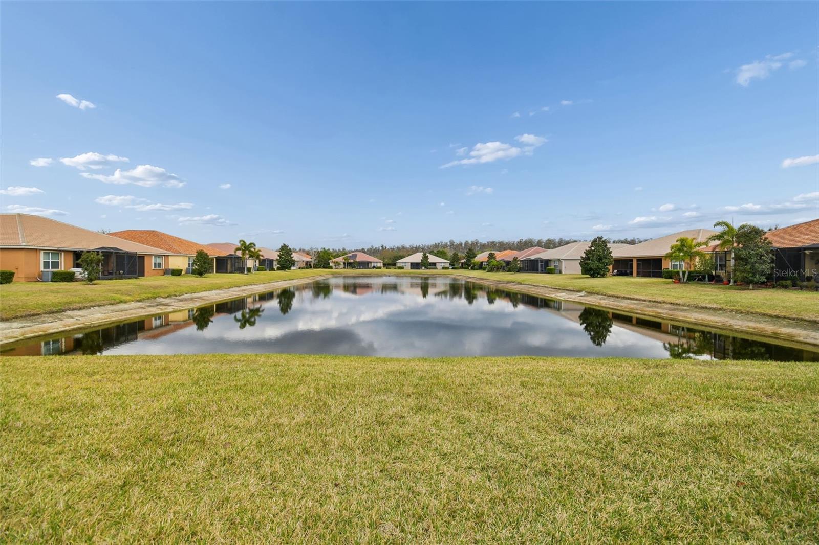 Welcome to this stunning Augusta model home, perfectly positioned to capture one of the community’s most serene and sought-after water views. Nestled along the extended side of the pond, this special location offers peaceful mornings filled with breathtaking sunrises and relaxing Florida breezes all year long. Step inside and feel instantly at home. The bright, open floor plan with soaring 9-foot ceilings and a split-bedroom design creates both comfort and privacy. With 1,800 square feet under air, this spacious villa offers 2 bedrooms, a versatile den or optional third bedroom, 2 bathrooms, and a 2-car garage — providing room to live, work, and entertain with ease. Beautiful 24x12 quarry tile floors flow throughout the main living areas and baths, while engineered hardwood adds warmth to the den. The primary and second bedrooms feature plush, well-maintained carpeting for added comfort. Elegant crown molding wraps the main living spaces, adding a refined touch throughout. The heart of the home is the large gourmet kitchen — designed for gathering and everyday enjoyment. Quartz countertops, an extended 18” serving bar for additional seating, and a stylish stone and glass horizontal mosaic backsplash create a space that is both functional and beautiful. Upgraded stainless-style appliances, 42” maplewood cabinetry with crown molding, under-cabinet lighting, 2 glass inserts in the upper cabinets, and a custom-built pantry provide both charm and convenience. The adjacent breakfast area is perfect for relaxed mornings and casual dining.Wake up each day in the spacious primary suite with calming water views. This peaceful retreat features a generous walk-in closet and a beautifully appointed ensuite bath with dual vanities, quartz countertops, and a walk-in shower adorned with floor-to-ceiling tile, glass/stone horizontal listello and a built-in bench for comfort. The quartz countertop in the 2nd bath is extended to feature the elegant ‘banjo’ style. A French door leads to the flexible third bedroom or home office, offering privacy and versatility to suit your needs. The living room opens through triple 8-foot sliding doors to a screened lanai with an extended paver patio — the perfect setting for outdoor dining, entertaining friends, or simply unwinding by the water with your morning coffee or evening glass of wine. Additional highlights include a large utility room with washer, dryer, sink, and extra shelving, a new 2024 HVAC system with a 10-year transferable warranty, epoxy garage flooring, an insulated garage door with upgraded belt-drive opener, and a water softener system. This home is more than beautiful — it’s a place to relax, gather, and truly enjoy the Florida lifestyle in comfort and style. Valencia Lakes is a 55 + active adult golf cart community with 40-acre waterfront outdoor recreation area with resort-style heated pool, lap and resistance pool, 40,000 sq. ft. clubhouse, deluxe Bistro, har-tru tennis courts, gym, half-court basketball, pickleball and bocce courts, dog park, baseball park, community garden, hundreds of clubs and activities, RV/boat storage area. Over 100 acres set aside as nature preserves; enjoy the solitude of peaceful views, birds & wildlife by the water. Great sense of community with great friendly neighbors. Please call for a private showing and experience this wonderful community for yourself. Tampa, St. Pete and Sarasota 30-45 minutes away. Close to the airport, medical facilities, shopping and golf.