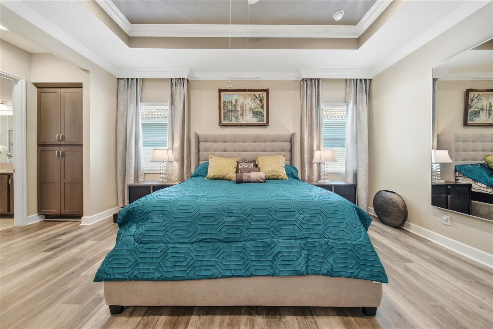 Welcome to Valencia Del Sol, where this Aruba model rarely hits the market. Set on a premium pond lot with northwest-facing views, you’ll enjoy glowing sunsets right from your living room and lanai. The open layout is filled with natural light, highlighted by high coffered ceilings and an entire wall of glass, a dramatic zero-corner sliding door system that spans nearly the full width of the home and fully opens, completely removing the barrier between indoors and out. The result is a bright, airy space with wide, uninterrupted water views that truly becomes part of how you live day to day. The kitchen is designed for both casual nights in and hosting, featuring granite countertops, a natural gas range, double oven, soft-close cabinetry, and a large island with added storage. The split floor plan offers privacy, with a standout primary suite featuring two walk-in closets and dual bathrooms, a rare and highly desirable setup, along with built-in closet systems in all bedrooms for added organization. A guest bedroom and flex space give you options for visitors or a home office. Step outside, pour a drink, and watch the sun dip over the water as the sky changes colors, this is where your evenings slow down. For added convenience, the home can be offered fully furnished, making for an easy, move-in-ready transition. Living here means access to a 25,000 sq ft clubhouse, resort-style pool with lap lanes and cabanas, fitness center, tennis and pickleball courts, an on-site restaurant with outdoor bar, dance studio, billiards room, catering kitchen, and a full calendar of events, creating a lifestyle where there’s always something to do, people to connect with, and ways to stay active, all within a guard-gated community designed for effortless, everyday enjoyment.