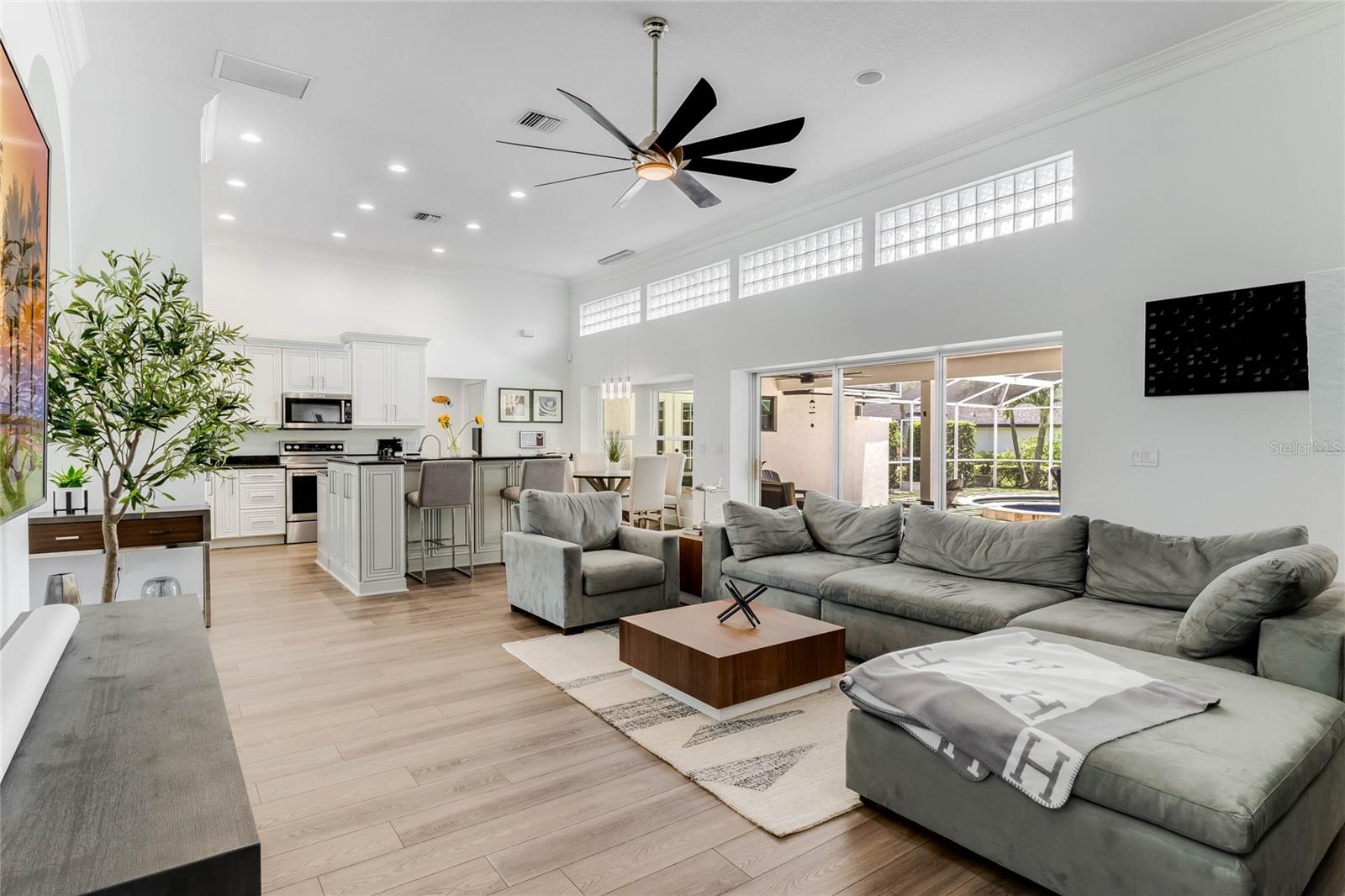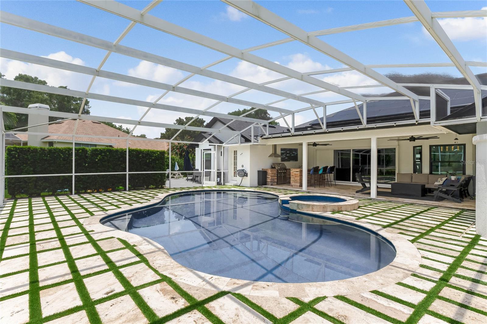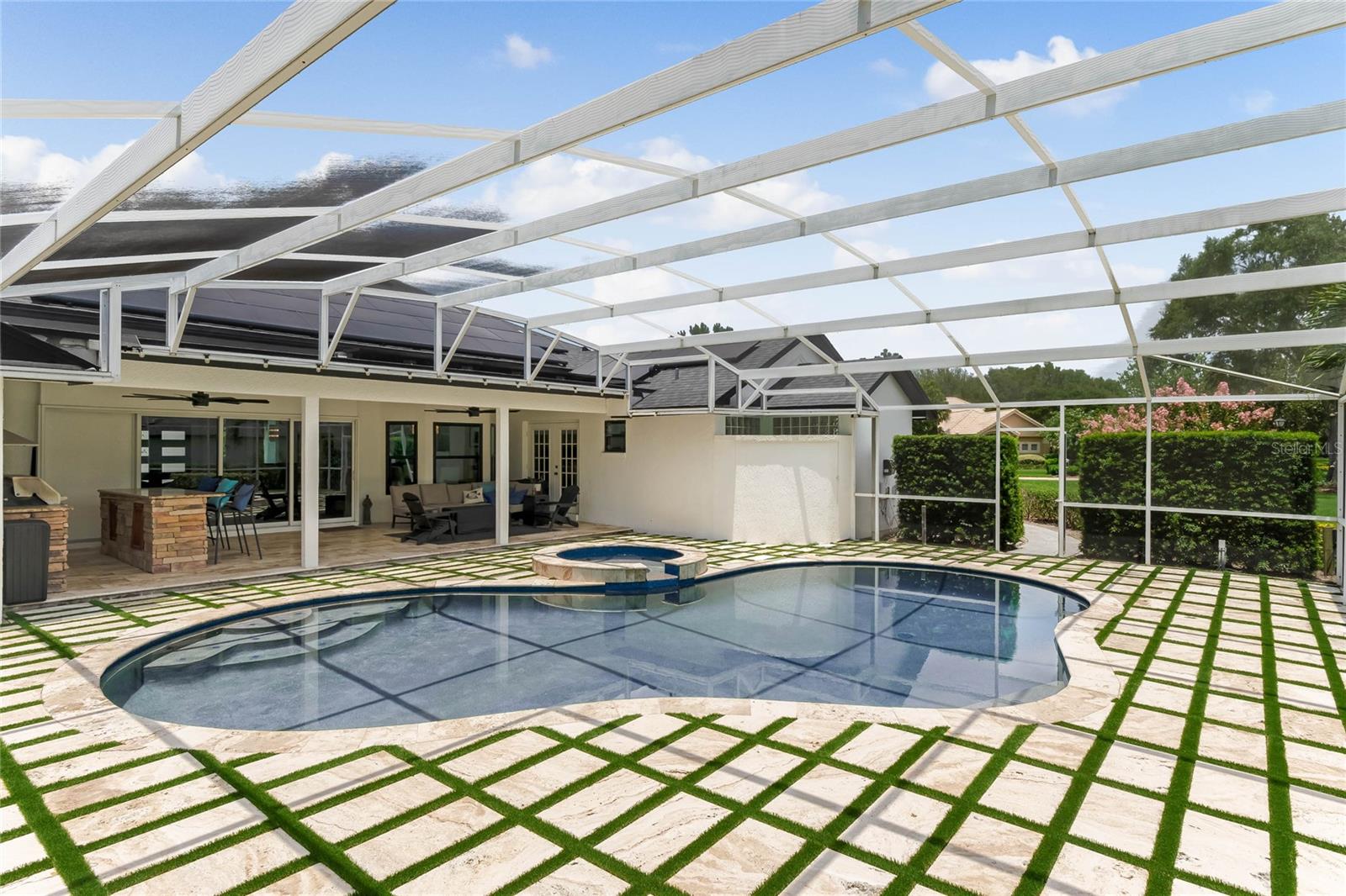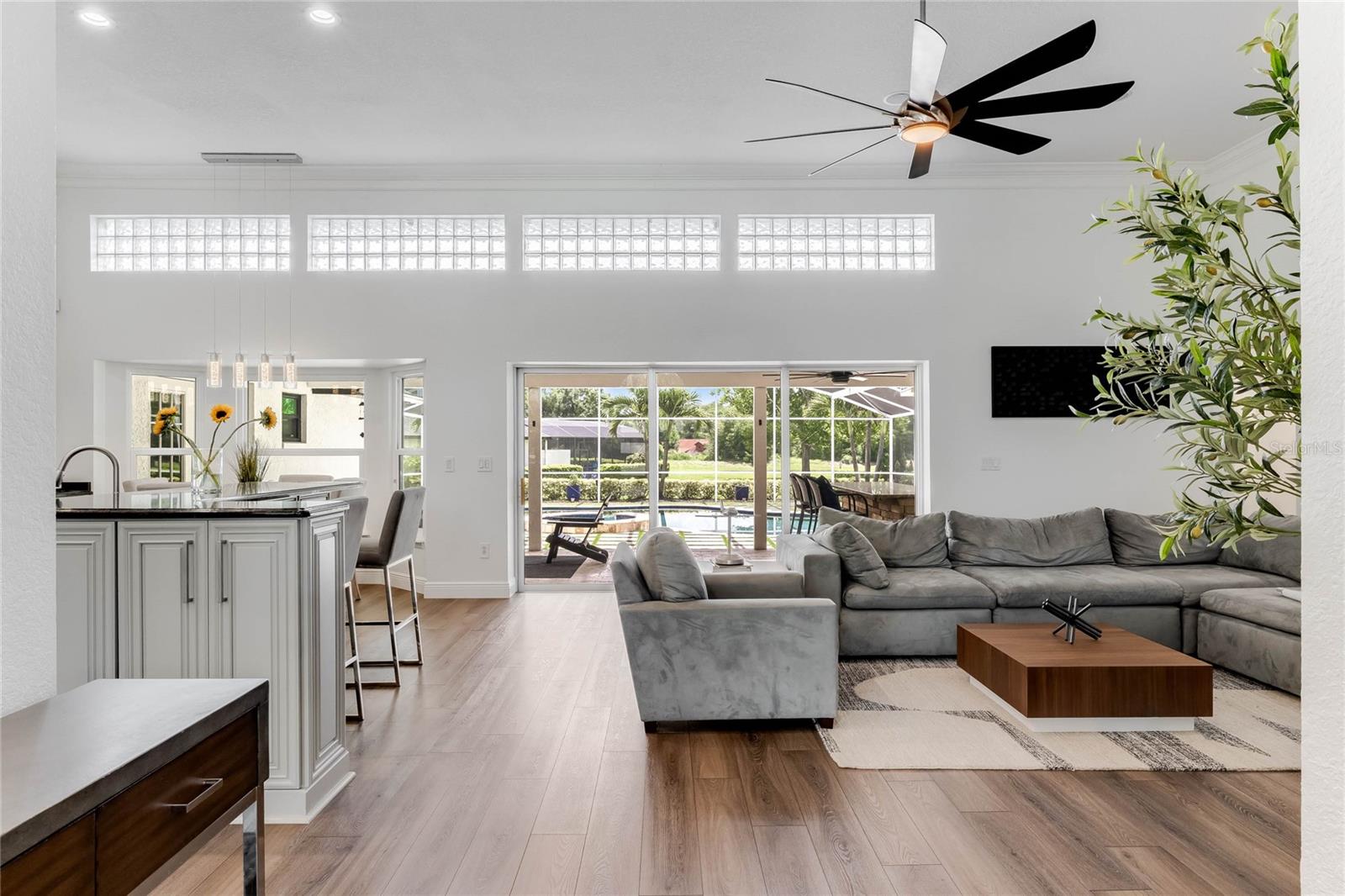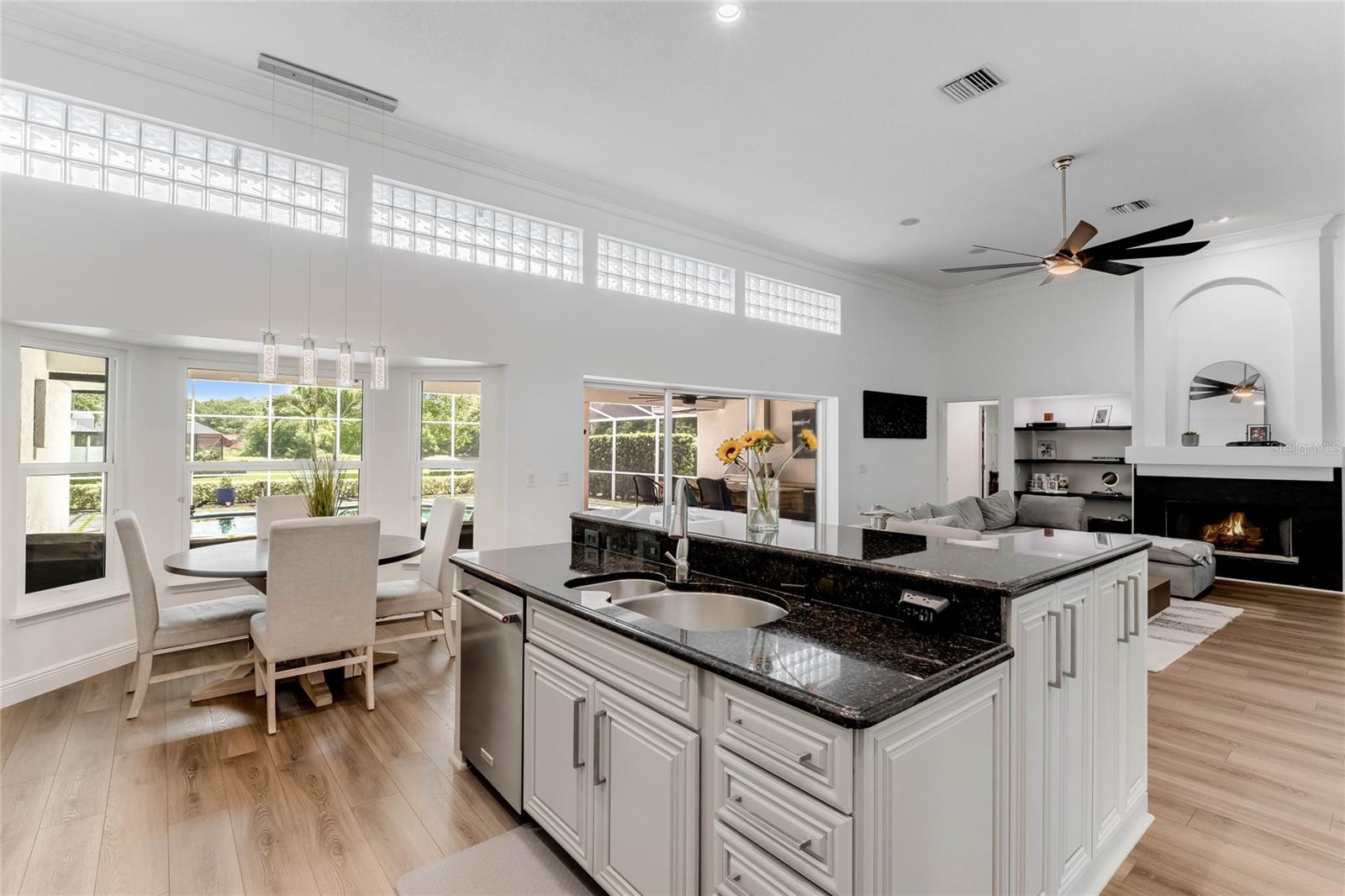 This custom-built home radiates charm and sophistication. Positioned on a generous corner lot of nearly 3/4 acre, it showcases a new architectural shingle roof, a 3-car garage with a paver circular drive, and impeccably landscaped grounds. With picturesque views of a pond adorned with an illuminated fountain in the front and a tranquil greenbelt in the rear, this executive residence offers unparalleled privacy and peace. Inside, the recently updated kitchen boasts granite countertops, wood cabinets, stainless steel appliances, and elegant luxury vinyl flooring that seamlessly flows into the family room. The entire home has been freshly painted and outfitted with new lanai screening, ensuring a move-in-ready experience. The lanai, featuring a sparkling pool and soothing spa, provides an idyllic retreat for relaxation and entertainment. The master suite serves as a serene sanctuary, featuring a roman-style walk-in shower and picturesque views overlooking the lanai and pond. Nestled in the highly sought-after Willows at Lake Rhea neighborhood, residents enjoy access to amenities such as scenic walking paths, a playground, and tennis courts. Conveniently located near Windermere Elementary School and local ball fields, this home harmoniously blends luxury with convenience—a remarkable opportunity for discerning buyers in search of a distinguished lifestyle.