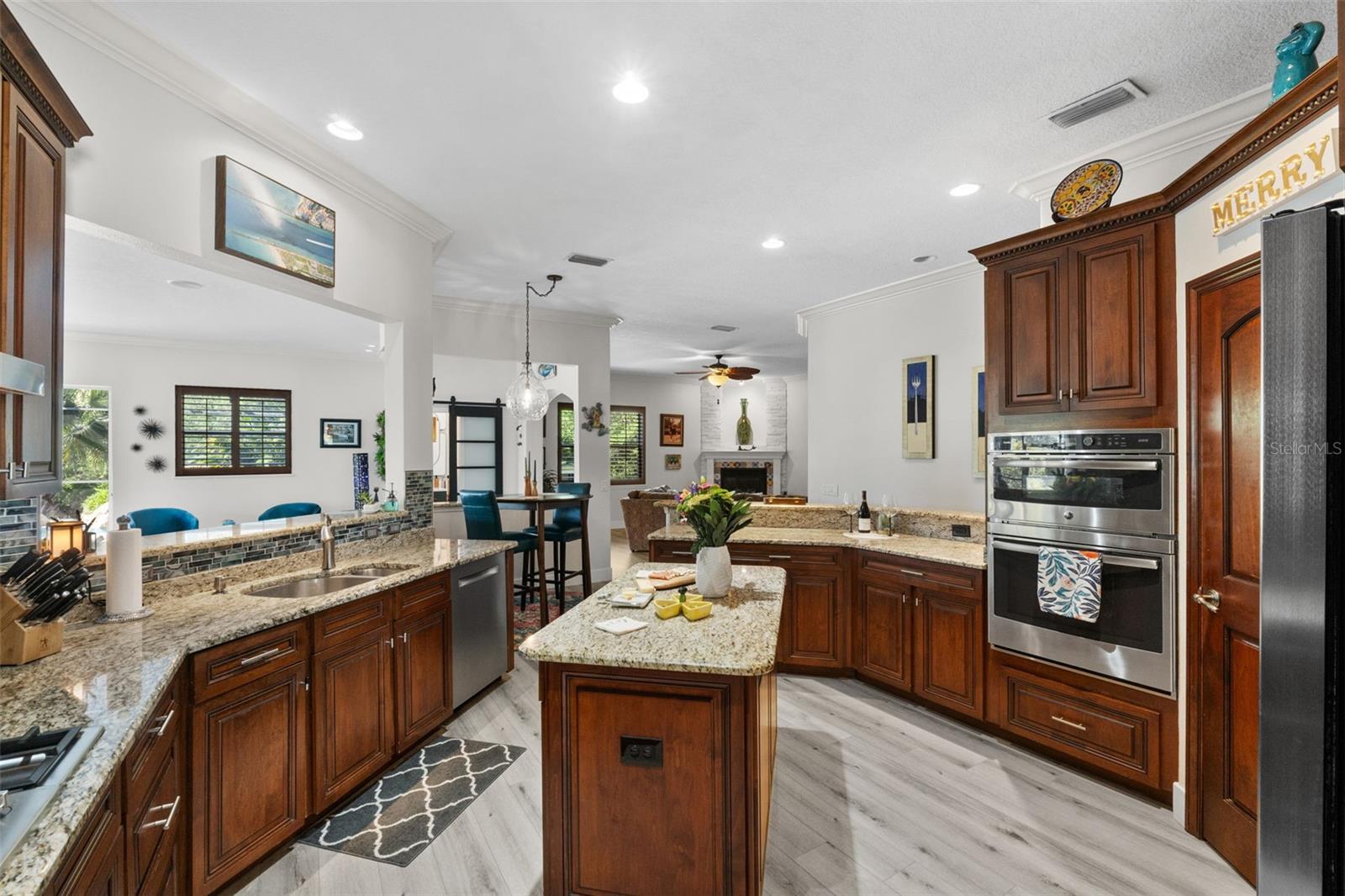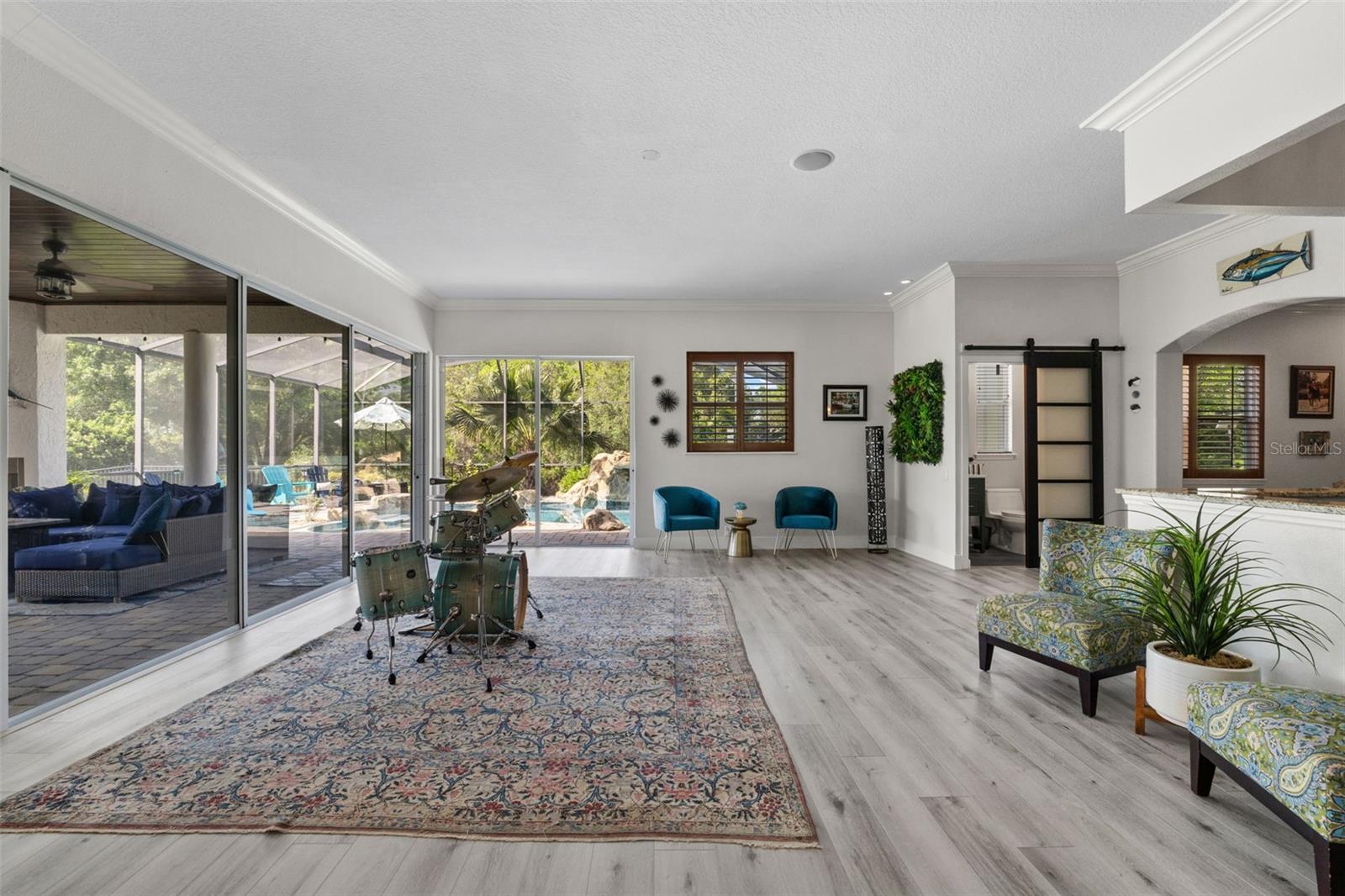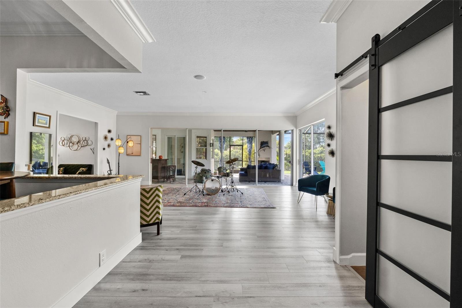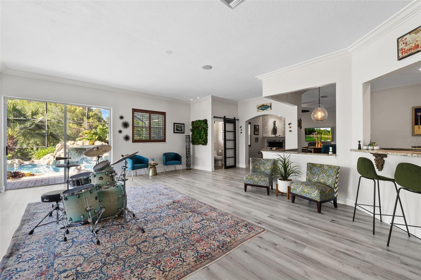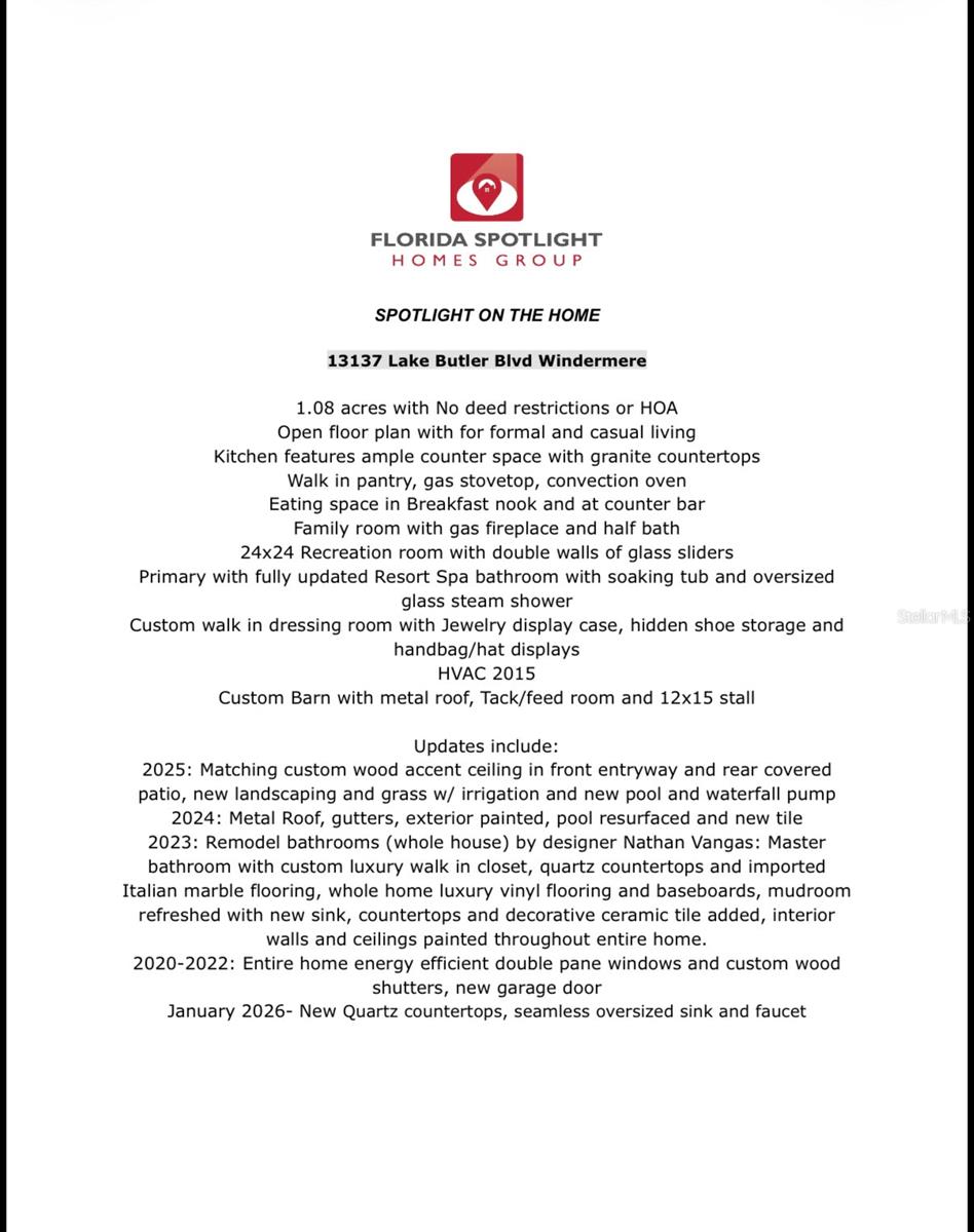 Kitchen refresh...Quartz countertops, seamless oversized sink. A kitchen designed to gather, host, and impress. Welcome to a private Windermere estate where thoughtful design meets relaxed luxury—set on over an acre with no restrictions. This beautifully updated 3-bedroom, 3.5-bath home offers space, privacy, and versatility, all surrounded by natural beauty. Enter through oversized double wood doors into an airy interior with soaring gable ceilings and an intentional split floor plan that balances openness with privacy. Whether you’re entertaining or unwinding, the home flows effortlessly from one space to the next. The primary suite is a true retreat, featuring a spa-inspired bathroom with soaking tub, oversized glass shower, and a custom-designed walk-in closet that feels more like a private boutique—complete with dedicated shoe storage, display showcase, and generous hanging space. At the heart of the home, the refreshed kitchen anchors everyday living and entertaining. Quartz countertops, a seamless oversized sink, center island with bar seating, walk-in pantry, and breakfast nook open seamlessly to the great room with gas fireplace and serene backyard views—ideal for hosting or quiet evenings in. A standout feature of the home is the expansive recreation room, offering incredible flexibility. With walls of sliding glass doors and abundant natural light, this space adapts easily to your lifestyle—whether as a media lounge, creative studio, or elegant entertaining space—flowing directly to the resort-style pool and outdoor living area. Outside, the backyard feels like a private resort. The pool features a waterfall and grotto, surrounded by a paver-lined deck and covered patio—perfect for sunset gatherings, weekend brunches, or peaceful mornings overlooking the adjacent nature preserve. With no rear neighbors, privacy is unmatched. The detached stable adds exceptional value and versatility. While currently equipped with a tack/feed room and 12x12 stall, the structure can easily be reimagined as a studio, guest casita, home office, gym, or backyard retreat—offering endless possibilities to customize the property to your lifestyle. Additional highlights include split plan with two additional bedrooms, with one large enough to be a second primary, an oversized garage with tall ceilings and side entry, circular driveway with dual gates, RV and boat parking with electric hookup, and riding-friendly neighborhood access. Lake Butler is just minutes away for boating and water activities. Recent updates reflect a strong commitment to quality and design: new metal roof, new gutters, exterior paint, pool resurfacing, updated tile and pumps, refreshed landscaping and irrigation, remodeled bathrooms by designer Nathan Vangas featuring imported Italian marble and quartz countertops, luxury vinyl flooring throughout, custom primary closet, energy-efficient windows, custom shutters, and fresh interior paint. Conveniently located near SR-429, the Florida Turnpike, and FL-408, this Windermere property offers a rare blend of privacy, flexibility, and modern style—an ideal place to live beautifully, entertain effortlessly, and create a home that truly reflects you.