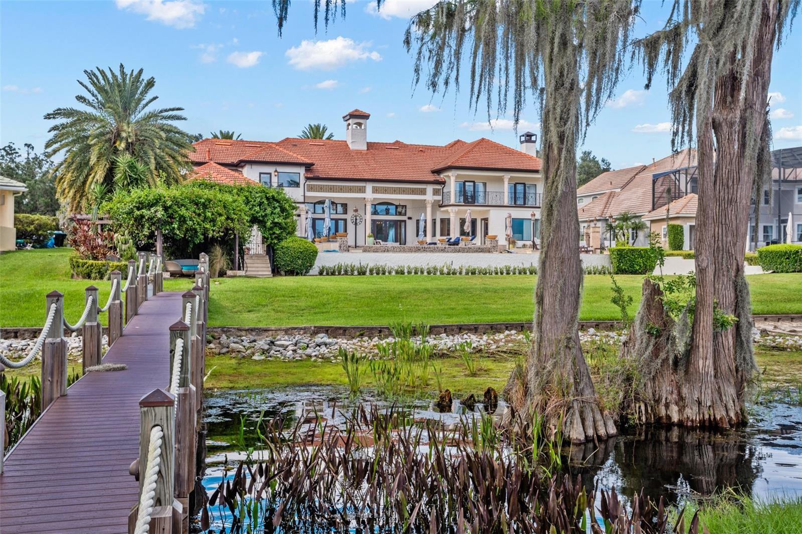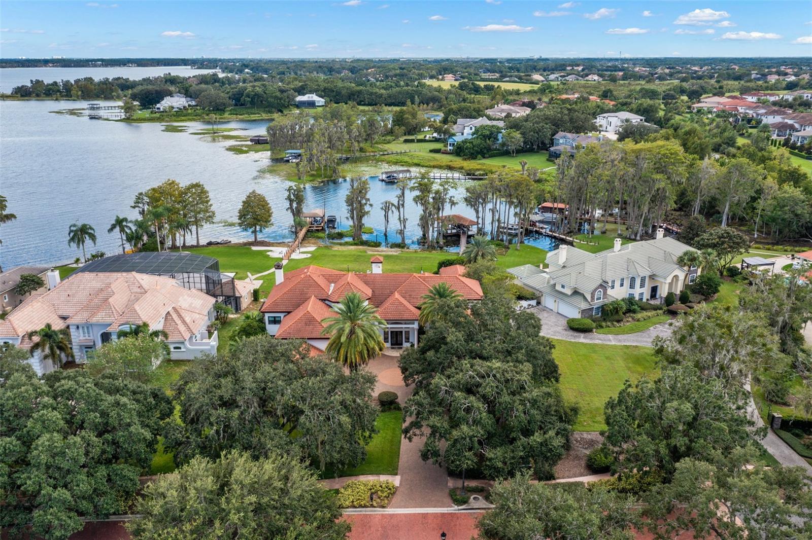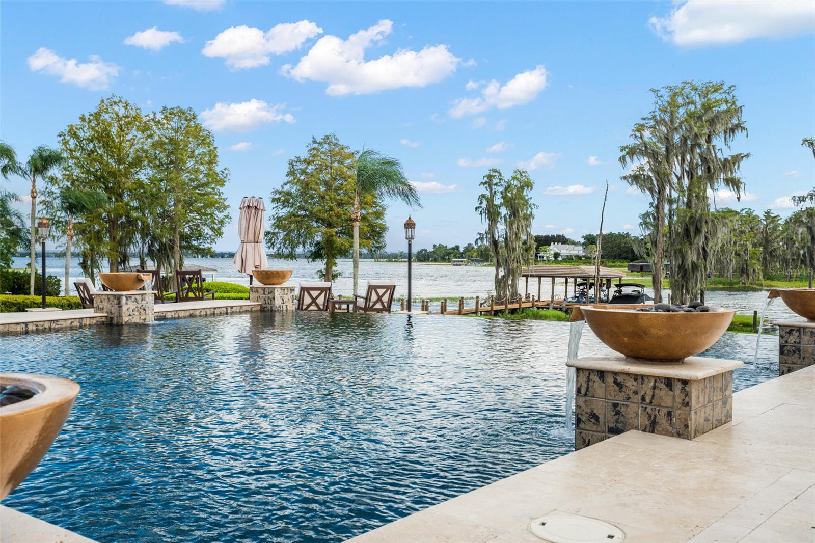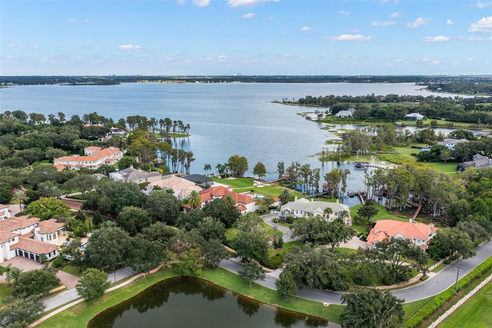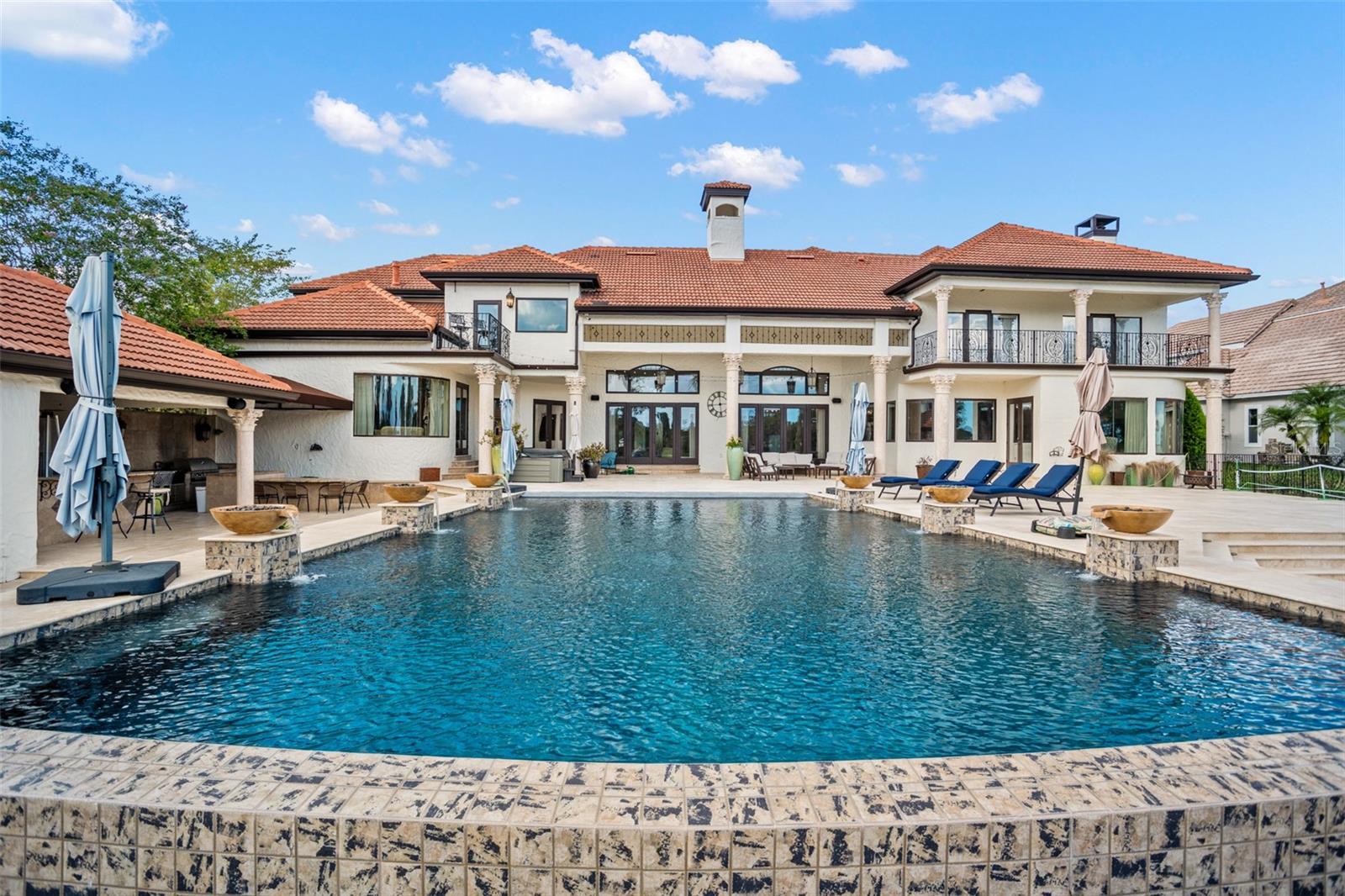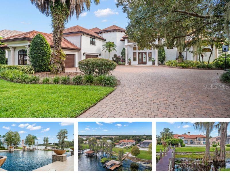 Experience the epitome of sophistication at this exquisite Park Avenue estate, cradled in a peaceful cove of Lake Butler. As you step inside, harmonious blends of transitional finesse and timeless grandeur greet you, set against the poetic panorama of Windermere's lakefront, behind the private gates of Chaine du Lac. Take advantage of updates including a refreshed kitchen and state-of-the-art appliances, newer pool deck, new boat dock, ultra-efficient air conditioning units, and whole-home generator – no detail has been overlooked. The expansive family room seamlessly merges with a kitchen and cozy breakfast nook, offering serene water vistas. Dramatic living and dining rooms with soaring ceilings and double-sided fireplace deliver luxurious space for entertaining. The first-floor primary retreat offers a sumptuous escape from the ordinary with panoramic octagonal windows and elegant French doors. Alongside, discover a private den for working from home. Opposite on the main floor is a full guest suite with sauna. Upstairs is a media room and three additional bedrooms, all ensuite. Just above the master bedroom is a second staircase leading to a game room, offering a full bar, restaurant-grade smoke filtration system, half-bath and a private balcony. An attached cabana could be a 6th bedroom or gym. Embrace resort-style living with a grand canopy-covered summer kitchen. Bask in mesmerizing sunsets, enjoy Orlando's iconic attractions, and be enchanted by nightly Disney fireworks. Unwind under an Italian-inspired pergola adorned with hanging vines, a cozy loveseat swing, and a warm fireplace. A dual-berth boat dock and pristine beachfront beckon, while a spacious 4-car garage add to the estate's unmatched amenities. This property and its commanding views stand as a true testament to the best of Windermere lakefront living.