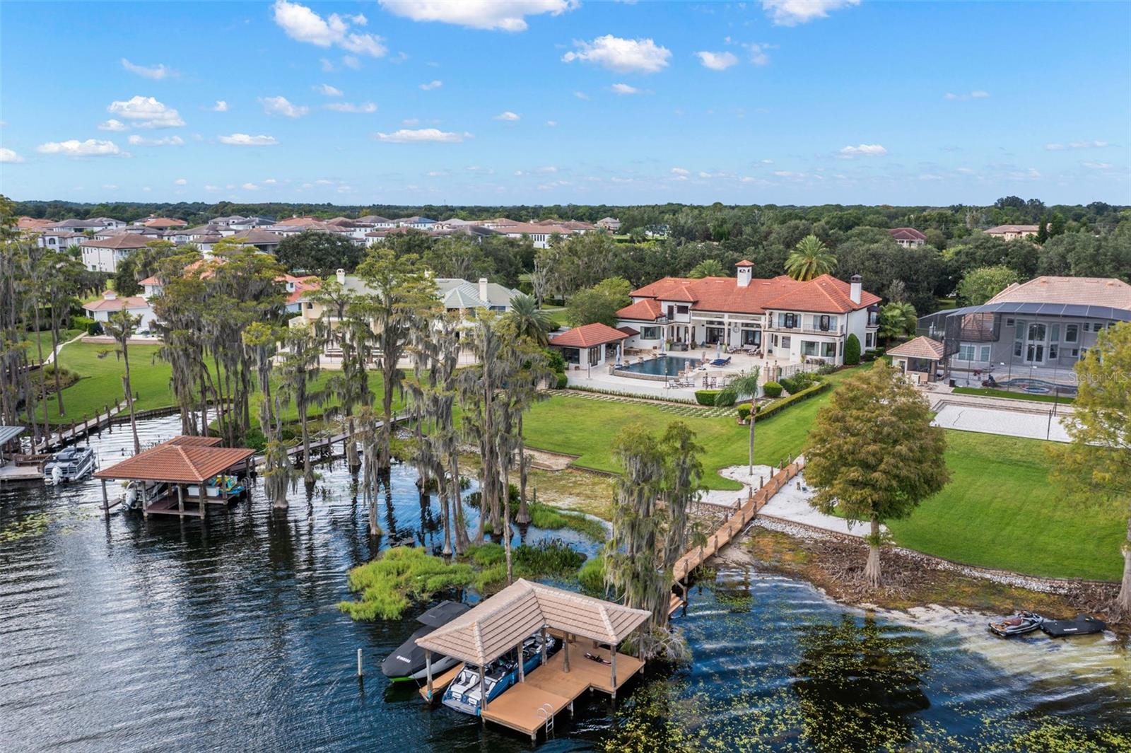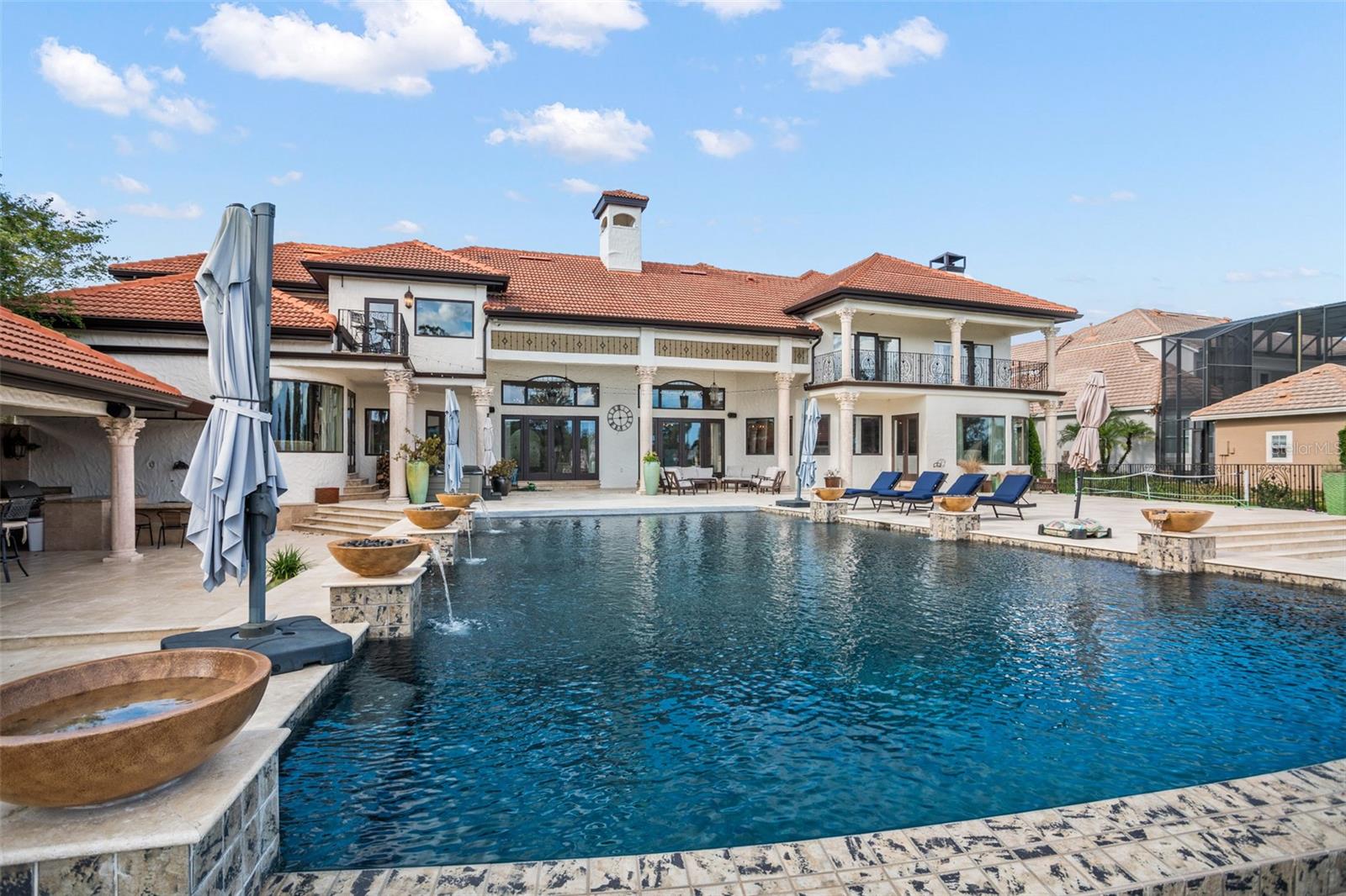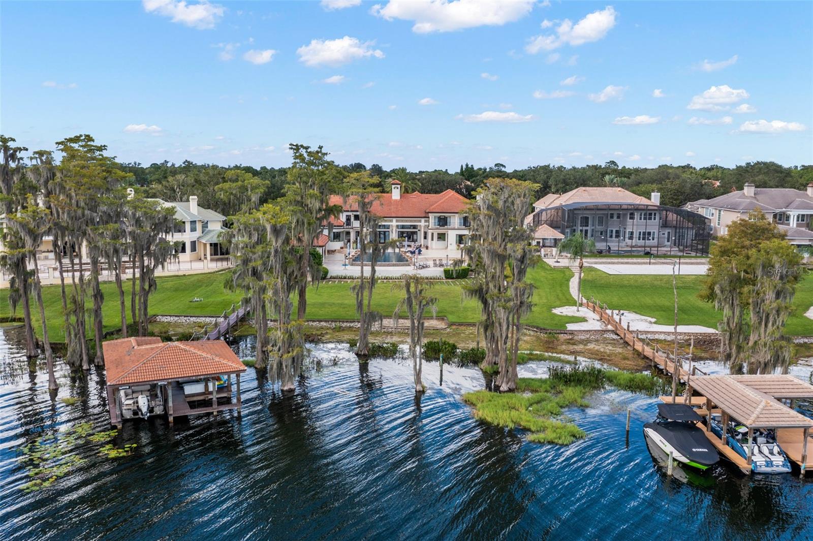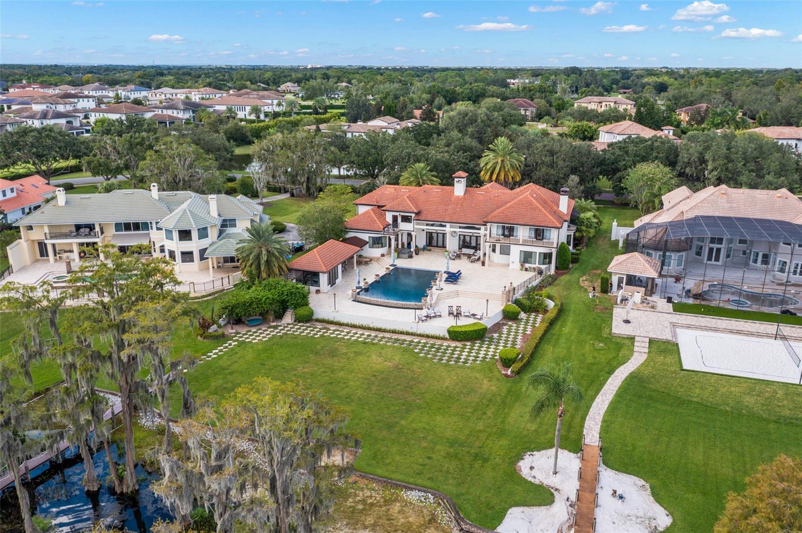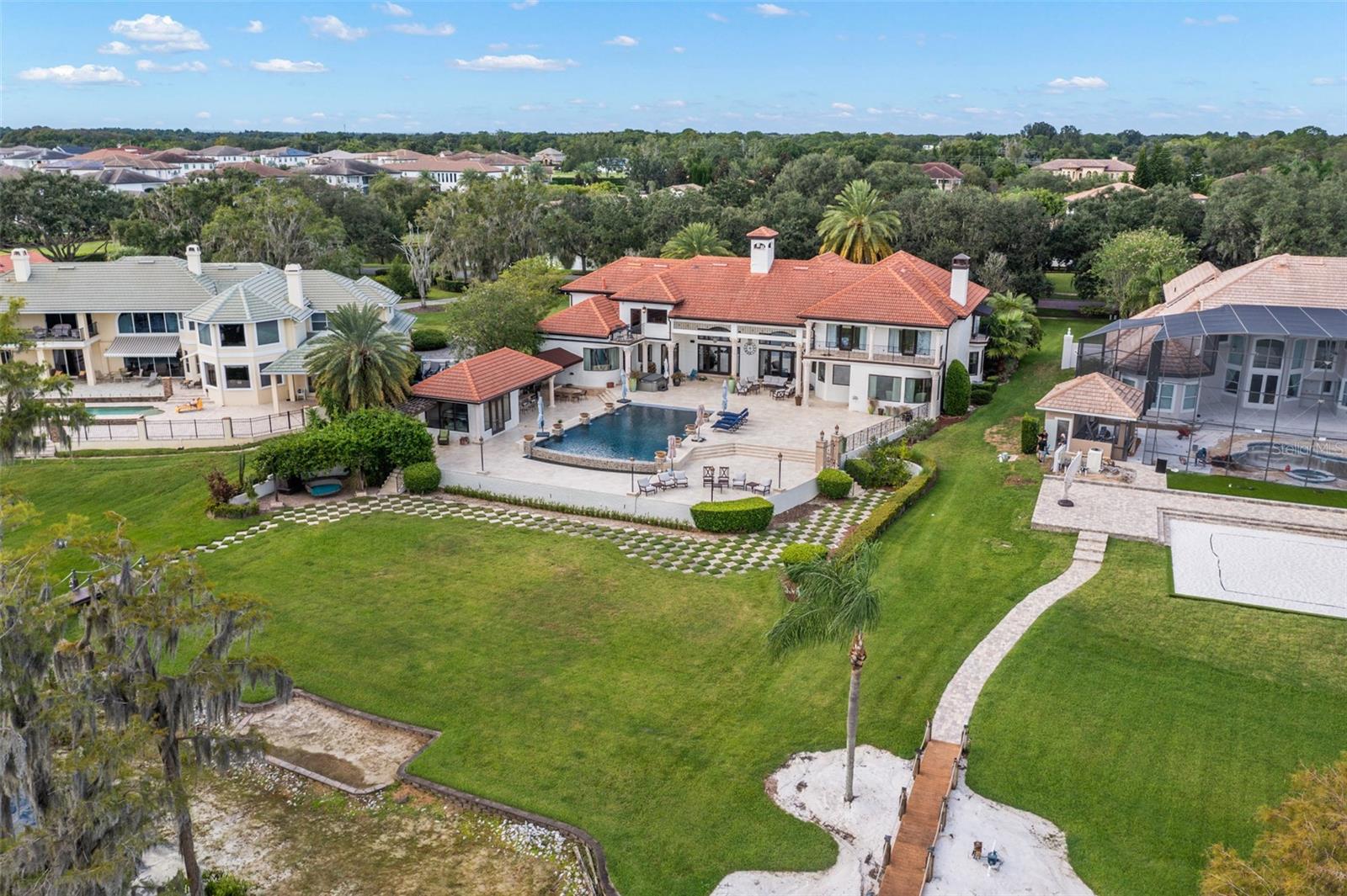 Experience the epitome of sophistication at this exquisite Park Avenue estate, cradled in a peaceful cove of Lake Butler. As you step inside, harmonious blends of transitional finesse and timeless grandeur greet you, set against the poetic panorama of Windermere's lakefront, behind the private gates of Chaine du Lac. Take advantage of updates including a refreshed kitchen and state-of-the-art appliances, newer pool deck, new boat dock, ultra-efficient air conditioning units, and whole-home generator – no detail has been overlooked. The expansive family room seamlessly merges with a kitchen and cozy breakfast nook, offering serene water vistas. Dramatic living and dining rooms with soaring ceilings and double-sided fireplace deliver luxurious space for entertaining. The first-floor primary retreat offers a sumptuous escape from the ordinary with panoramic octagonal windows and elegant French doors. Alongside, discover a private den for working from home. Opposite on the main floor is a full guest suite with sauna. Upstairs is a media room and three additional bedrooms, all ensuite. Just above the master bedroom is a second staircase leading to a game room, offering a full bar, restaurant-grade smoke filtration system, half-bath and a private balcony. An attached cabana could be a 6th bedroom or gym. Embrace resort-style living with a grand canopy-covered summer kitchen. Bask in mesmerizing sunsets, enjoy Orlando's iconic attractions, and be enchanted by nightly Disney fireworks. Unwind under an Italian-inspired pergola adorned with hanging vines, a cozy loveseat swing, and a warm fireplace. A dual-berth boat dock and pristine beachfront beckon, while a spacious 4-car garage add to the estate's unmatched amenities. This property and its commanding views stand as a true testament to the best of Windermere lakefront living.