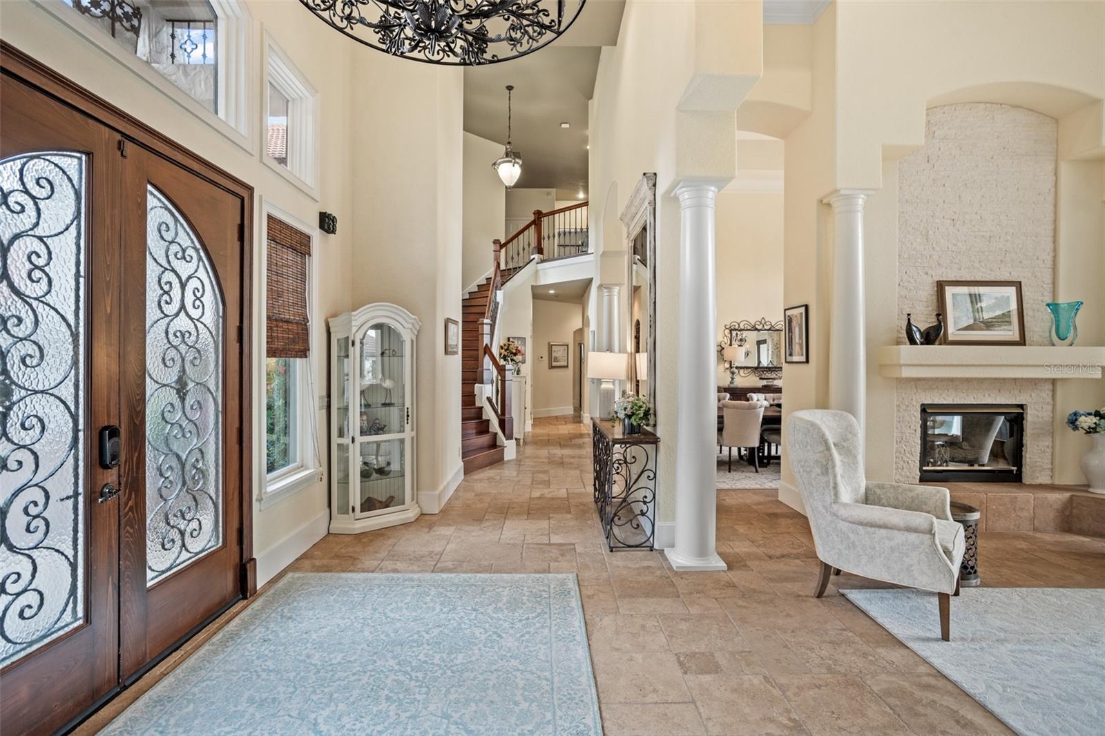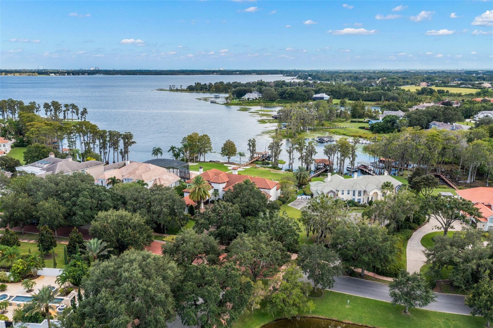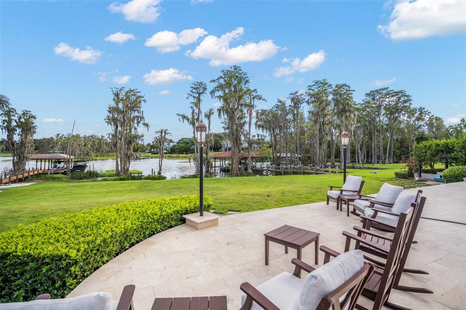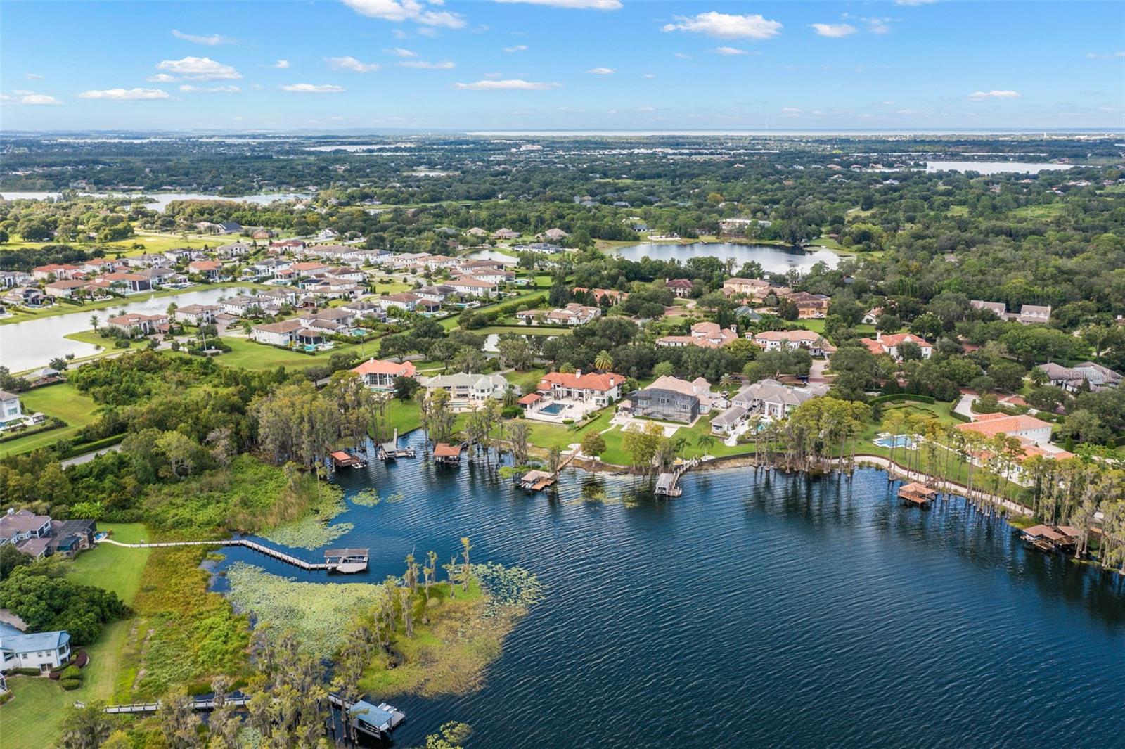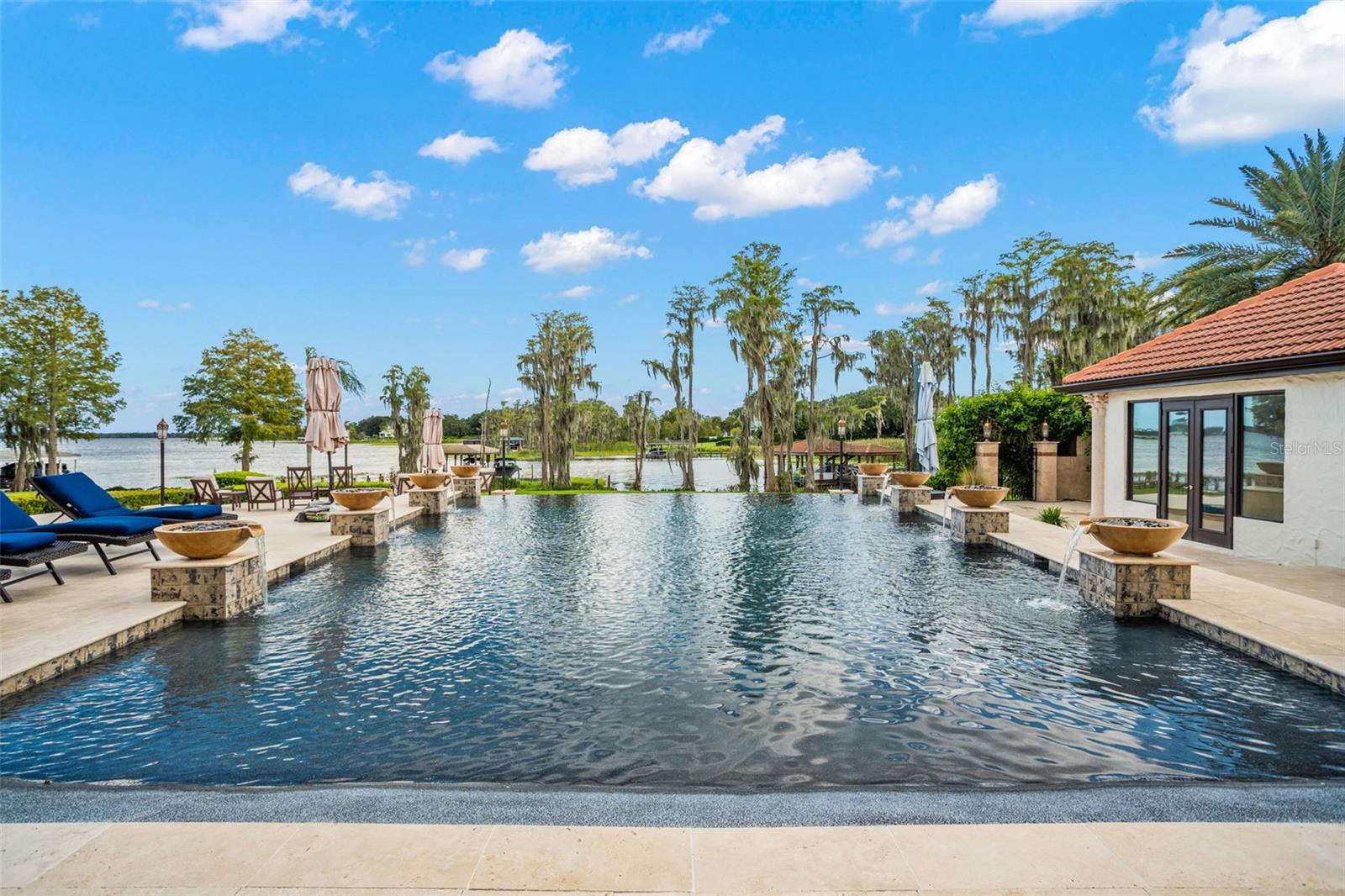Experience the epitome of sophistication at this exquisite Park Avenue estate, cradled in a peaceful cove of Lake Butler. As you step inside, harmonious blends of transitional finesse and timeless grandeur greet you, set against the poetic panorama of Windermere's lakefront, behind the private gates of Chaine du Lac. Take advantage of updates including a refreshed kitchen and state-of-the-art appliances, newer pool deck, new boat dock, ultra-efficient air conditioning units, and whole-home generator – no detail has been overlooked. The expansive family room seamlessly merges with a kitchen and cozy breakfast nook, offering serene water vistas. Dramatic living and dining rooms with soaring ceilings and double-sided fireplace deliver luxurious space for entertaining. The first-floor primary retreat offers a sumptuous escape from the ordinary with panoramic octagonal windows and elegant French doors. Alongside, discover a private den for working from home. Opposite on the main floor is a full guest suite with sauna. Upstairs is a media room and three additional bedrooms, all ensuite. Just above the master bedroom is a second staircase leading to a game room, offering a full bar, restaurant-grade smoke filtration system, half-bath and a private balcony. An attached cabana could be a 6th bedroom or gym. Embrace resort-style living with a grand canopy-covered summer kitchen. Bask in mesmerizing sunsets, enjoy Orlando's iconic attractions, and be enchanted by nightly Disney fireworks. Unwind under an Italian-inspired pergola adorned with hanging vines, a cozy loveseat swing, and a warm fireplace. A dual-berth boat dock and pristine beachfront beckon, while a spacious 4-car garage add to the estate's unmatched amenities. This property and its commanding views stand as a true testament to the best of Windermere lakefront living.